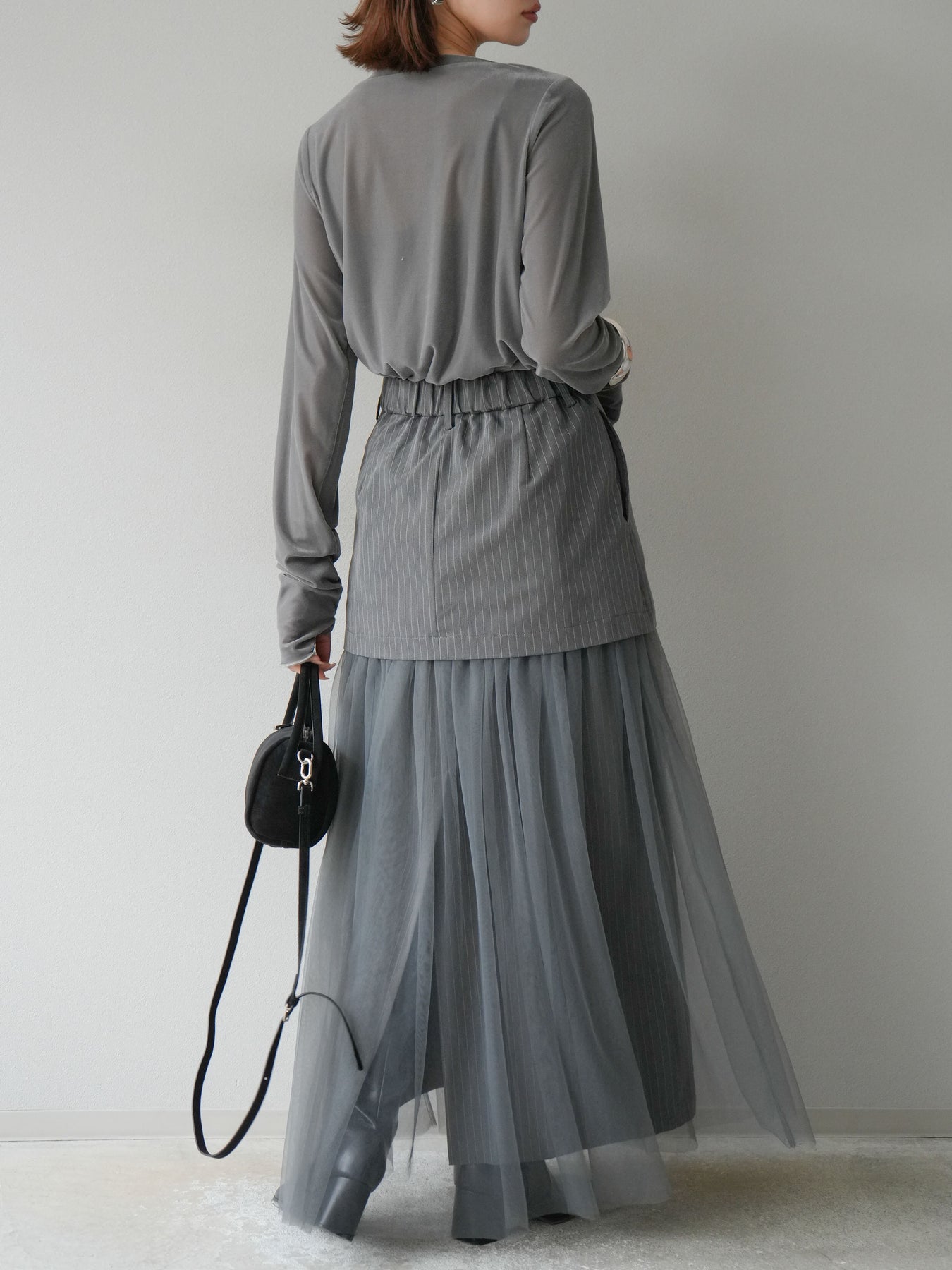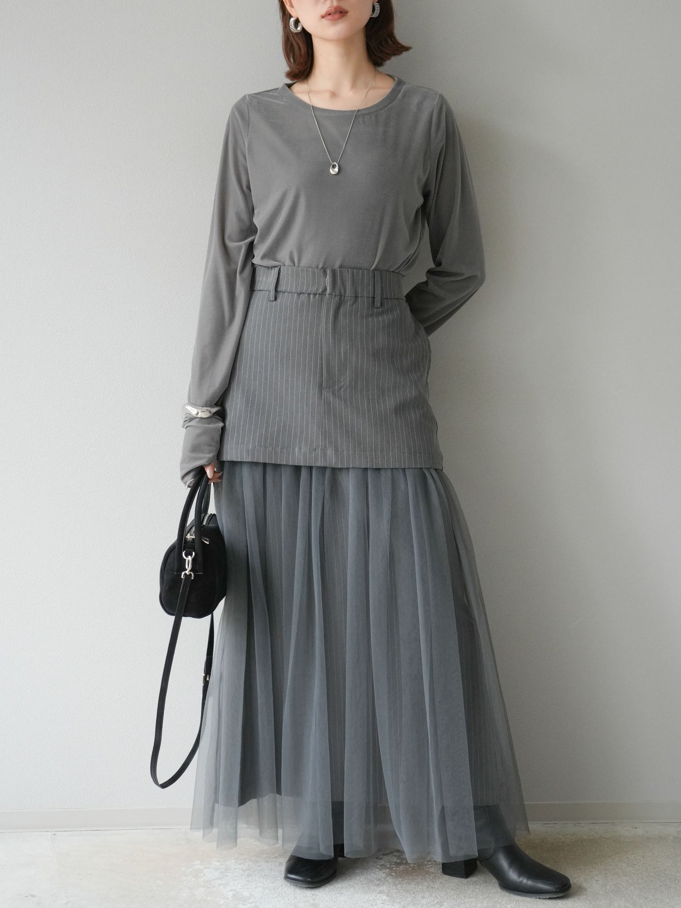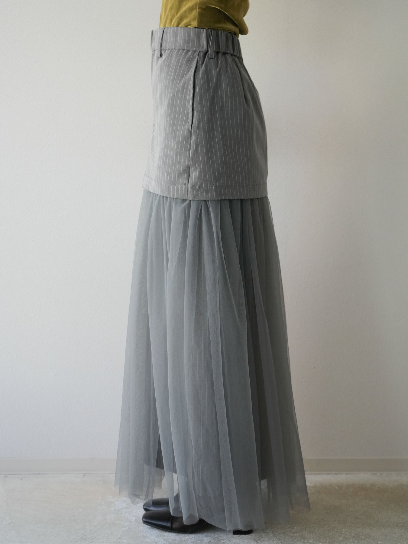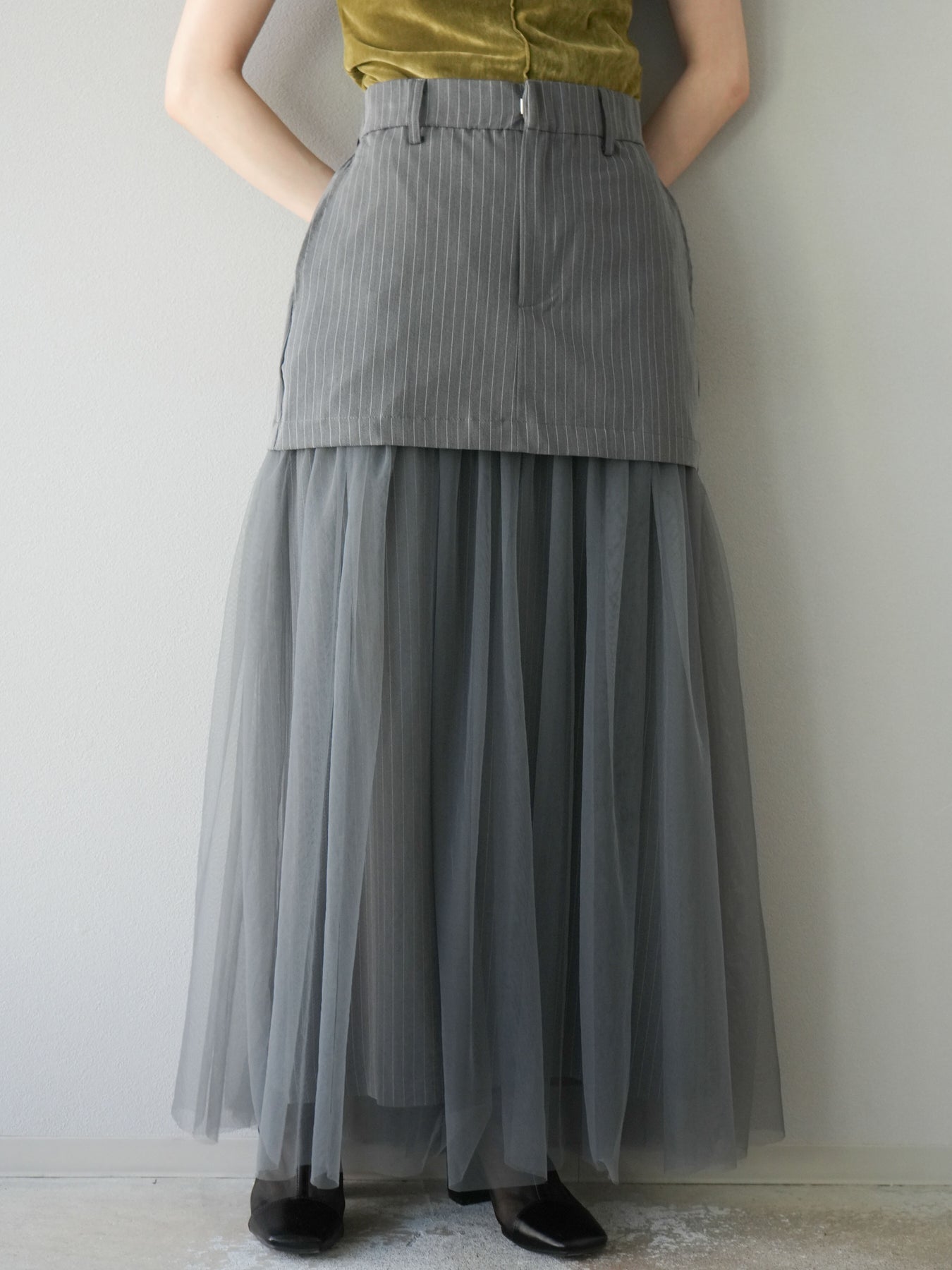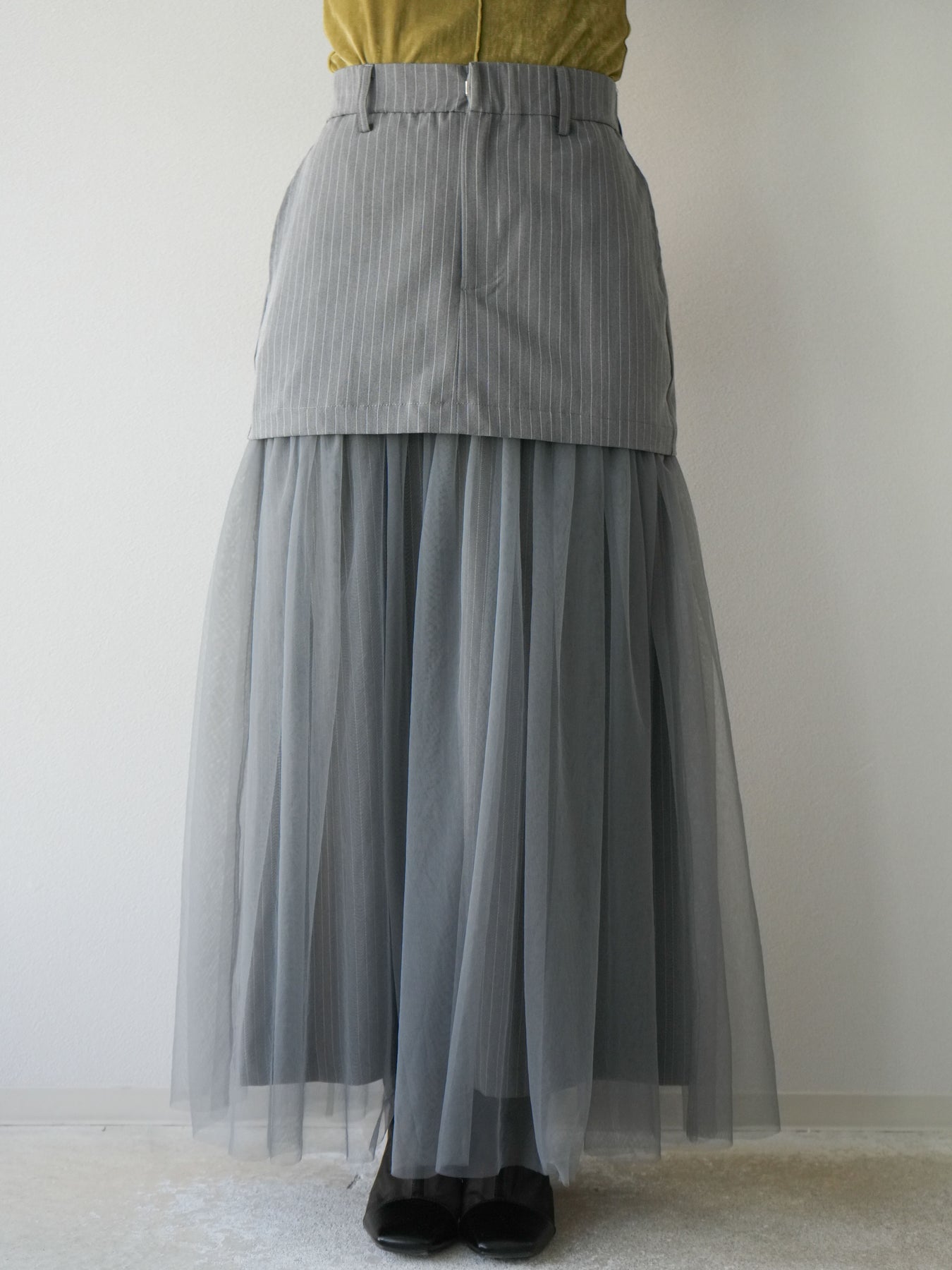 ストライプ生地とチュール素材を切り替えたデザインが特徴的なスカート。異素材の組み合わせがスタイリングに奥行きを与え、シンプルなトップスと合わせるだけで華やかな印象に仕上がります。ウエスト部分はすっきりとしたストライプで大人っぽさを演出し、裾にかけて広がるチュールが軽やかな揺れをプラス。縦ラインを強調することでスタイルアップ効果も期待できます。カジュアルからきれいめまで幅広く対応でき、シーズンを問わず活躍する主役級アイテムです。