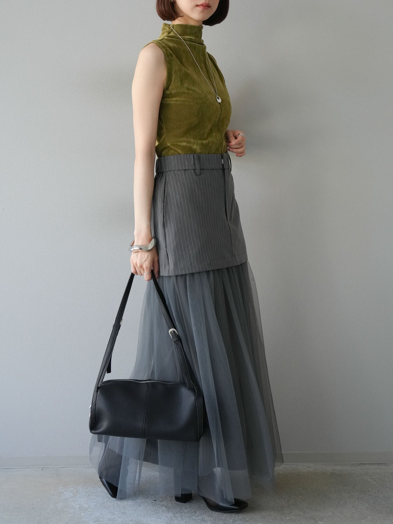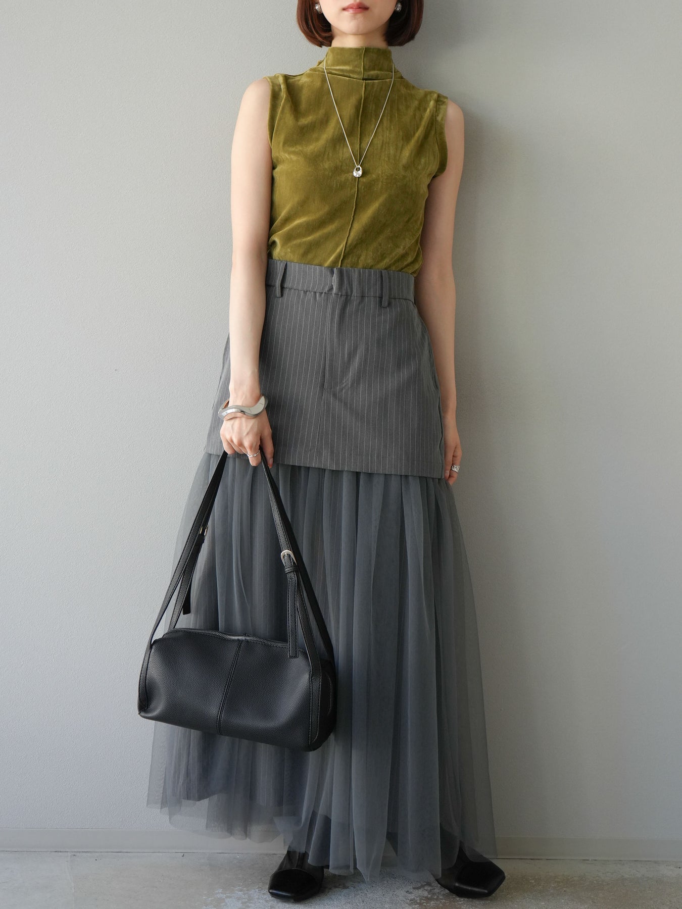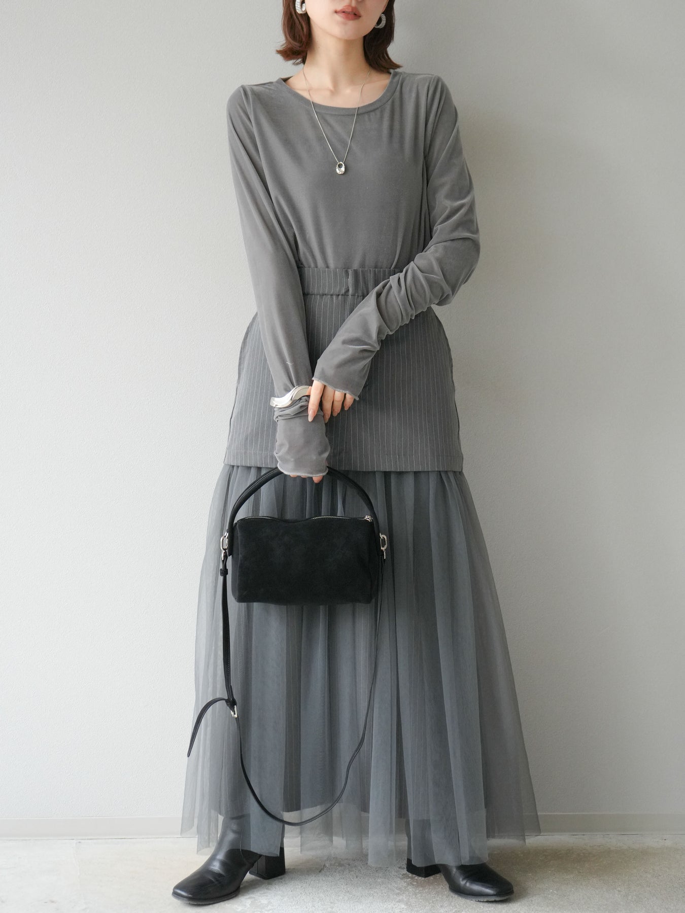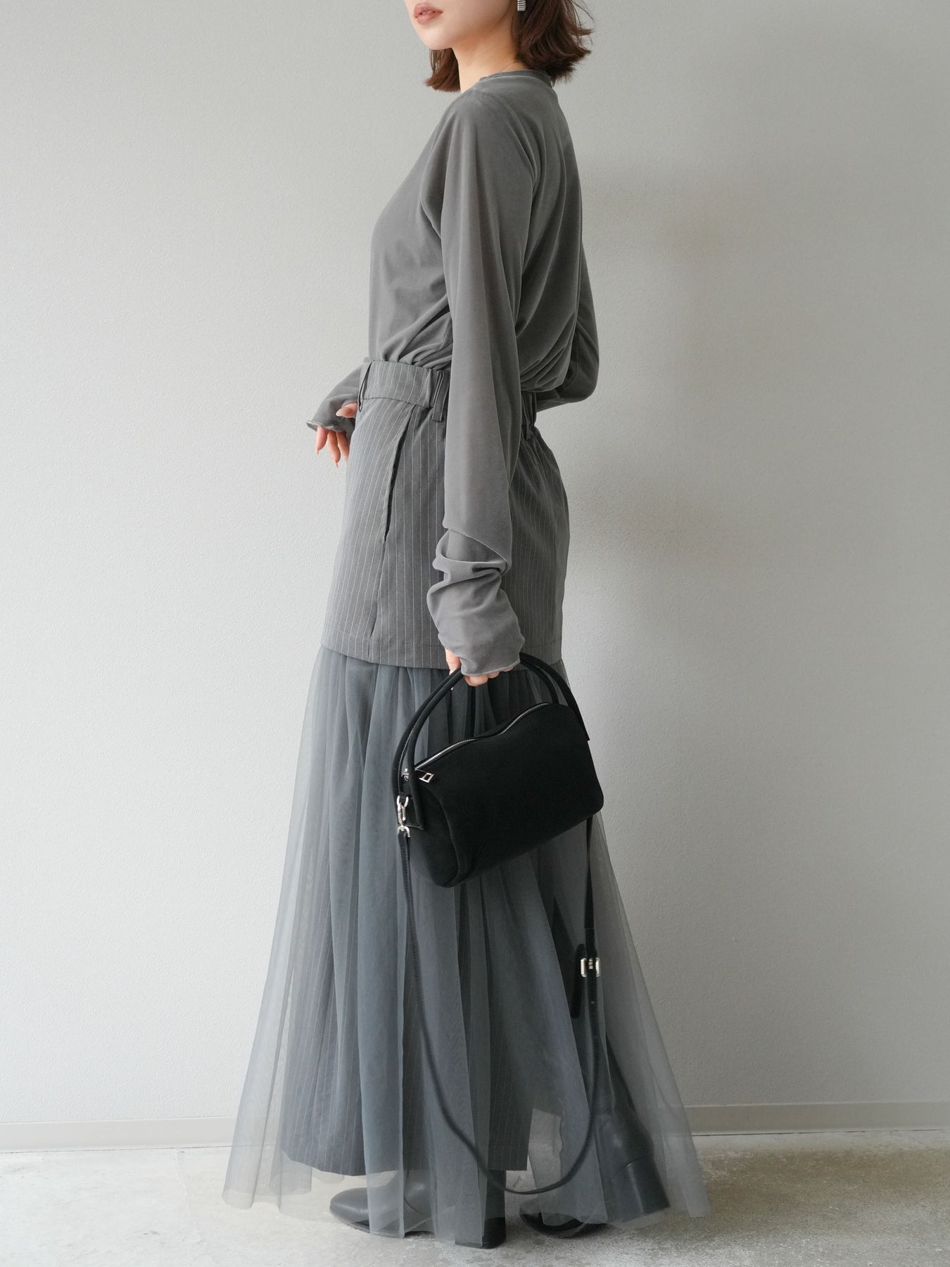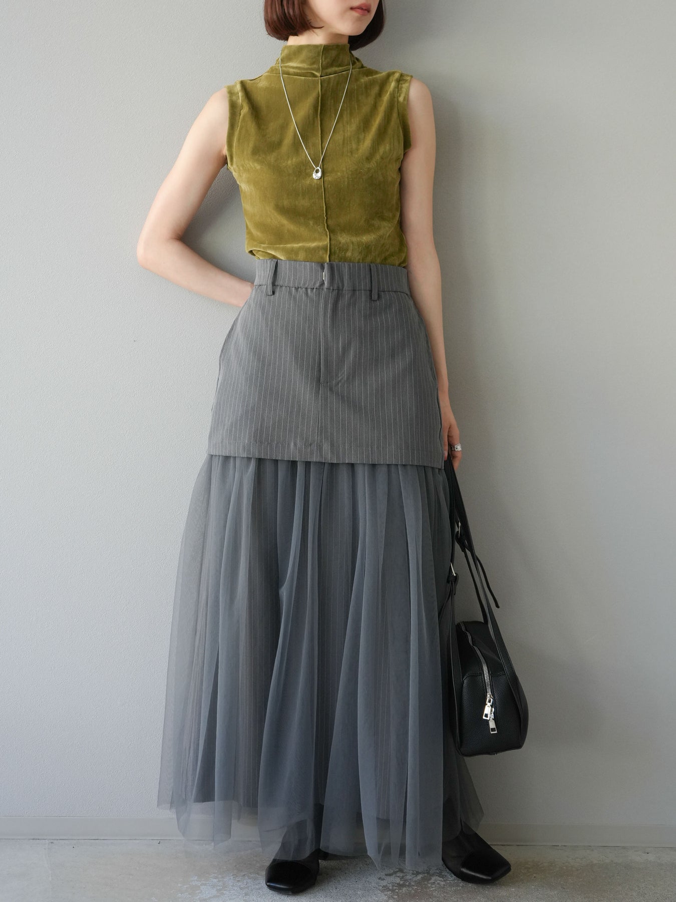 ストライプ生地とチュール素材を切り替えたデザインが特徴的なスカート。異素材の組み合わせがスタイリングに奥行きを与え、シンプルなトップスと合わせるだけで華やかな印象に仕上がります。ウエスト部分はすっきりとしたストライプで大人っぽさを演出し、裾にかけて広がるチュールが軽やかな揺れをプラス。縦ラインを強調することでスタイルアップ効果も期待できます。カジュアルからきれいめまで幅広く対応でき、シーズンを問わず活躍する主役級アイテムです。