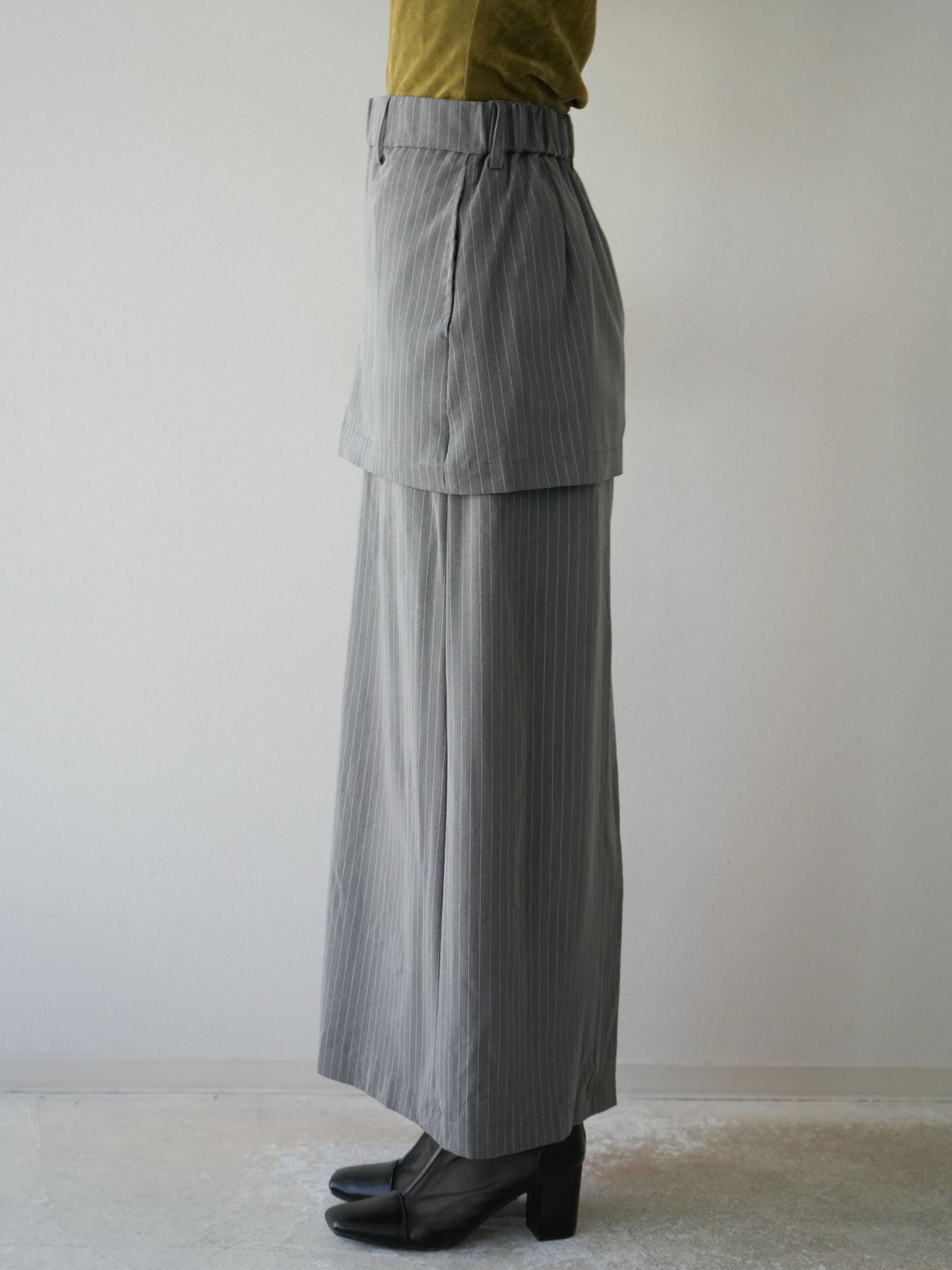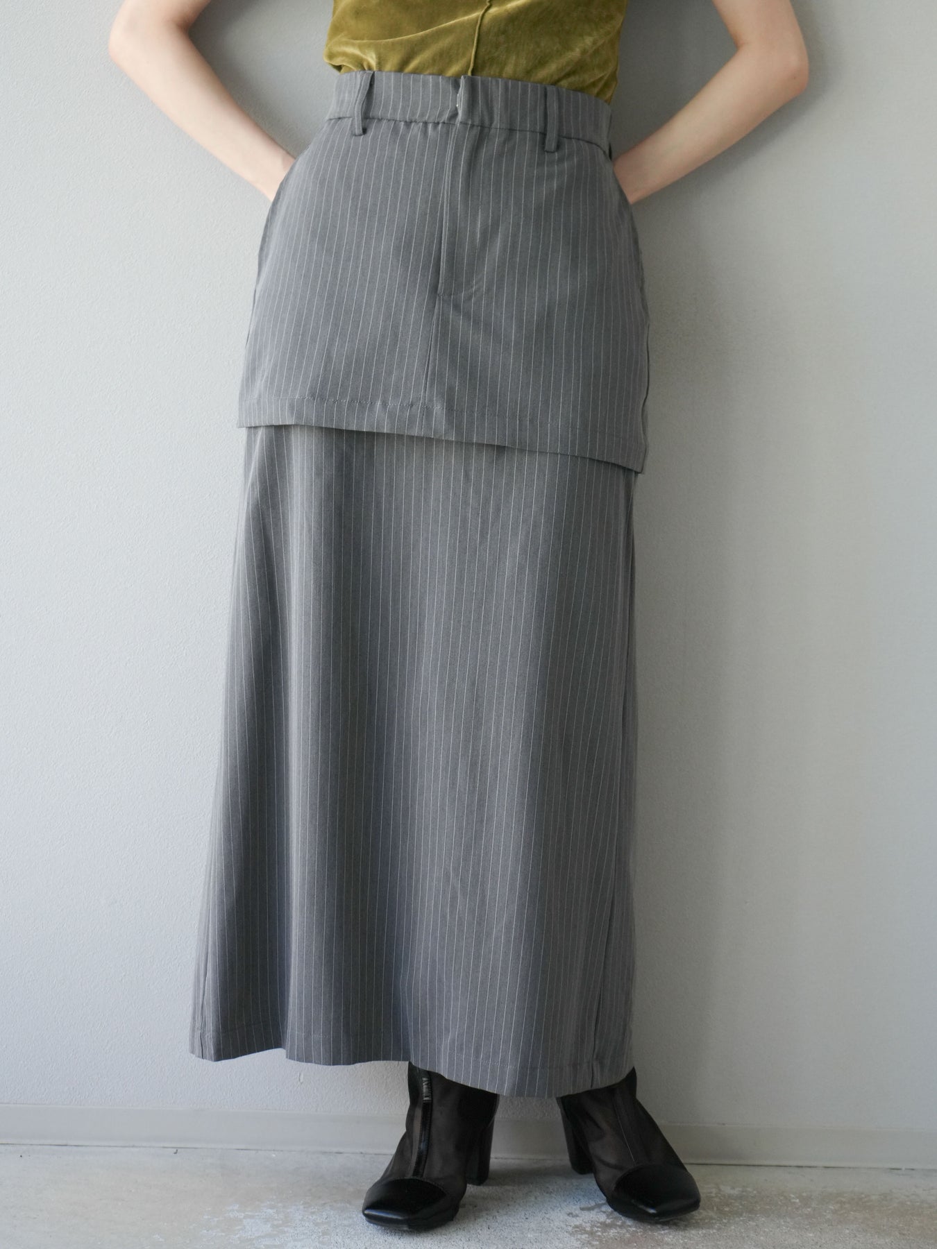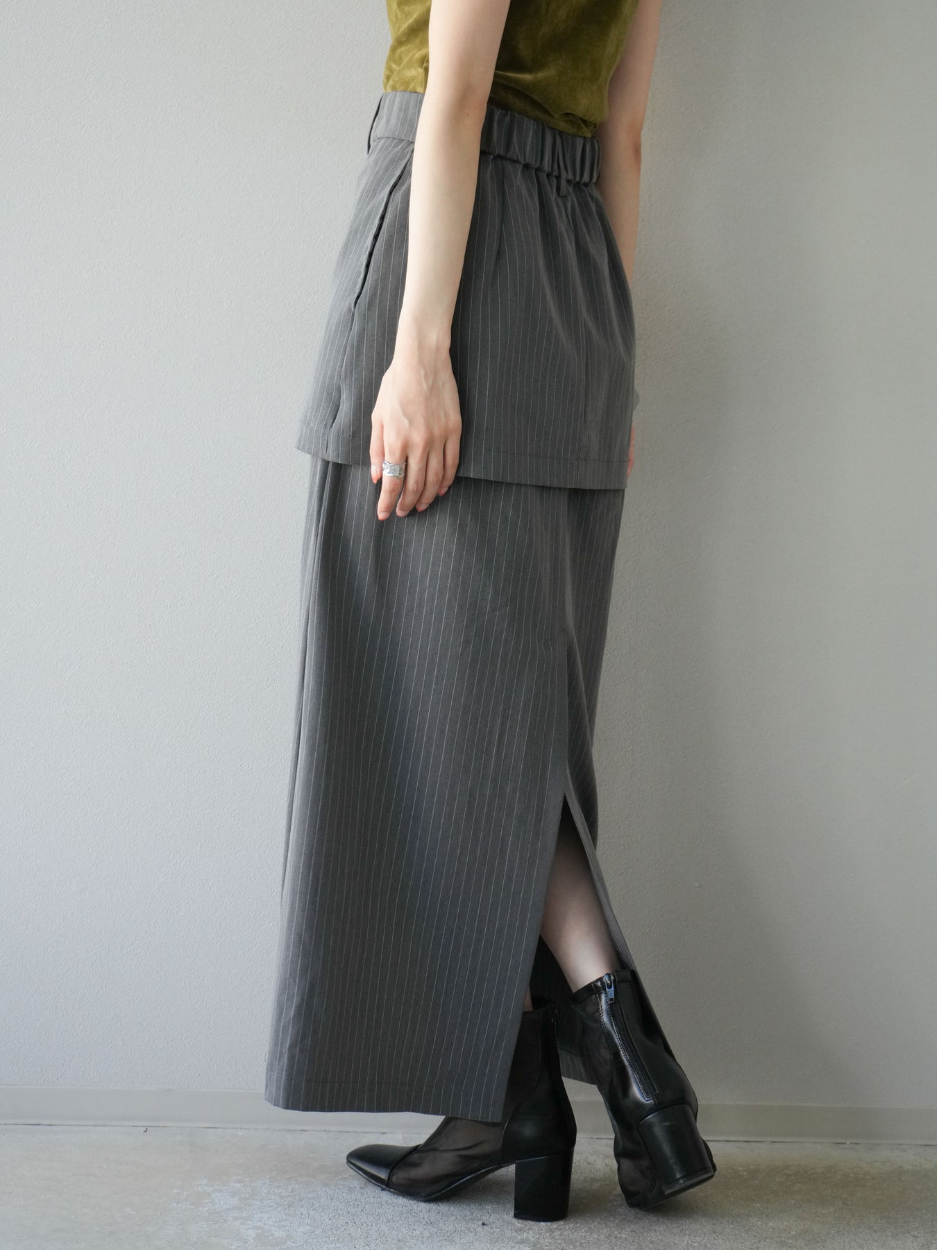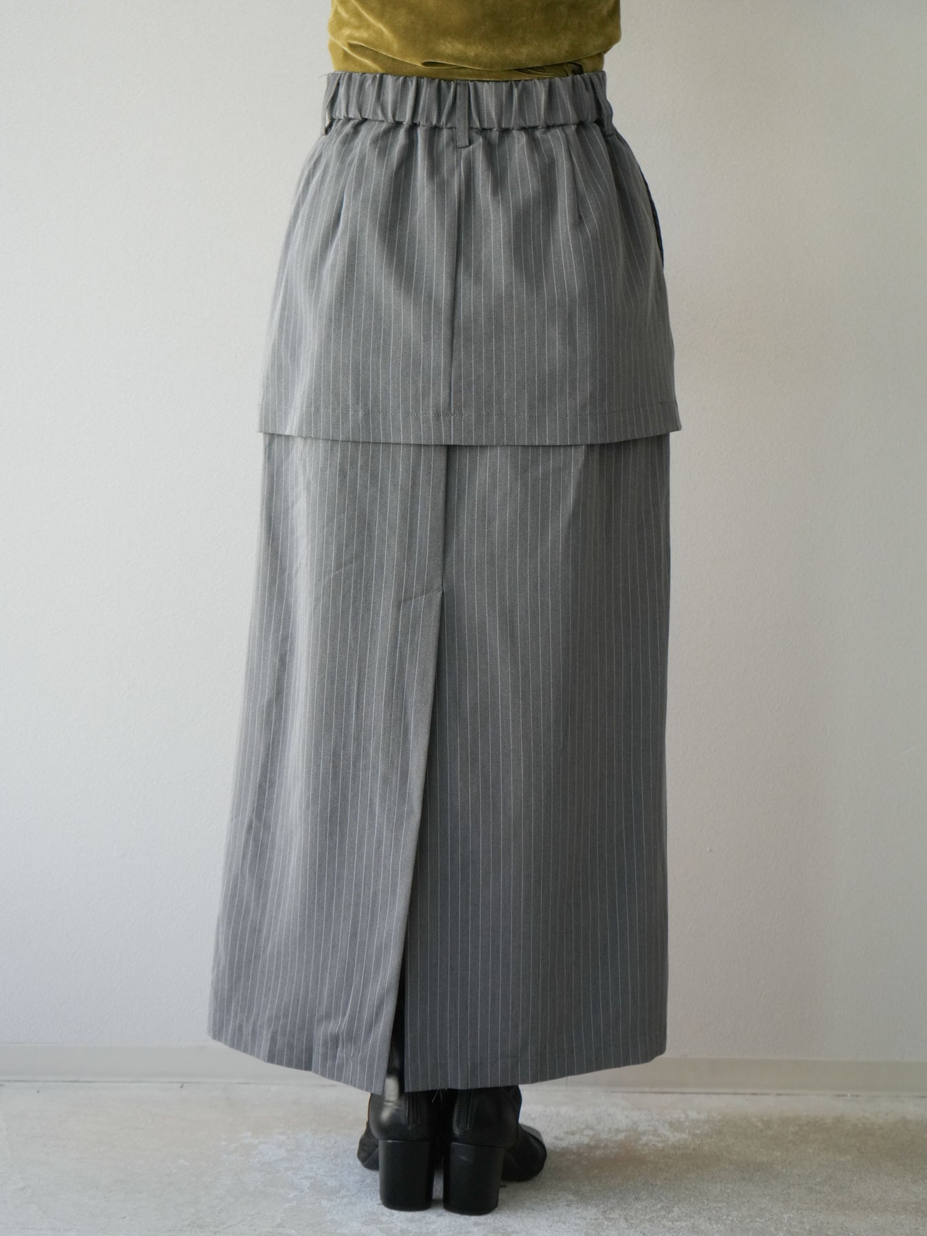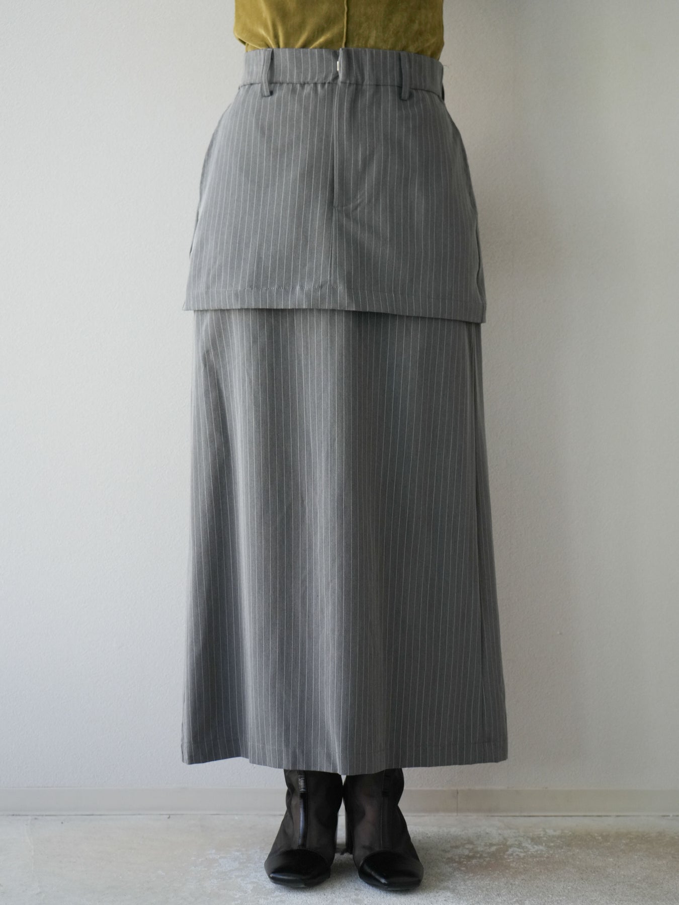 ストライプ生地とチュール素材を切り替えたデザインが特徴的なスカート。異素材の組み合わせがスタイリングに奥行きを与え、シンプルなトップスと合わせるだけで華やかな印象に仕上がります。ウエスト部分はすっきりとしたストライプで大人っぽさを演出し、裾にかけて広がるチュールが軽やかな揺れをプラス。縦ラインを強調することでスタイルアップ効果も期待できます。カジュアルからきれいめまで幅広く対応でき、シーズンを問わず活躍する主役級アイテムです。