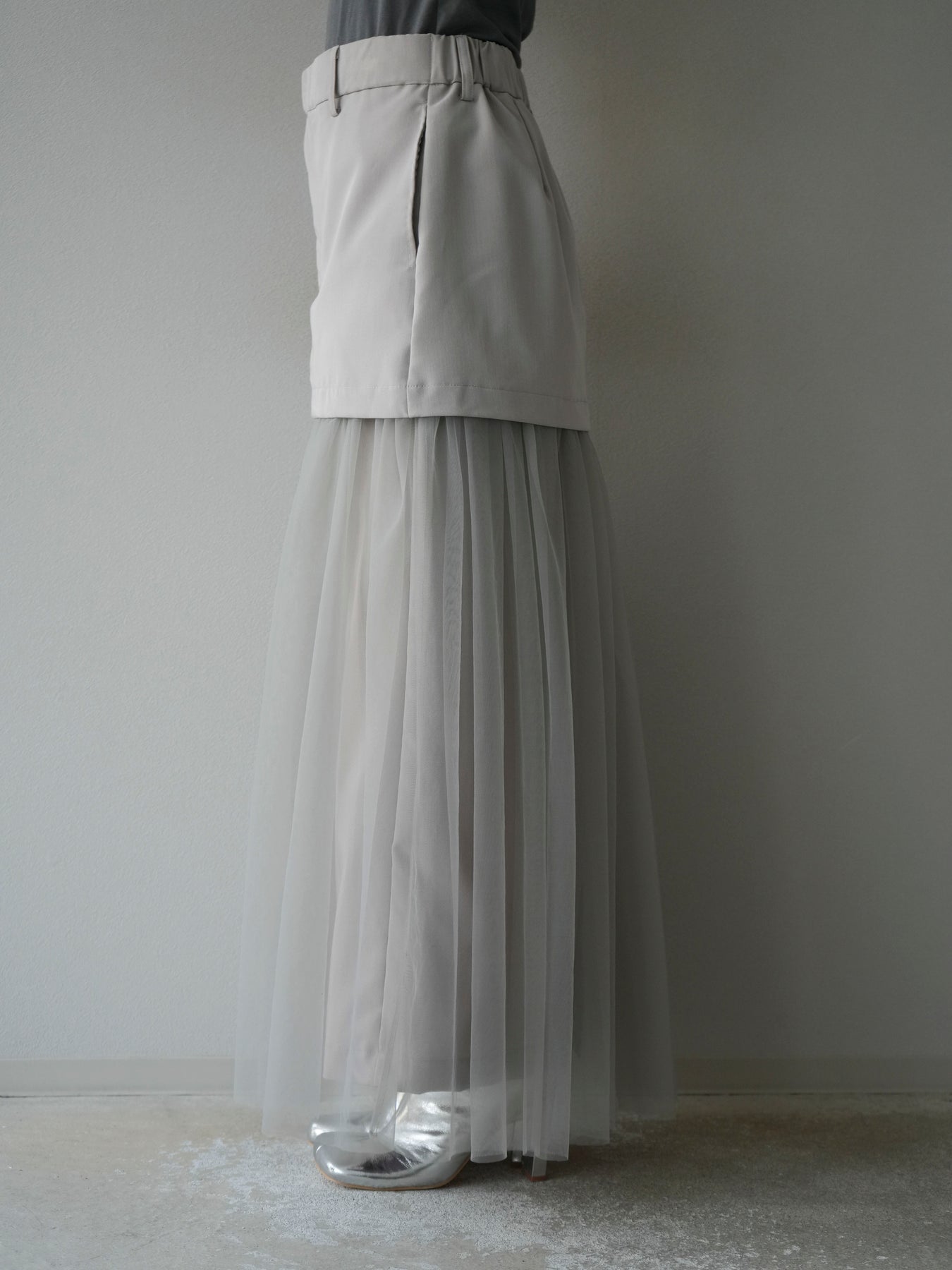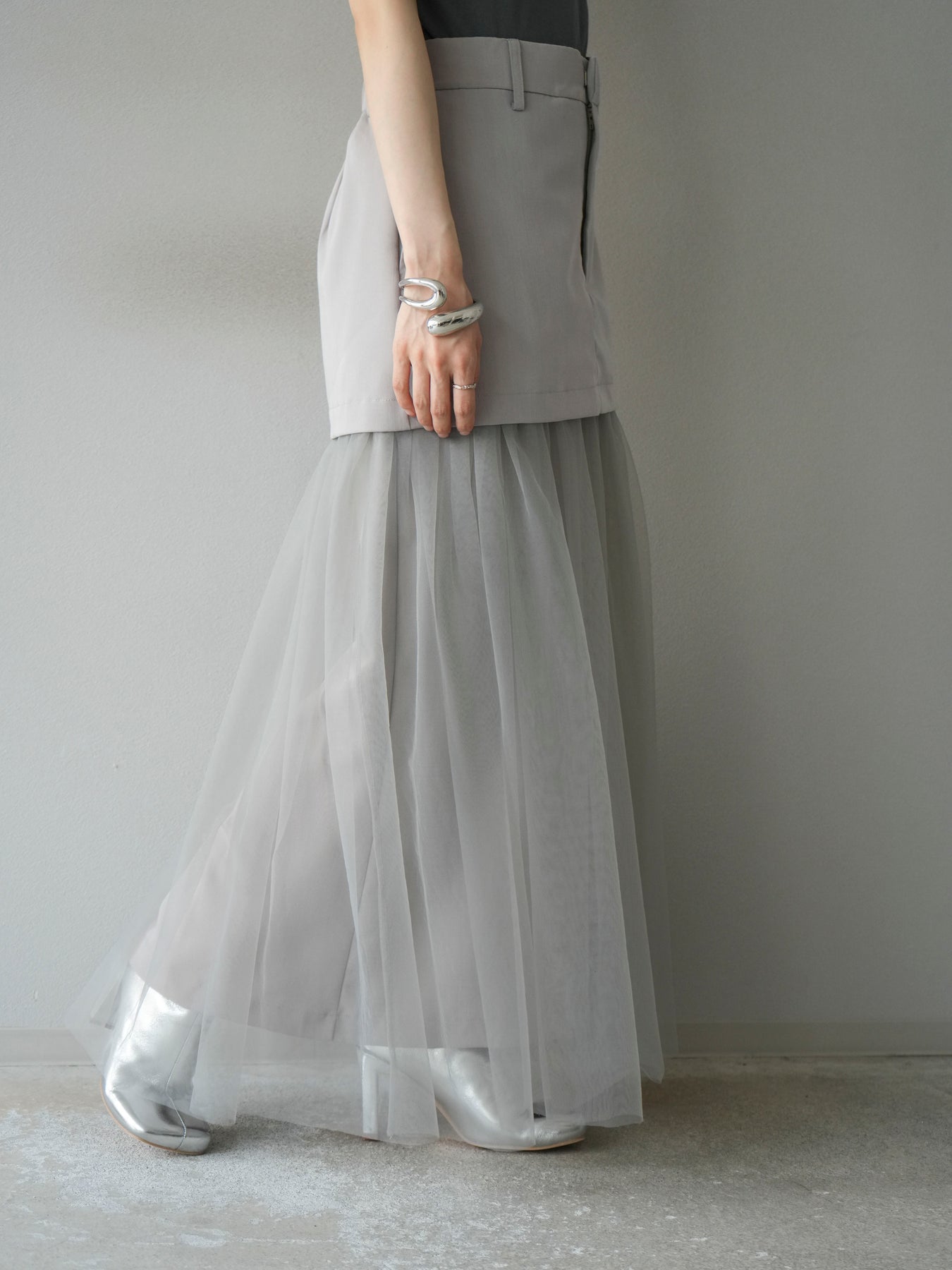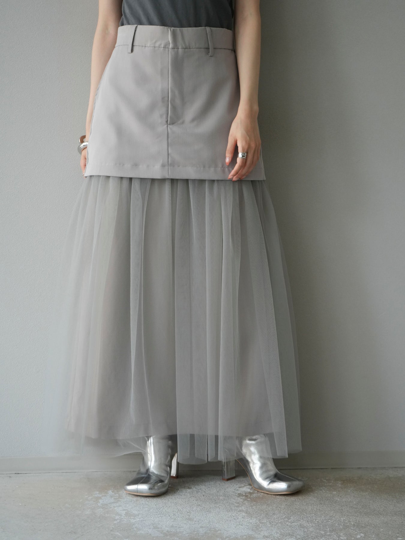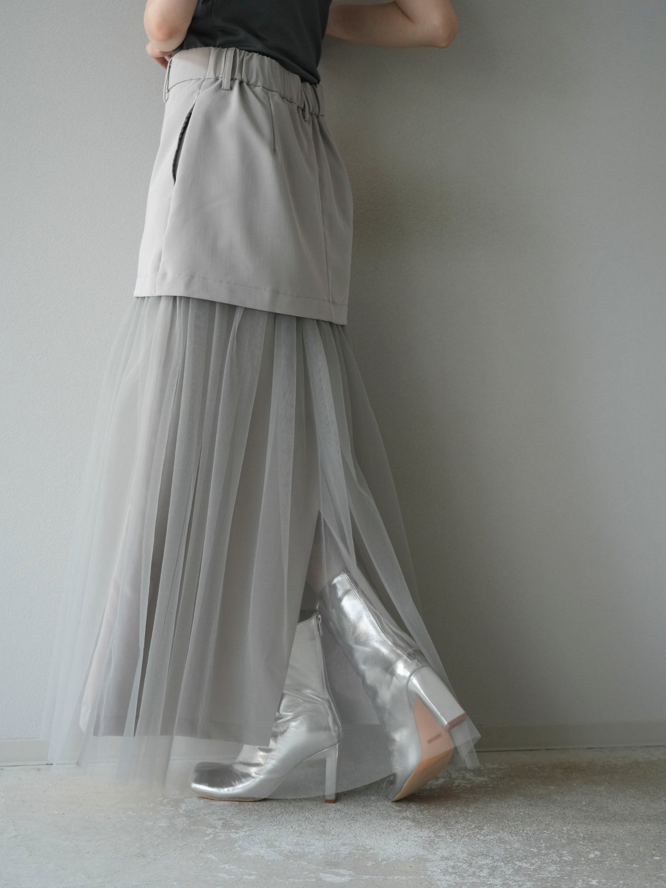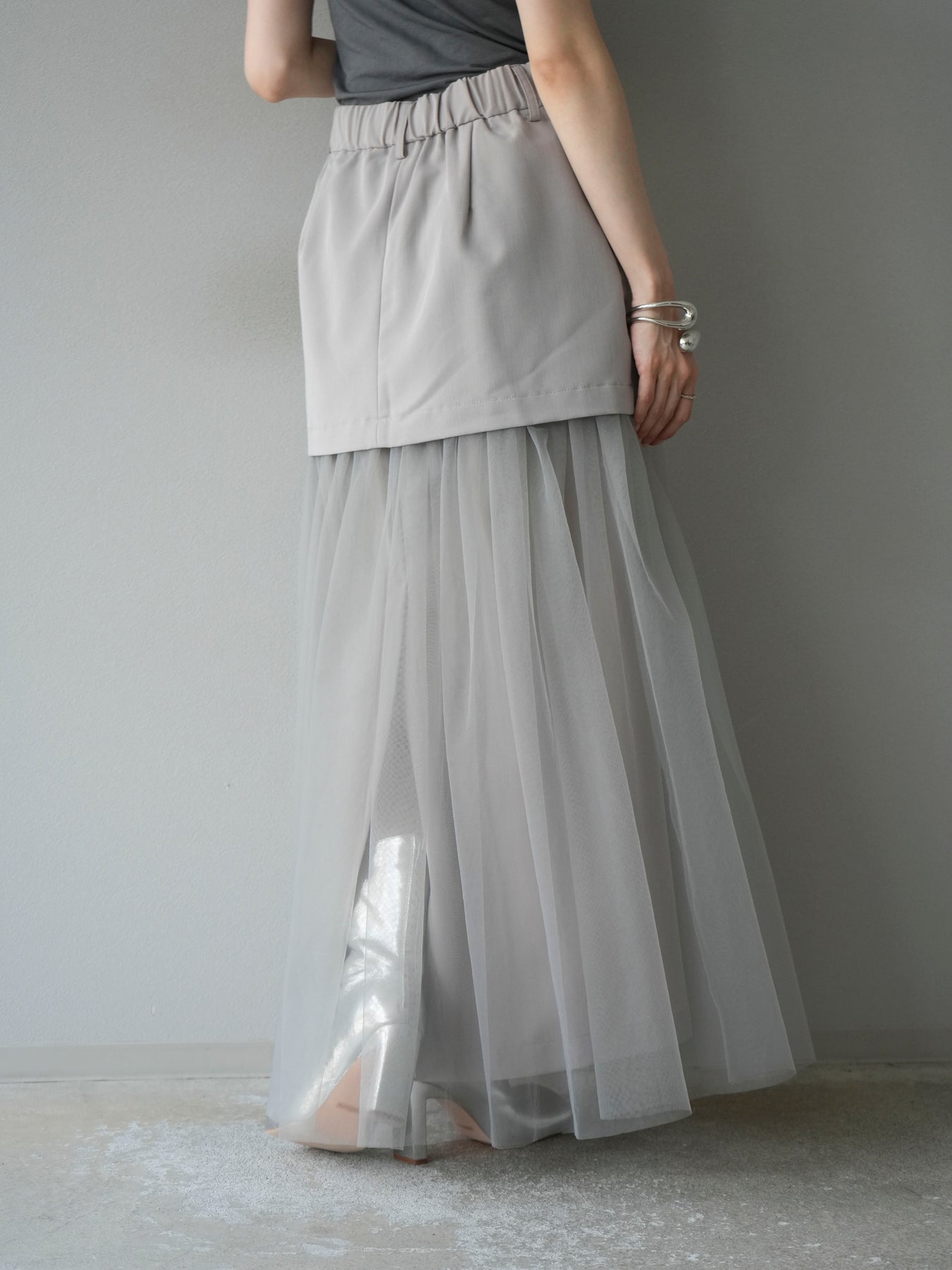 エステル素材とチュールを切り替えたデザインが目を惹くスカート。ハリ感のあるエステル生地がウエストまわりをすっきりと見せ、裾にかけて広がるチュールが華やかさと軽やかさを演出します。異素材のコントラストがスタイリングに奥行きを与え、シンプルなトップスを合わせるだけで旬なコーディネートが完成。ミディアム〜ロング丈のバランスが大人らしい印象を保ちながら、パンプスやブーツとも好相性です。特別感のあるデザインながらデイリーにも取り入れやすく、オンオフ問わず活躍するアイテムです。