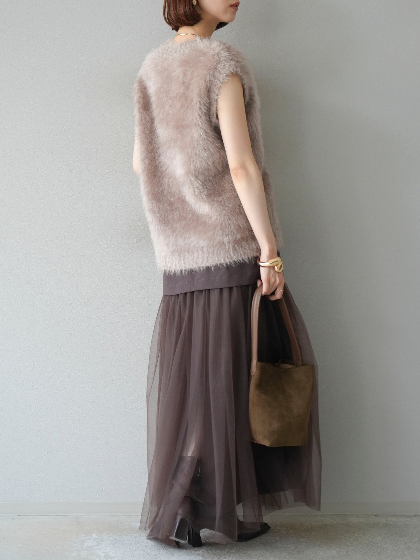 エステル素材とチュールを切り替えたデザインが目を惹くスカート。ハリ感のあるエステル生地がウエストまわりをすっきりと見せ、裾にかけて広がるチュールが華やかさと軽やかさを演出します。異素材のコントラストがスタイリングに奥行きを与え、シンプルなトップスを合わせるだけで旬なコーディネートが完成。ミディアム〜ロング丈のバランスが大人らしい印象を保ちながら、パンプスやブーツとも好相性です。特別感のあるデザインながらデイリーにも取り入れやすく、オンオフ問わず活躍するアイテムです。