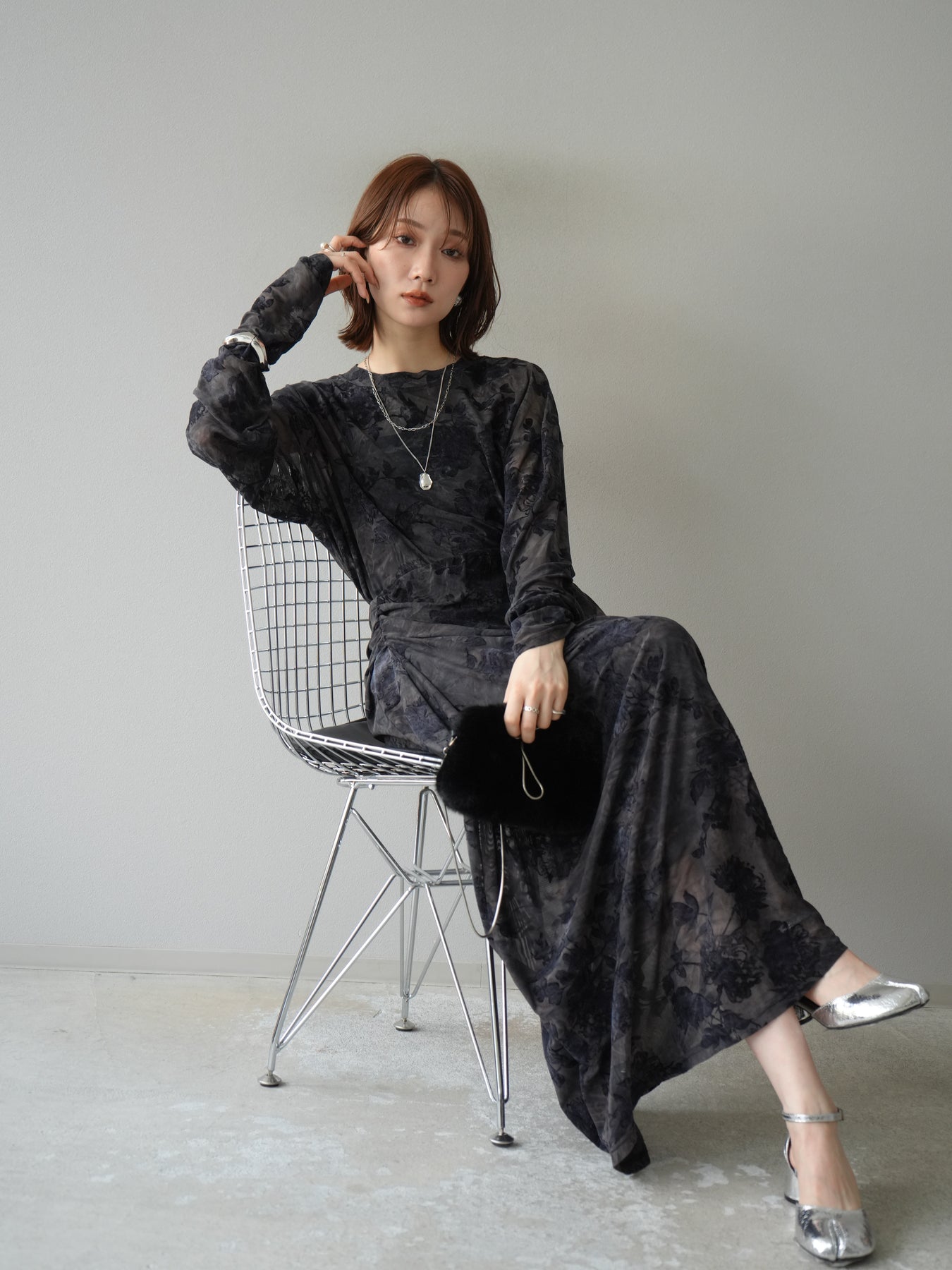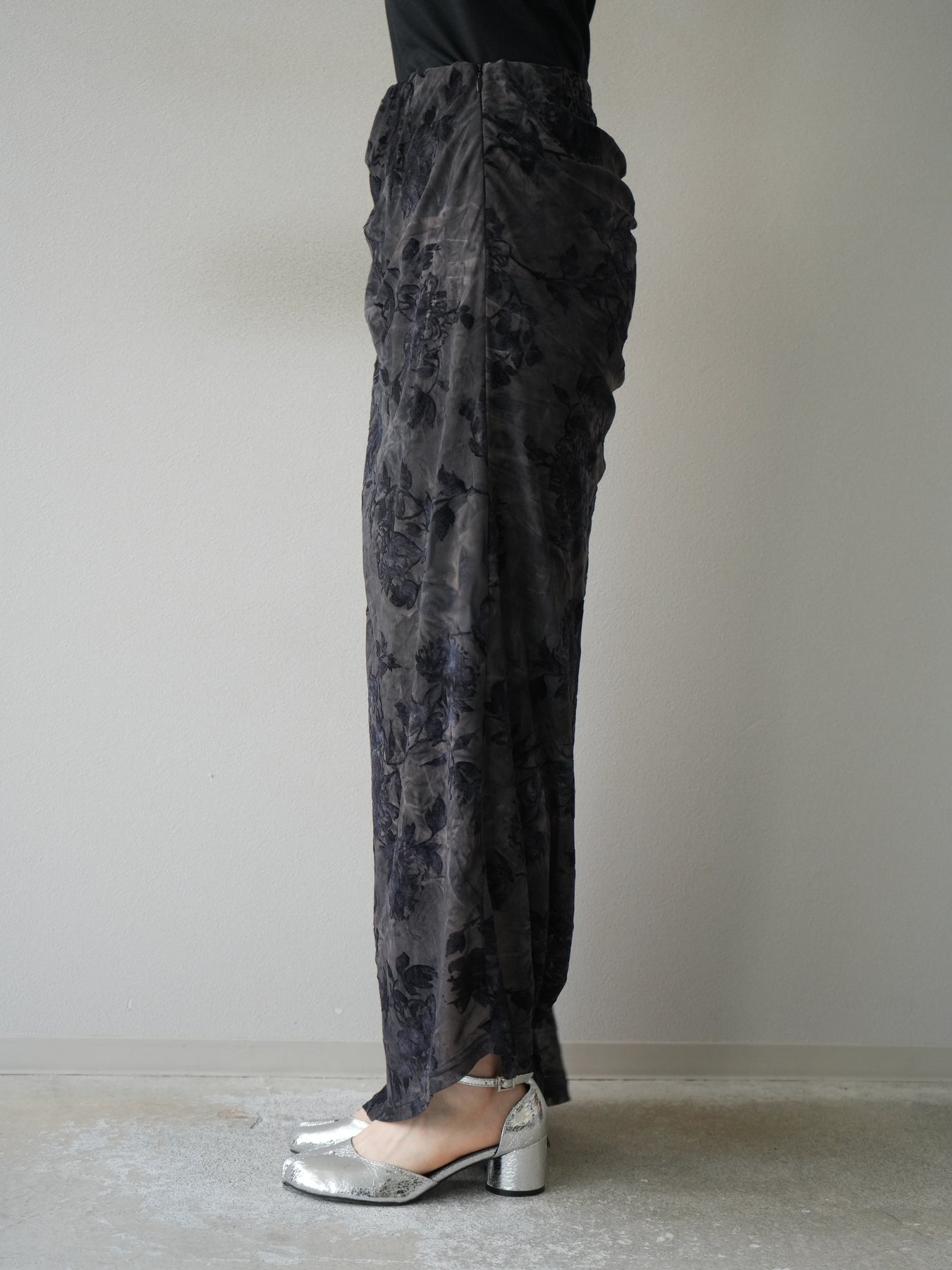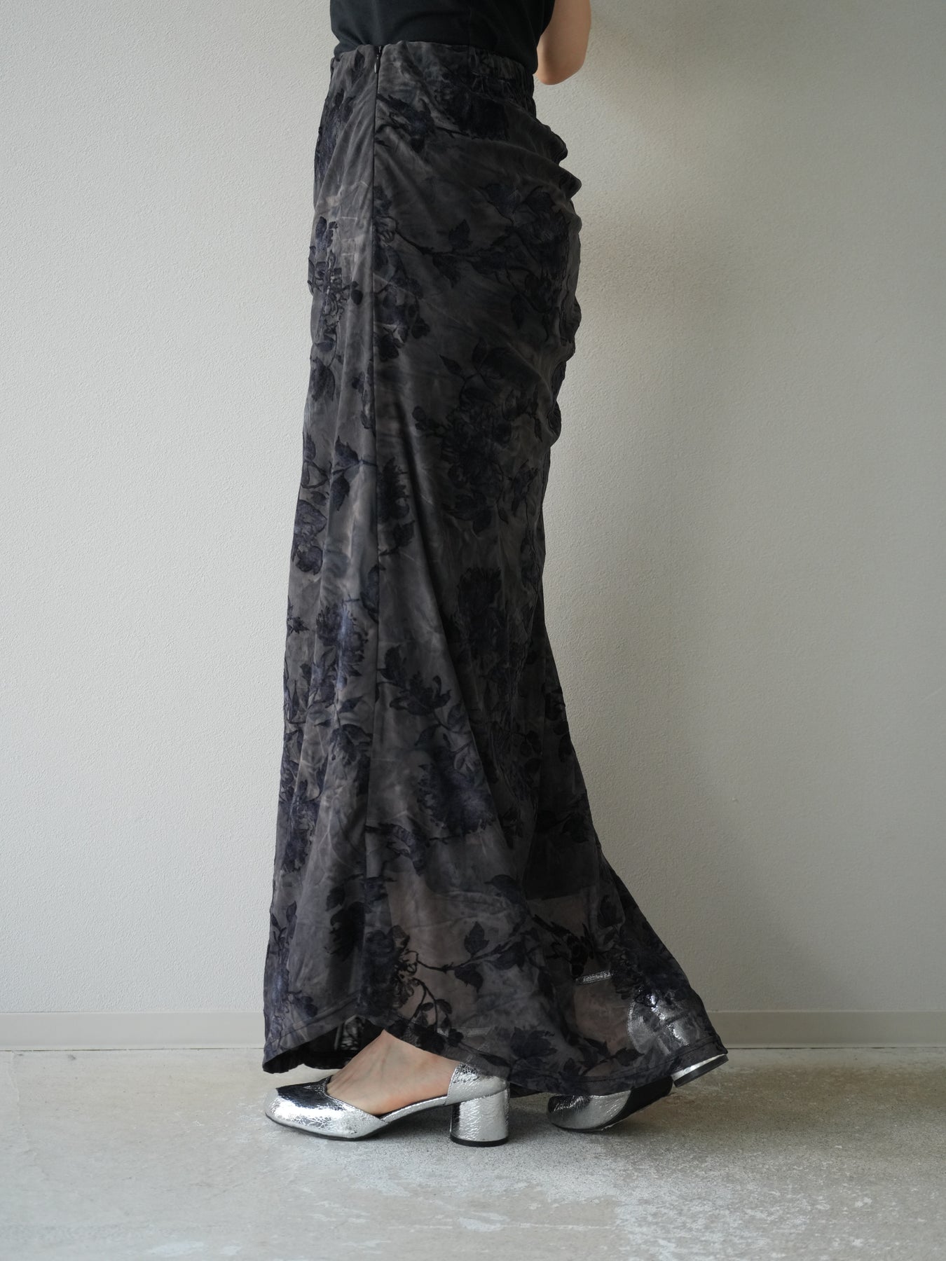 透け感のあるシアー素材にフロッキー加工でフラワーパターンを施した、華やかな印象のスカート。ドレープを効かせたデザインが美しい落ち感を生み、歩くたびに優雅な揺れを演出します。軽やかな素材感ながら、上品な光沢があり、スタイリングに季節感と華やかさをプラス。シンプルなトップスと合わせるだけで主役級のコーディネートが完成するアイテムです。