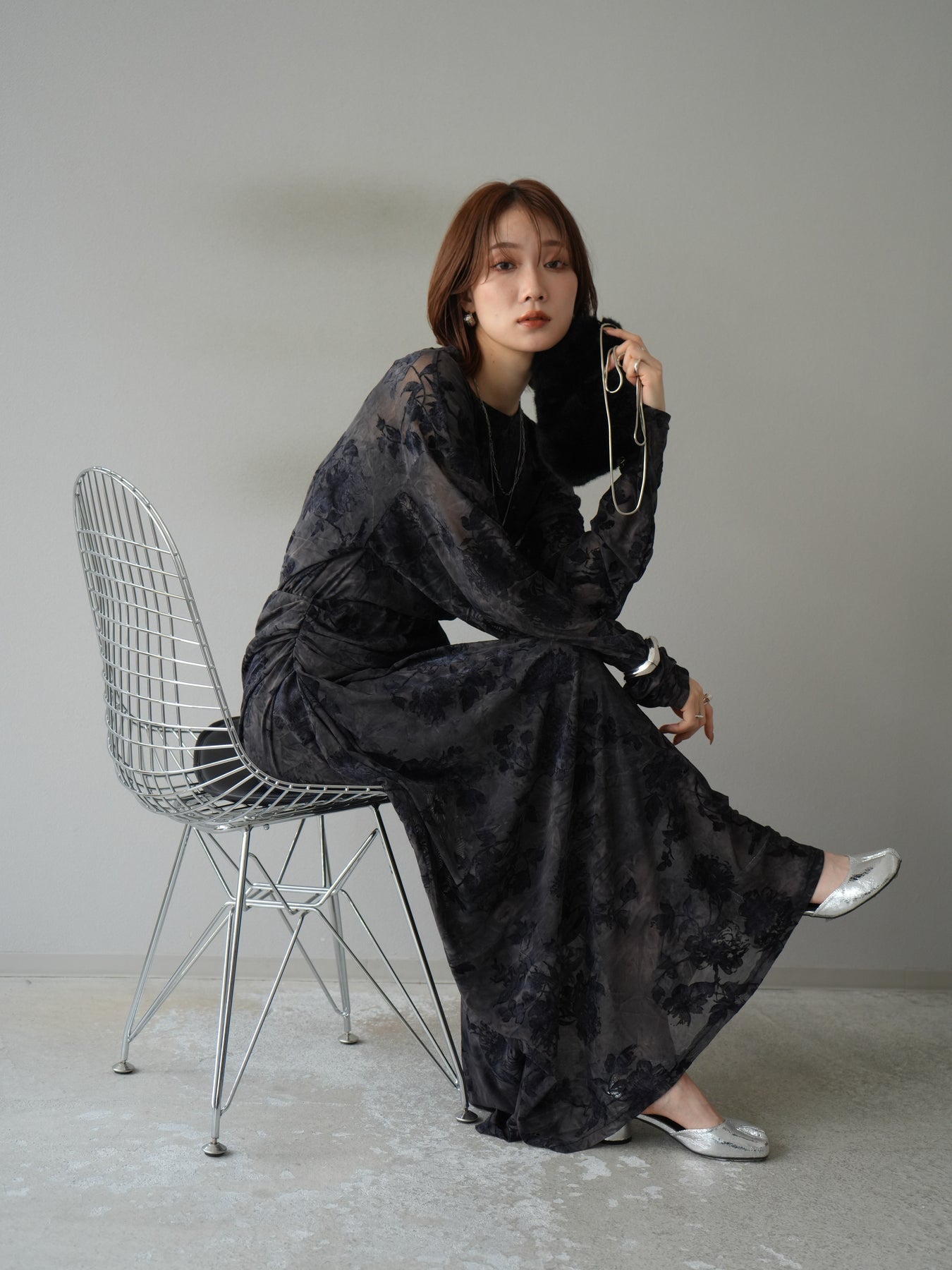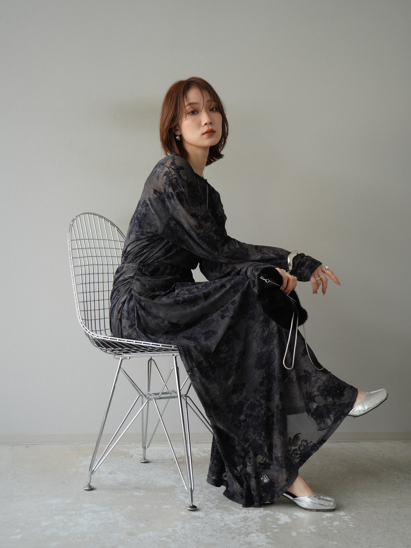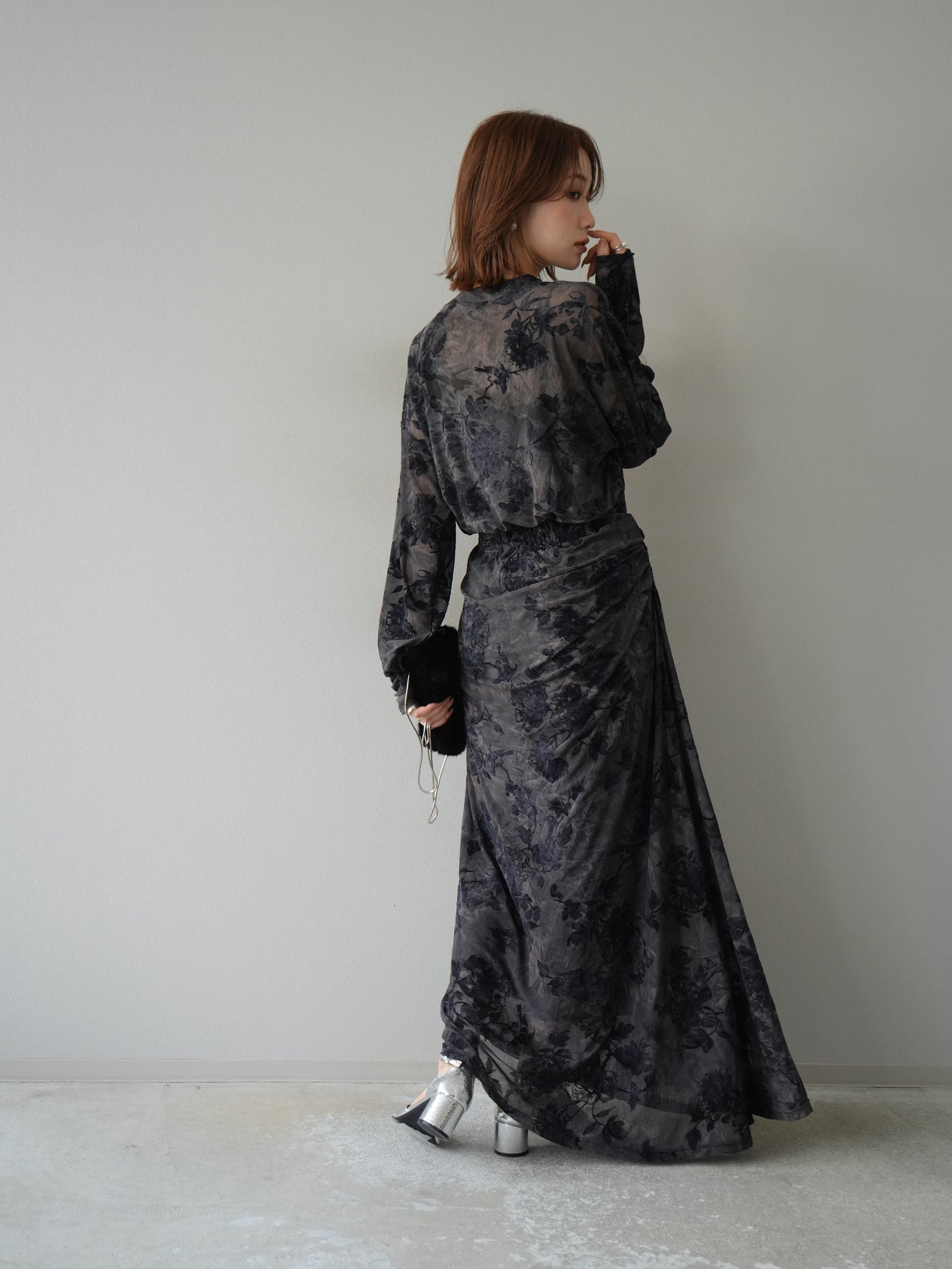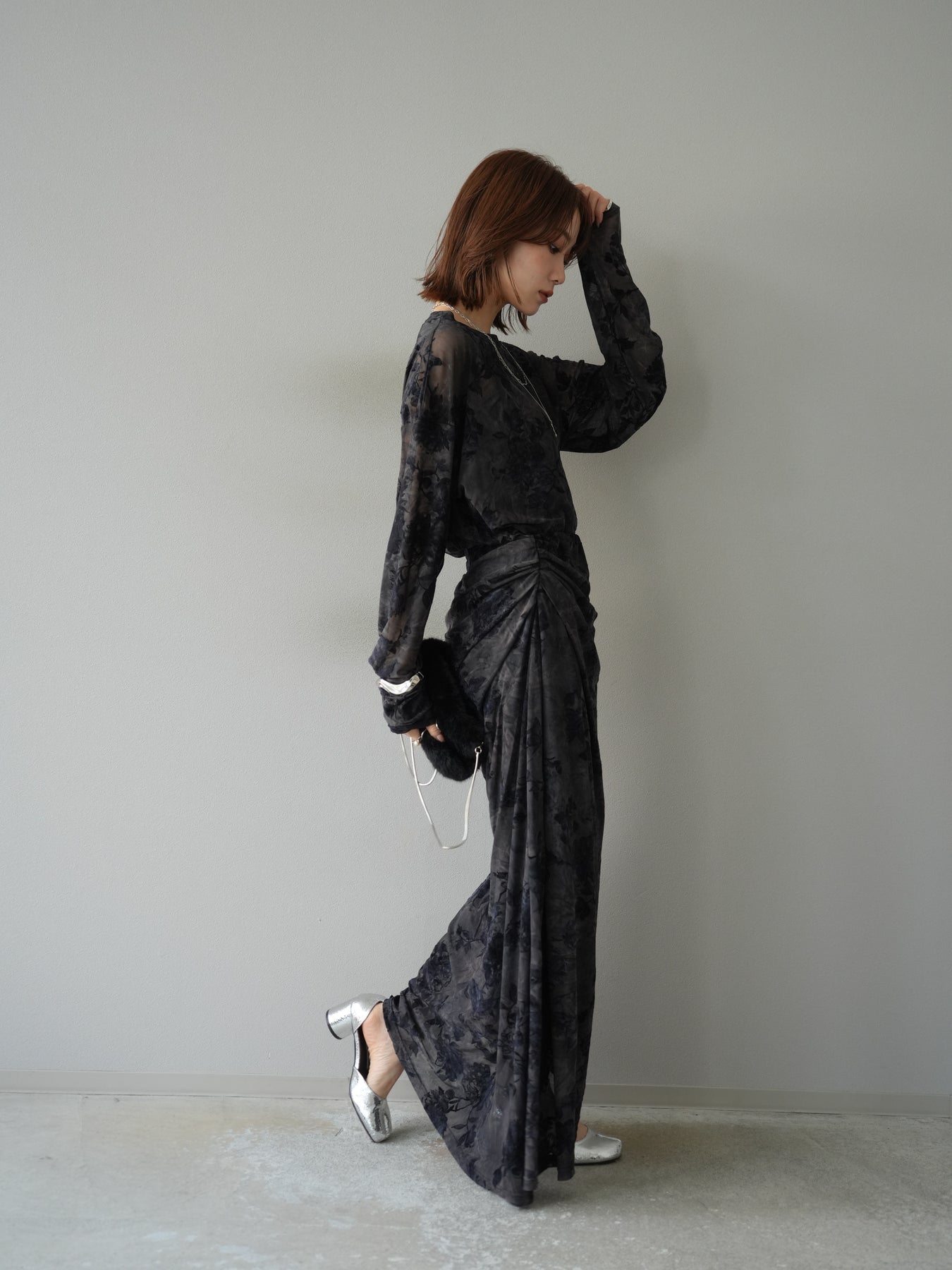 透け感のあるシアー素材にフロッキー加工でフラワーパターンを施した、華やかな印象のスカート。ドレープを効かせたデザインが美しい落ち感を生み、歩くたびに優雅な揺れを演出します。軽やかな素材感ながら、上品な光沢があり、スタイリングに季節感と華やかさをプラス。シンプルなトップスと合わせるだけで主役級のコーディネートが完成するアイテムです。