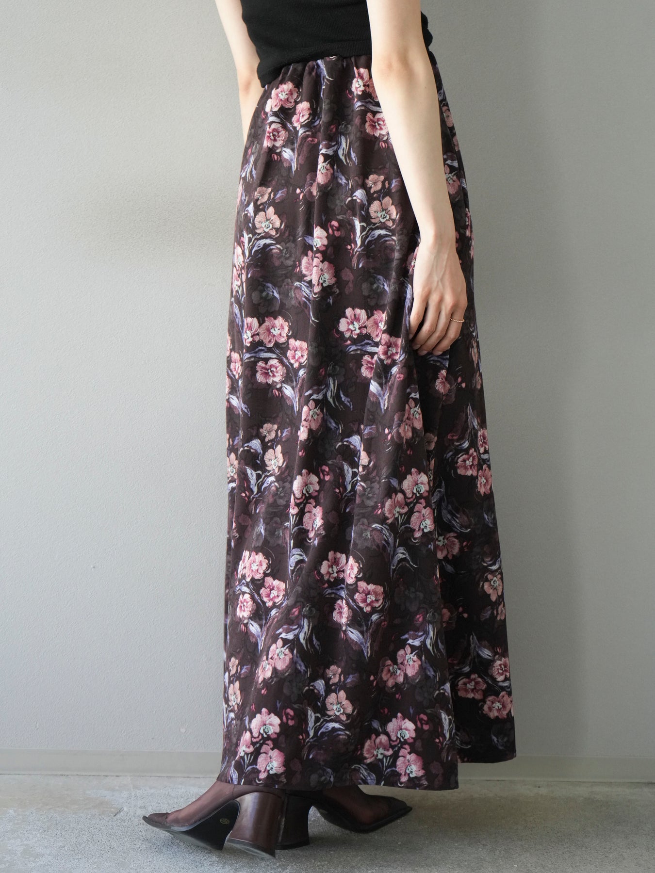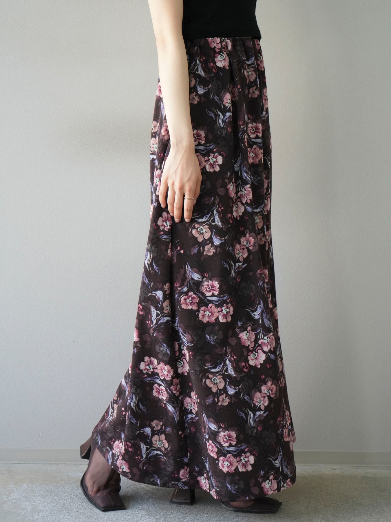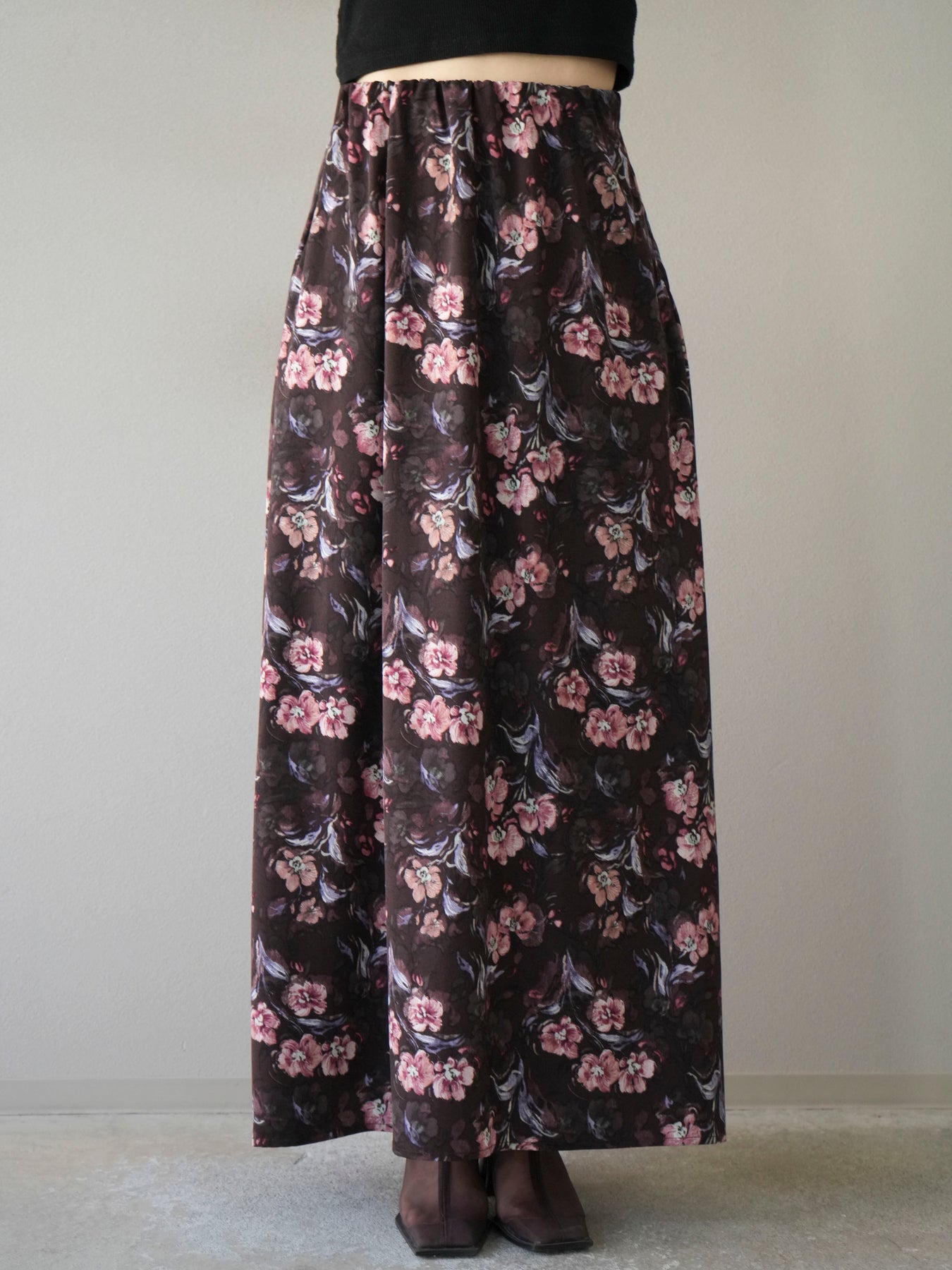 華やかなフラワープリントが目を引くナロースカート。縦に流れるようなシルエットで、すっきりとしたラインを演出しながらも、歩くたびに揺れる柔らかな素材感が女性らしさを引き立てます。ウエストは程よくフィットしつつ快適な穿き心地を叶え、トップスをインしてもアウトしてもバランス良く着こなせるデザイン。ブラウスやニットと合わせるだけで、スタイリング全体が華やかにまとまるアイテムです。