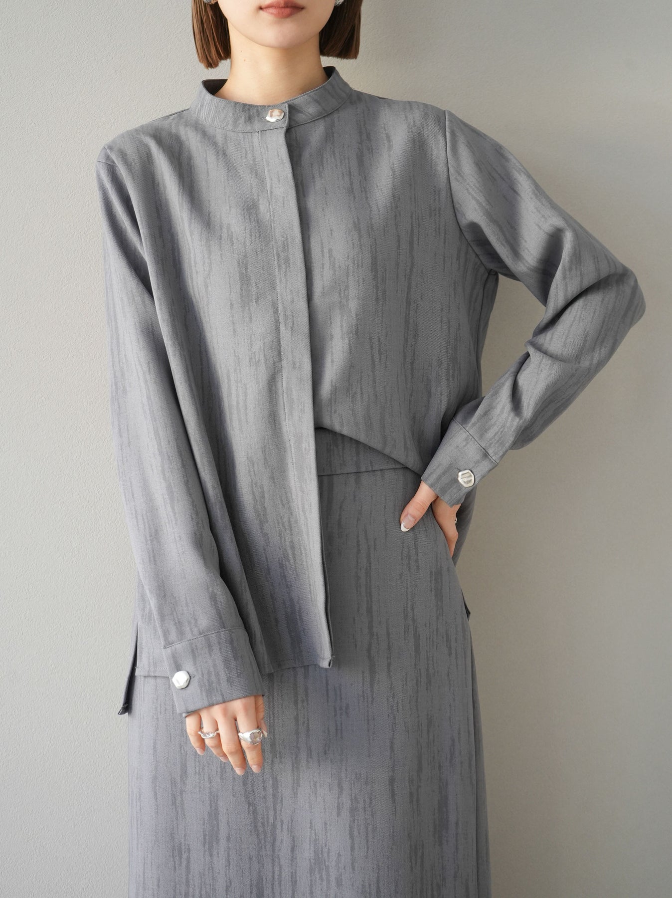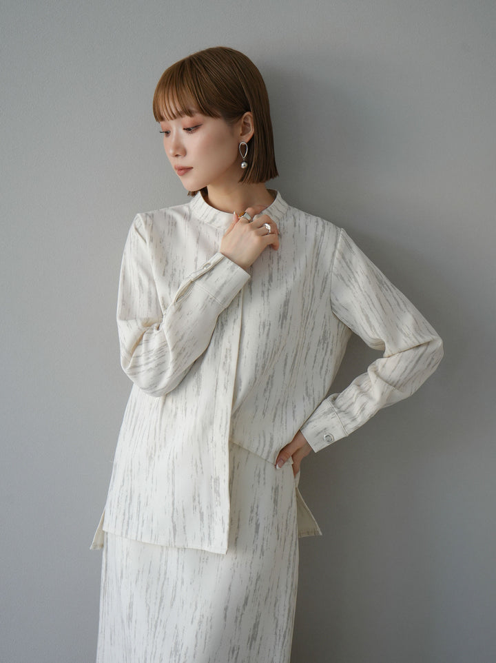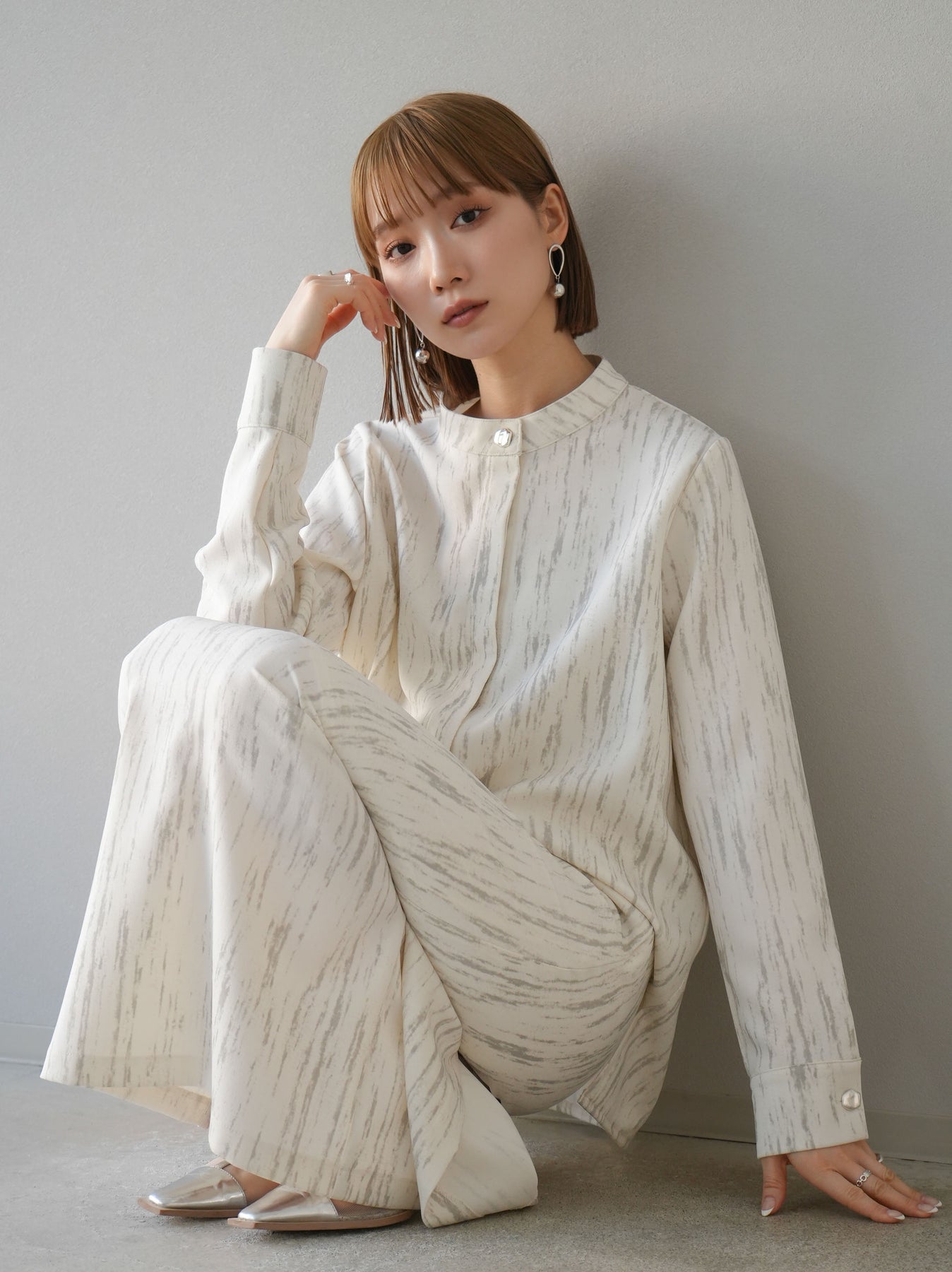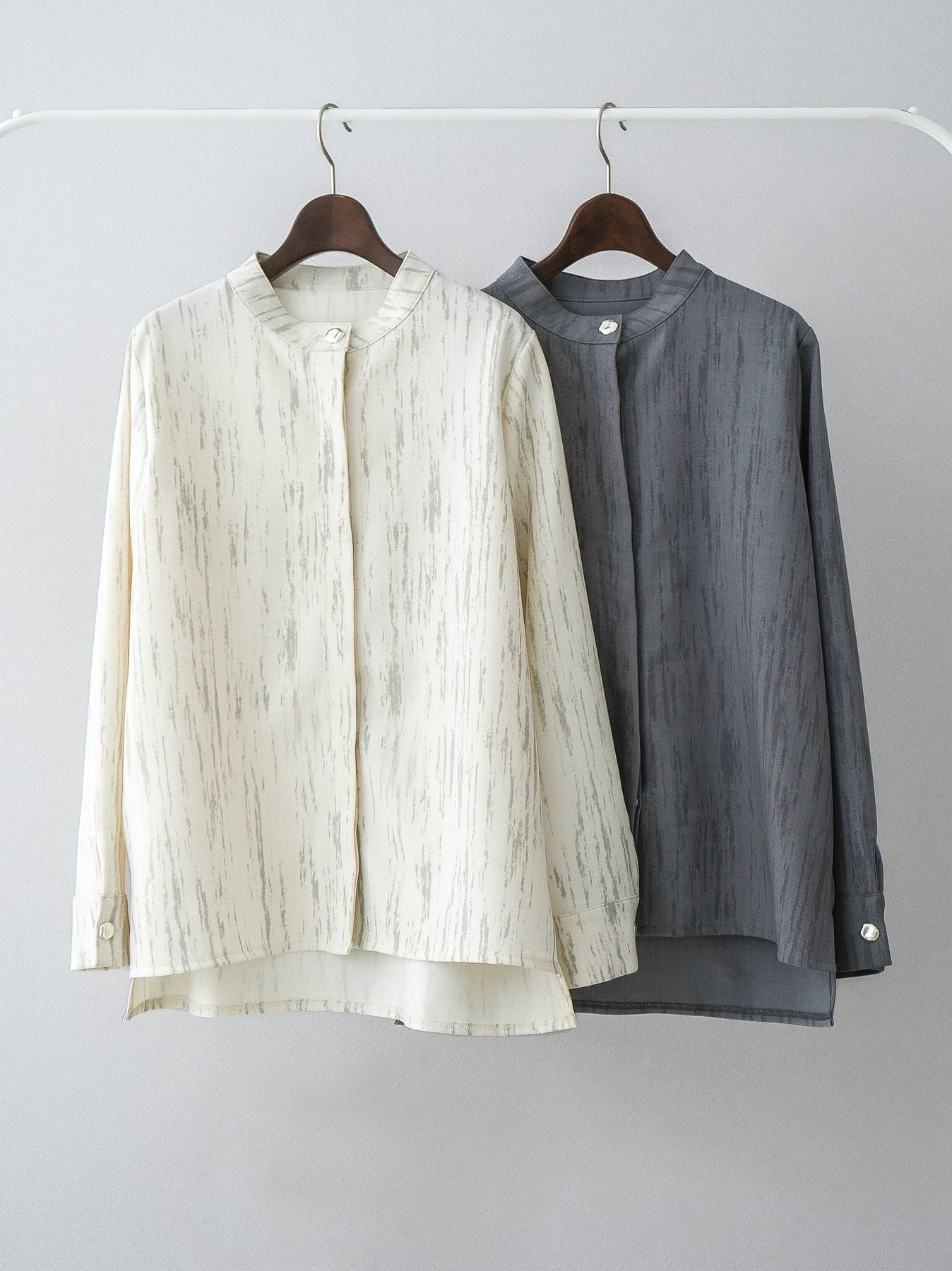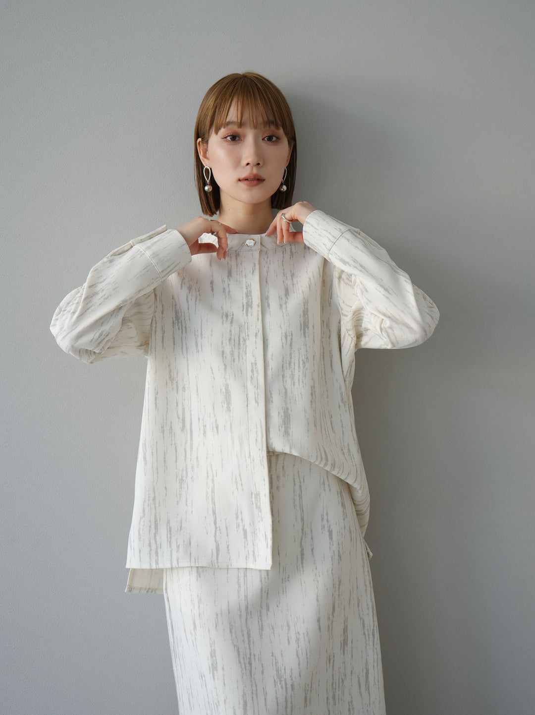 トレンド感漂う水彩柄が魅力のバンドカラーシャツ。柔らかな風合いと落ち感のある素材が、品のあるスタイルを演出。比翼仕立てのフロントデザインでミニマルな印象を与えつつ、パール調のボタンがアクセントに。シンプルながらも存在感のある一枚は、デイリーからオフィススタイルまで幅広く活躍。単品使いはもちろん、セットアップでの着こなしもおすすめ。 ※ボトムス、キャミソール(インナー)以外の商品は一律でインナーは付属していません