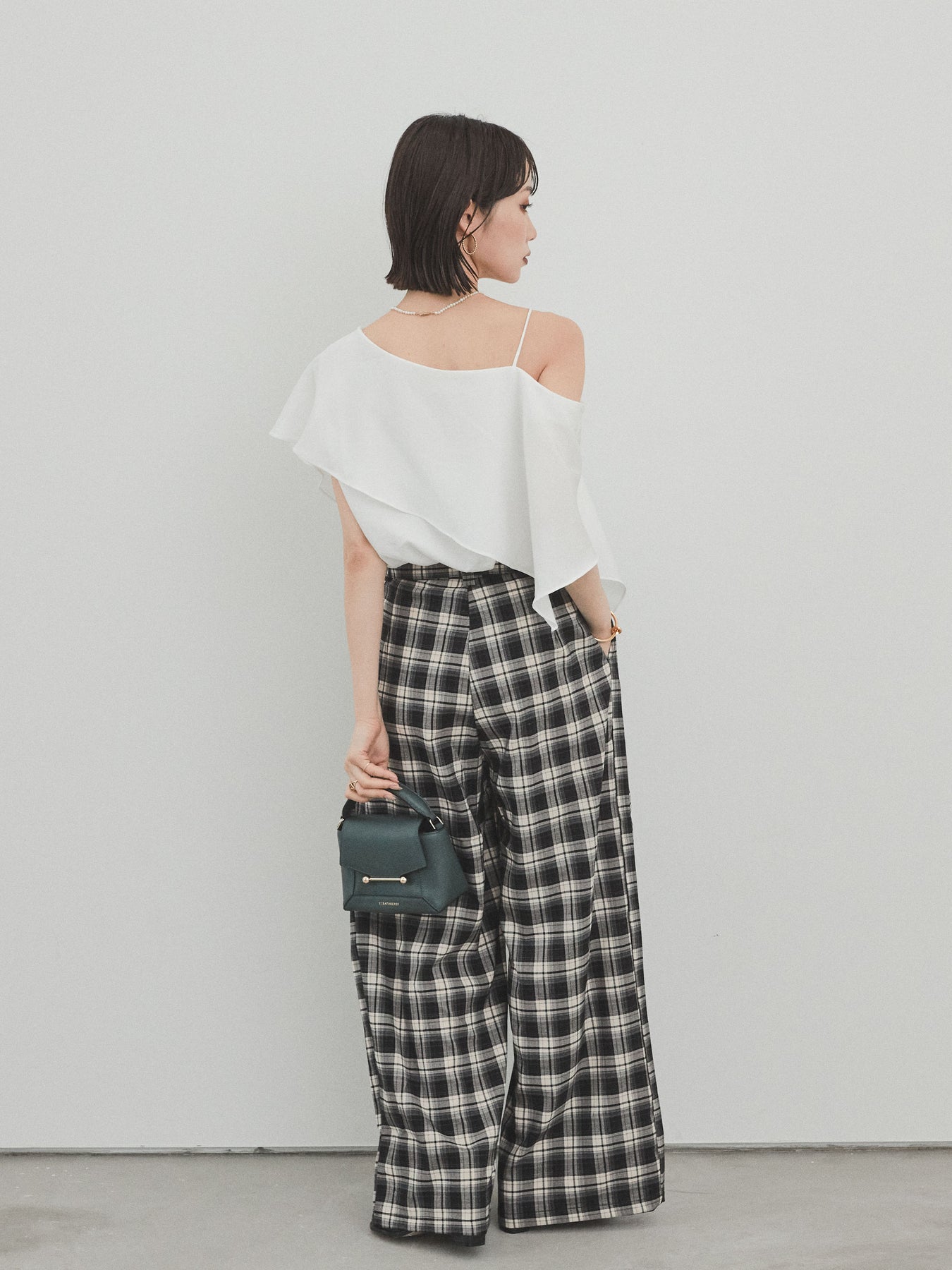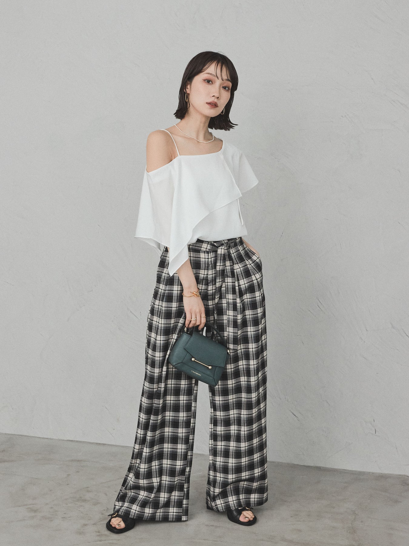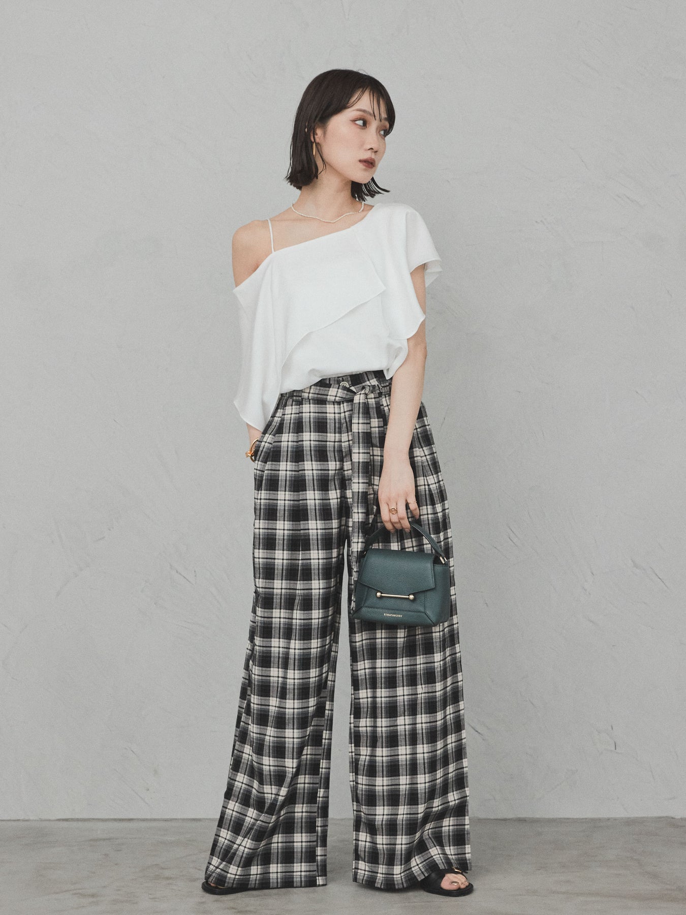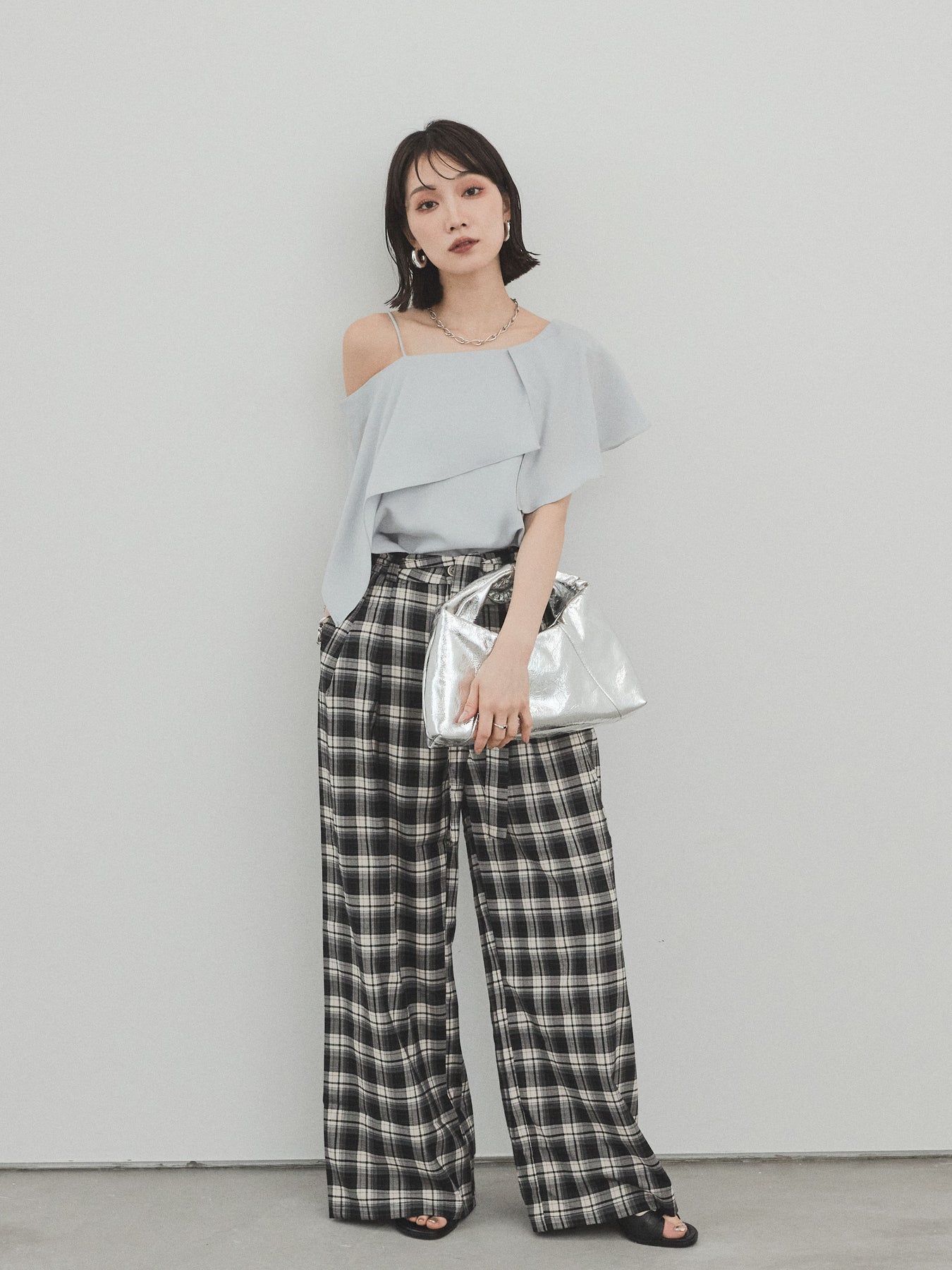 [SET]ワンショルラッフルブラウス+チェック柄ワイドパンツ(2set)