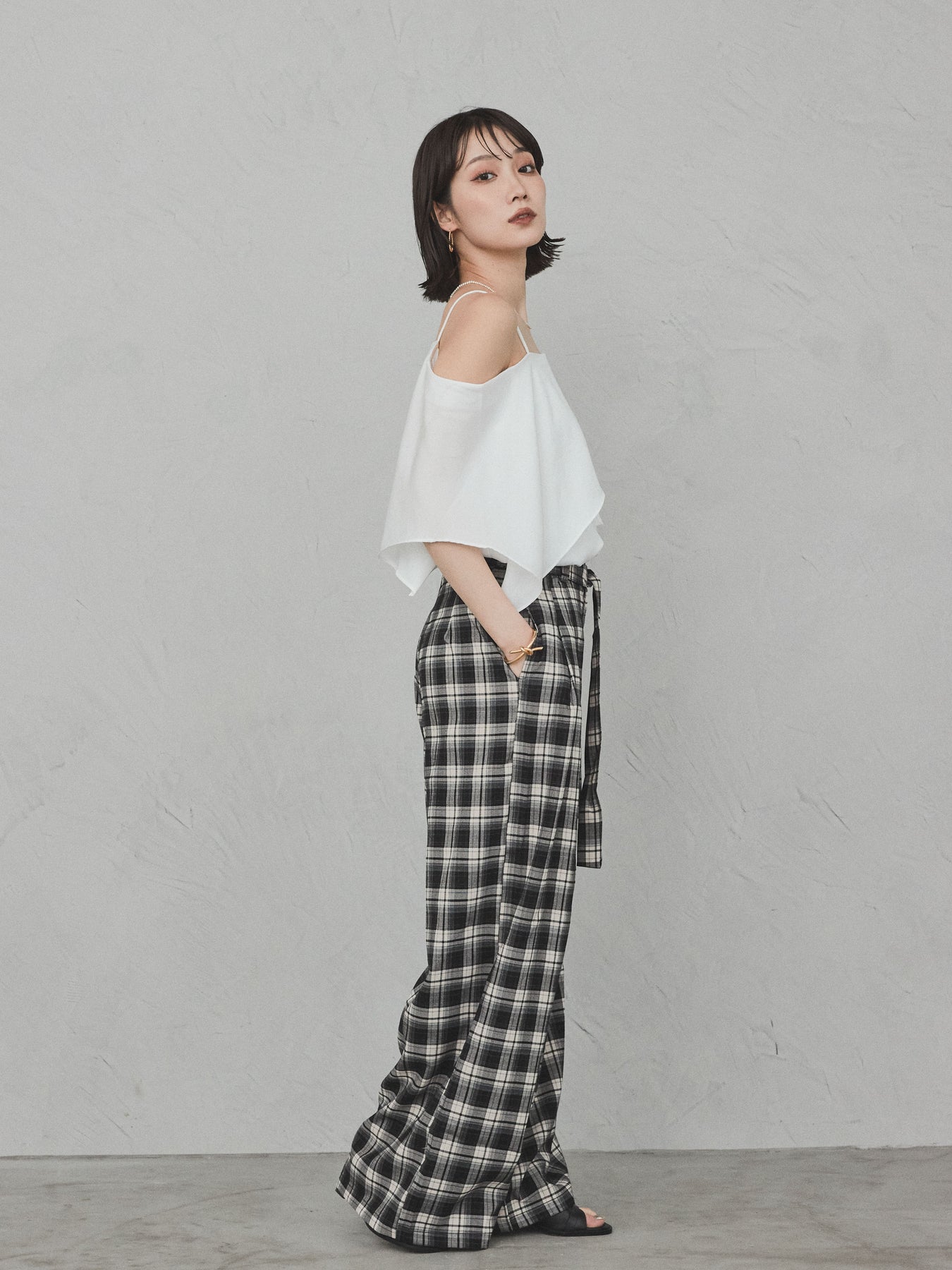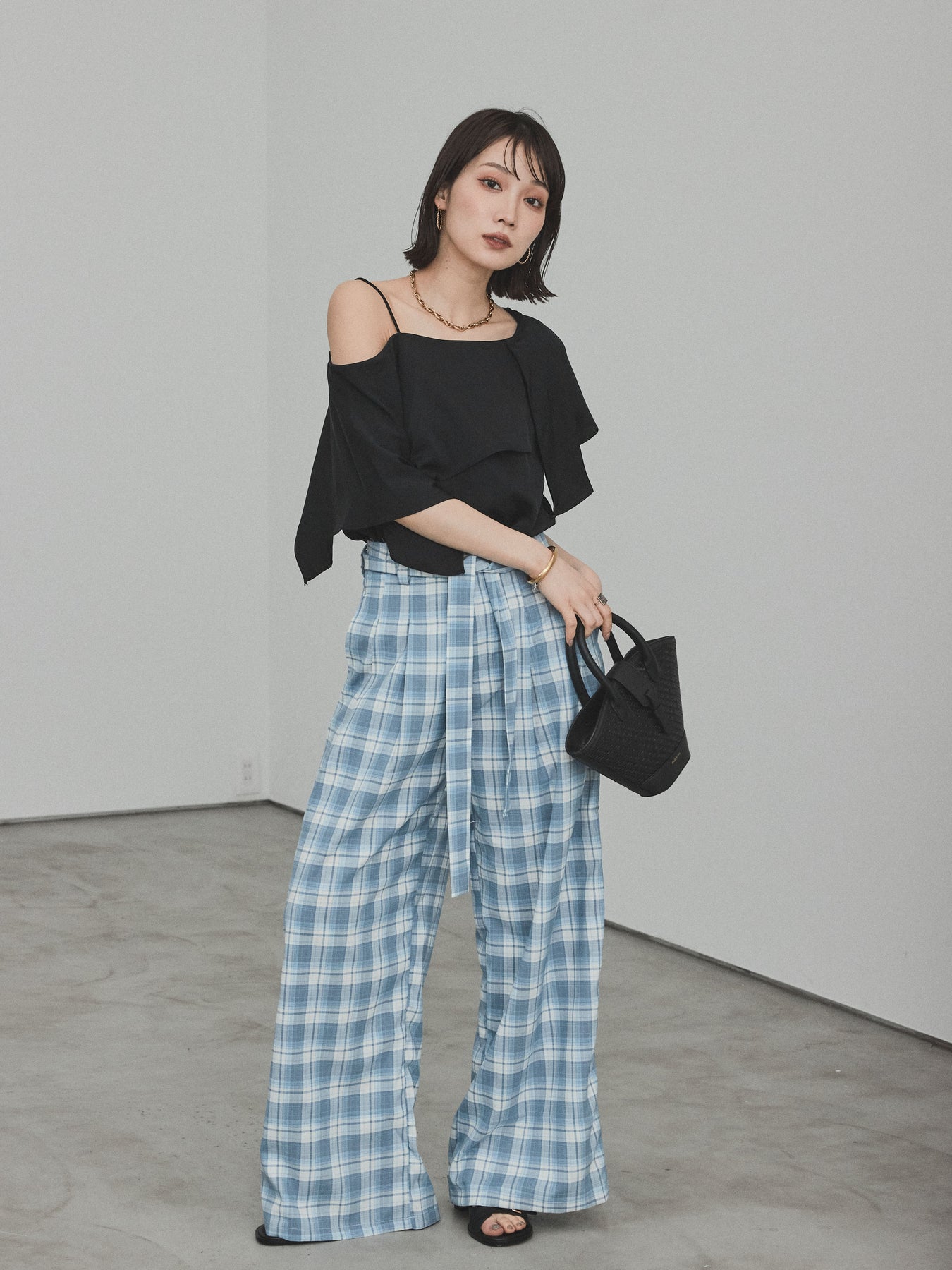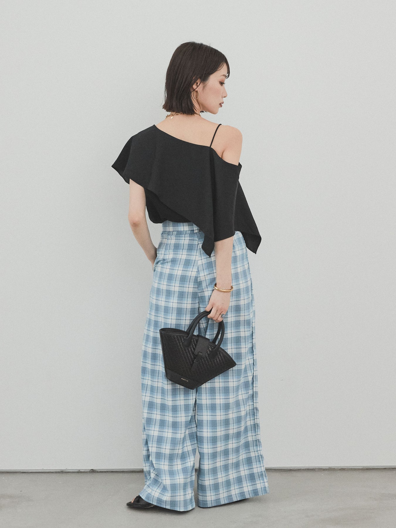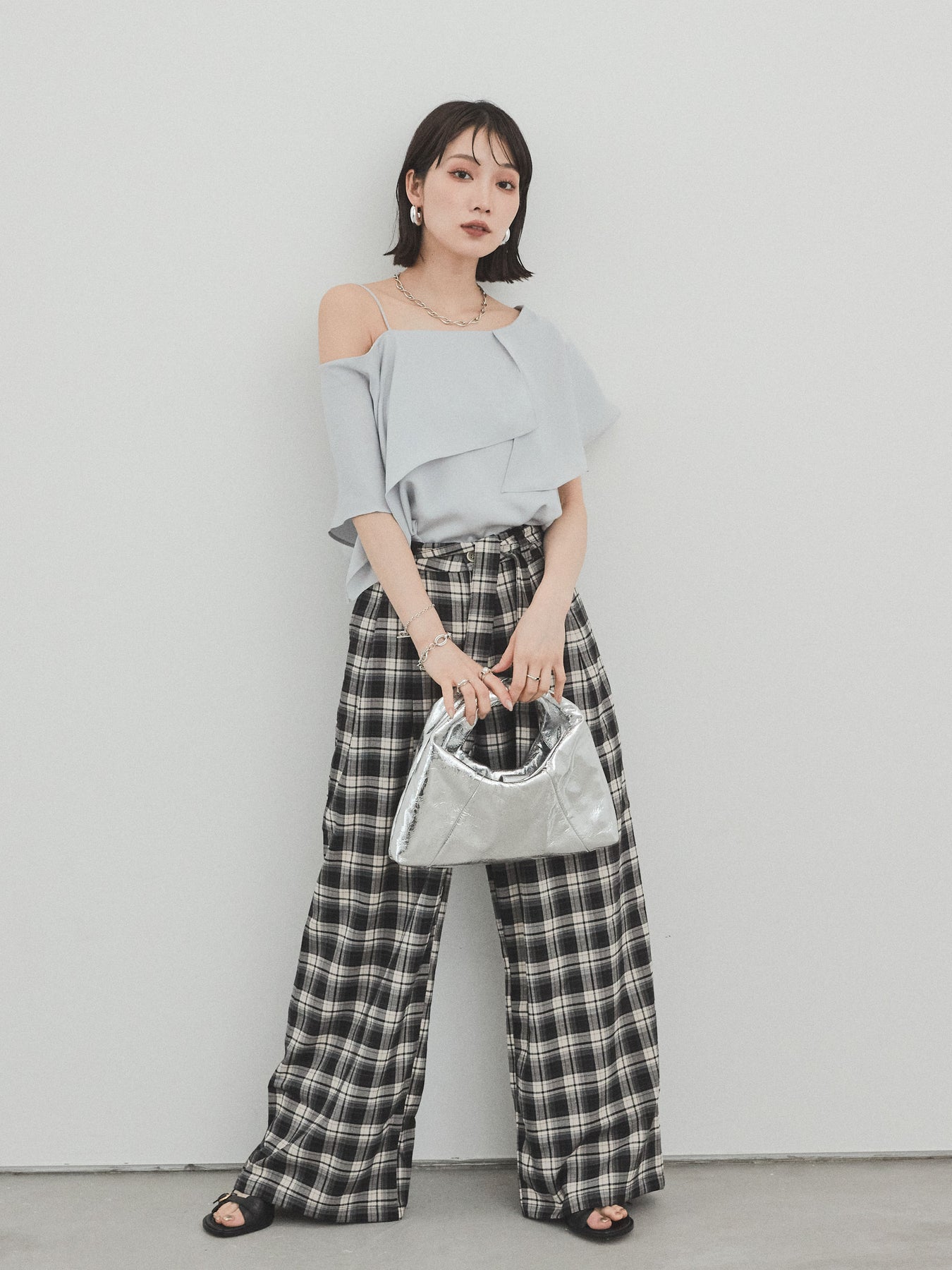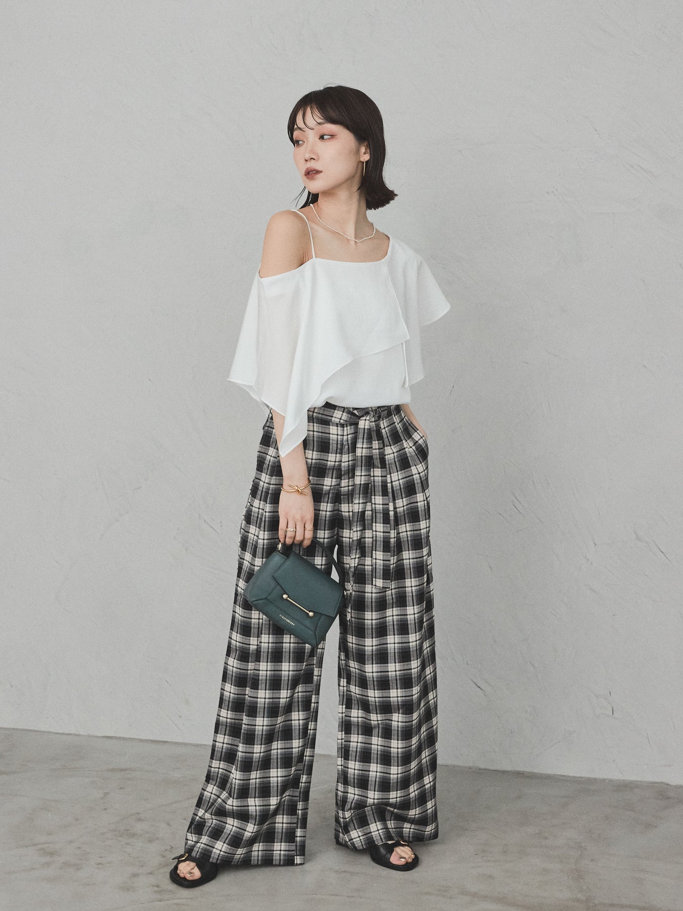 [SET]ワンショルラッフルブラウス+チェック柄ワイドパンツ(2set)