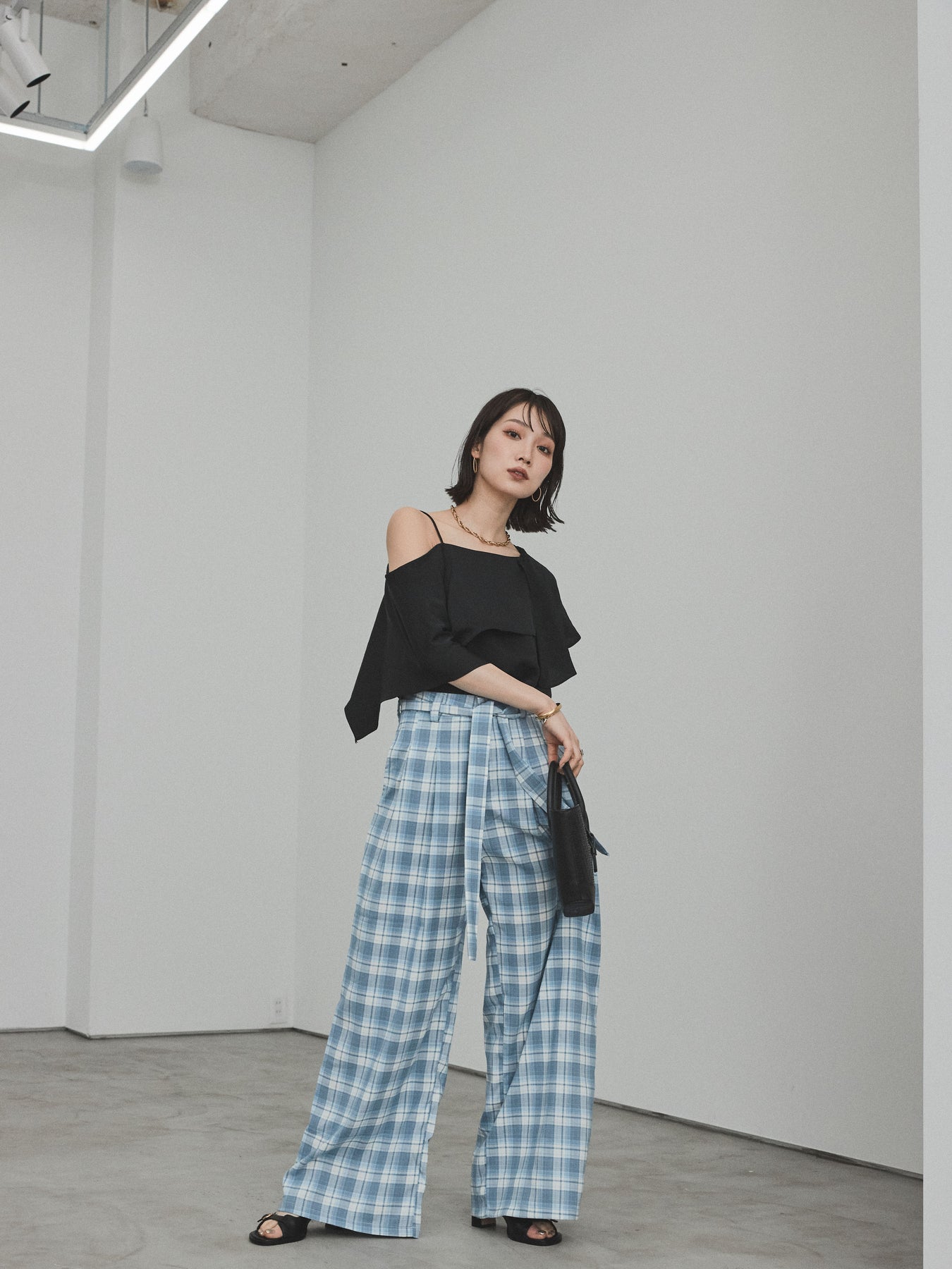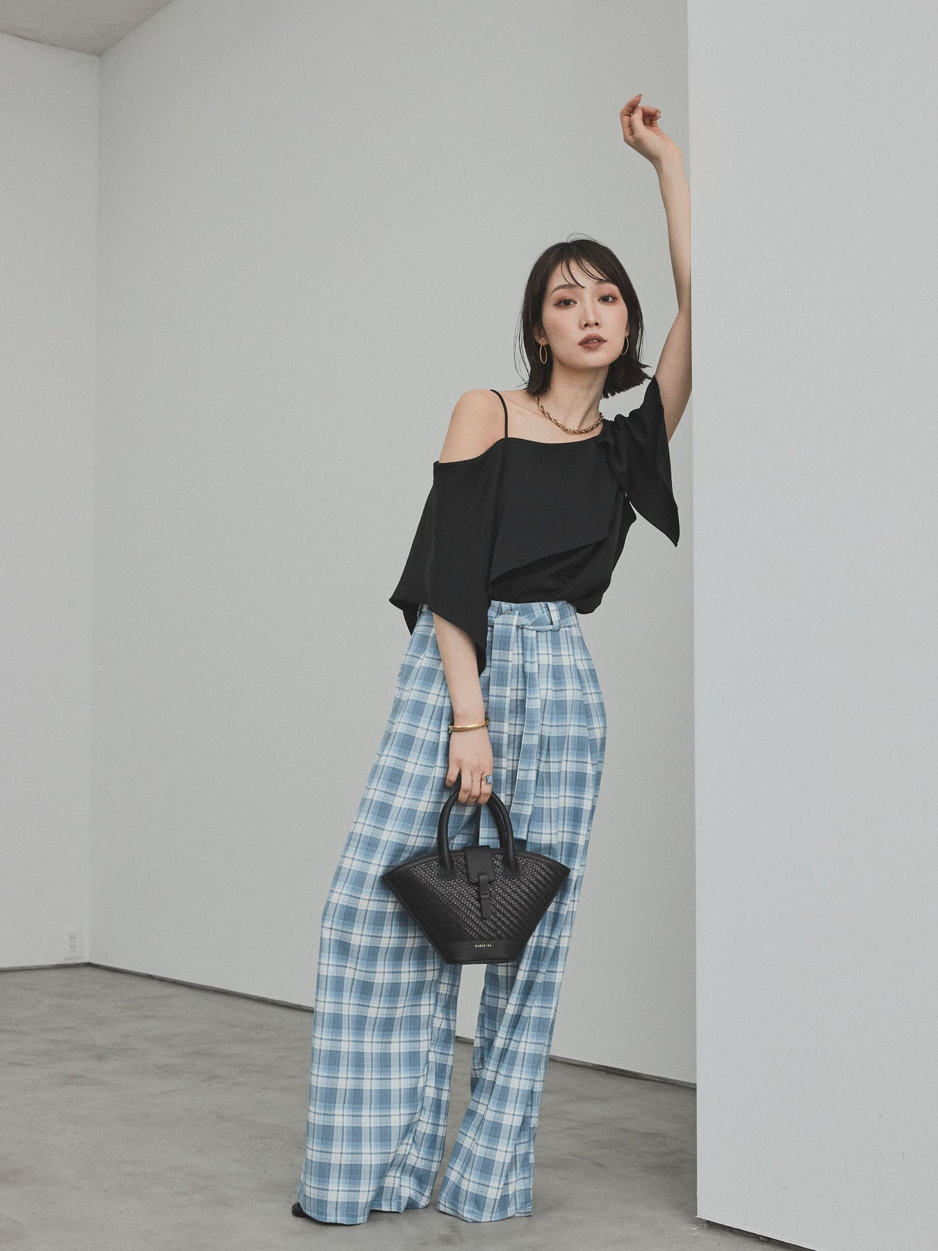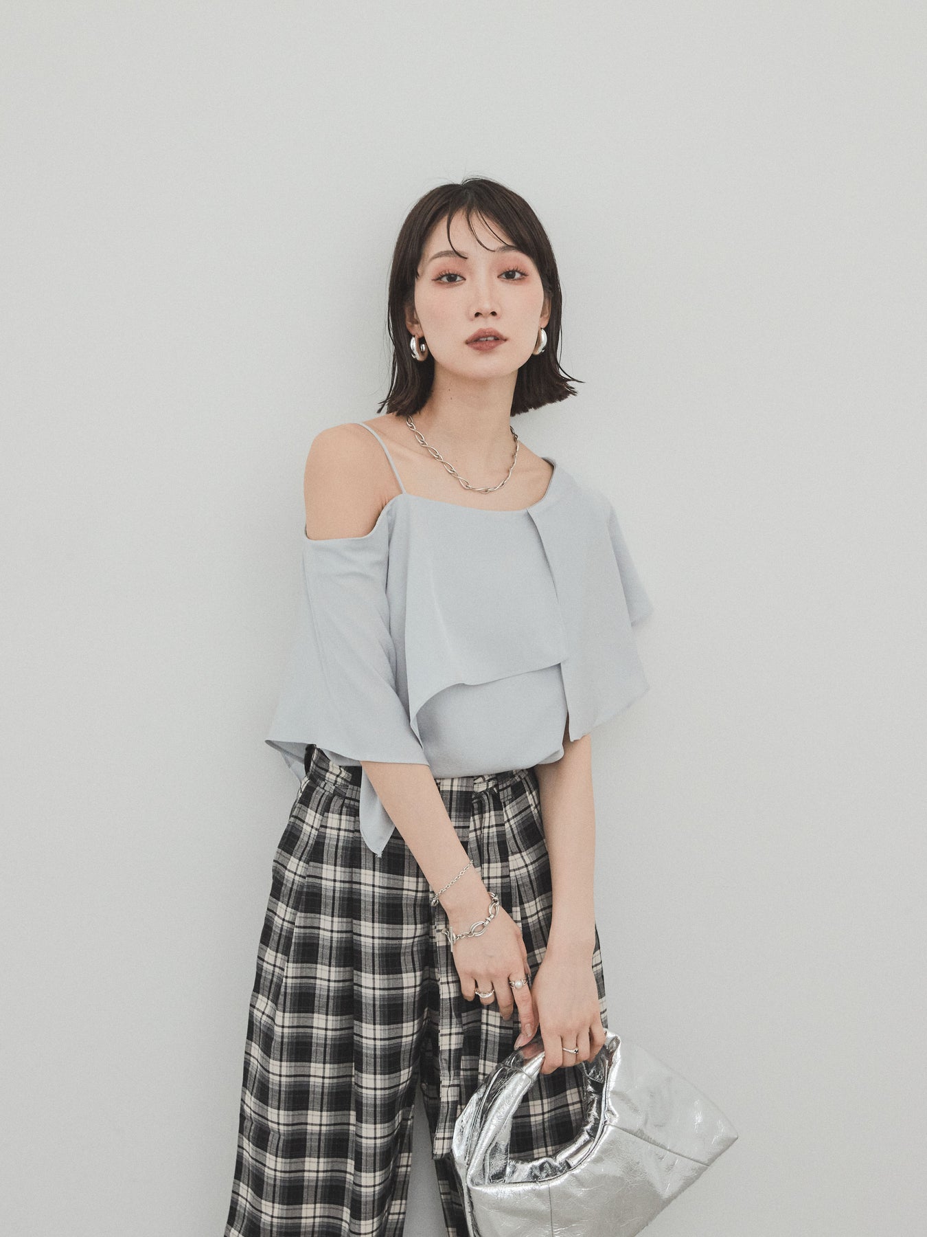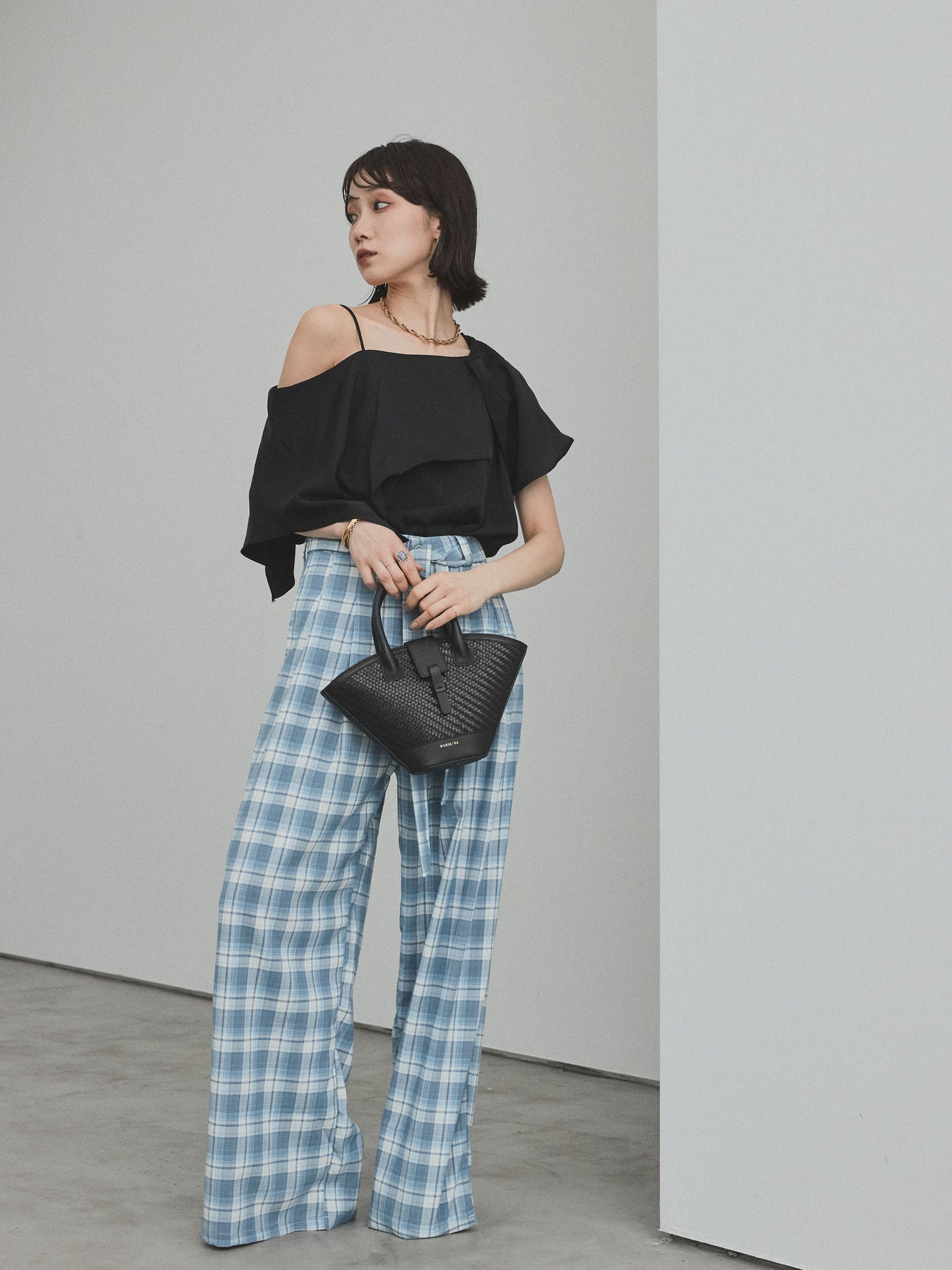 [SET]ワンショルラッフルブラウス+チェック柄ワイドパンツ(2set)