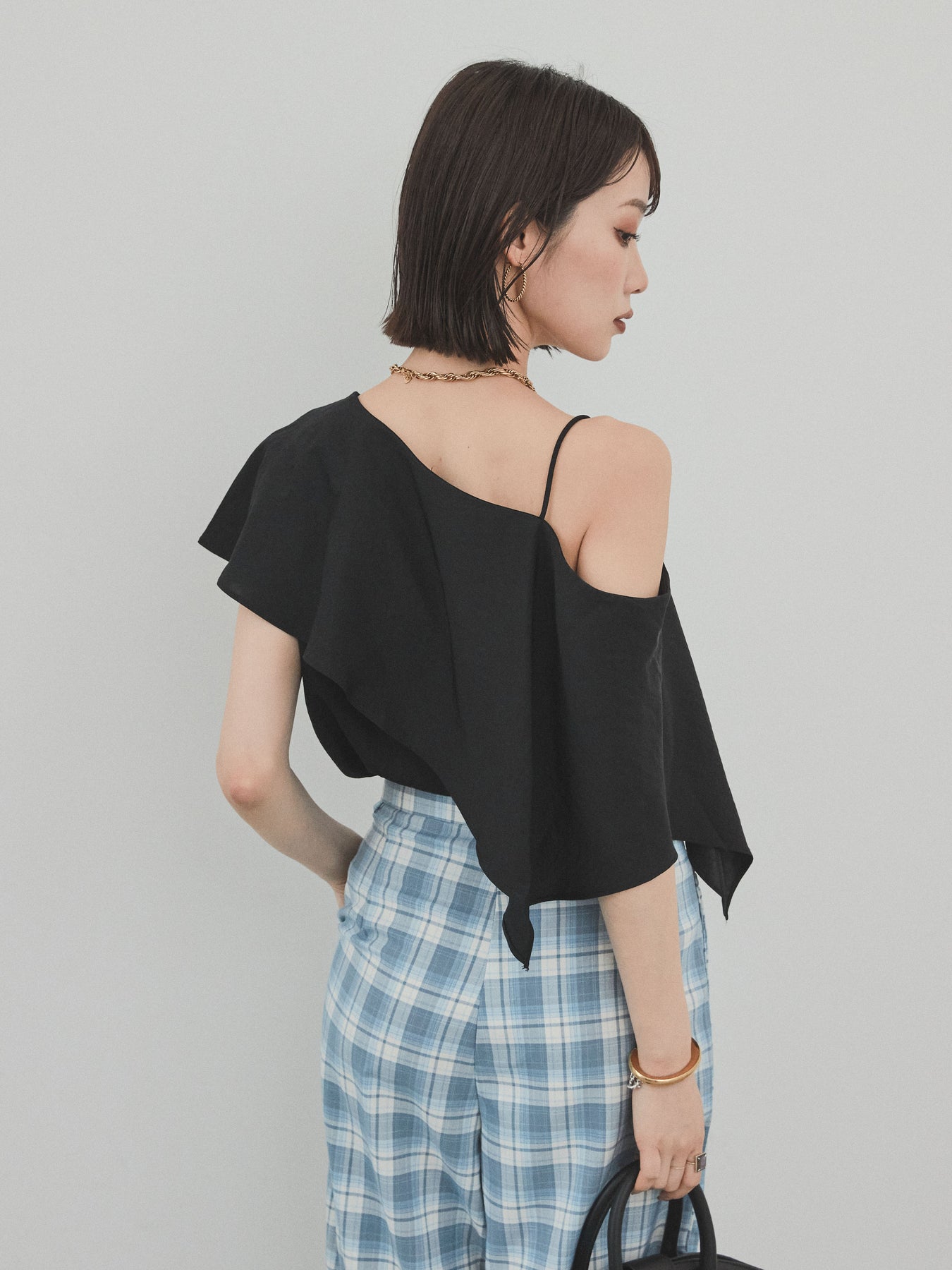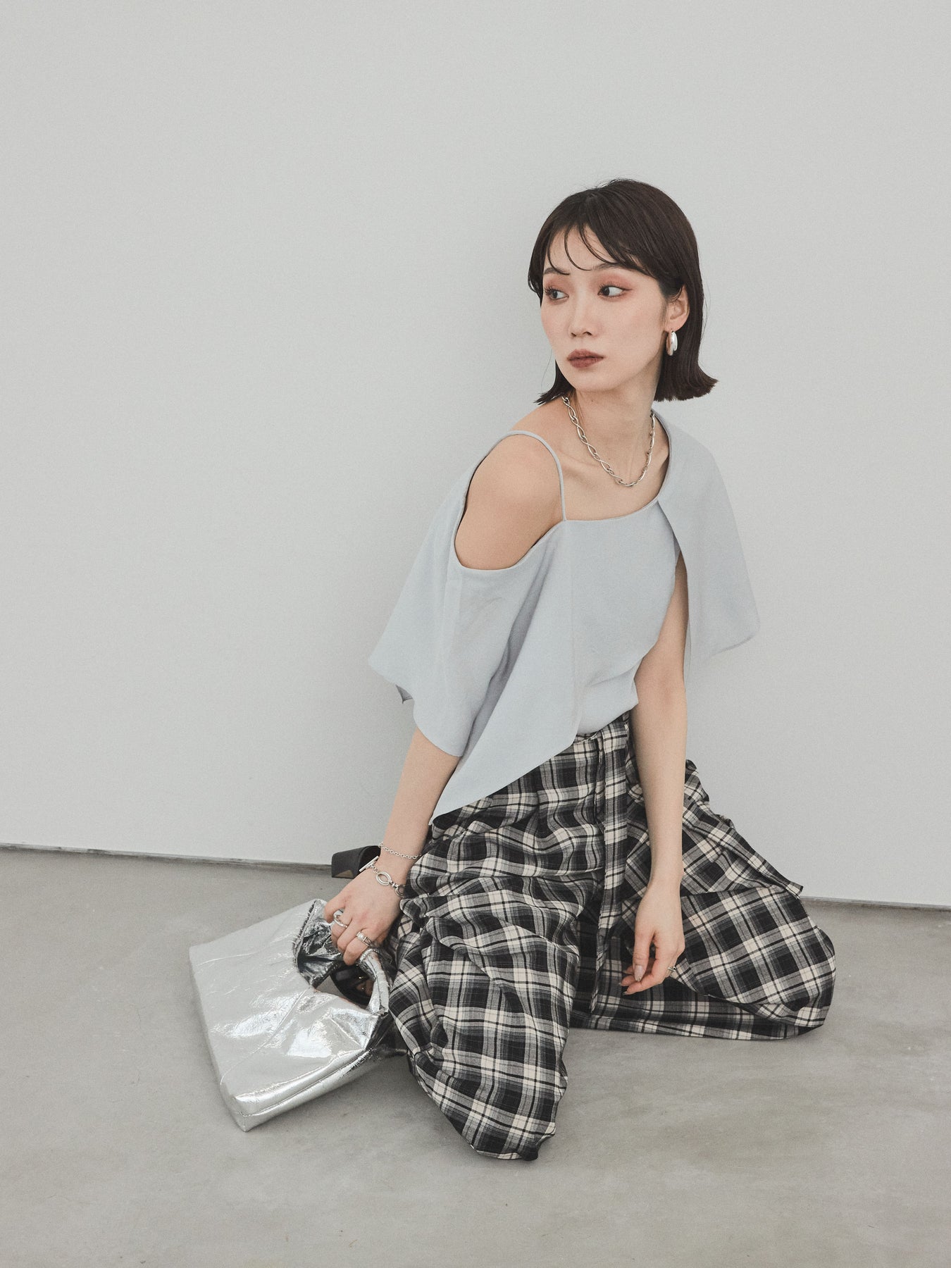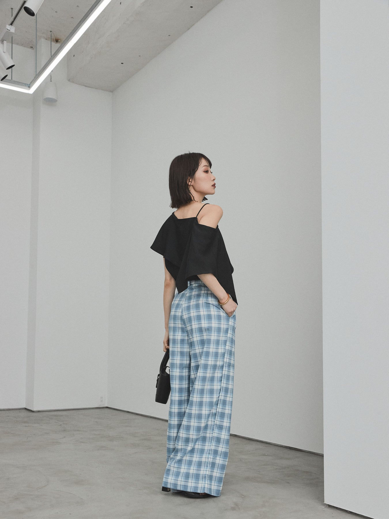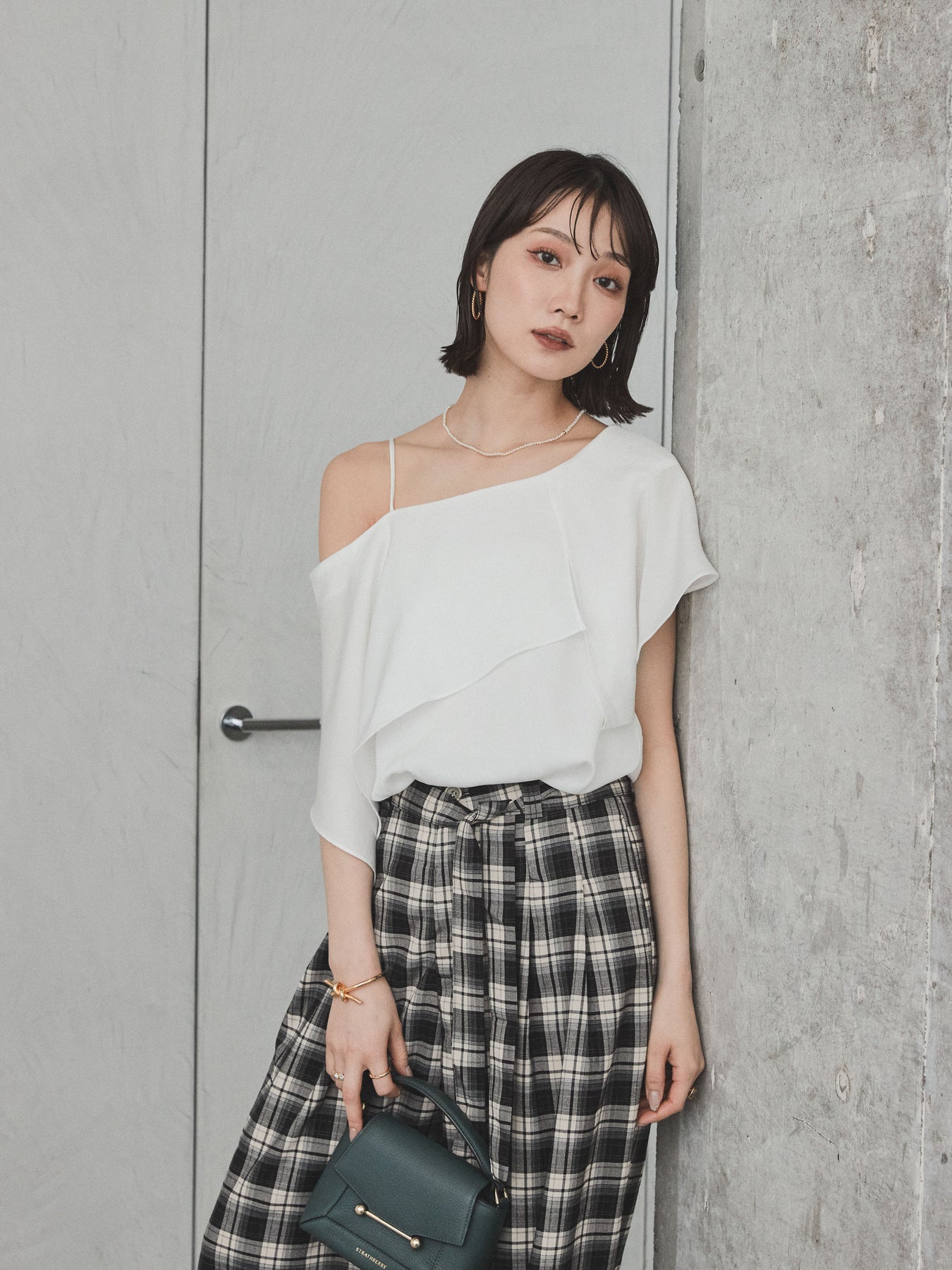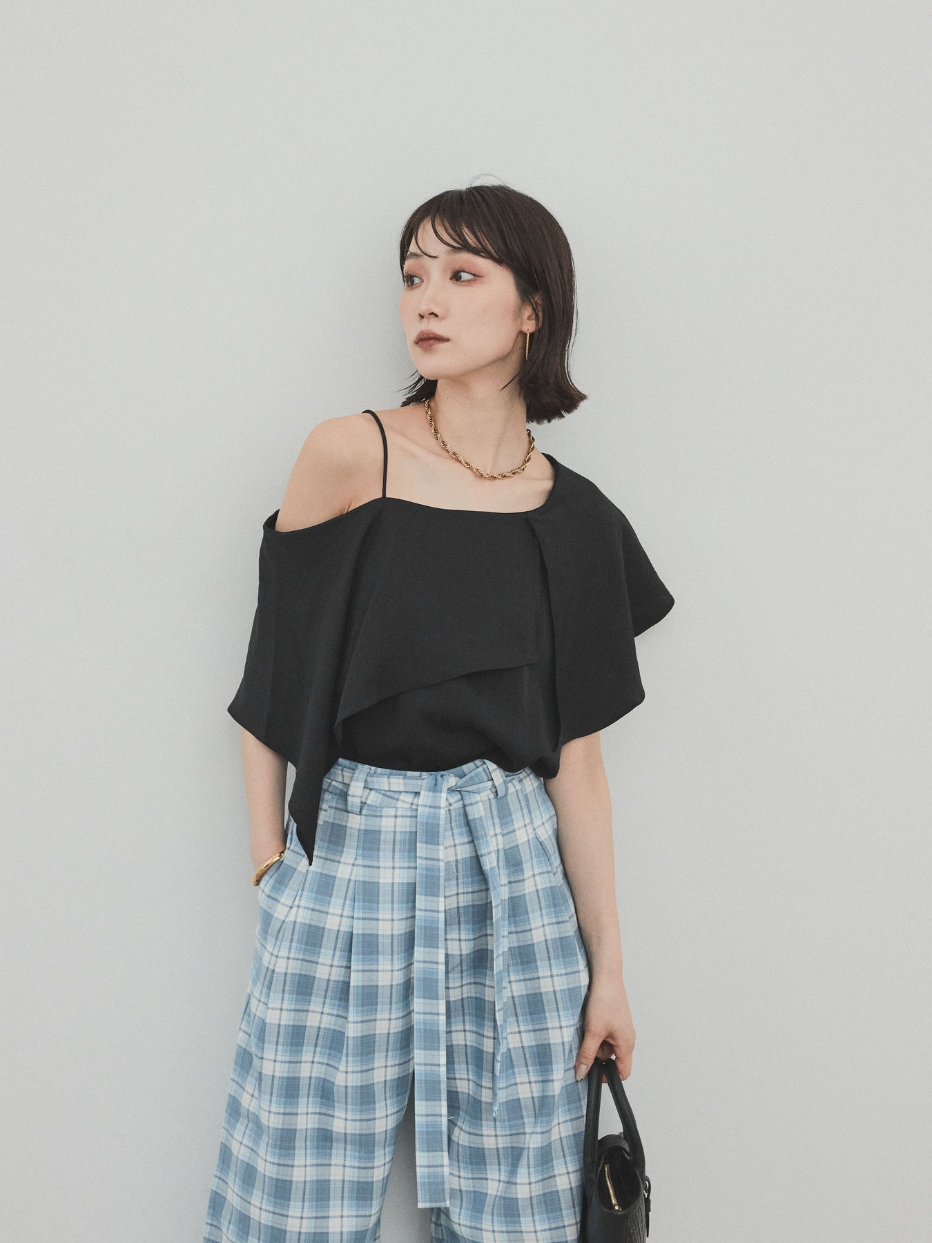 [SET]ワンショルラッフルブラウス+チェック柄ワイドパンツ(2set)