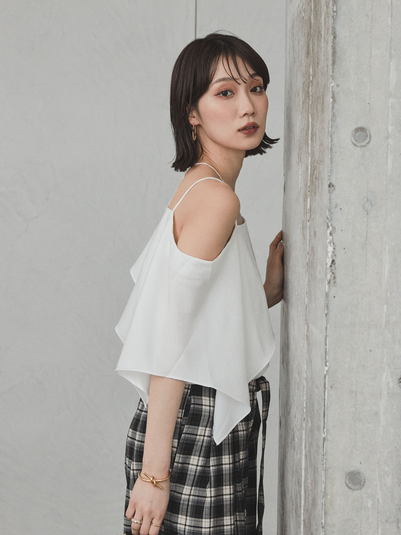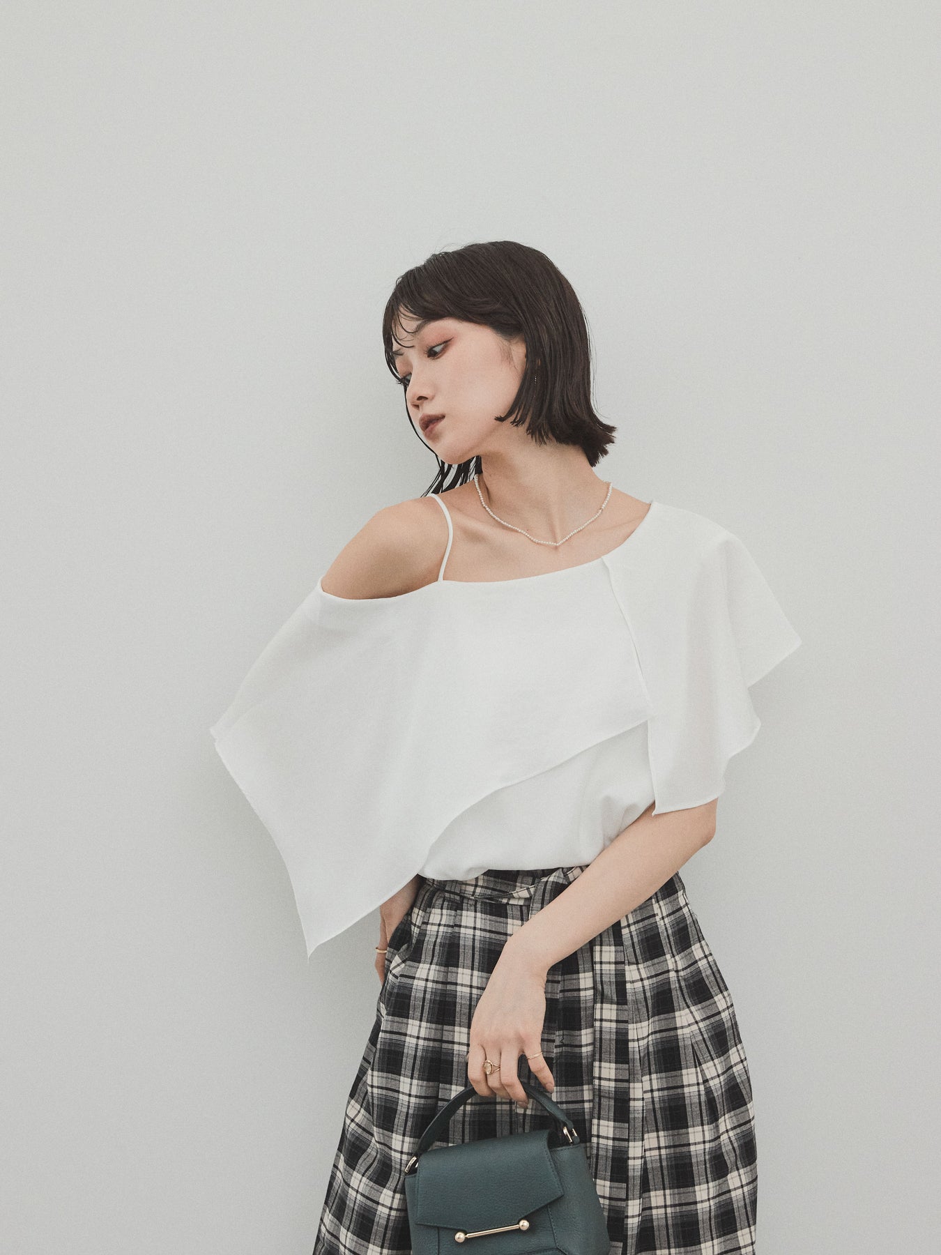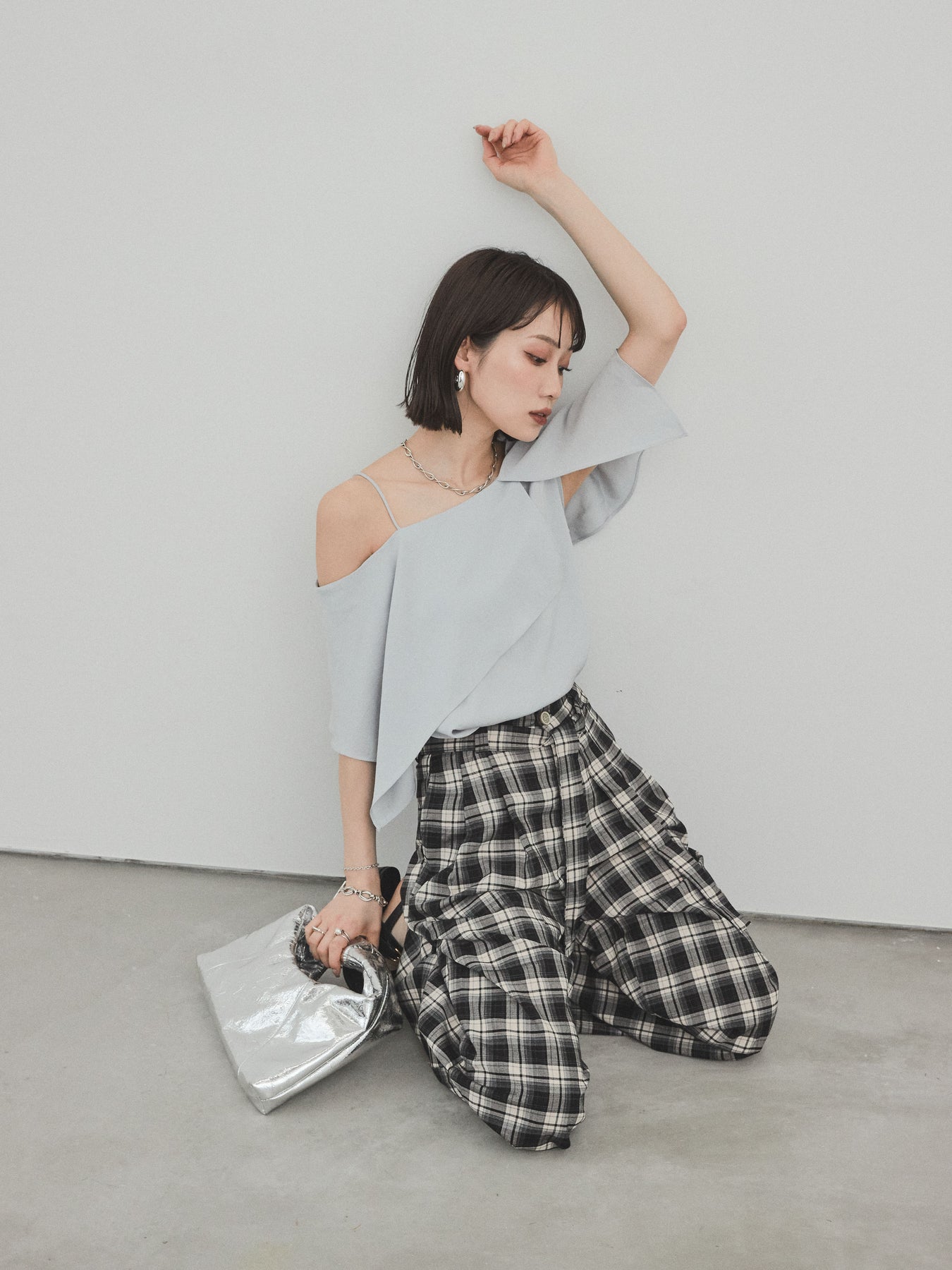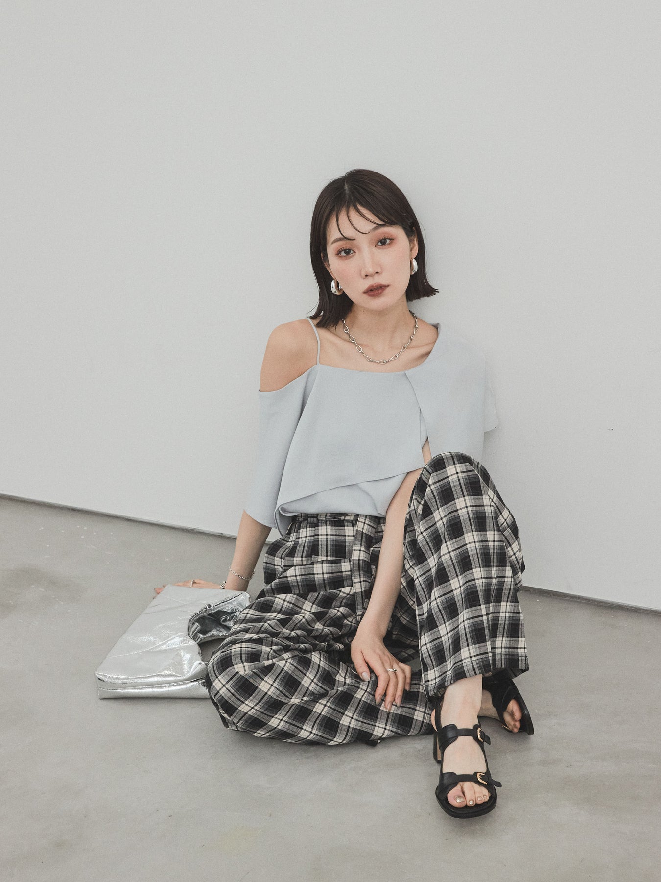 [SET]ワンショルラッフルブラウス+チェック柄ワイドパンツ(2set)