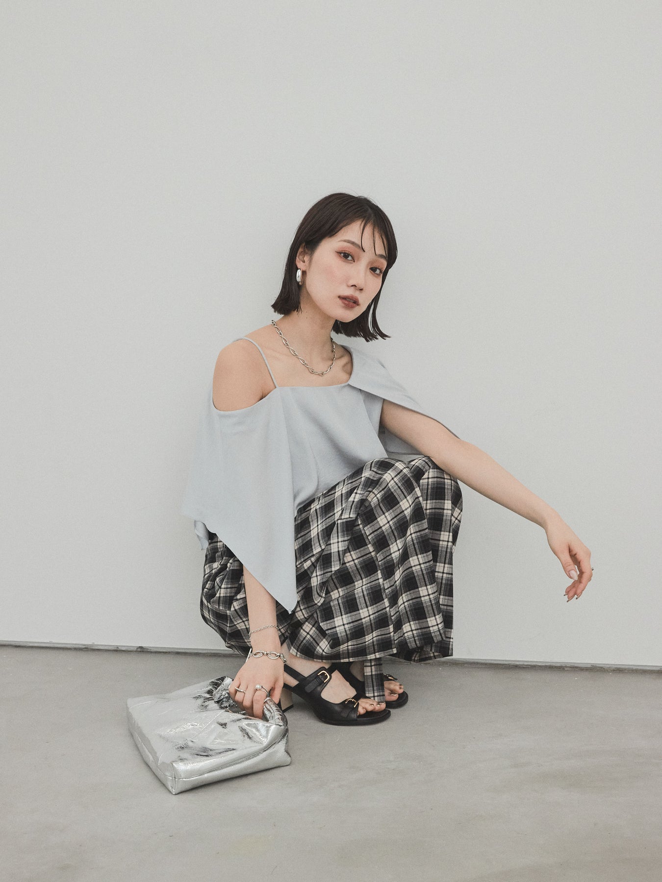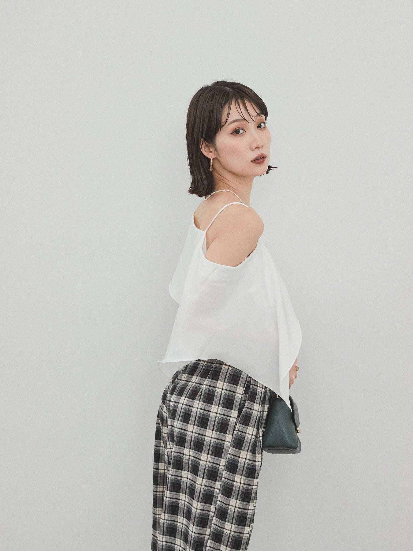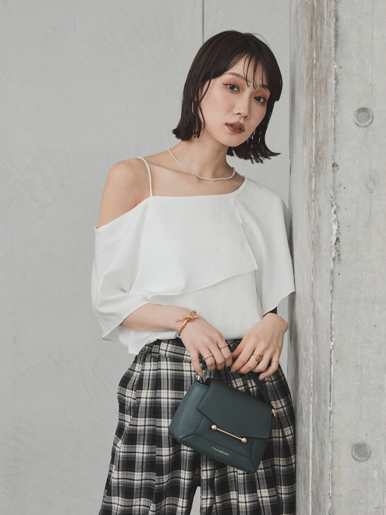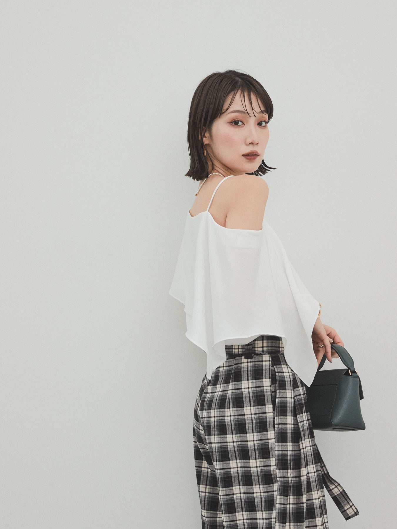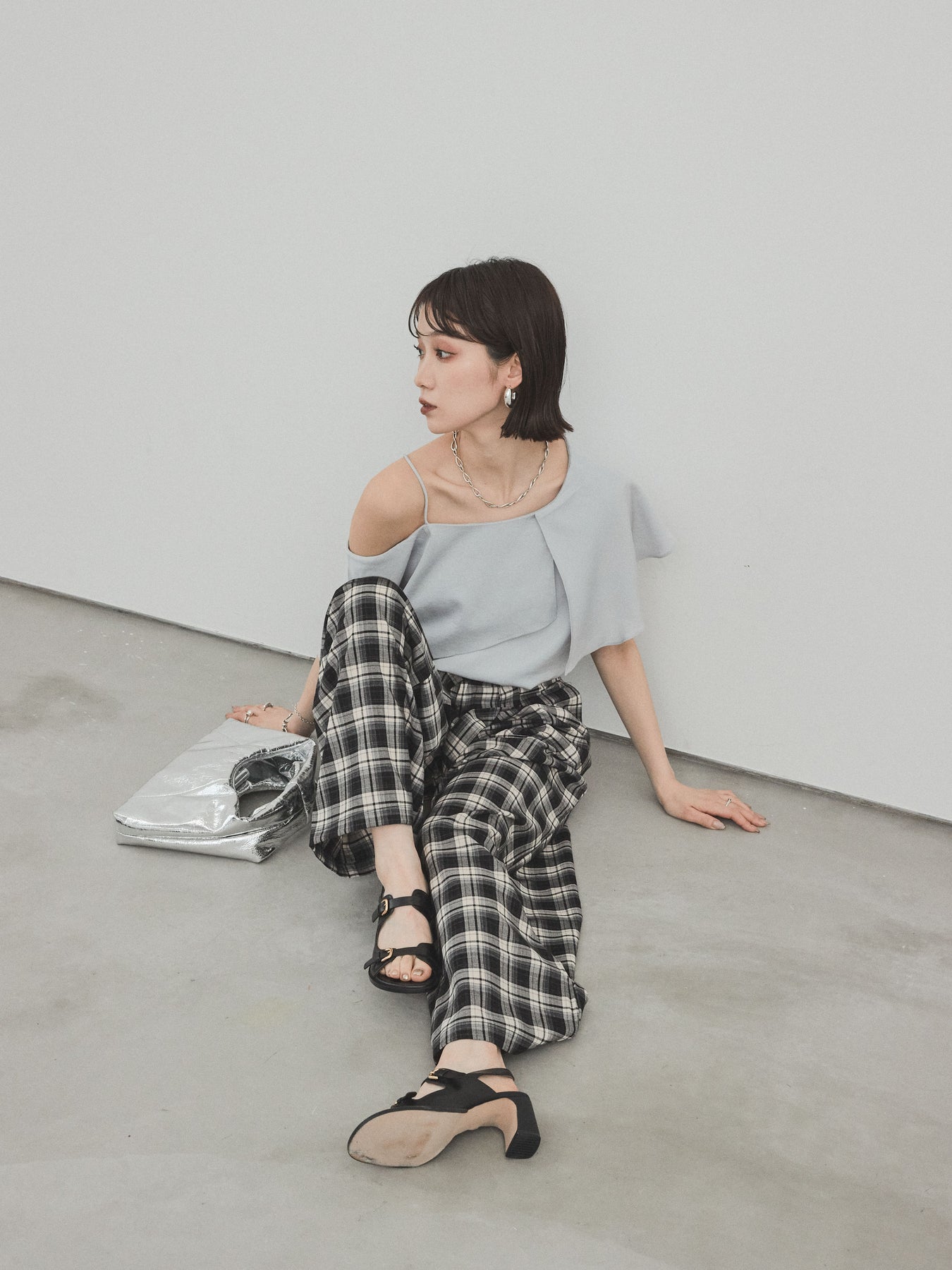 [SET]ワンショルラッフルブラウス+チェック柄ワイドパンツ(2set)