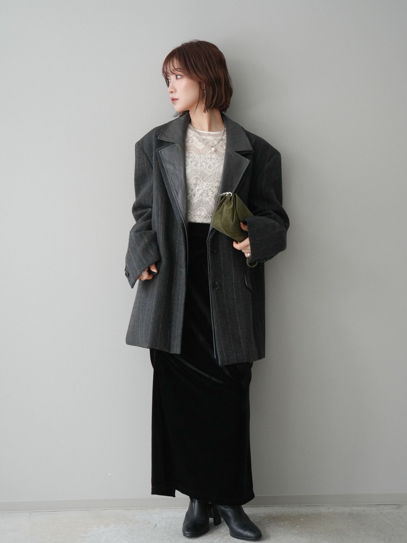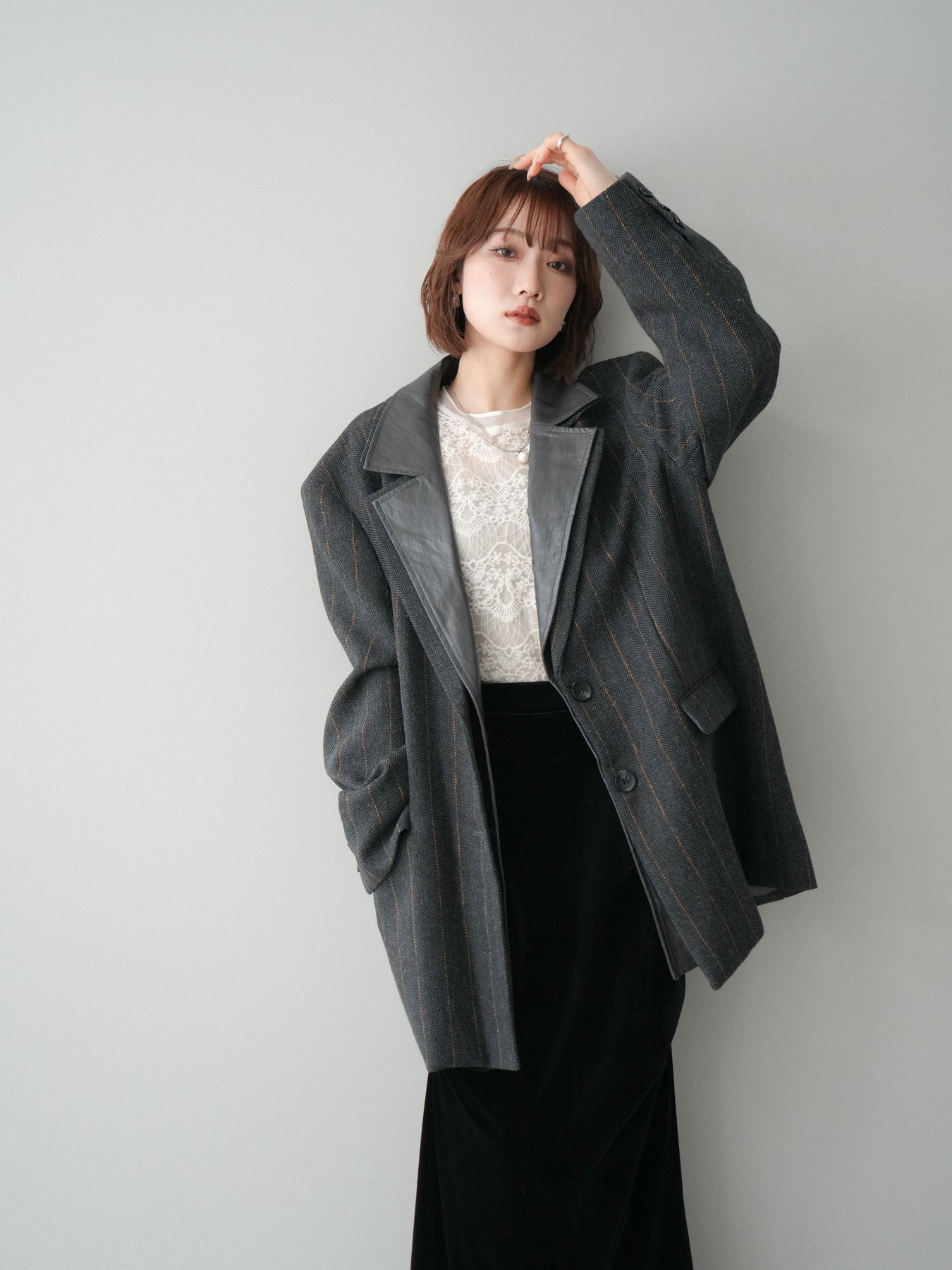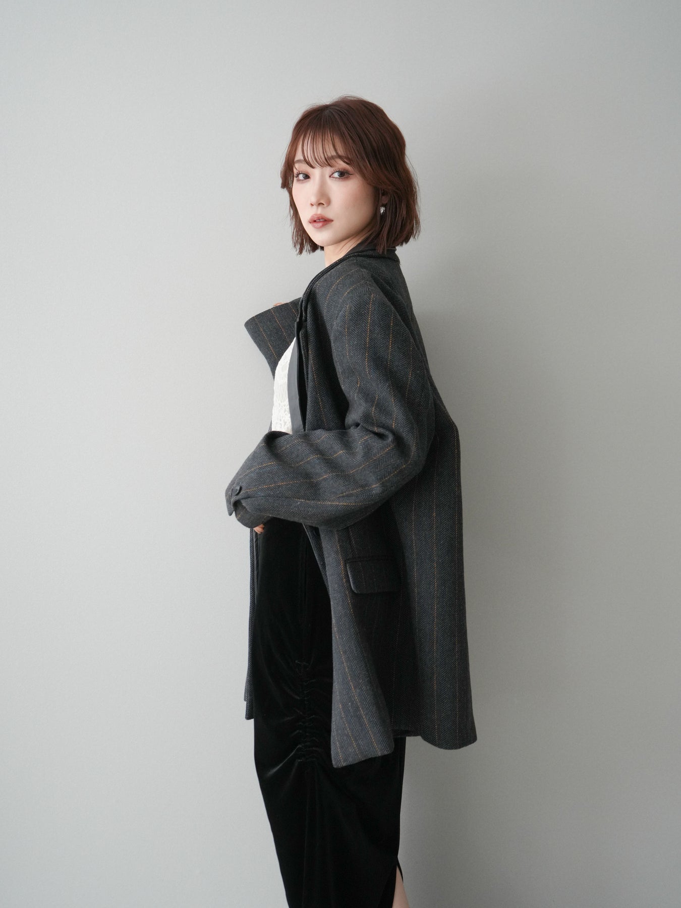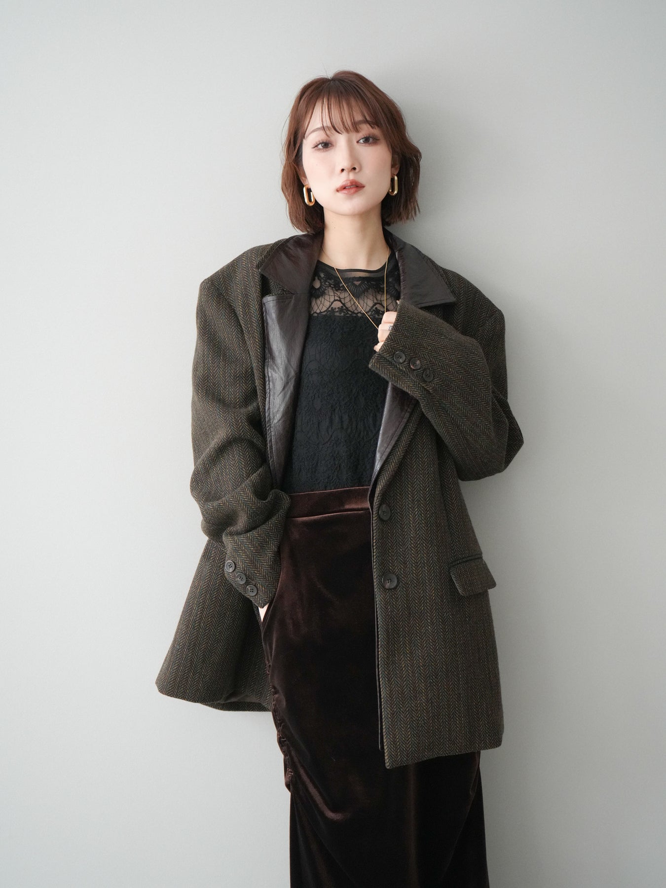 [SET]レイヤードデザインツイードテーラードジャケット+チュールレーストップス+ギャザーベロアスカート(3set)