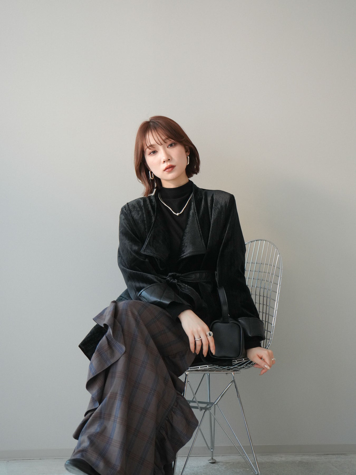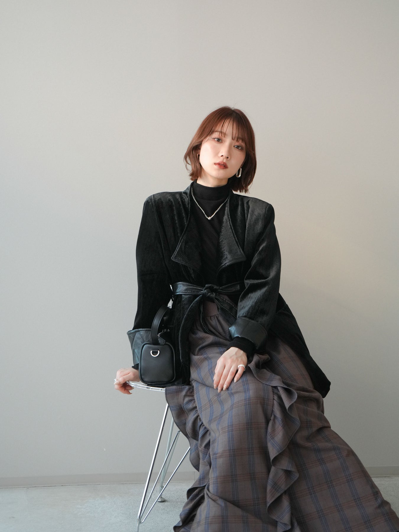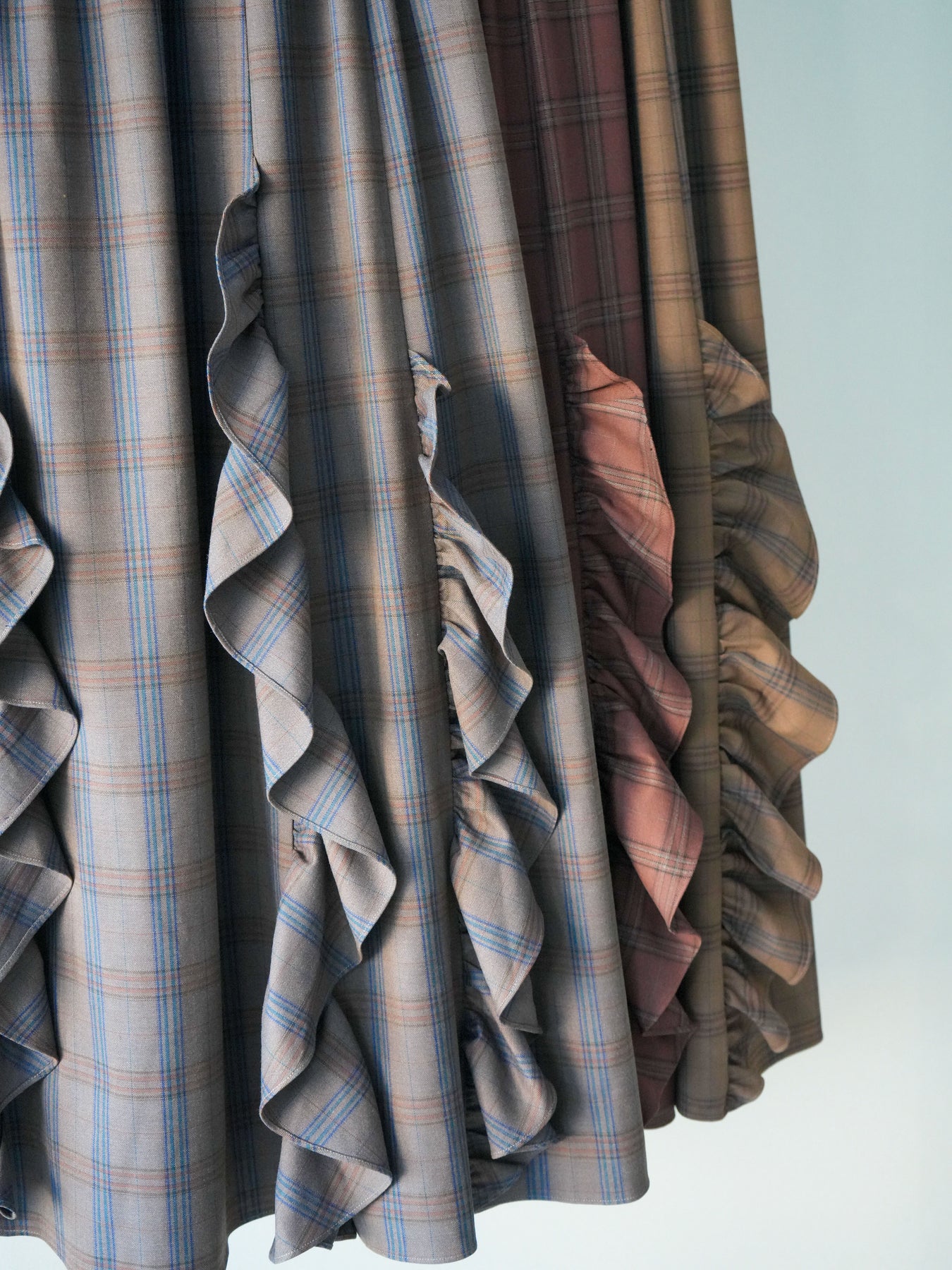 チェック柄に縦ラインのフリルをあしらったハイウエスト仕様のマキシスカート。程よいボリューム感と落ち感のあるシルエットが、動くたびに表情を生み出します。トップスをインしたスタイリングとも相性が良く、コーディネートの主役として活躍する一着です。
