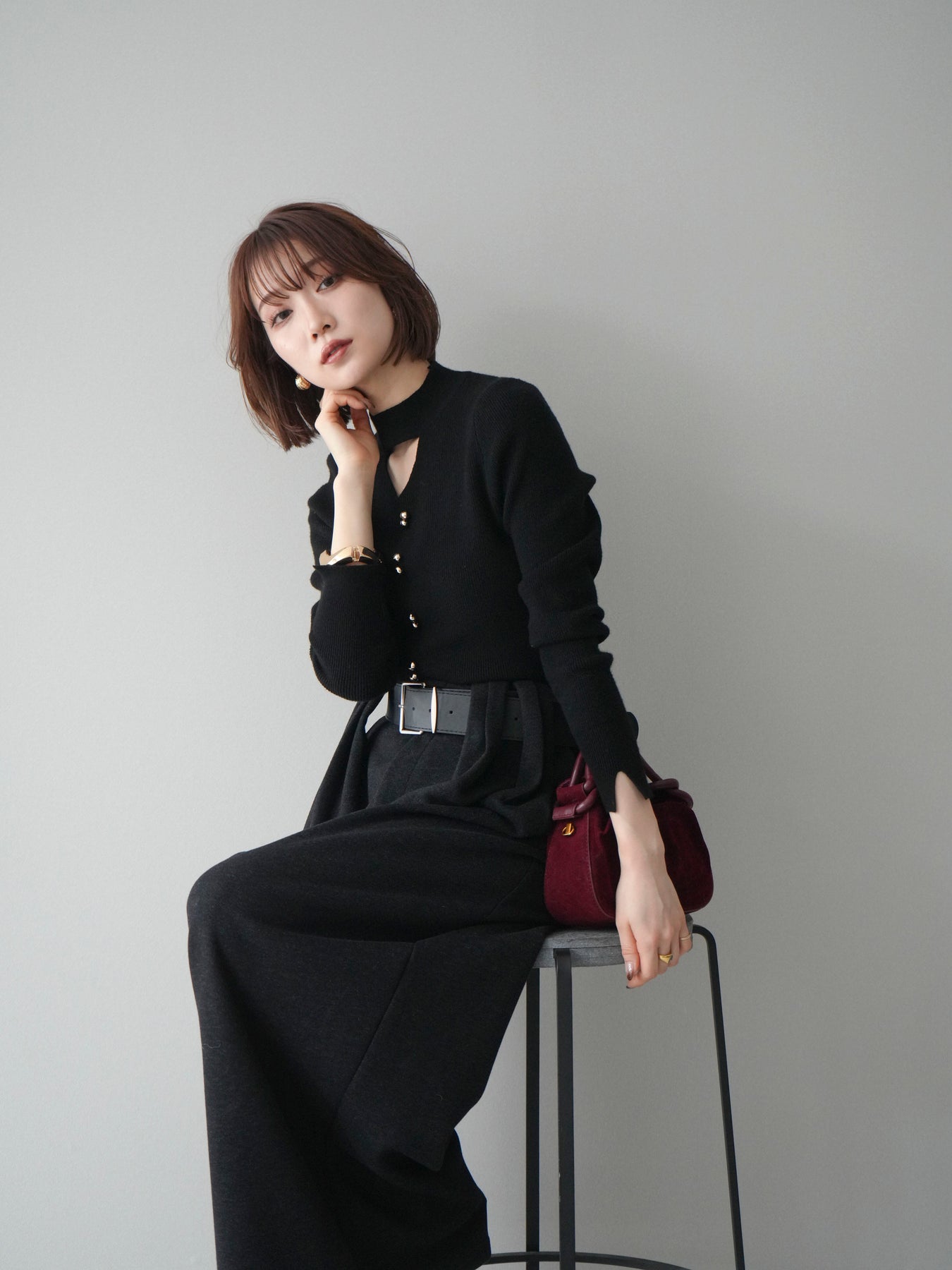 [予約]チョーカーデザインボタンリブニットトップス/black