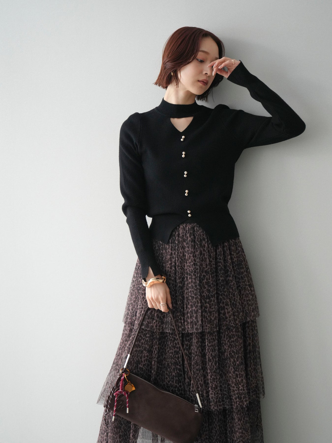 チョーカーデザインが目を引く、印象的なリブニットトップス。 首元にさりげなく沿うチョーカー風のディテールと、フロントに並んだボタンが縦のラインを強調し、全体をすっきりと見せてくれます。デザイン性がありながらも主張しすぎず、スタイリングに自然なアクセントを添える一着です。 身頃はリブ編みで、程よく身体に沿いながらも窮屈さを感じにくい着用感。首元の開きが控えめながら抜け感を演出し、一枚で着ても奥行きのある表情に仕上がります。ボトムスを選ばず合わせやすく、スカートと合わせればやわらかな印象に、パンツと合わせれば落ち着いた雰囲気にも対応します。 ニット素材は肌なじみが良く、長時間の着用にも配慮された仕上がり。予約商品として、デザイン性と実用性を兼ね備えた一着となっており、シーズンを通して着回しの効くアイテムです。 ※ボトムス、キャミソール(インナー)以外の商品は一律でインナーは付属していません。