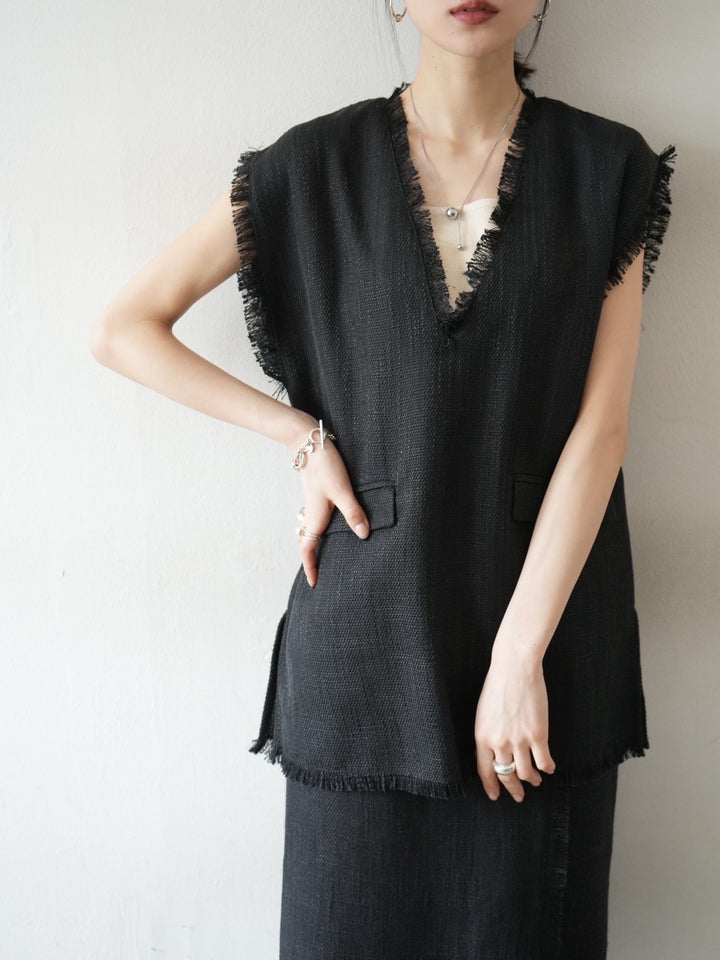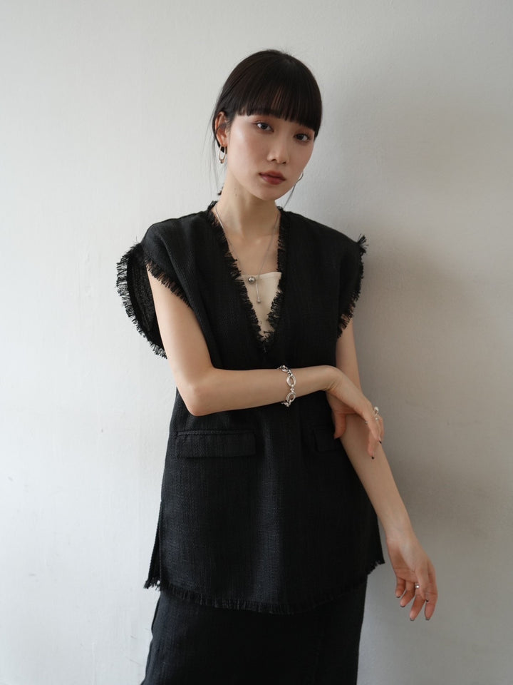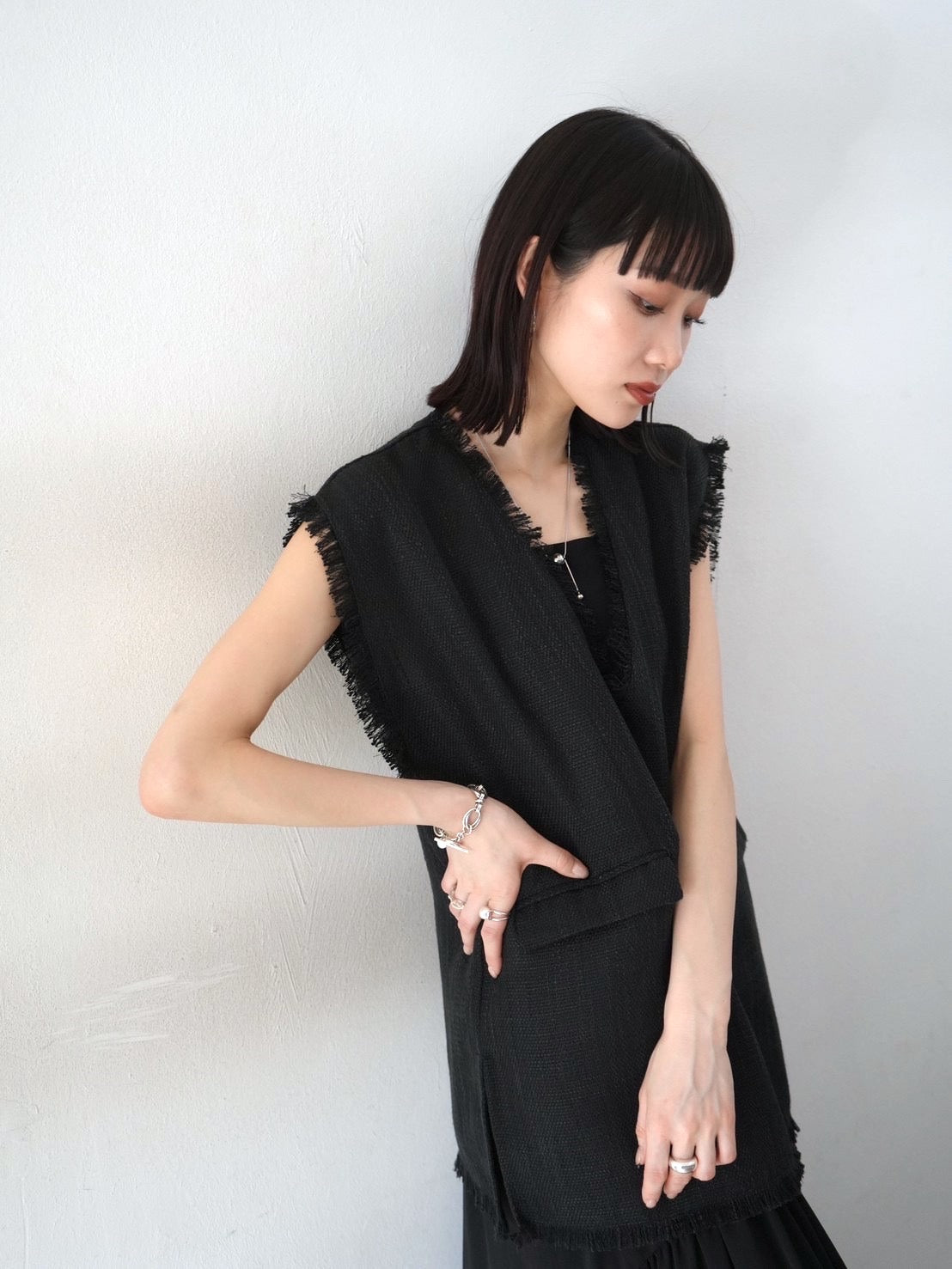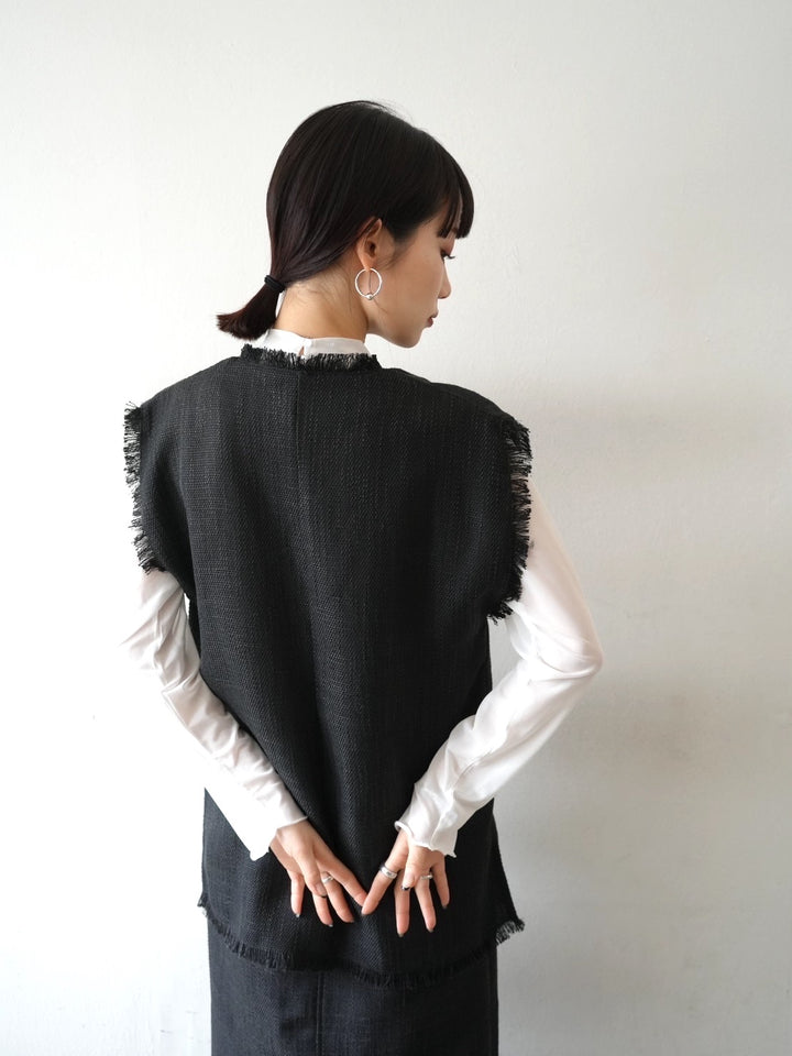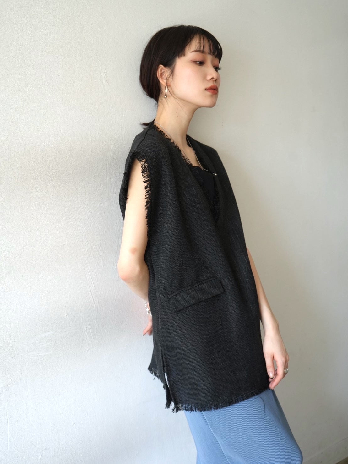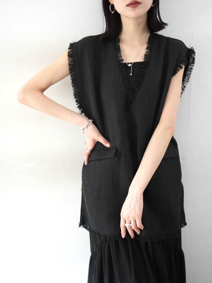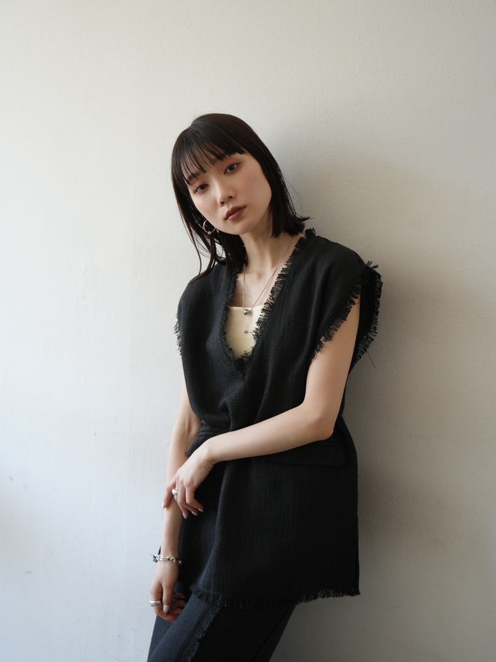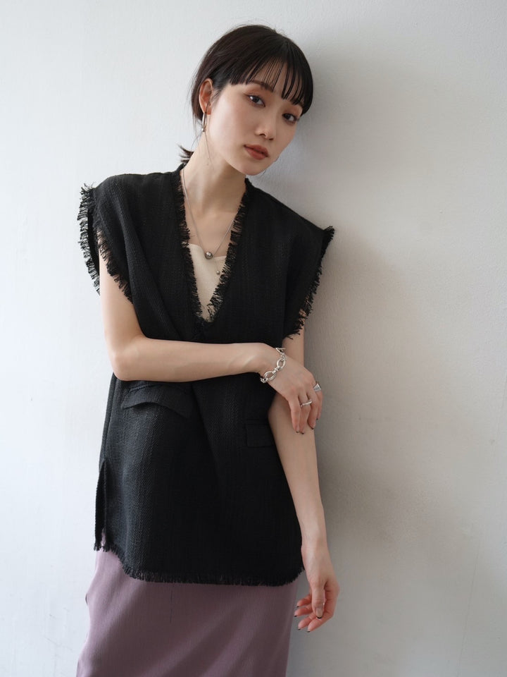 フリンジが施されたツイードベストはサラッとした素材感で、シャープに開いたVネックとの掛け合わせで涼しげな印象を与えます。長めの着丈ながらもポケットが目線を上げてくれるのでバランスが良く、サイドスリット入りのためウエスト周りに程良いゆとりがあります。夏はキャミソールやタンクトップを合わせてプルオーバーとして着用するのがおすすめ。同素材のスカートとセットアップで着用できます。