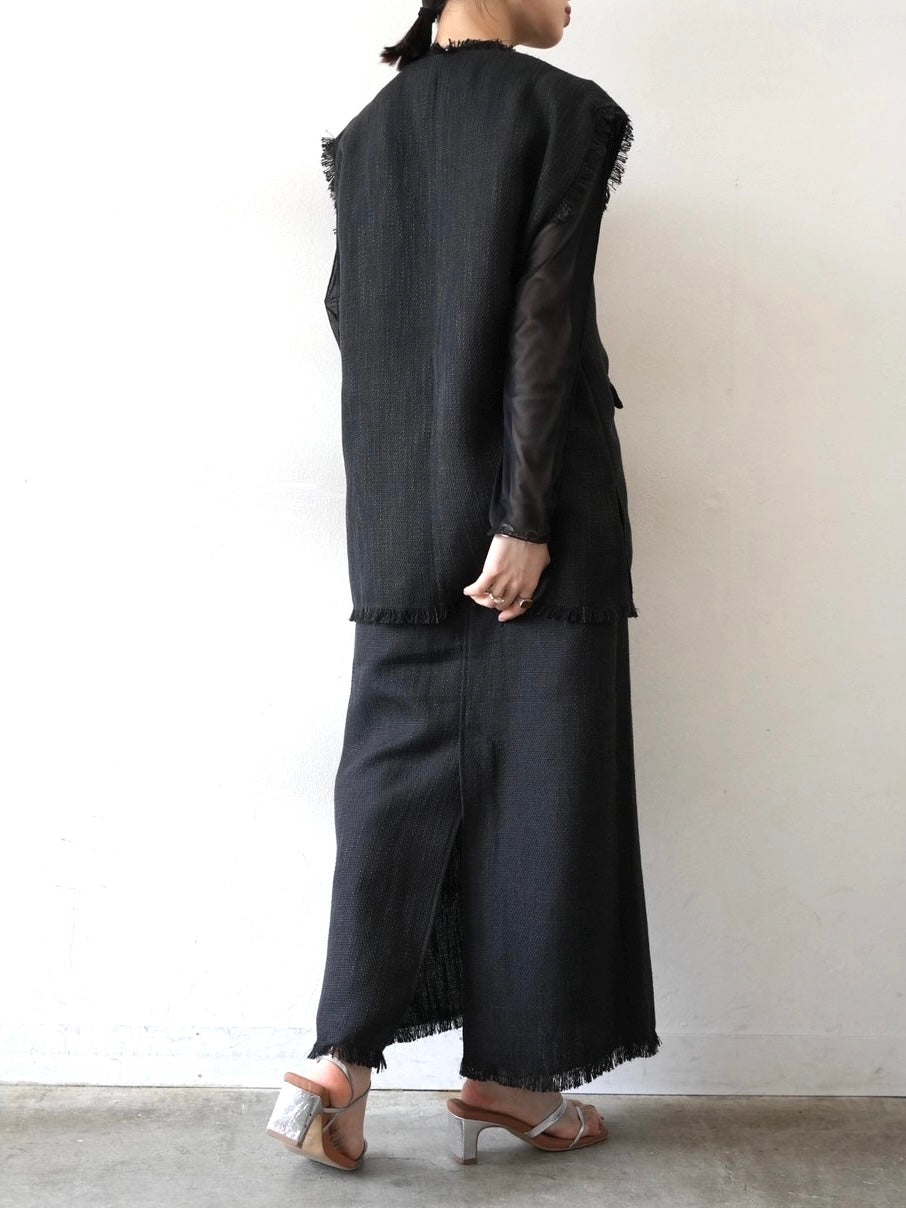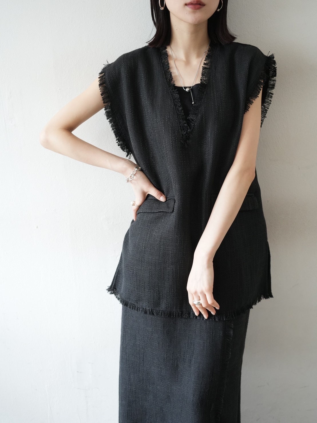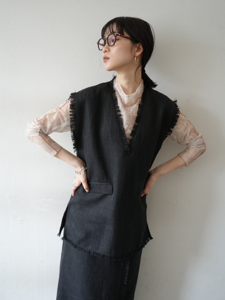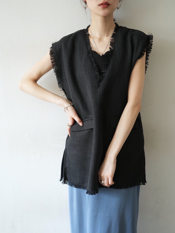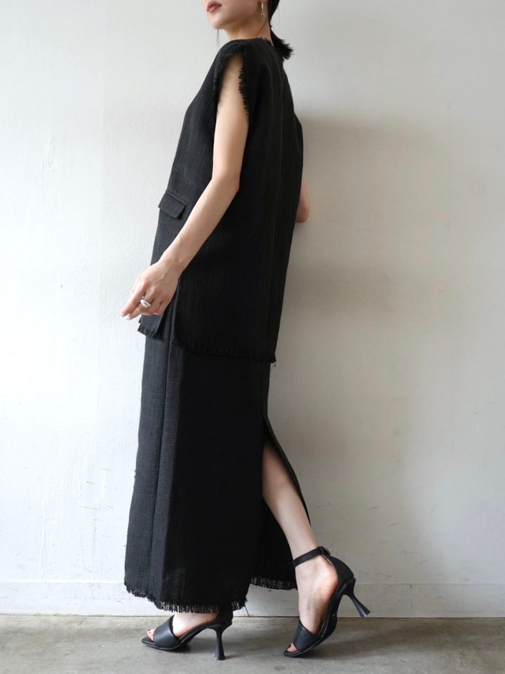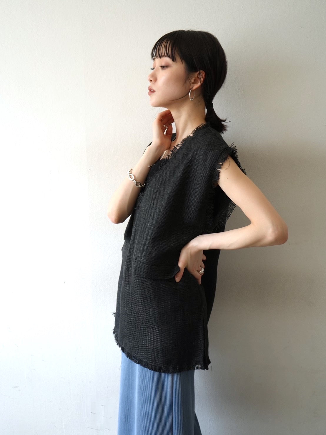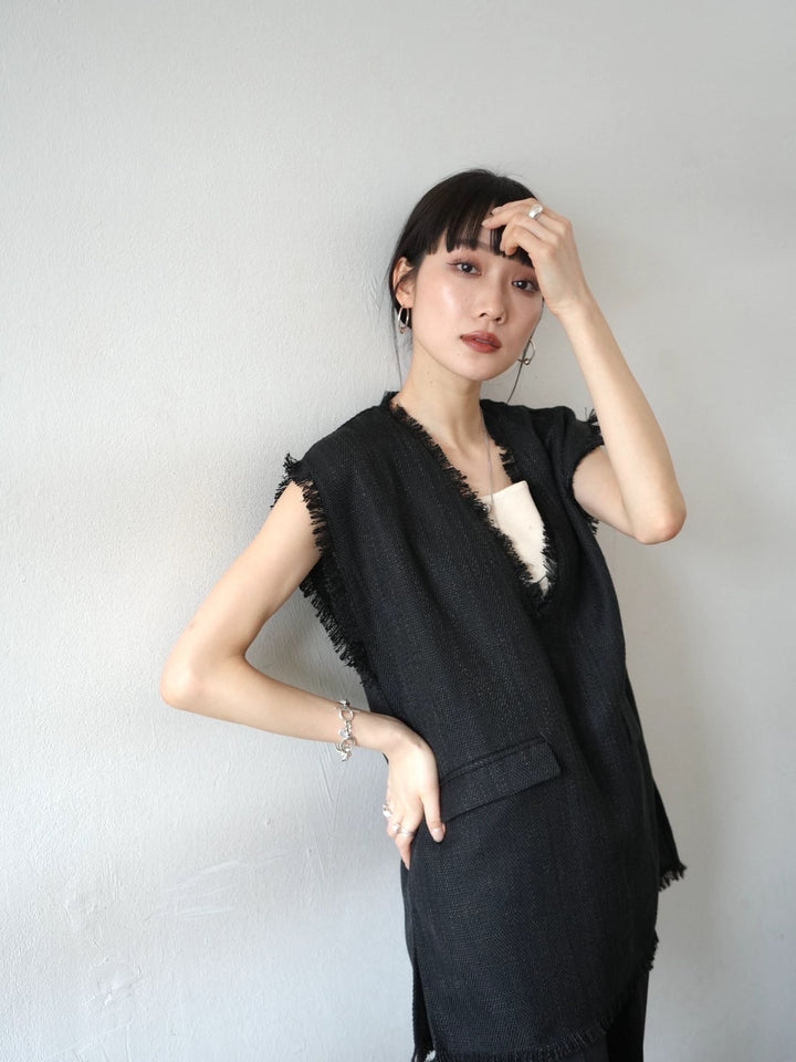 フリンジが施されたツイードベストはサラッとした素材感で、シャープに開いたVネックとの掛け合わせで涼しげな印象を与えます。長めの着丈ながらもポケットが目線を上げてくれるのでバランスが良く、サイドスリット入りのためウエスト周りに程良いゆとりがあります。夏はキャミソールやタンクトップを合わせてプルオーバーとして着用するのがおすすめ。同素材のスカートとセットアップで着用できます。