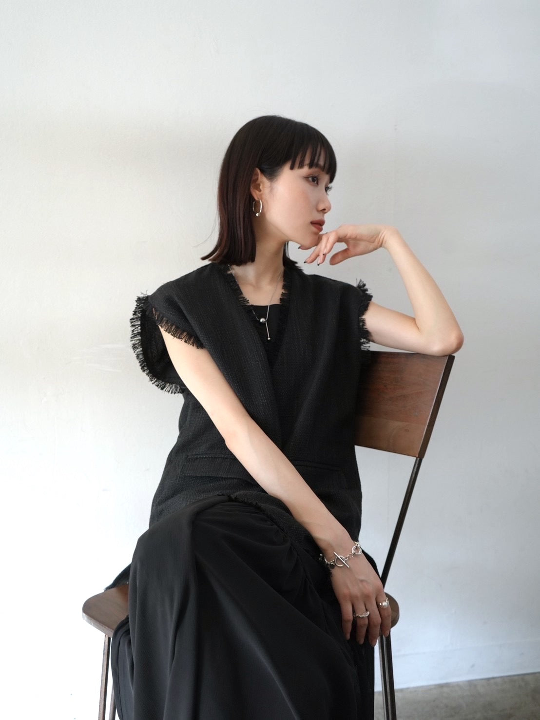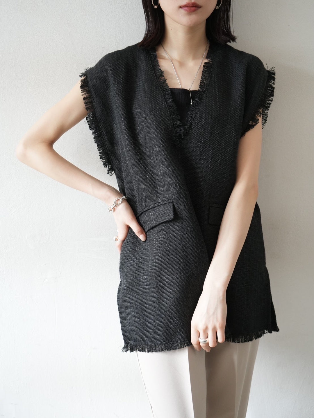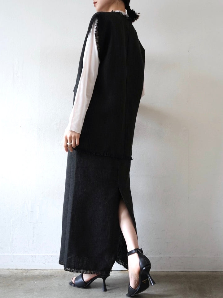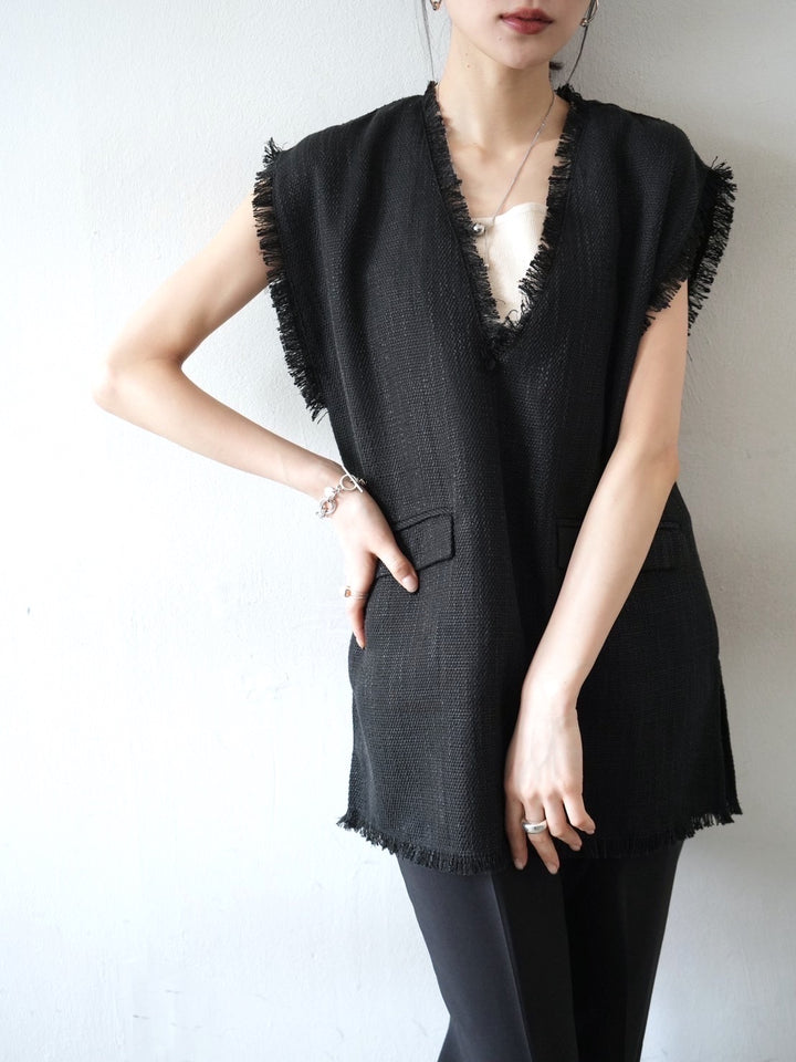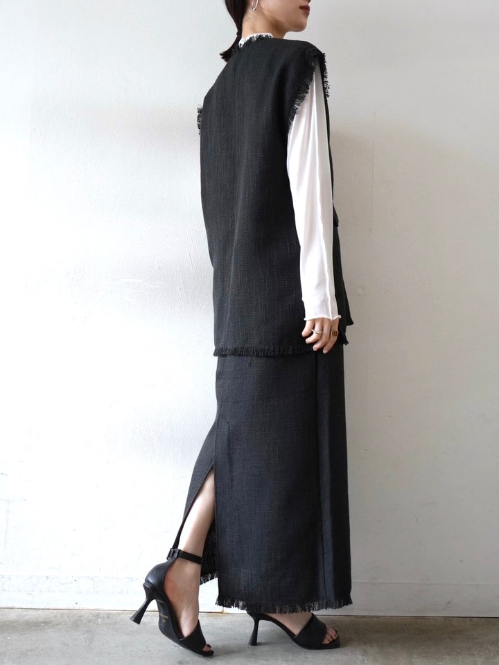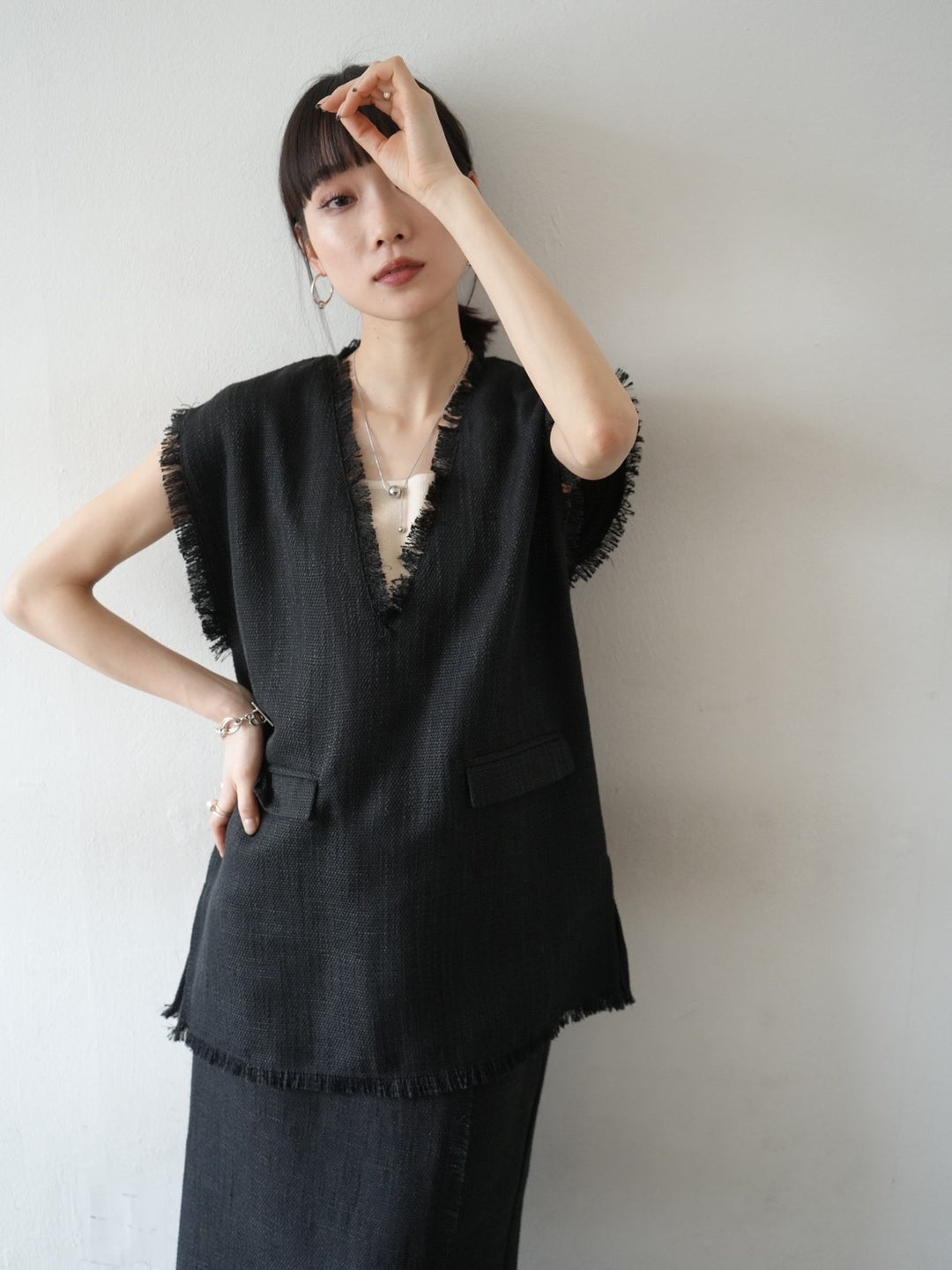 フリンジが施されたツイードベストはサラッとした素材感で、シャープに開いたVネックとの掛け合わせで涼しげな印象を与えます。長めの着丈ながらもポケットが目線を上げてくれるのでバランスが良く、サイドスリット入りのためウエスト周りに程良いゆとりがあります。夏はキャミソールやタンクトップを合わせてプルオーバーとして着用するのがおすすめ。同素材のスカートとセットアップで着用できます。