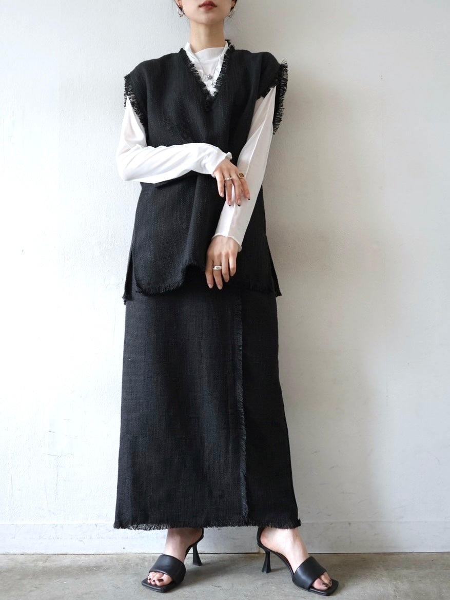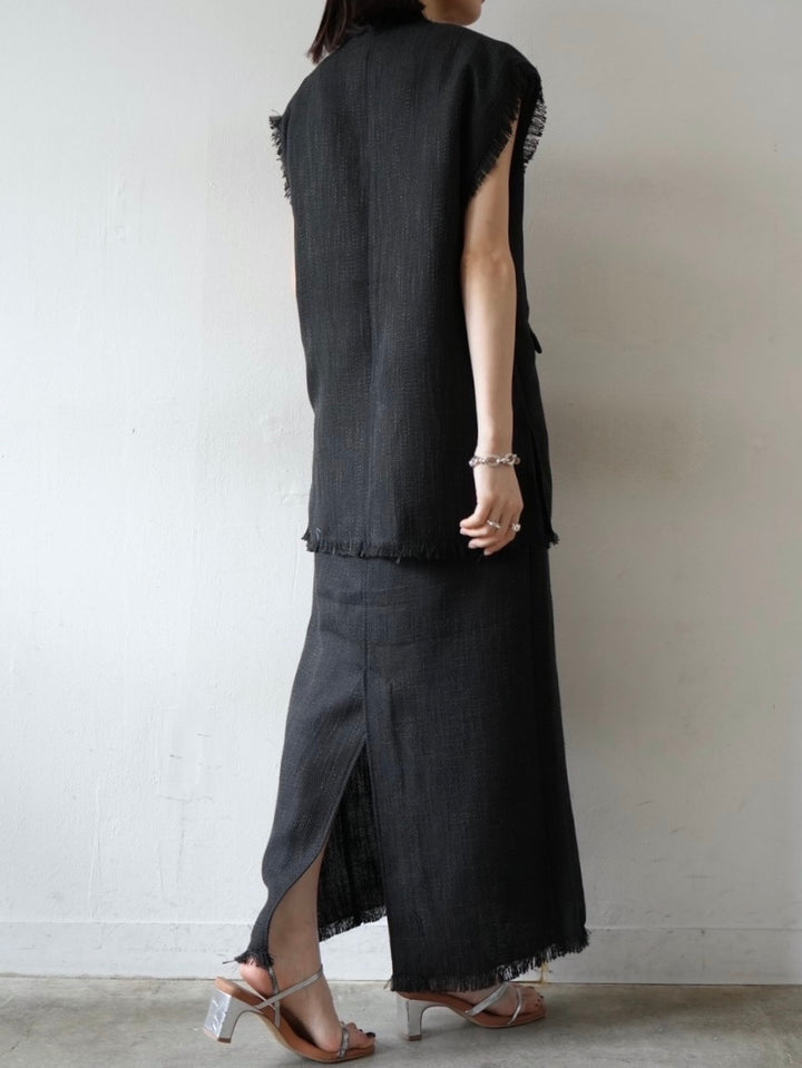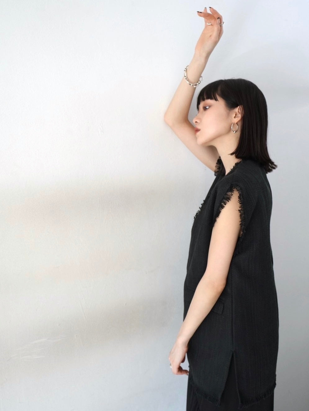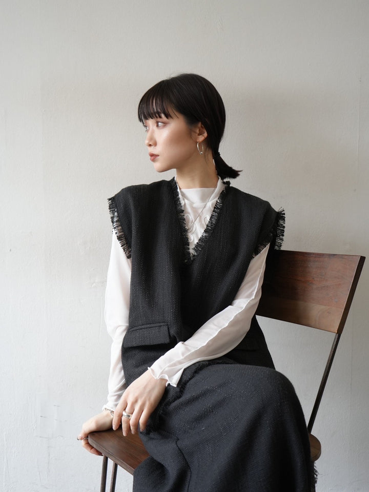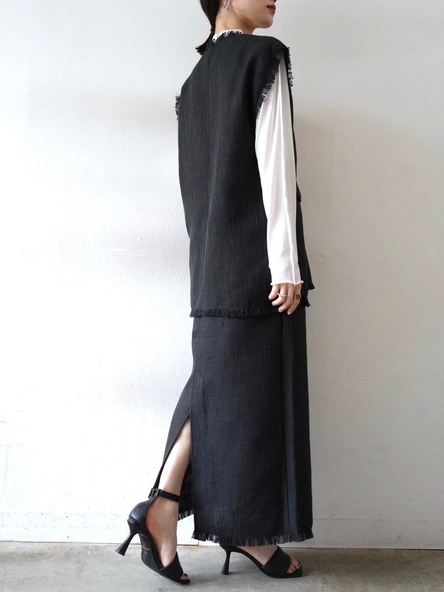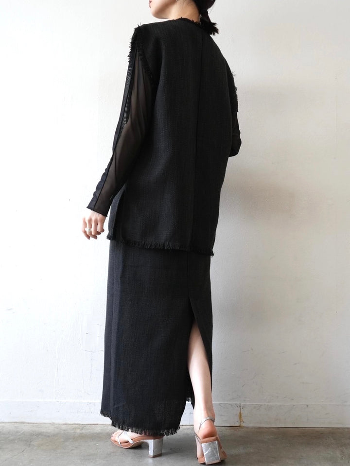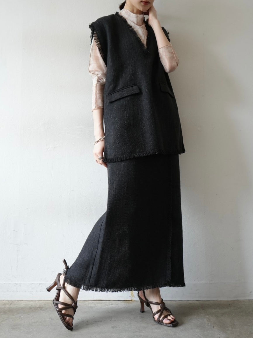 フリンジが施されたツイードベストはサラッとした素材感で、シャープに開いたVネックとの掛け合わせで涼しげな印象を与えます。長めの着丈ながらもポケットが目線を上げてくれるのでバランスが良く、サイドスリット入りのためウエスト周りに程良いゆとりがあります。夏はキャミソールやタンクトップを合わせてプルオーバーとして着用するのがおすすめ。同素材のスカートとセットアップで着用できます。