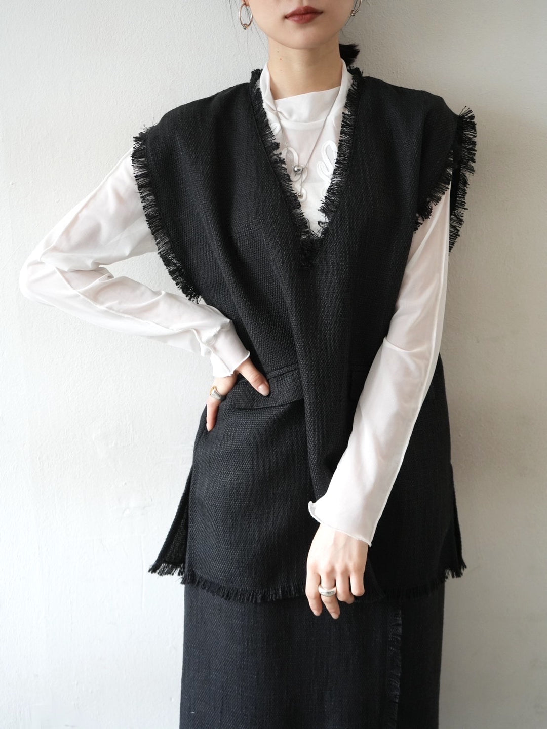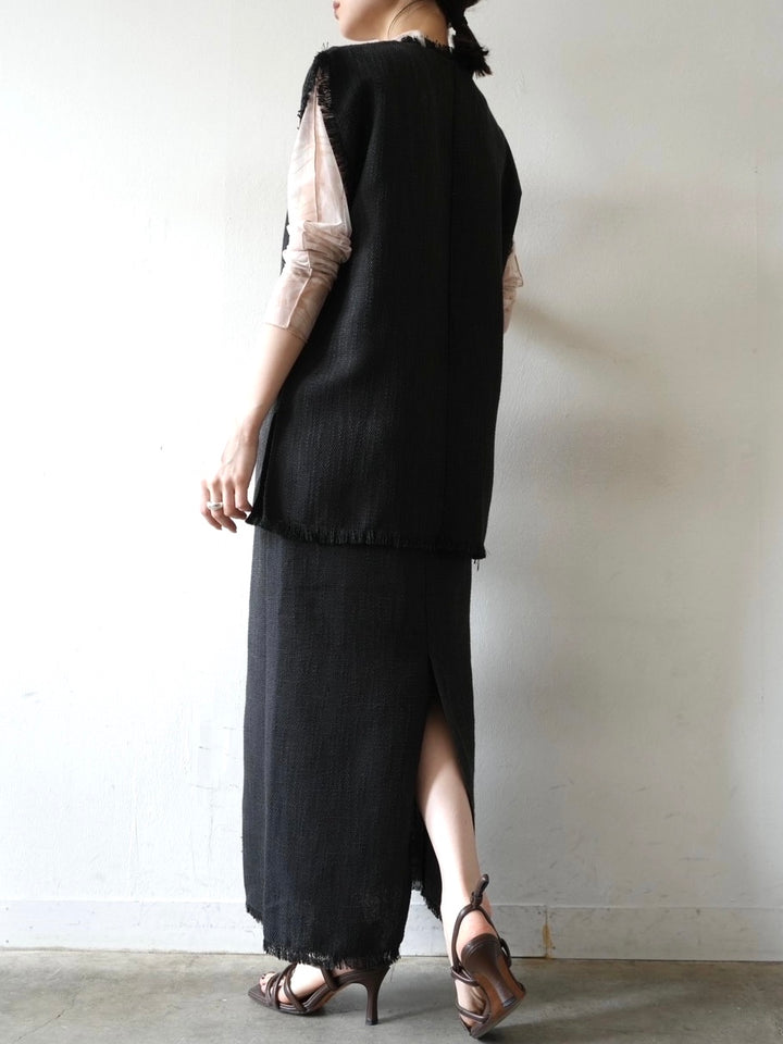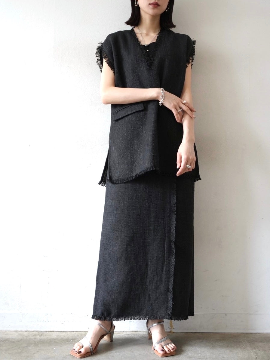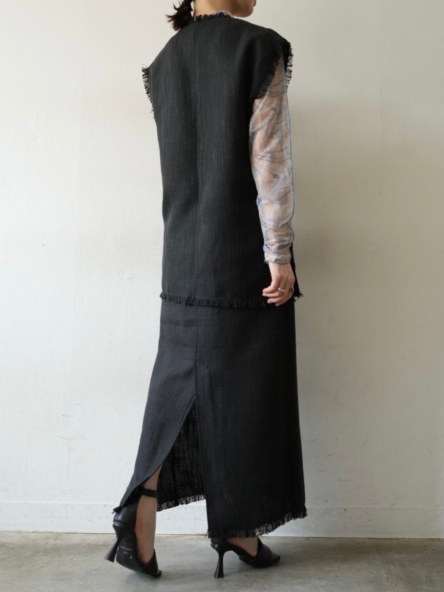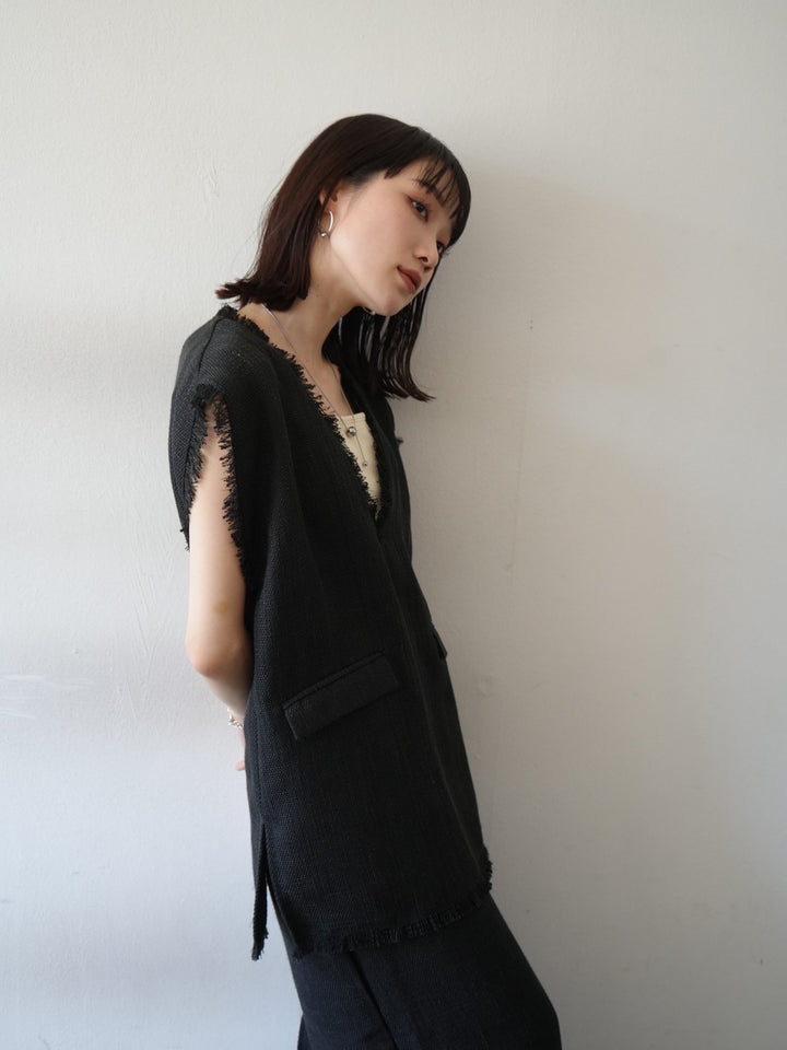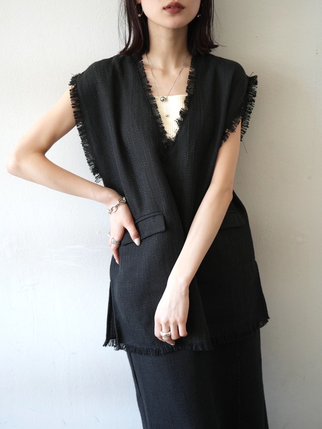フリンジが施されたツイードベストはサラッとした素材感で、シャープに開いたVネックとの掛け合わせで涼しげな印象を与えます。長めの着丈ながらもポケットが目線を上げてくれるのでバランスが良く、サイドスリット入りのためウエスト周りに程良いゆとりがあります。夏はキャミソールやタンクトップを合わせてプルオーバーとして着用するのがおすすめ。同素材のスカートとセットアップで着用できます。