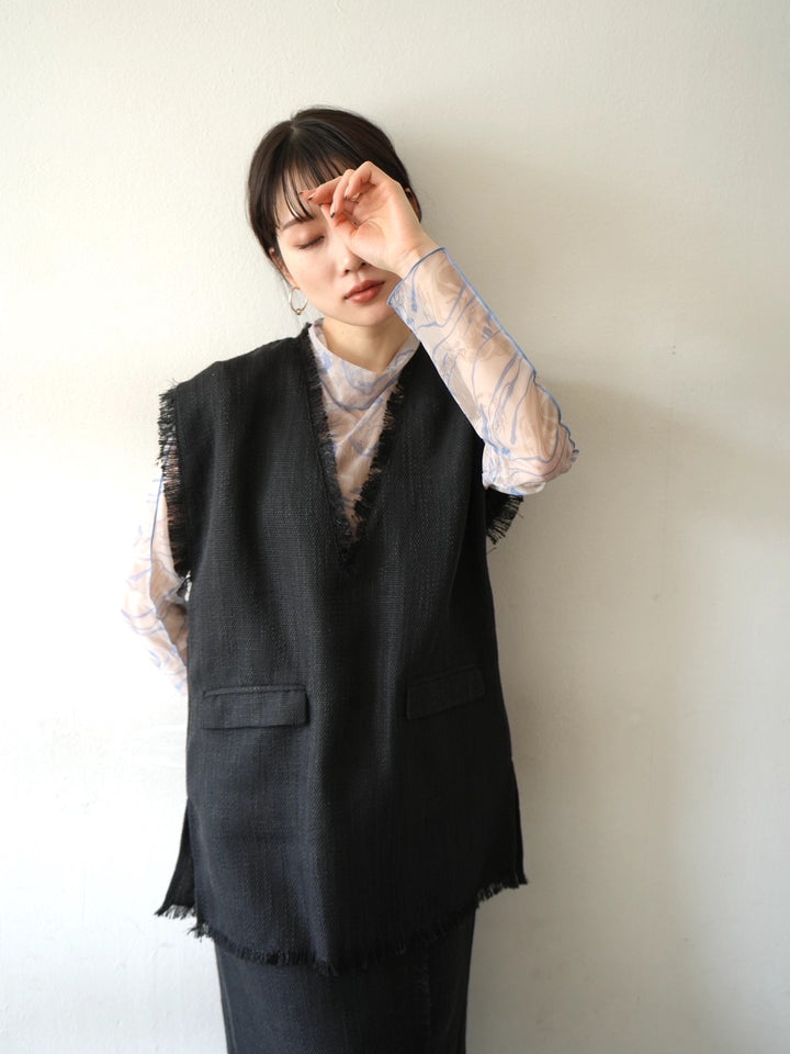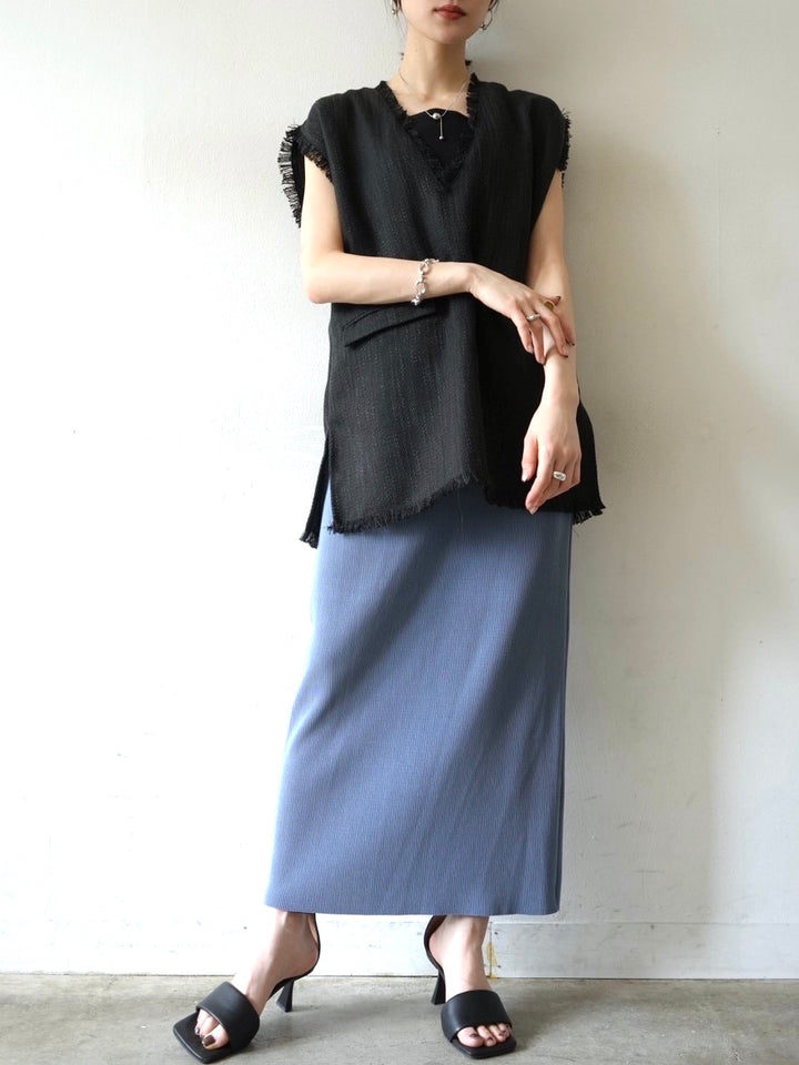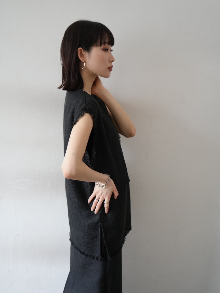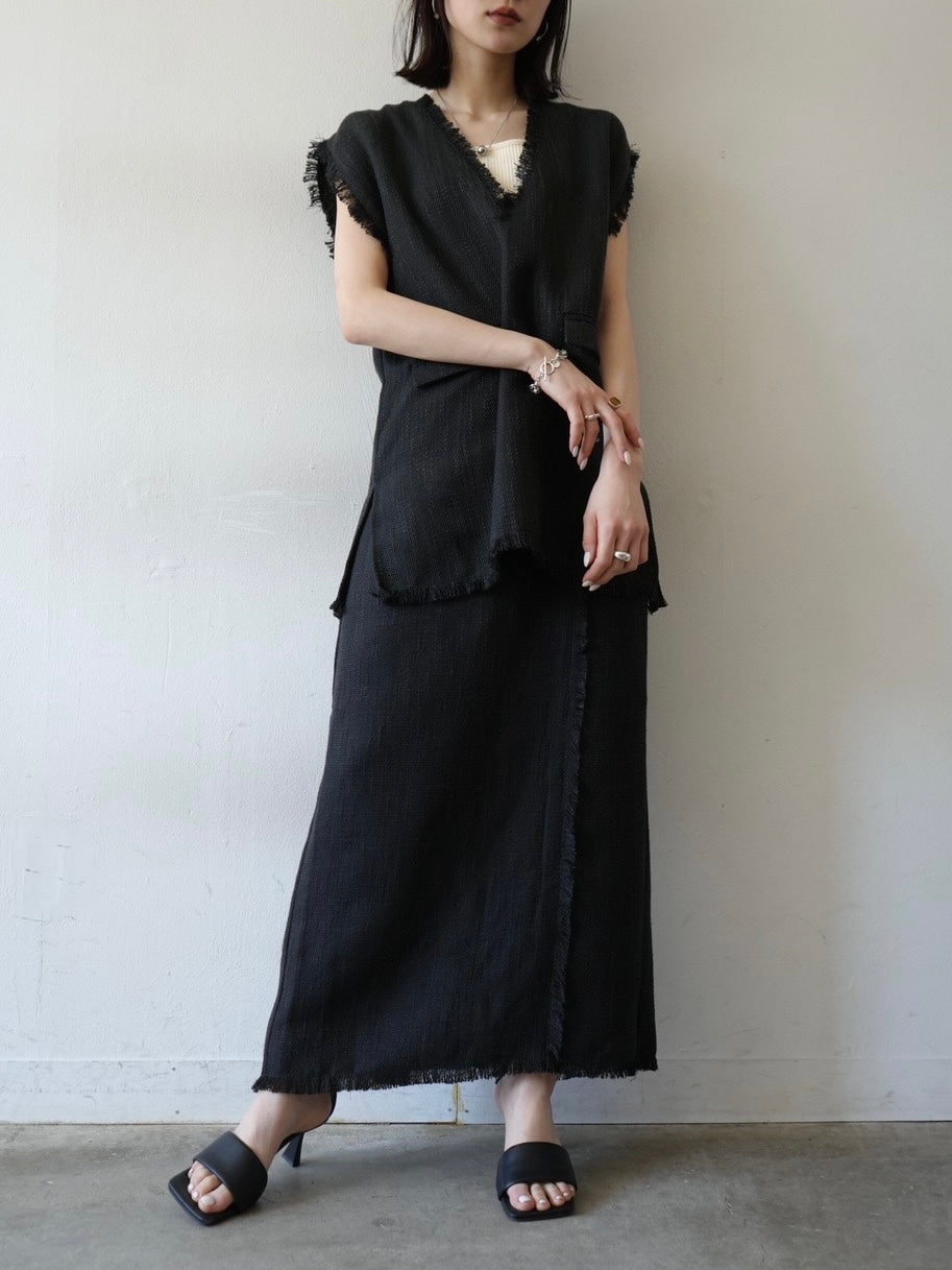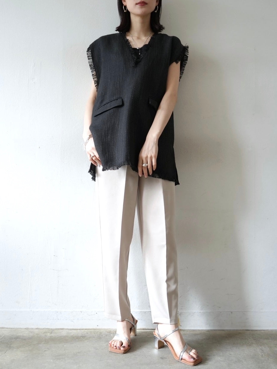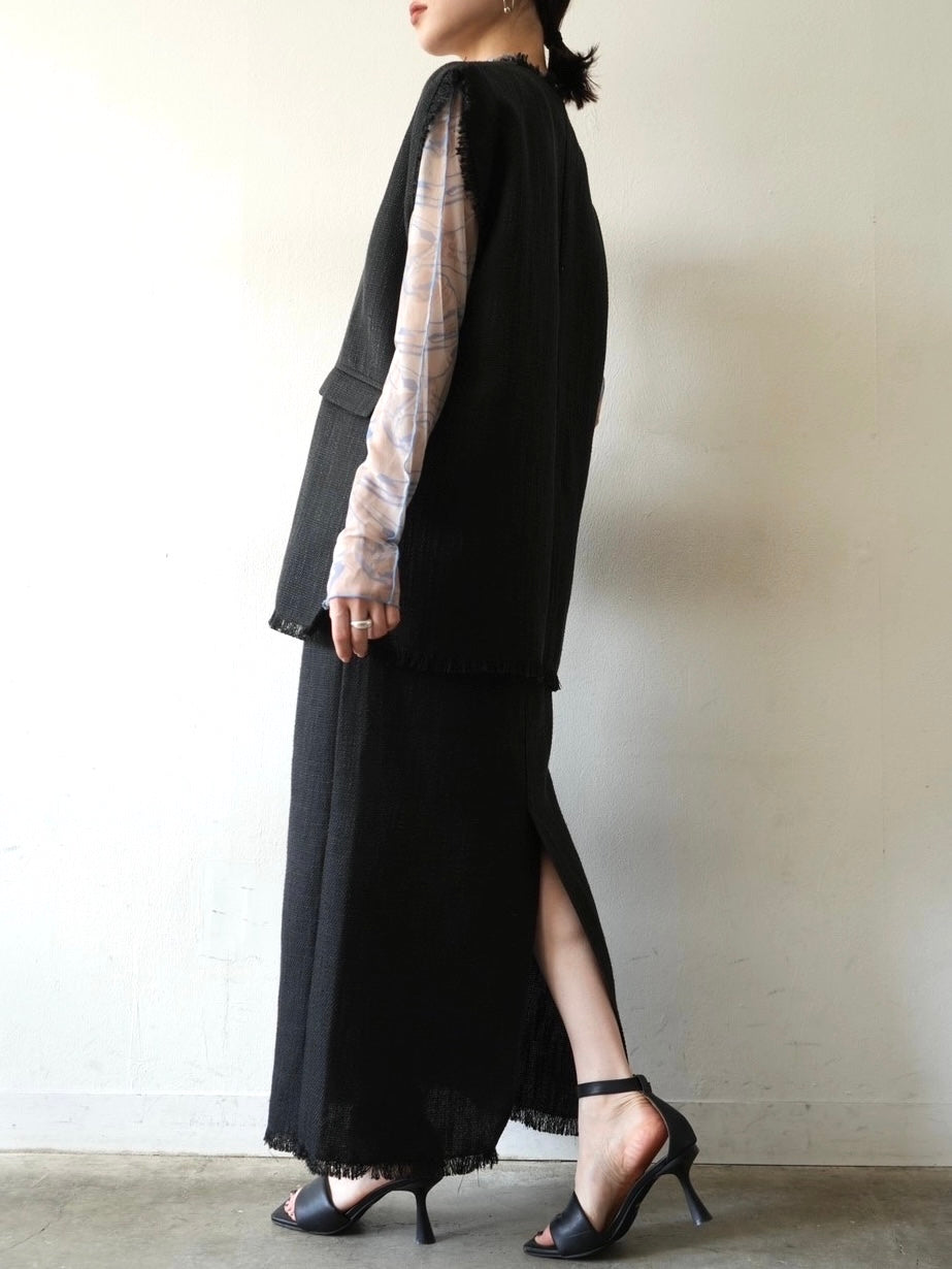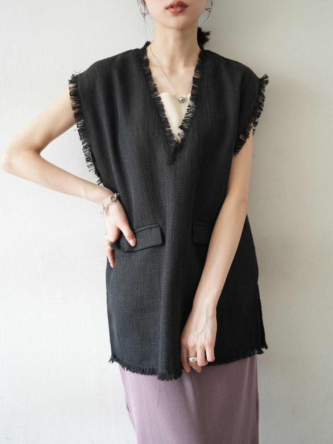 フリンジが施されたツイードベストはサラッとした素材感で、シャープに開いたVネックとの掛け合わせで涼しげな印象を与えます。長めの着丈ながらもポケットが目線を上げてくれるのでバランスが良く、サイドスリット入りのためウエスト周りに程良いゆとりがあります。夏はキャミソールやタンクトップを合わせてプルオーバーとして着用するのがおすすめ。同素材のスカートとセットアップで着用できます。