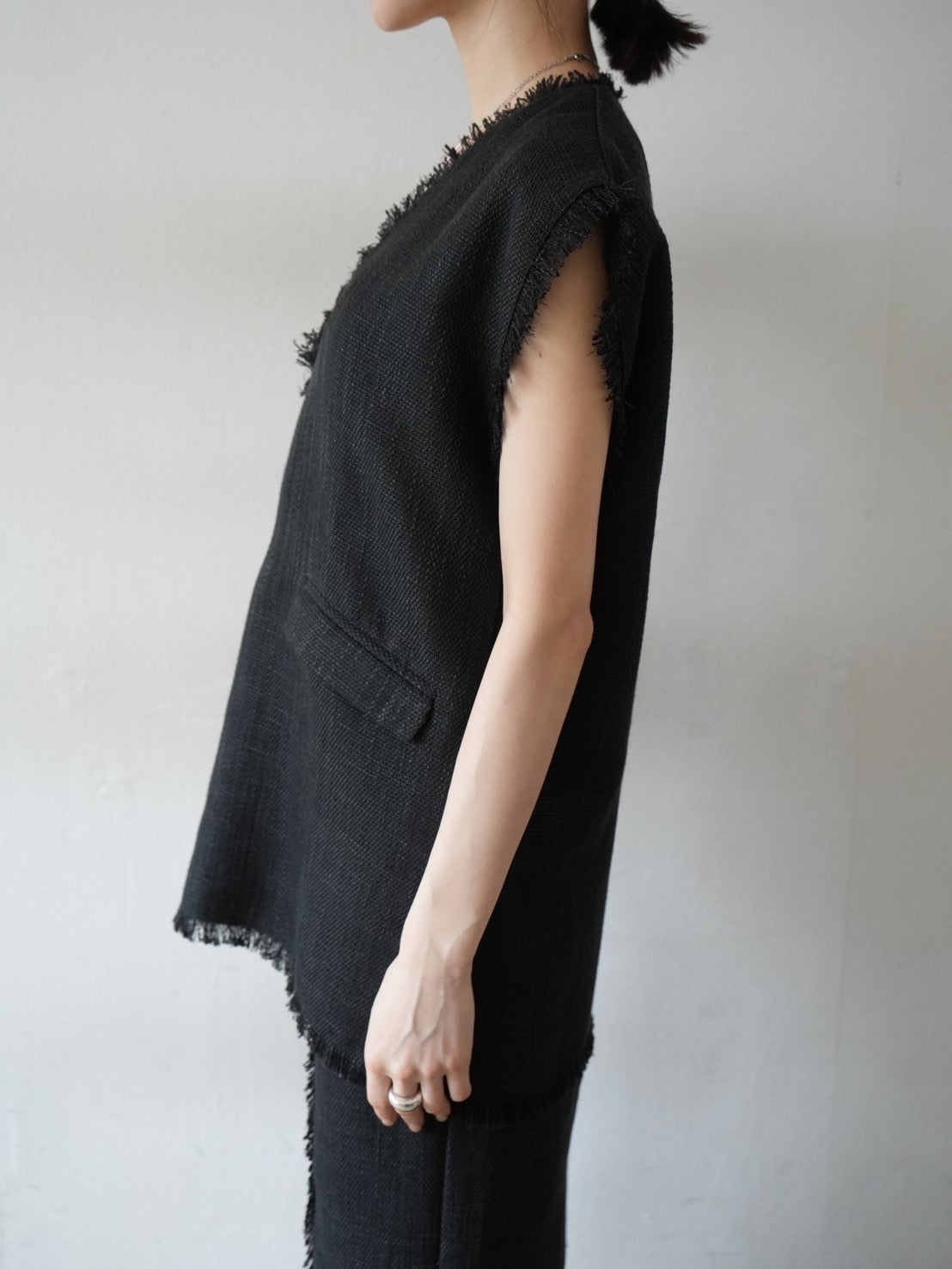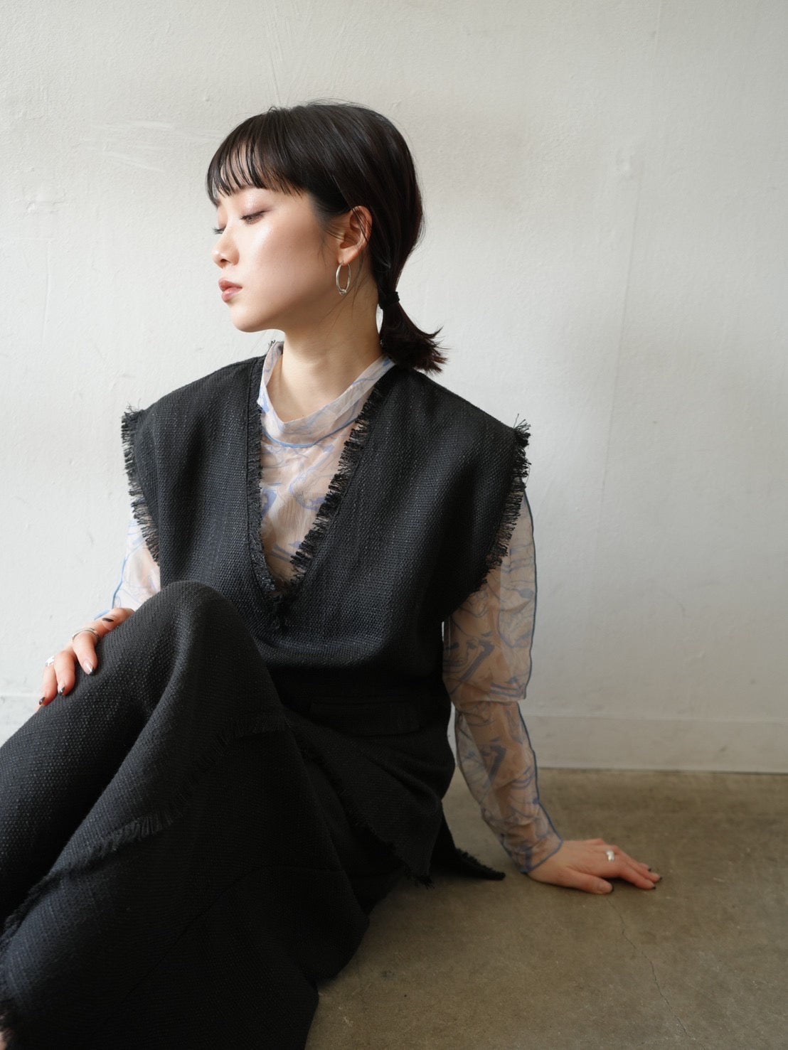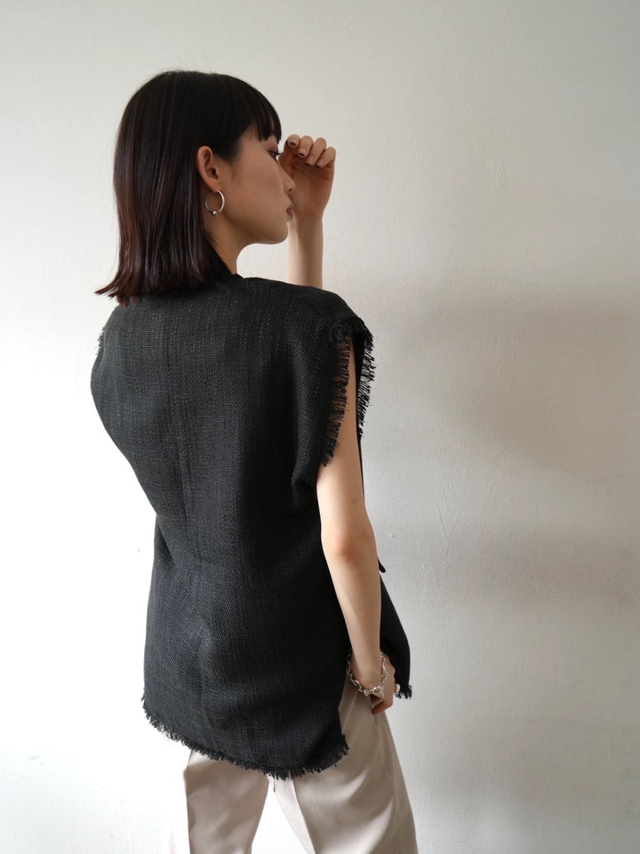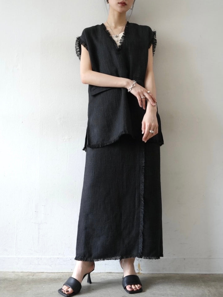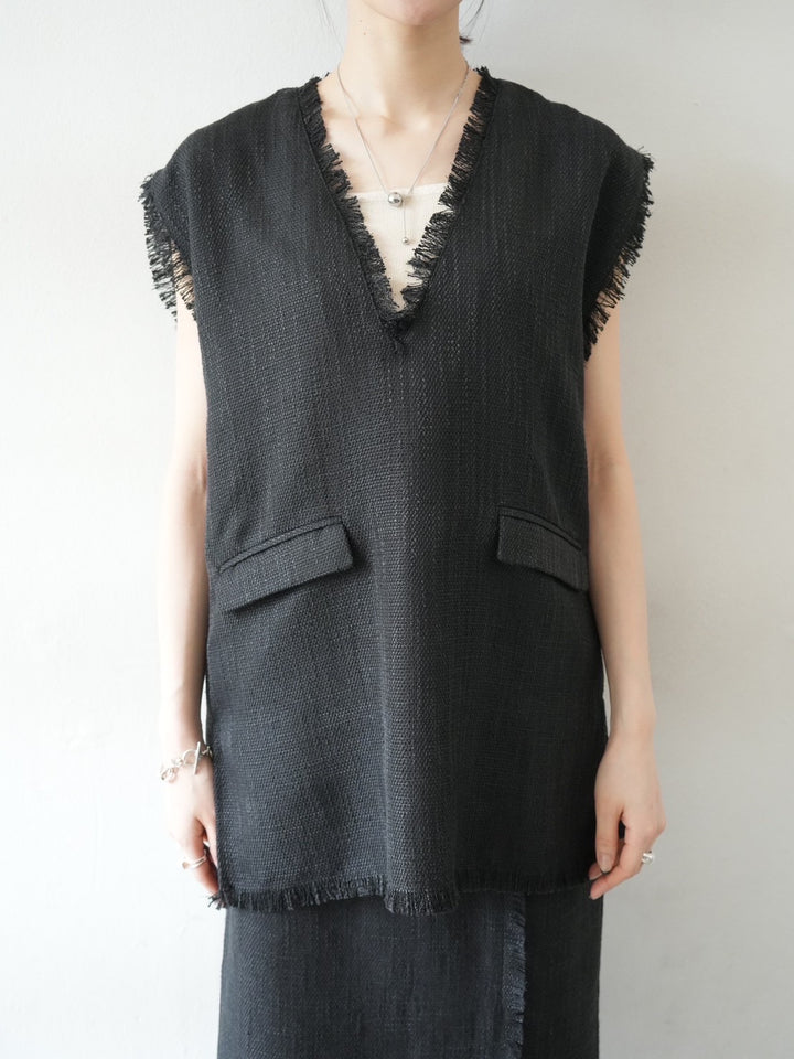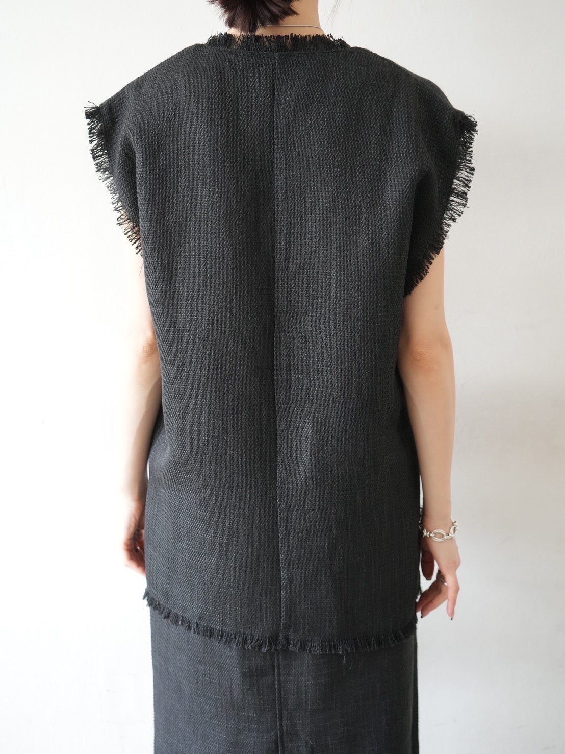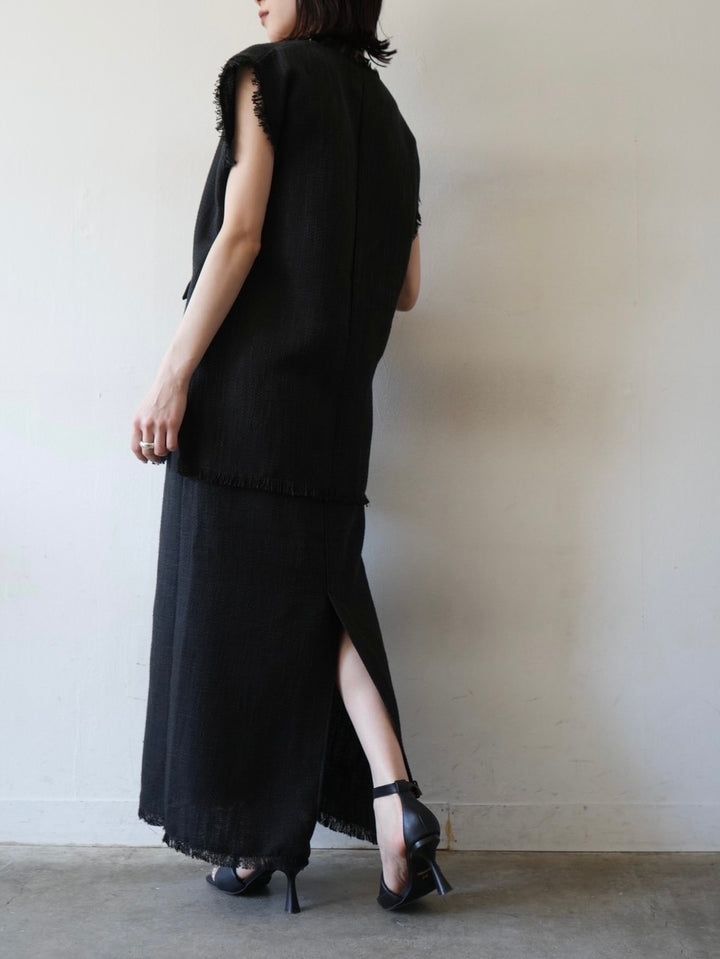 フリンジが施されたツイードベストはサラッとした素材感で、シャープに開いたVネックとの掛け合わせで涼しげな印象を与えます。長めの着丈ながらもポケットが目線を上げてくれるのでバランスが良く、サイドスリット入りのためウエスト周りに程良いゆとりがあります。夏はキャミソールやタンクトップを合わせてプルオーバーとして着用するのがおすすめ。同素材のスカートとセットアップで着用できます。