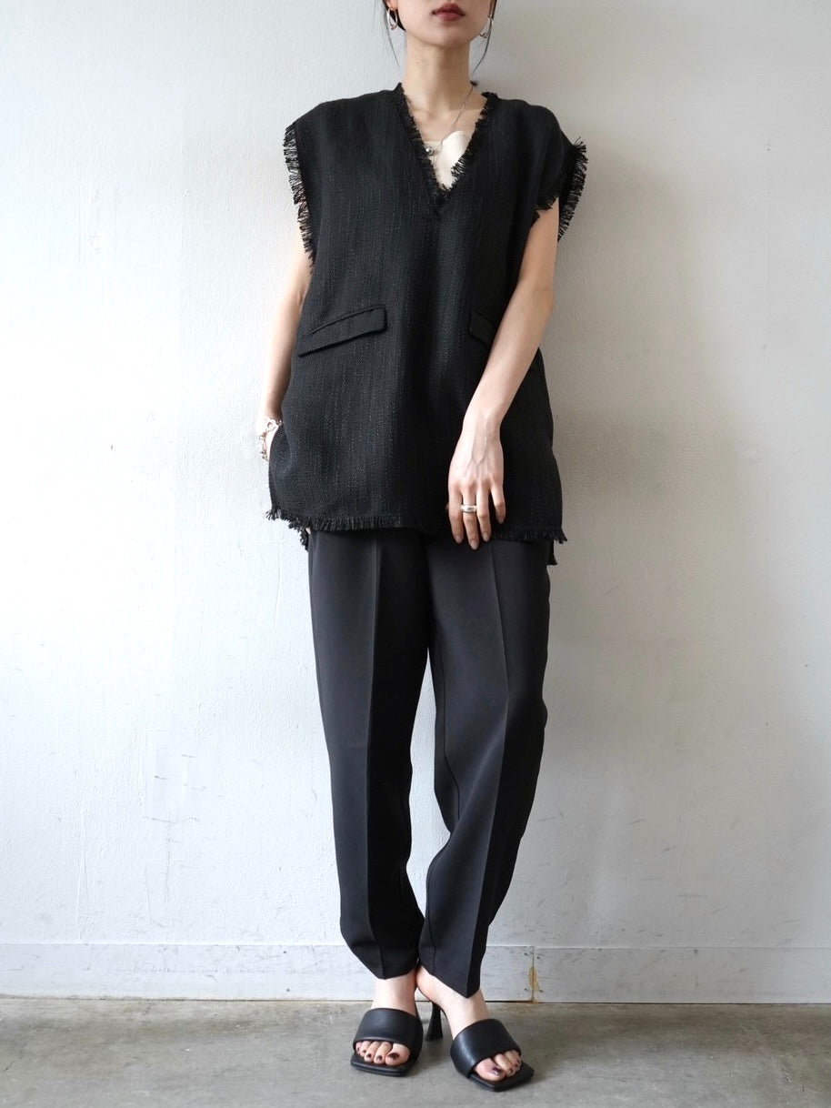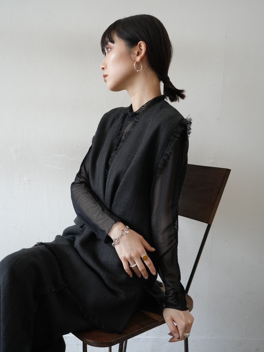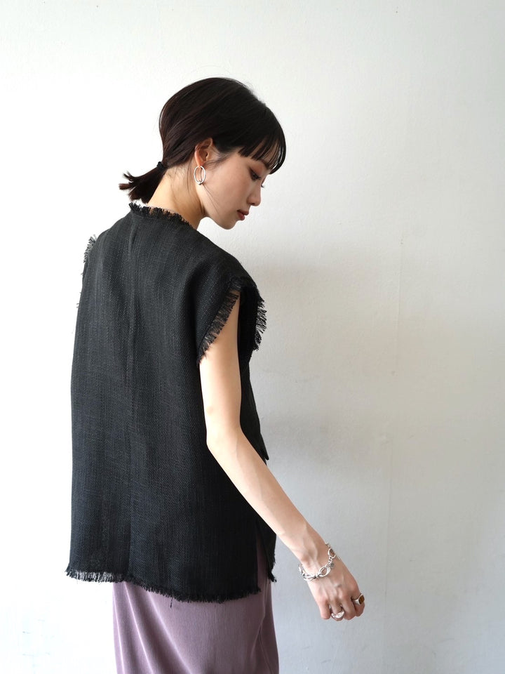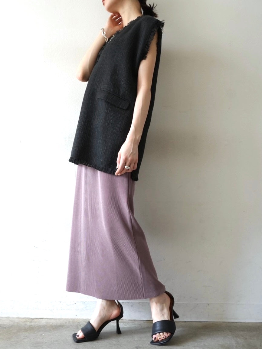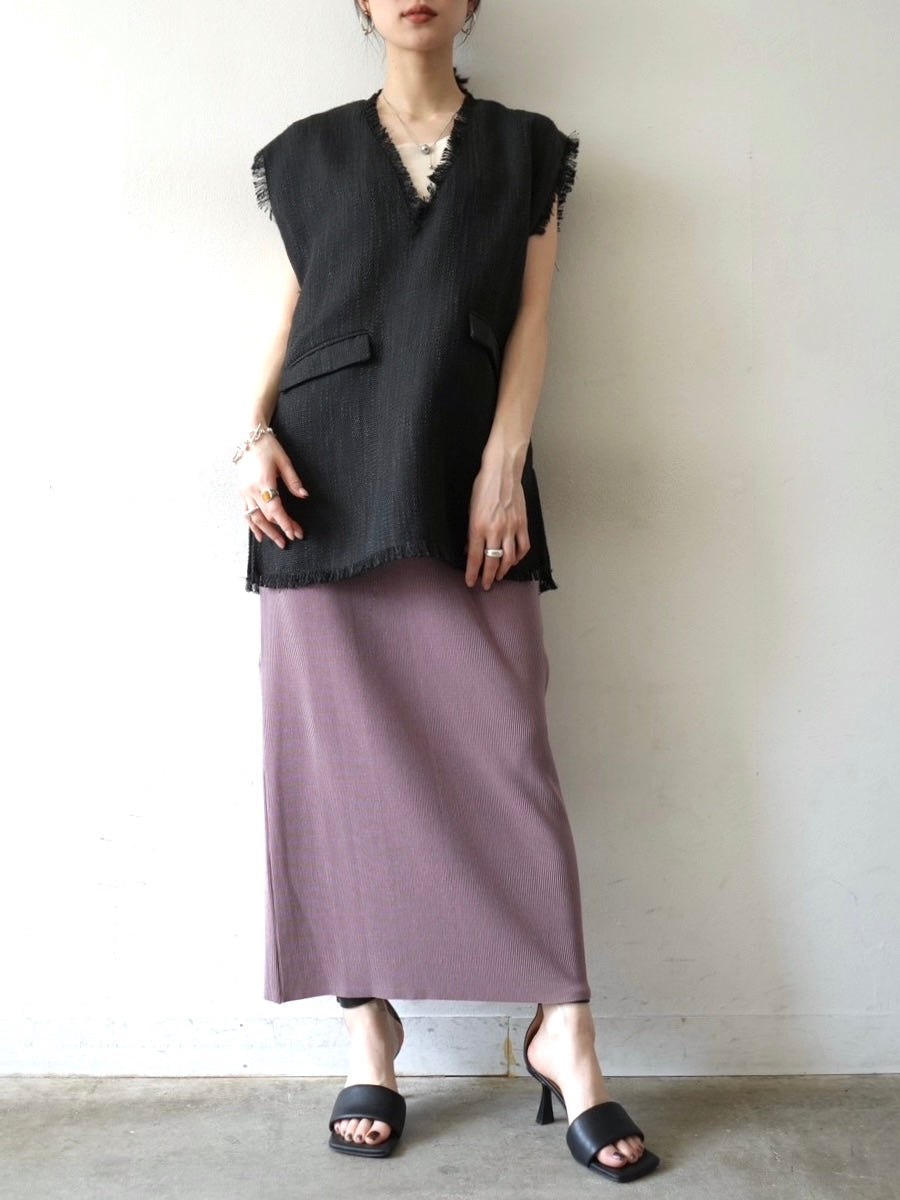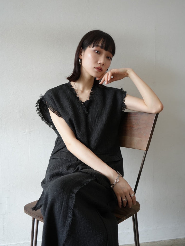 フリンジが施されたツイードベストはサラッとした素材感で、シャープに開いたVネックとの掛け合わせで涼しげな印象を与えます。長めの着丈ながらもポケットが目線を上げてくれるのでバランスが良く、サイドスリット入りのためウエスト周りに程良いゆとりがあります。夏はキャミソールやタンクトップを合わせてプルオーバーとして着用するのがおすすめ。同素材のスカートとセットアップで着用できます。