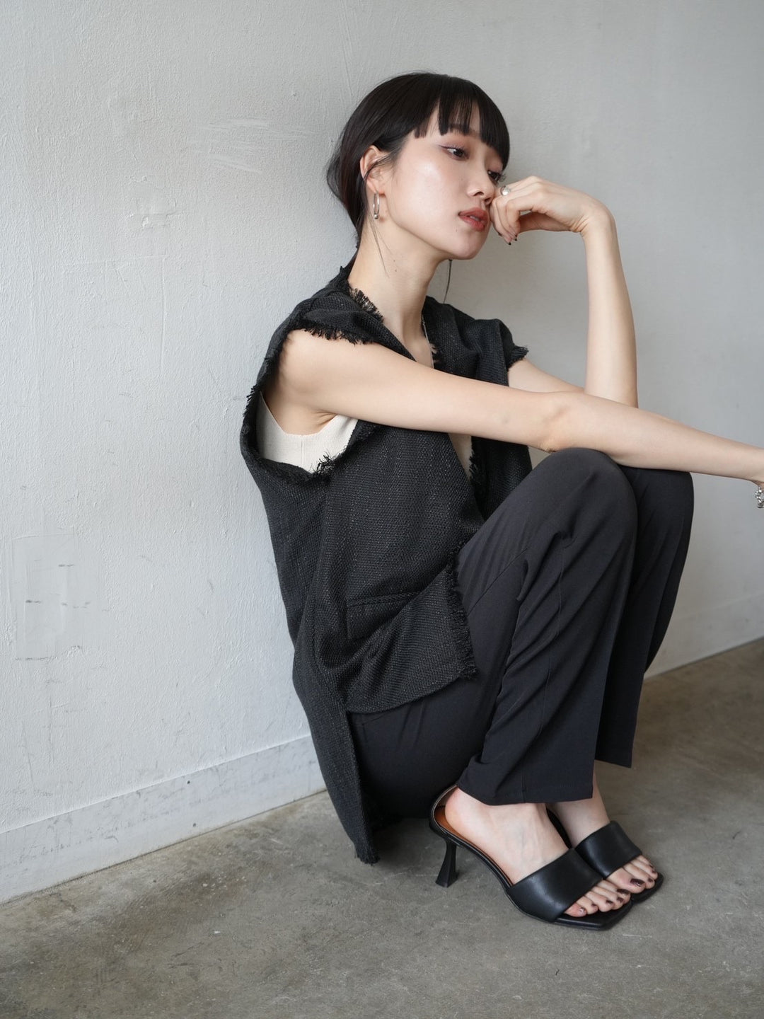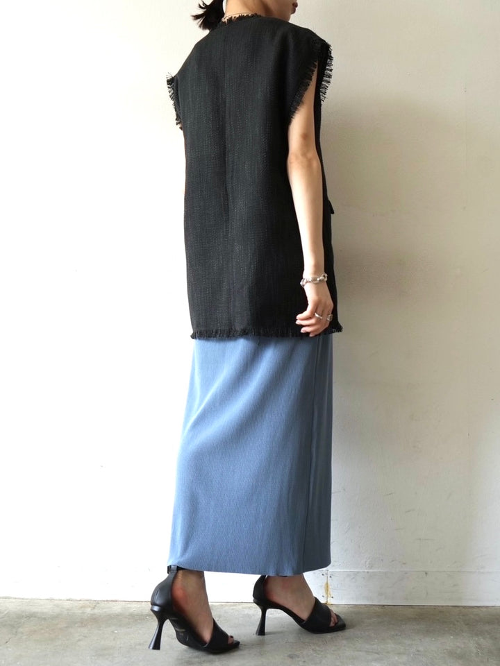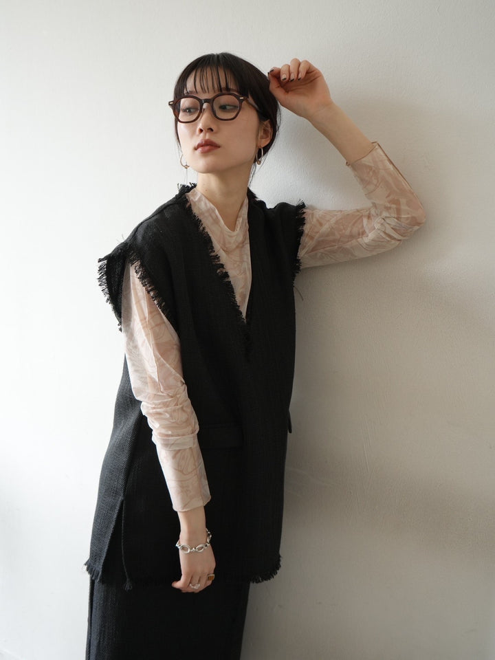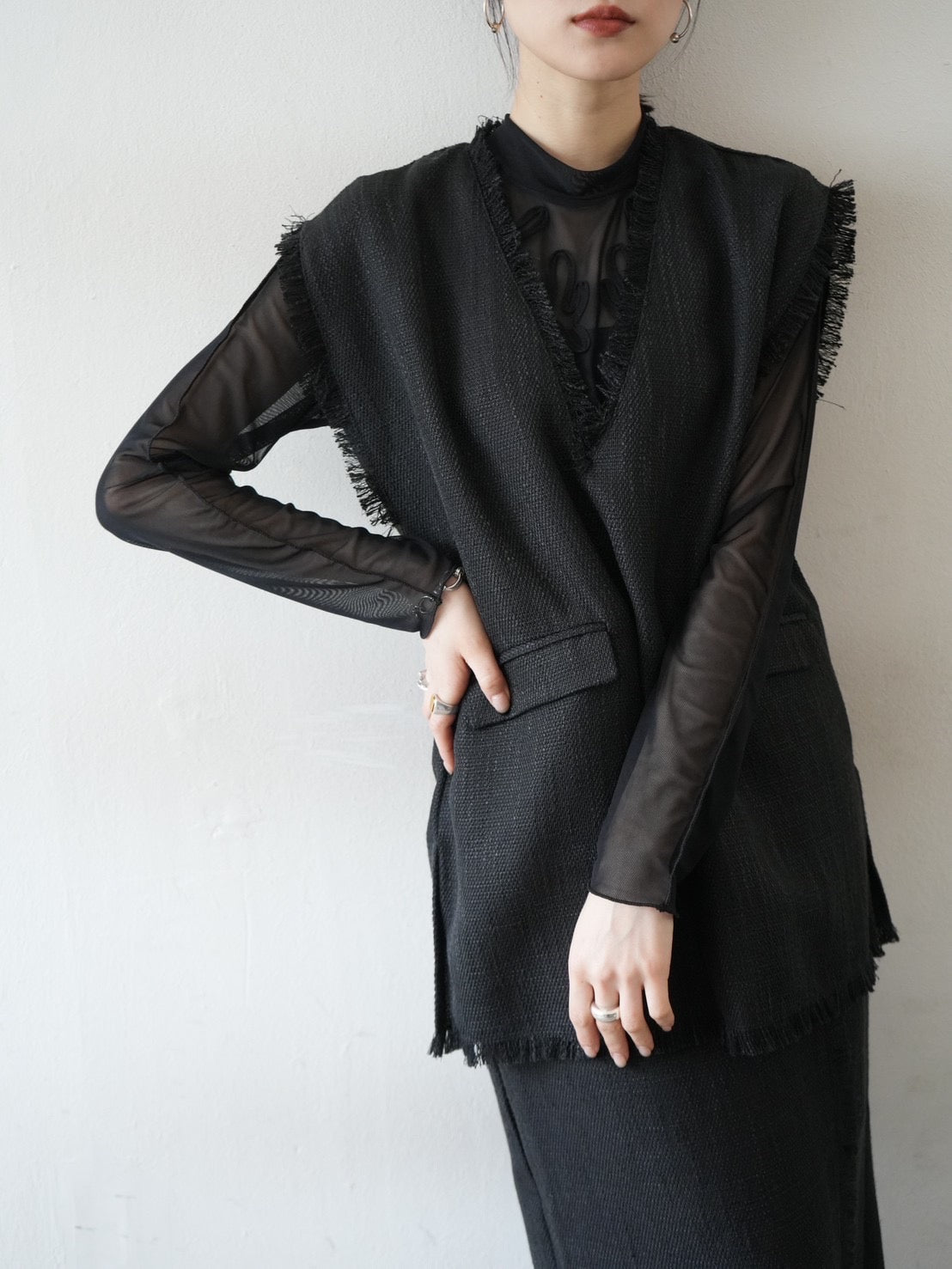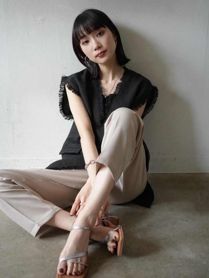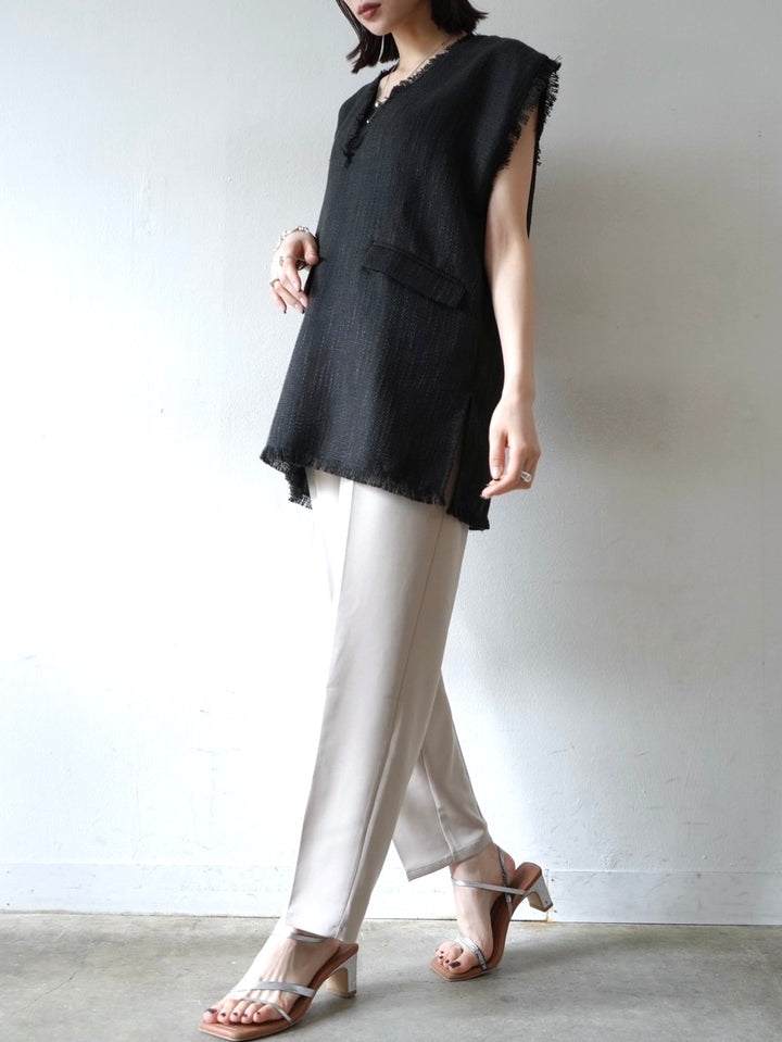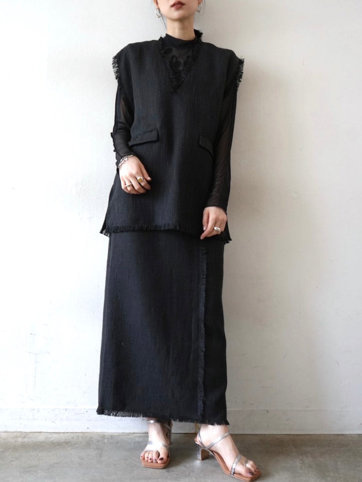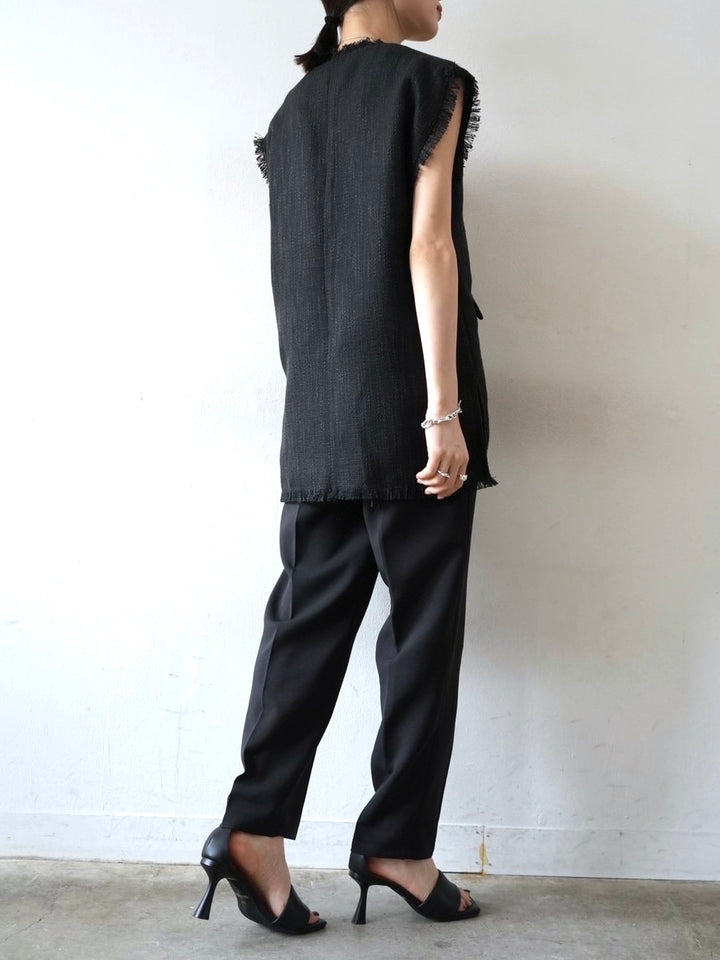 フリンジが施されたツイードベストはサラッとした素材感で、シャープに開いたVネックとの掛け合わせで涼しげな印象を与えます。長めの着丈ながらもポケットが目線を上げてくれるのでバランスが良く、サイドスリット入りのためウエスト周りに程良いゆとりがあります。夏はキャミソールやタンクトップを合わせてプルオーバーとして着用するのがおすすめ。同素材のスカートとセットアップで着用できます。