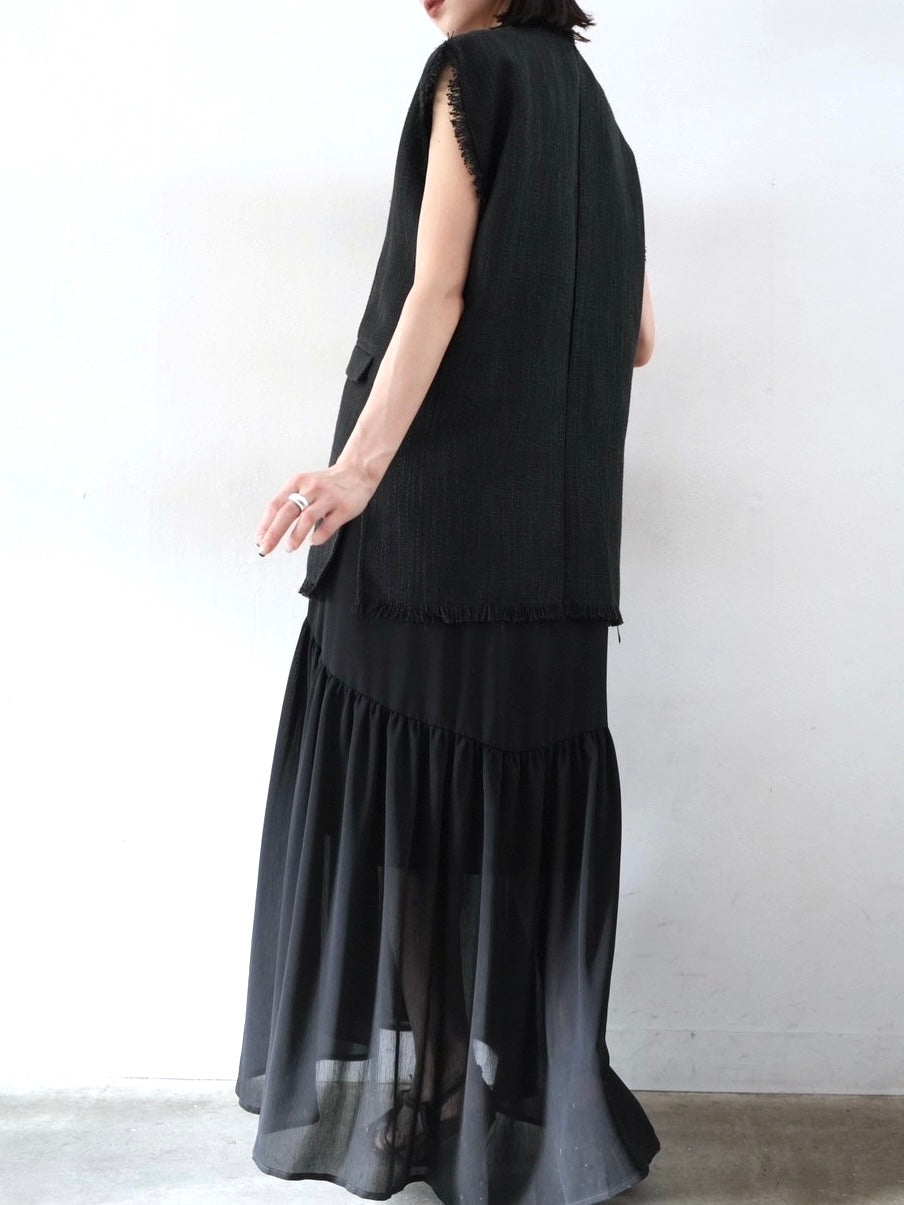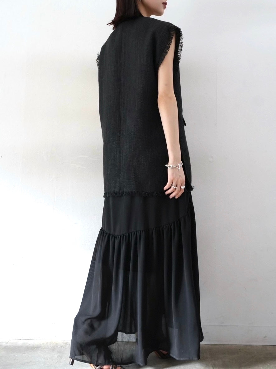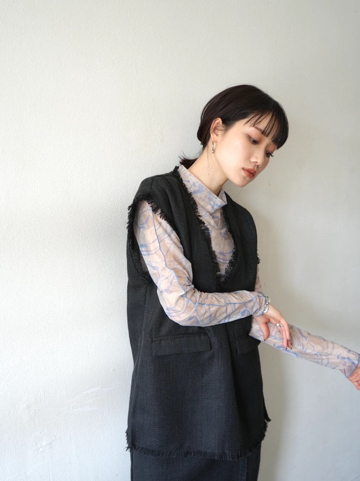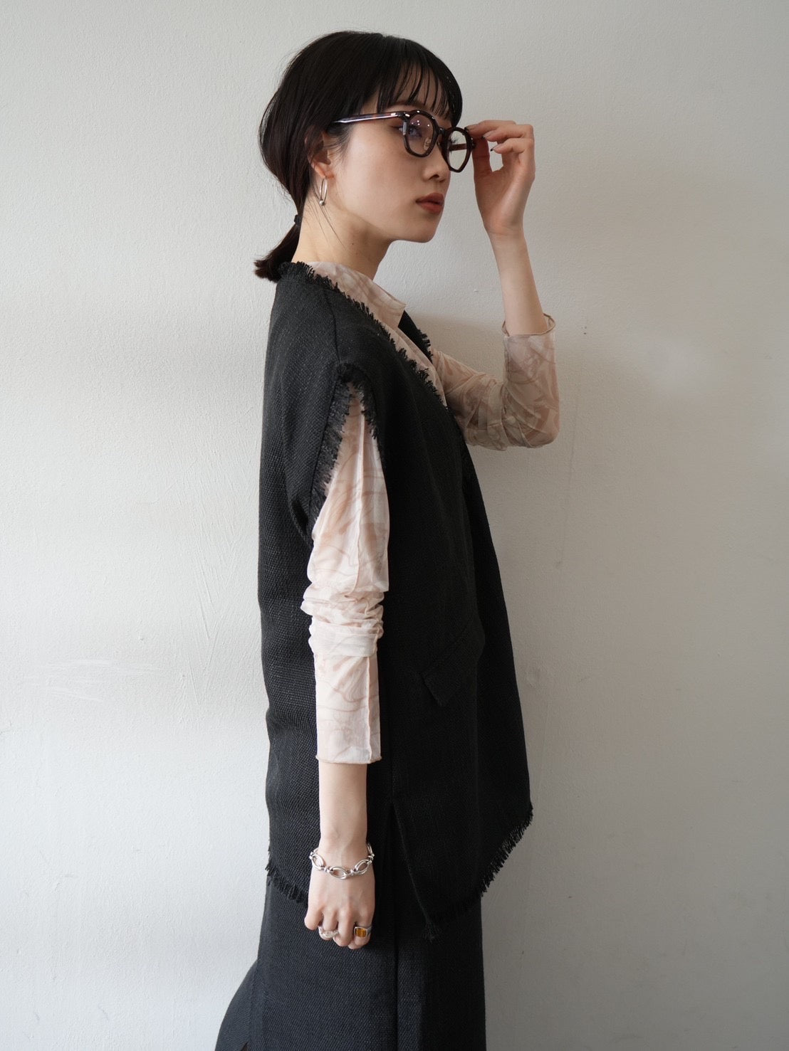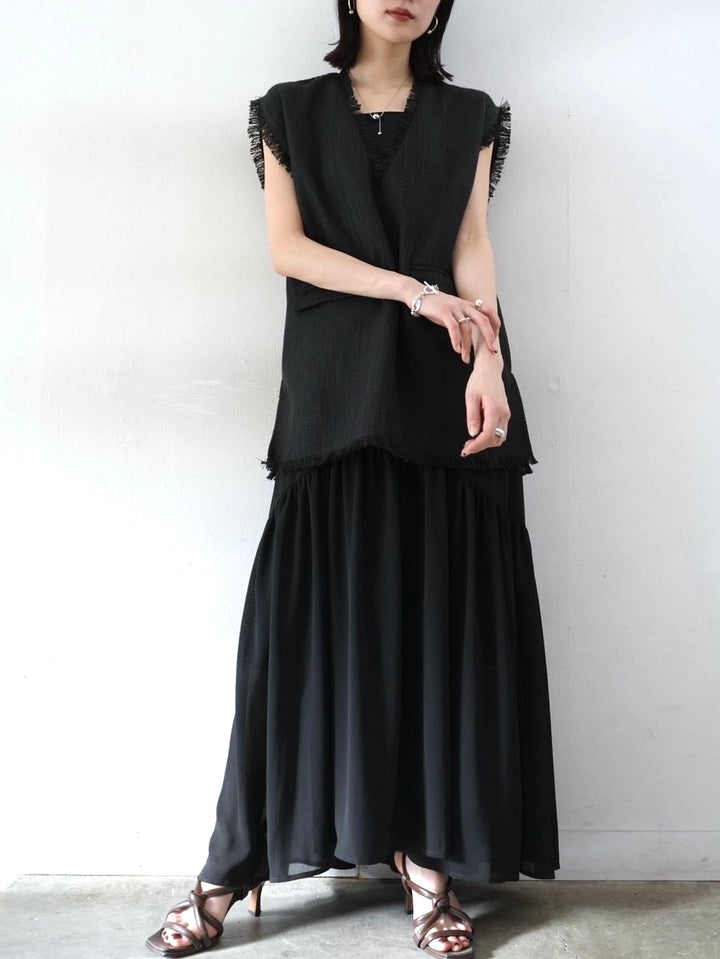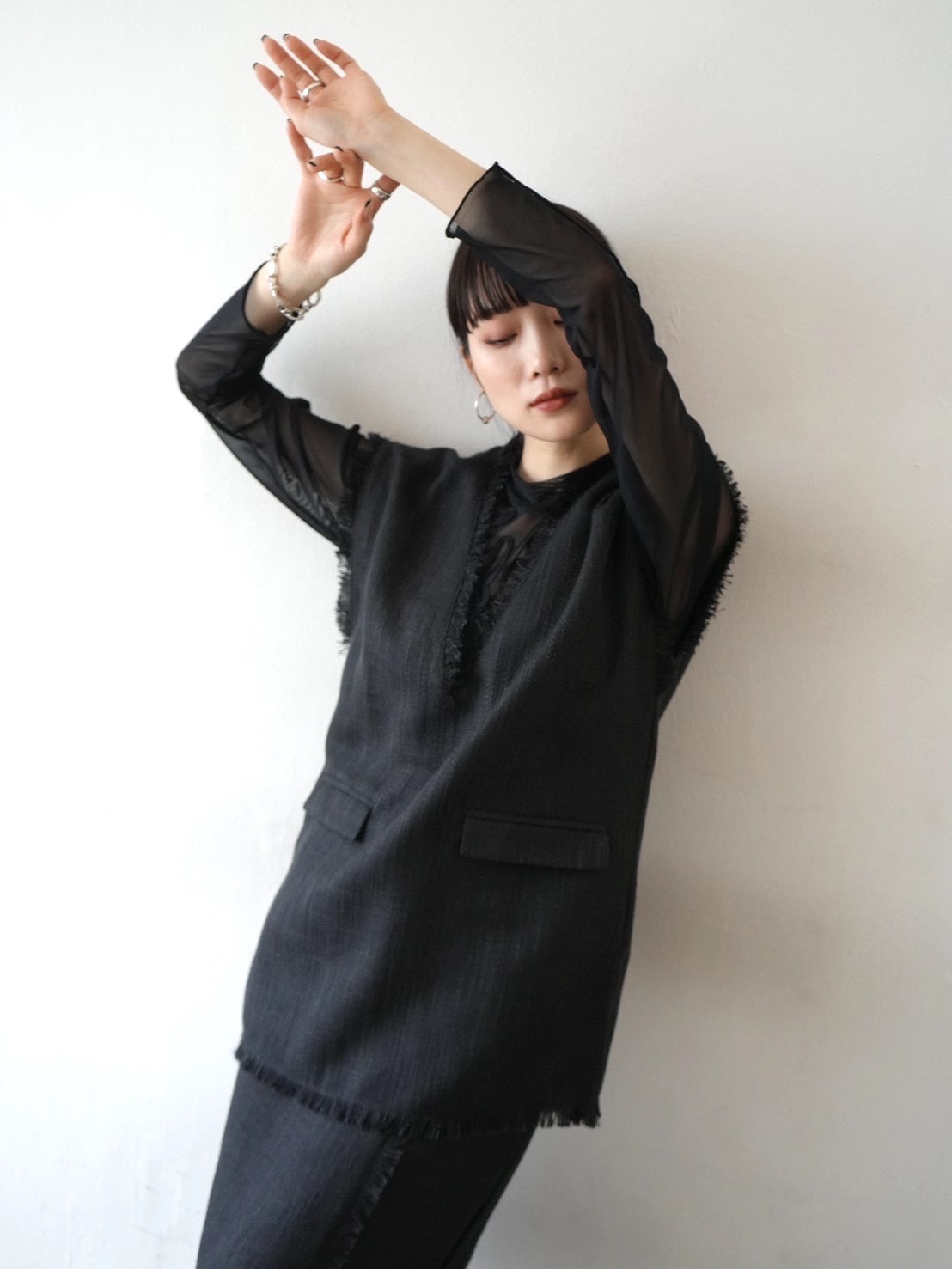 フリンジが施されたツイードベストはサラッとした素材感で、シャープに開いたVネックとの掛け合わせで涼しげな印象を与えます。長めの着丈ながらもポケットが目線を上げてくれるのでバランスが良く、サイドスリット入りのためウエスト周りに程良いゆとりがあります。夏はキャミソールやタンクトップを合わせてプルオーバーとして着用するのがおすすめ。同素材のスカートとセットアップで着用できます。