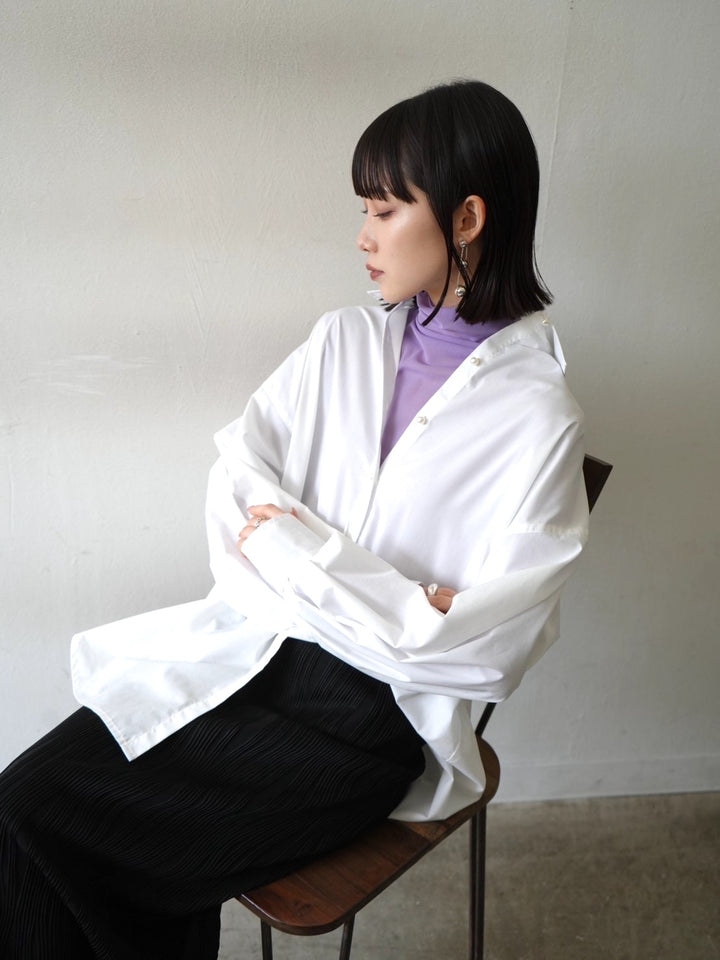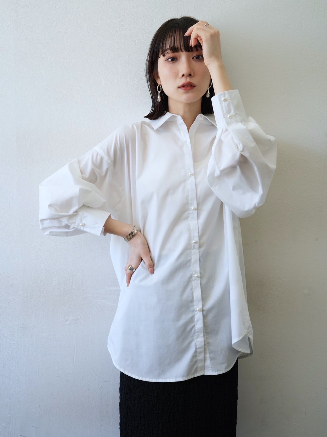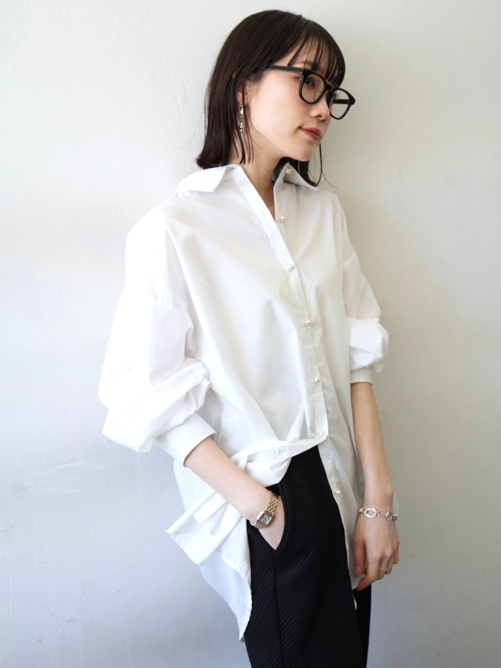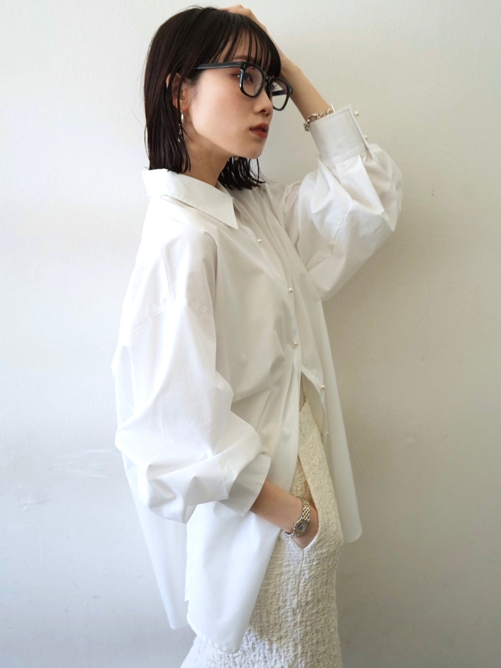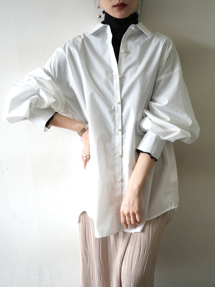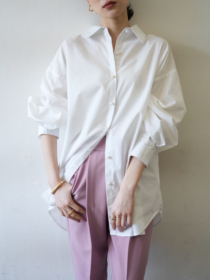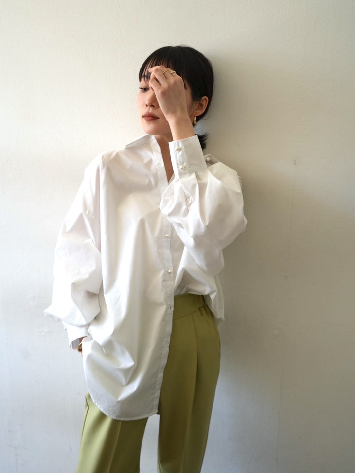 シンプルなオーバーサイズシャツもパールボタンなら、簡単にフェミニンなムードを取り込めます。袖にはタックが施されているので、たくし上げるとボリュームスリーブに早変わり。後ろはセンターボックス入りでメリハリのあるデザインに仕上がっていて、同時にフォーマルな雰囲気がプラスされています。ボタンアレンジしたり、羽織にしたりと、一枚でいろいろな着方をお楽しみいただけます。