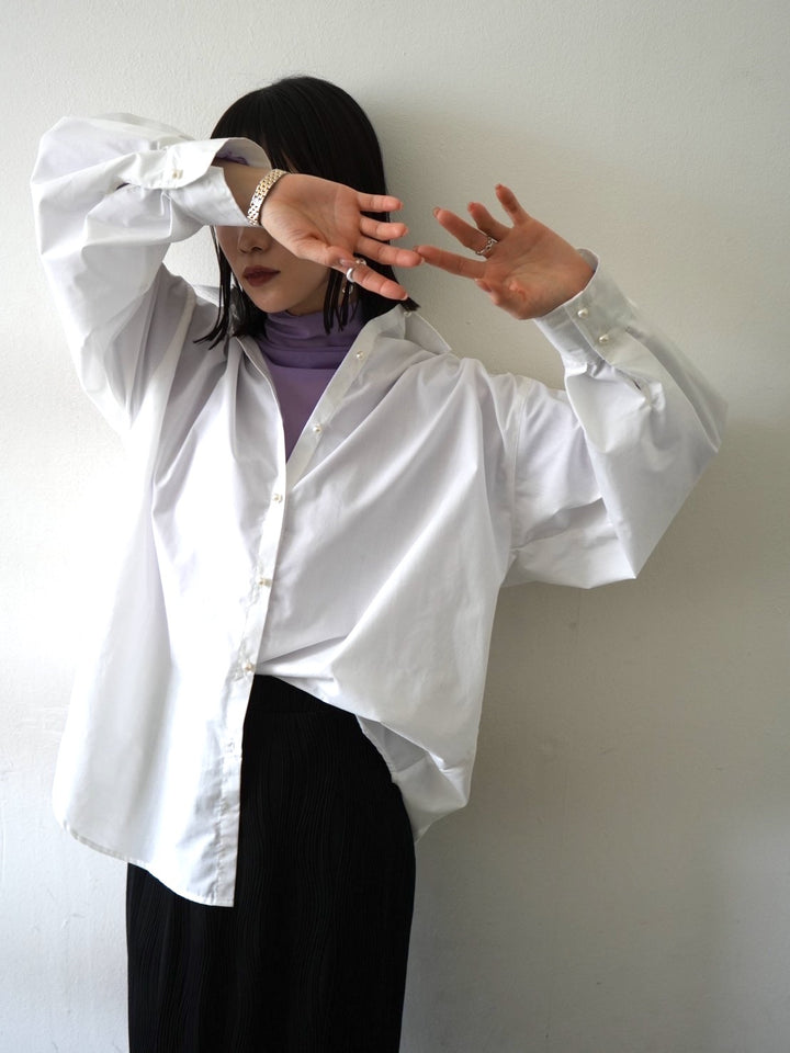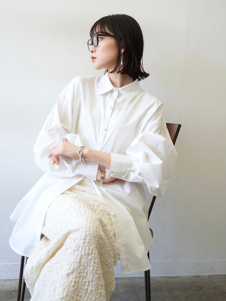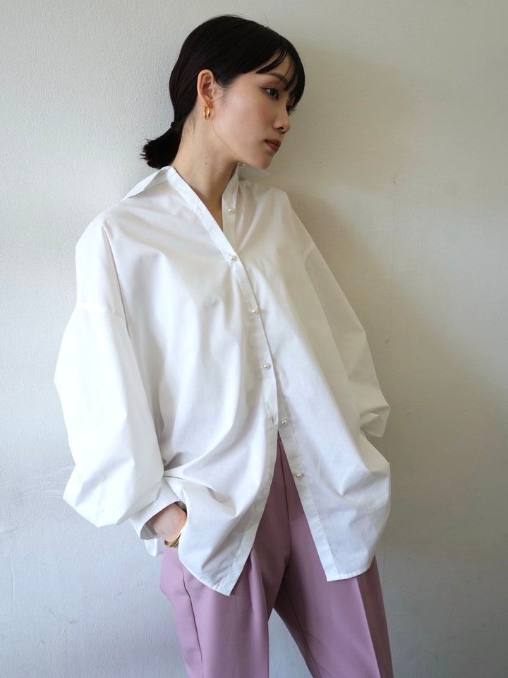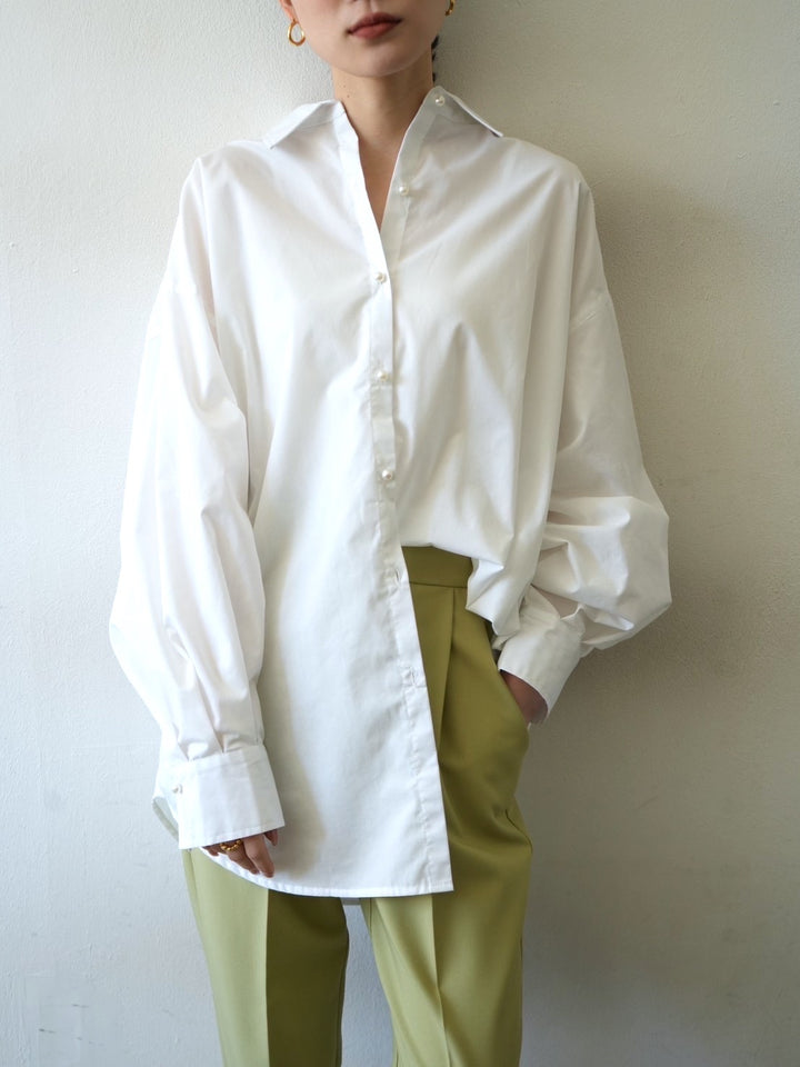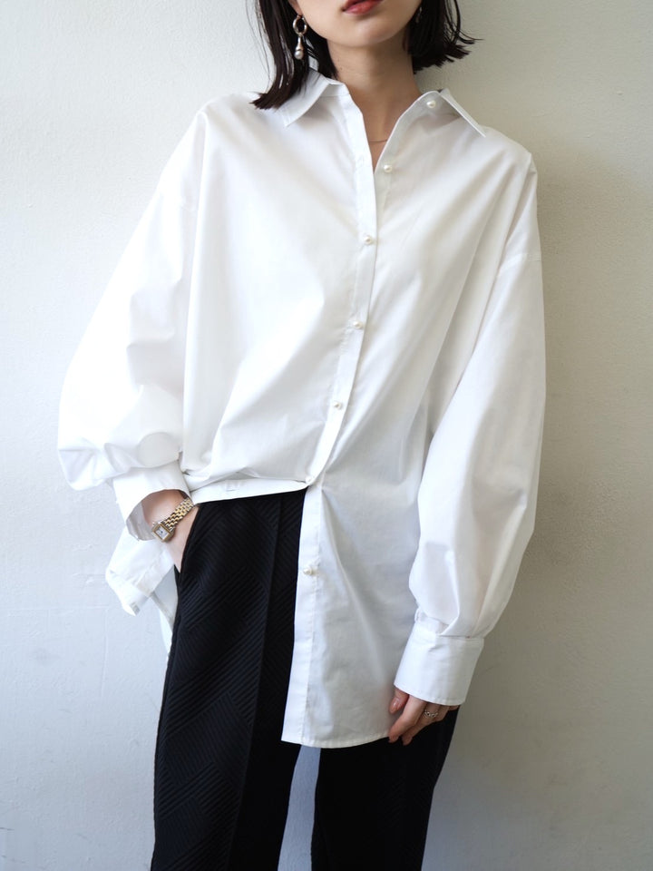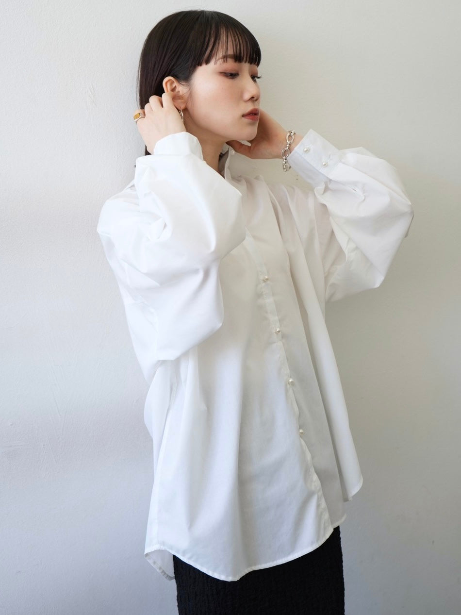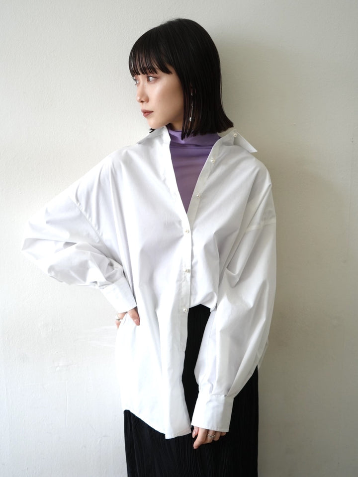 シンプルなオーバーサイズシャツもパールボタンなら、簡単にフェミニンなムードを取り込めます。袖にはタックが施されているので、たくし上げるとボリュームスリーブに早変わり。後ろはセンターボックス入りでメリハリのあるデザインに仕上がっていて、同時にフォーマルな雰囲気がプラスされています。ボタンアレンジしたり、羽織にしたりと、一枚でいろいろな着方をお楽しみいただけます。