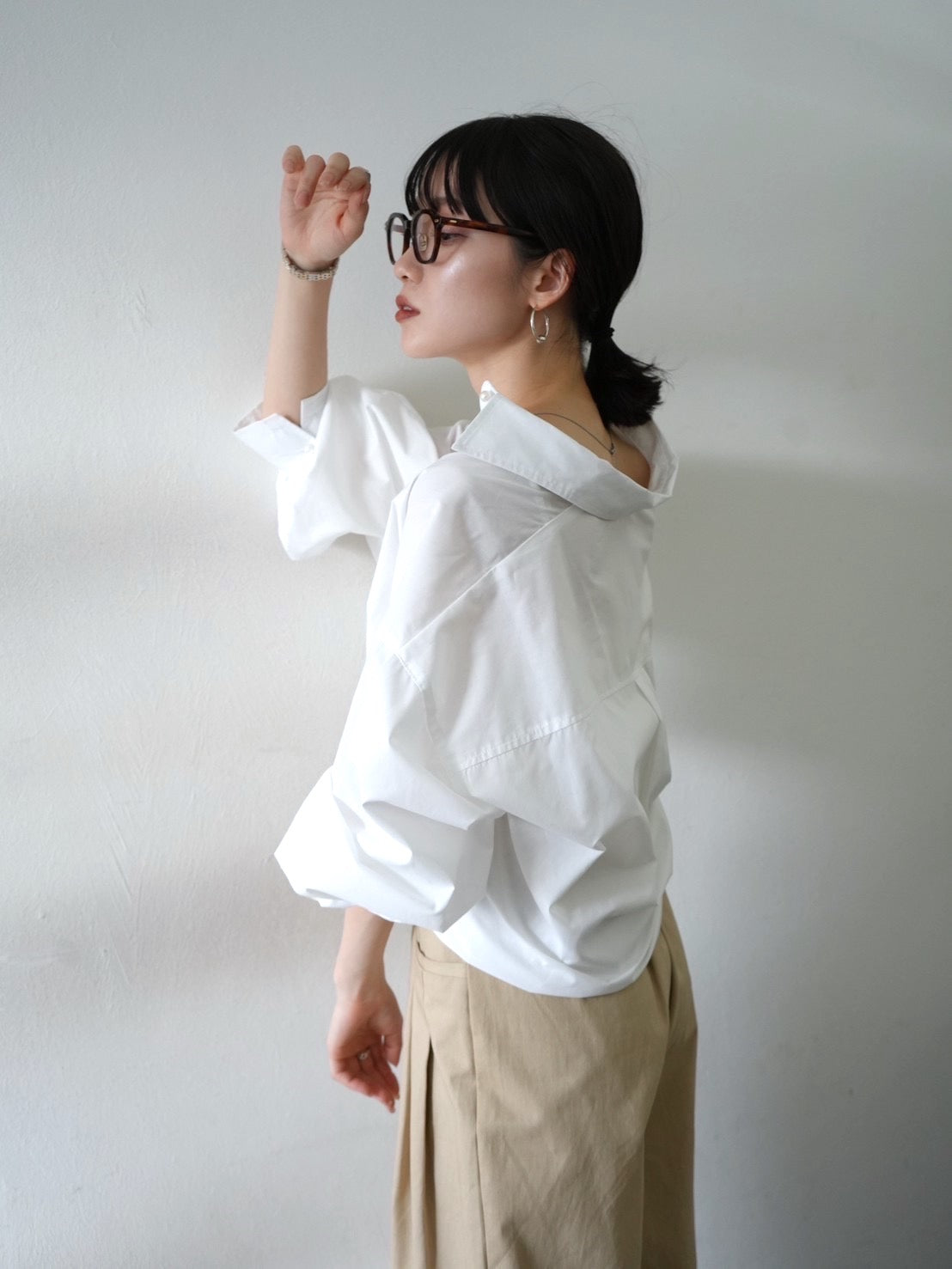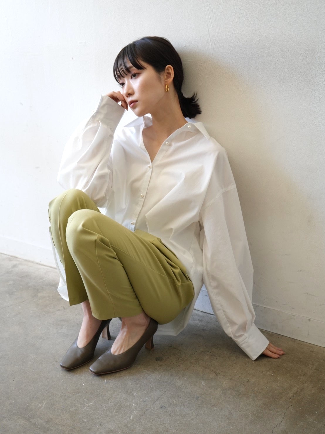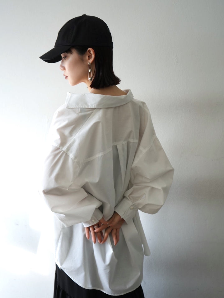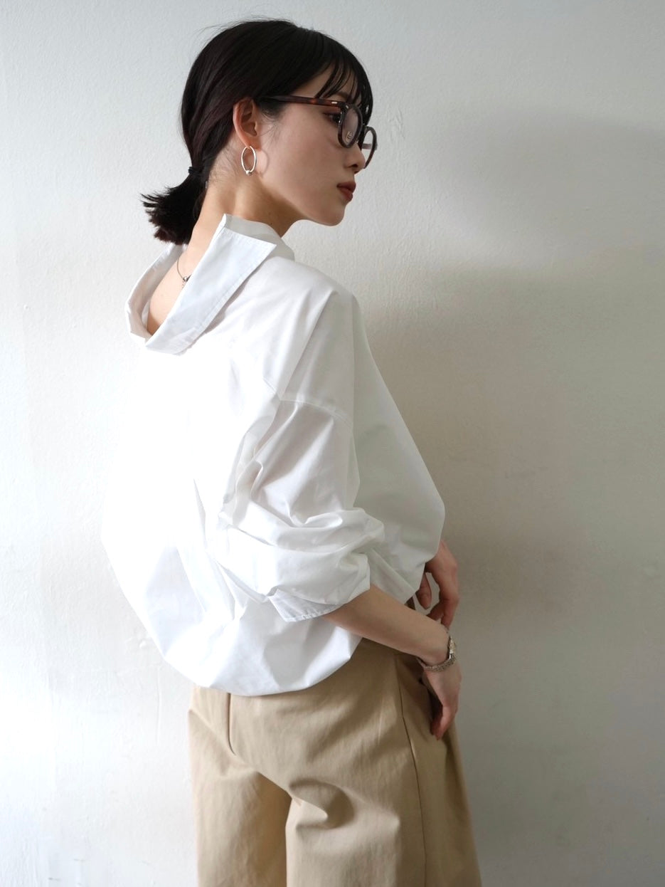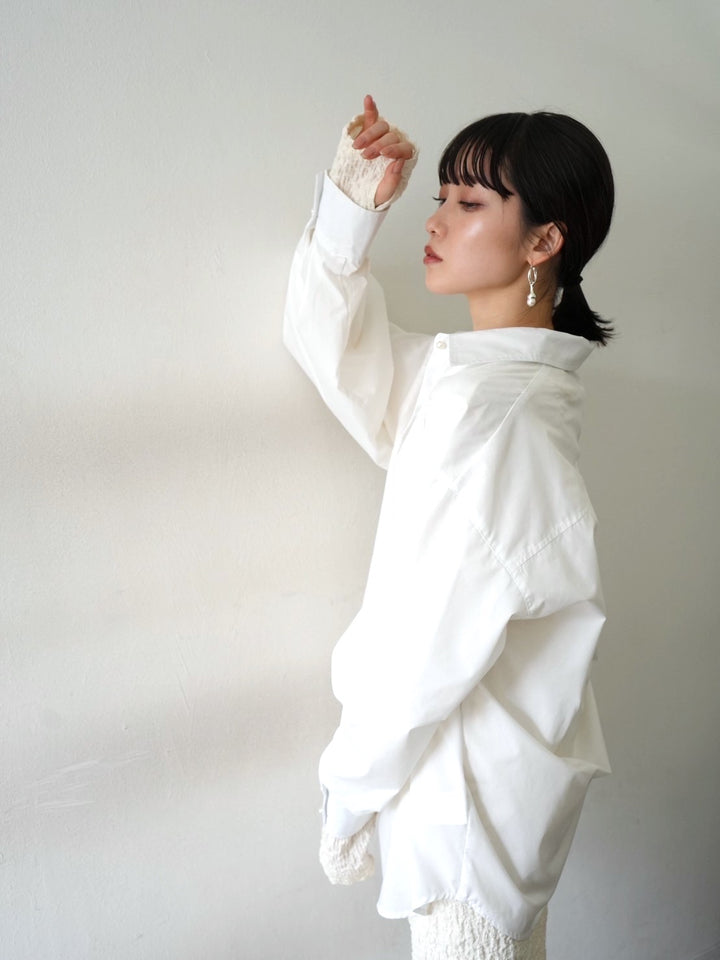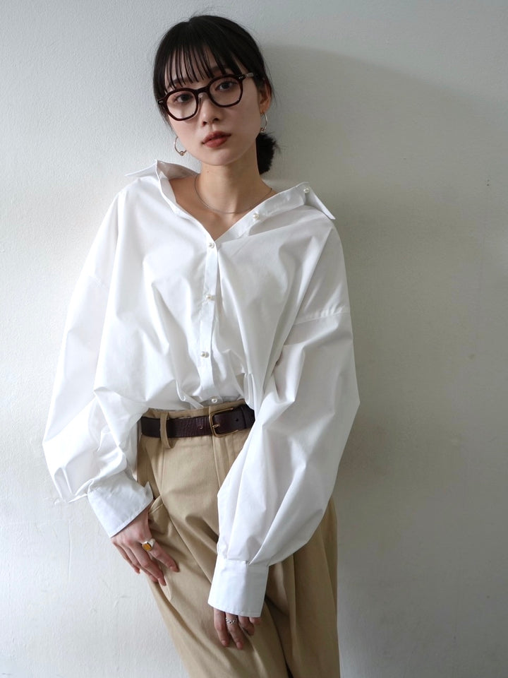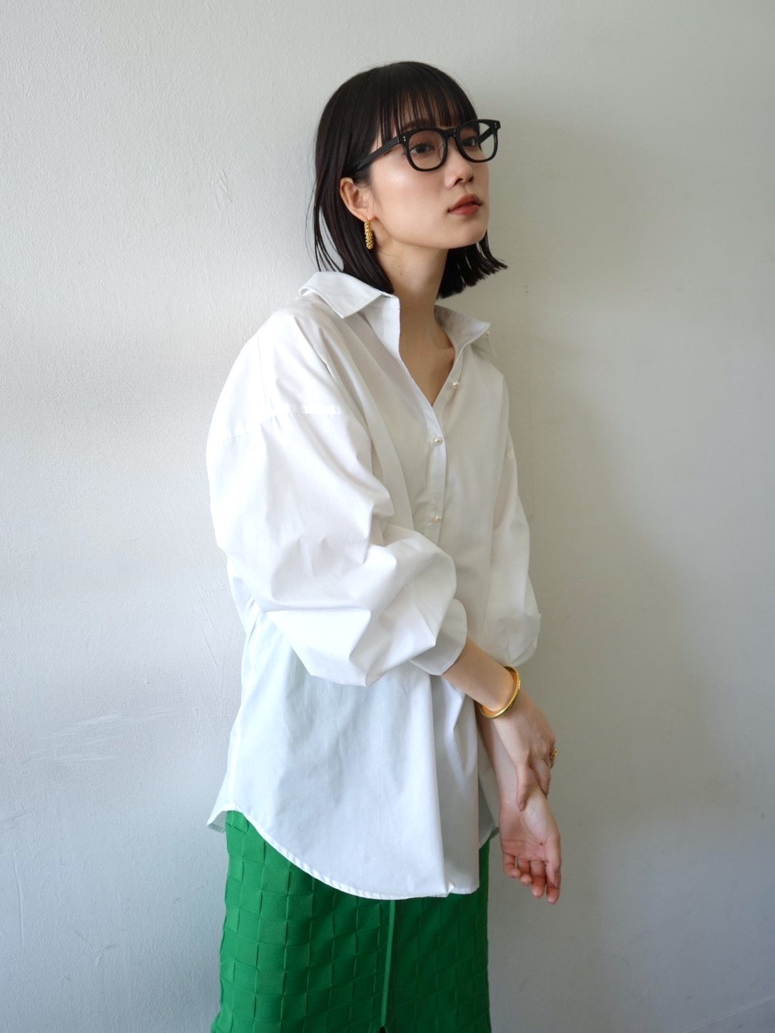 シンプルなオーバーサイズシャツもパールボタンなら、簡単にフェミニンなムードを取り込めます。袖にはタックが施されているので、たくし上げるとボリュームスリーブに早変わり。後ろはセンターボックス入りでメリハリのあるデザインに仕上がっていて、同時にフォーマルな雰囲気がプラスされています。ボタンアレンジしたり、羽織にしたりと、一枚でいろいろな着方をお楽しみいただけます。