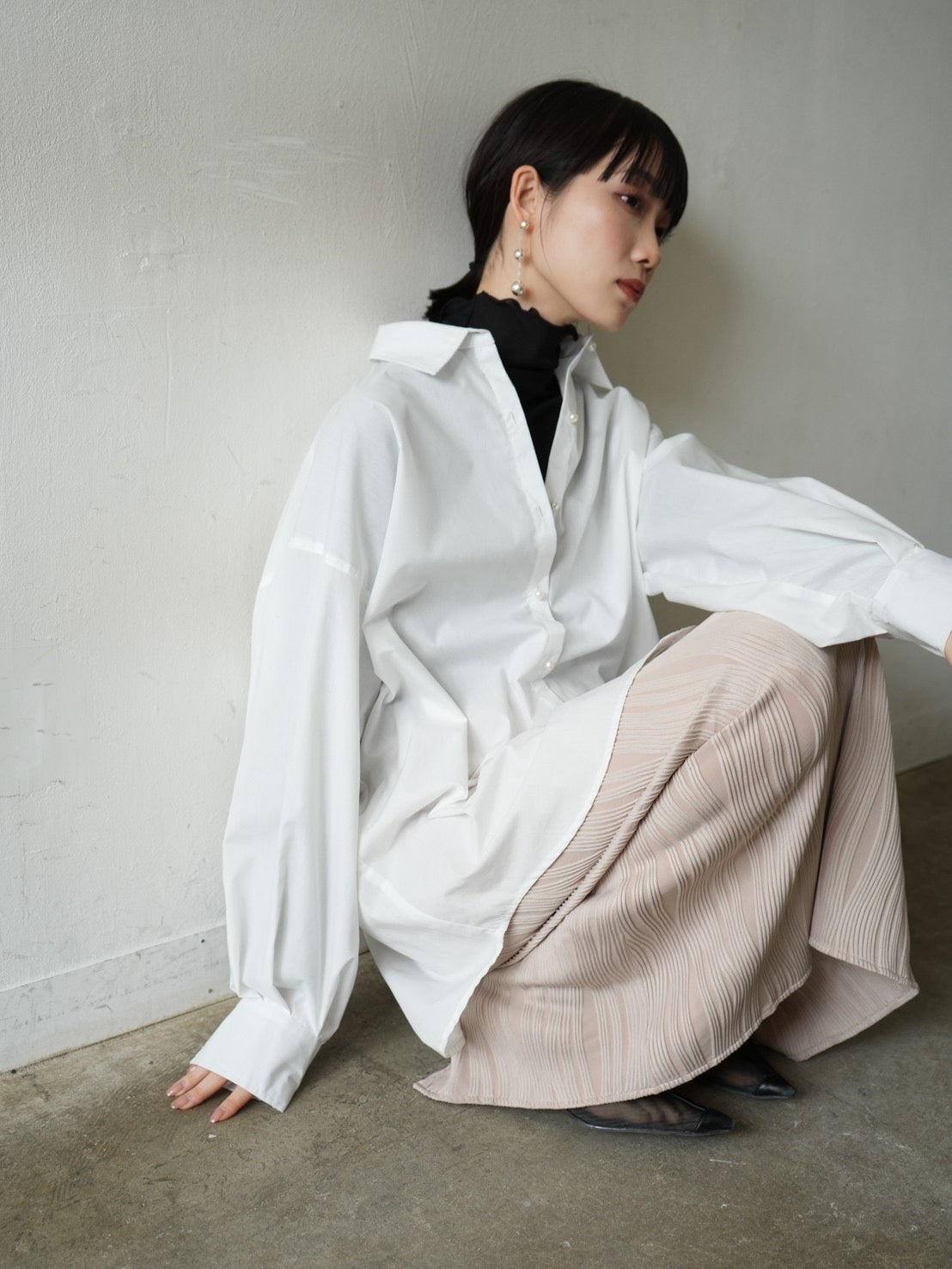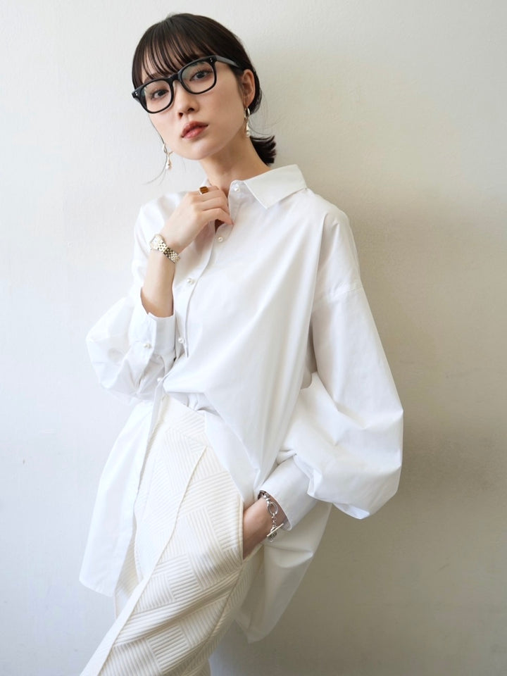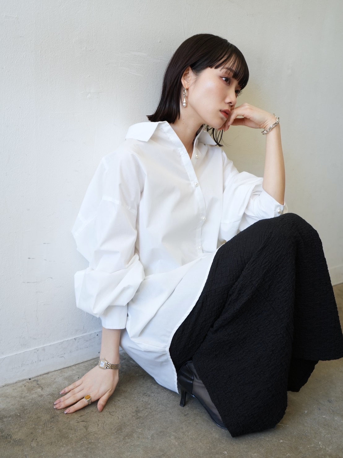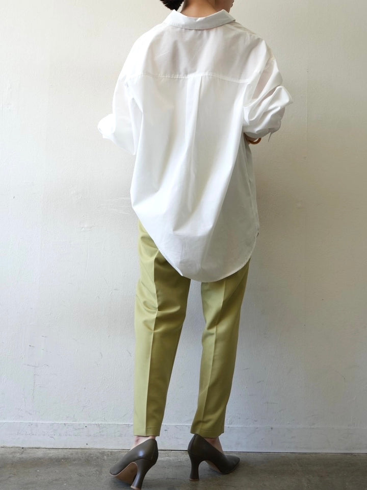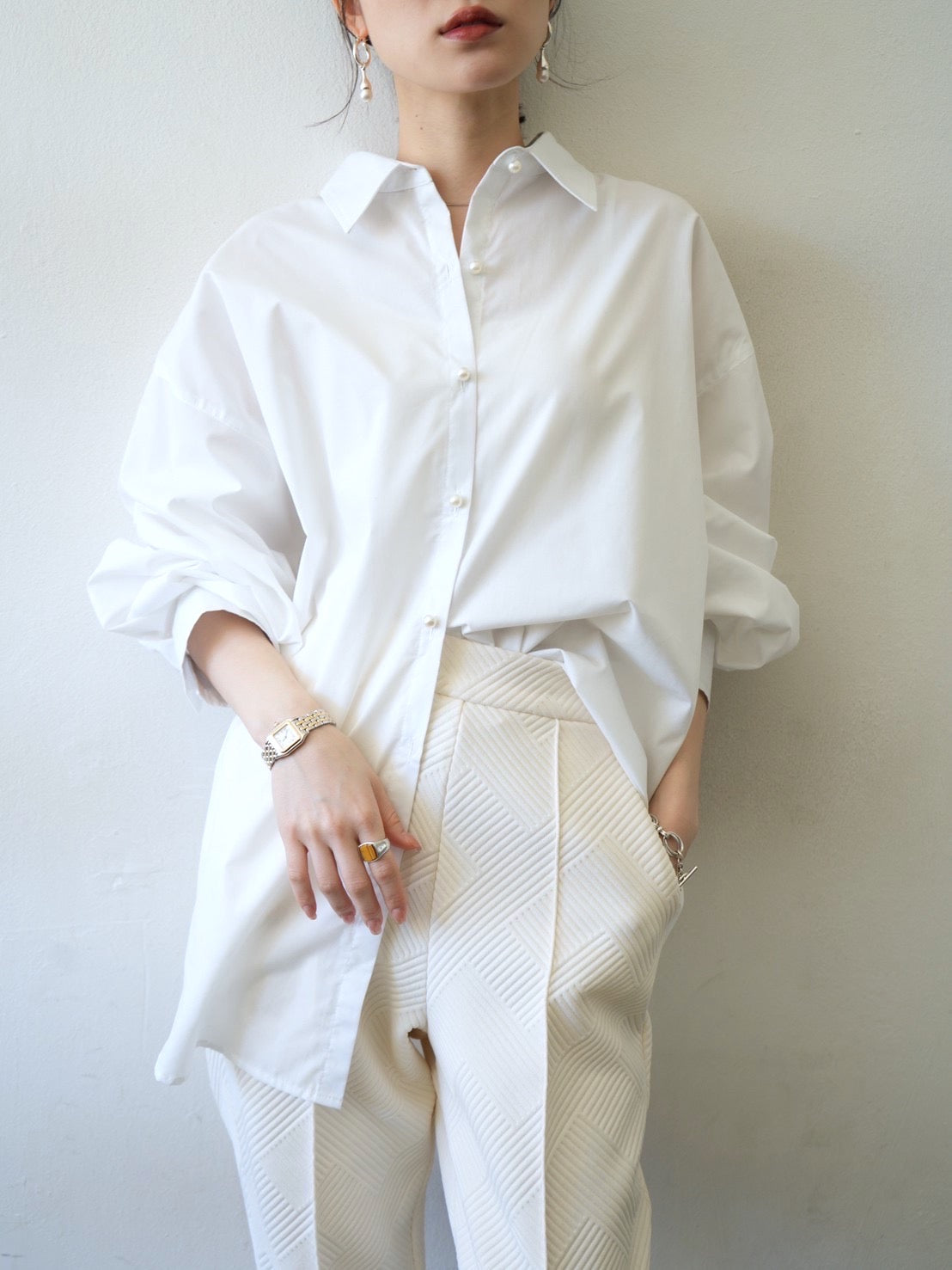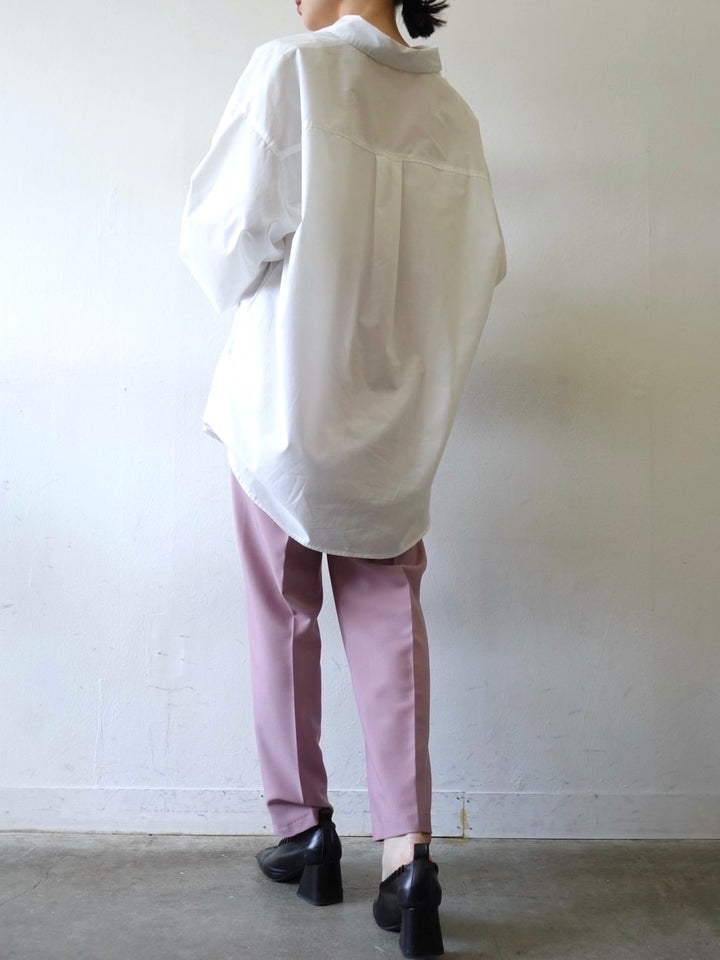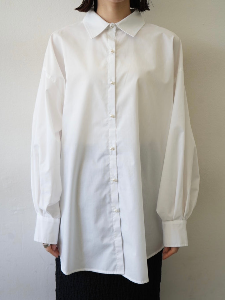 シンプルなオーバーサイズシャツもパールボタンなら、簡単にフェミニンなムードを取り込めます。袖にはタックが施されているので、たくし上げるとボリュームスリーブに早変わり。後ろはセンターボックス入りでメリハリのあるデザインに仕上がっていて、同時にフォーマルな雰囲気がプラスされています。ボタンアレンジしたり、羽織にしたりと、一枚でいろいろな着方をお楽しみいただけます。