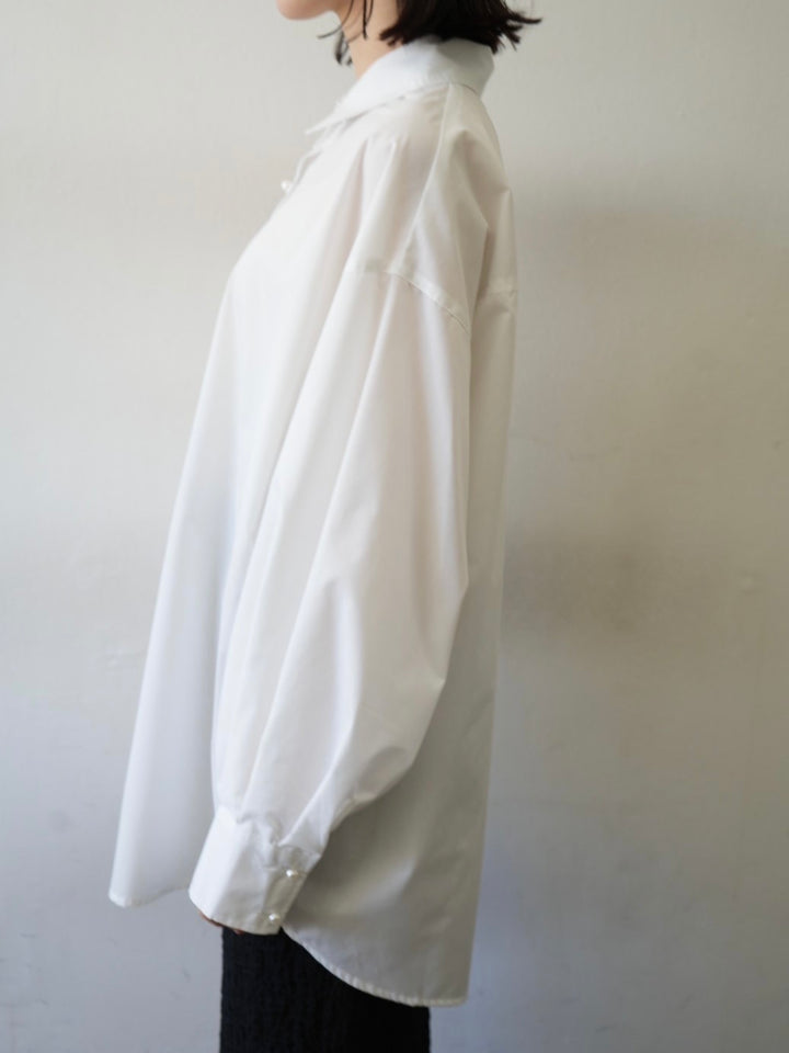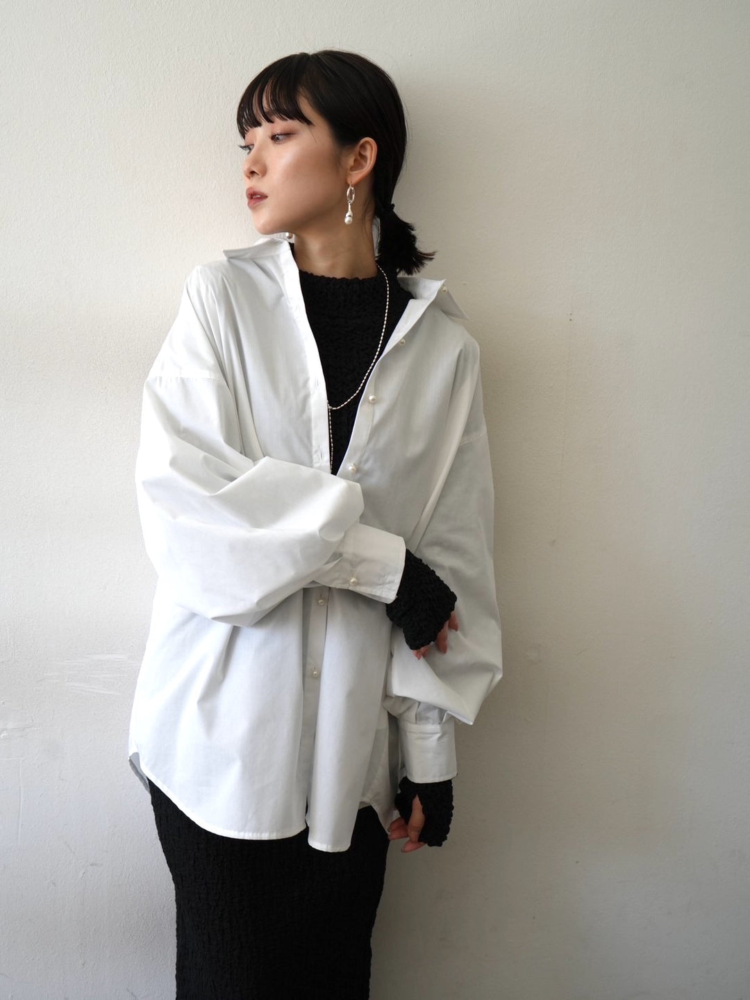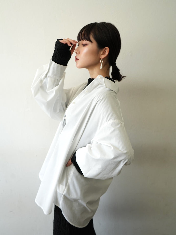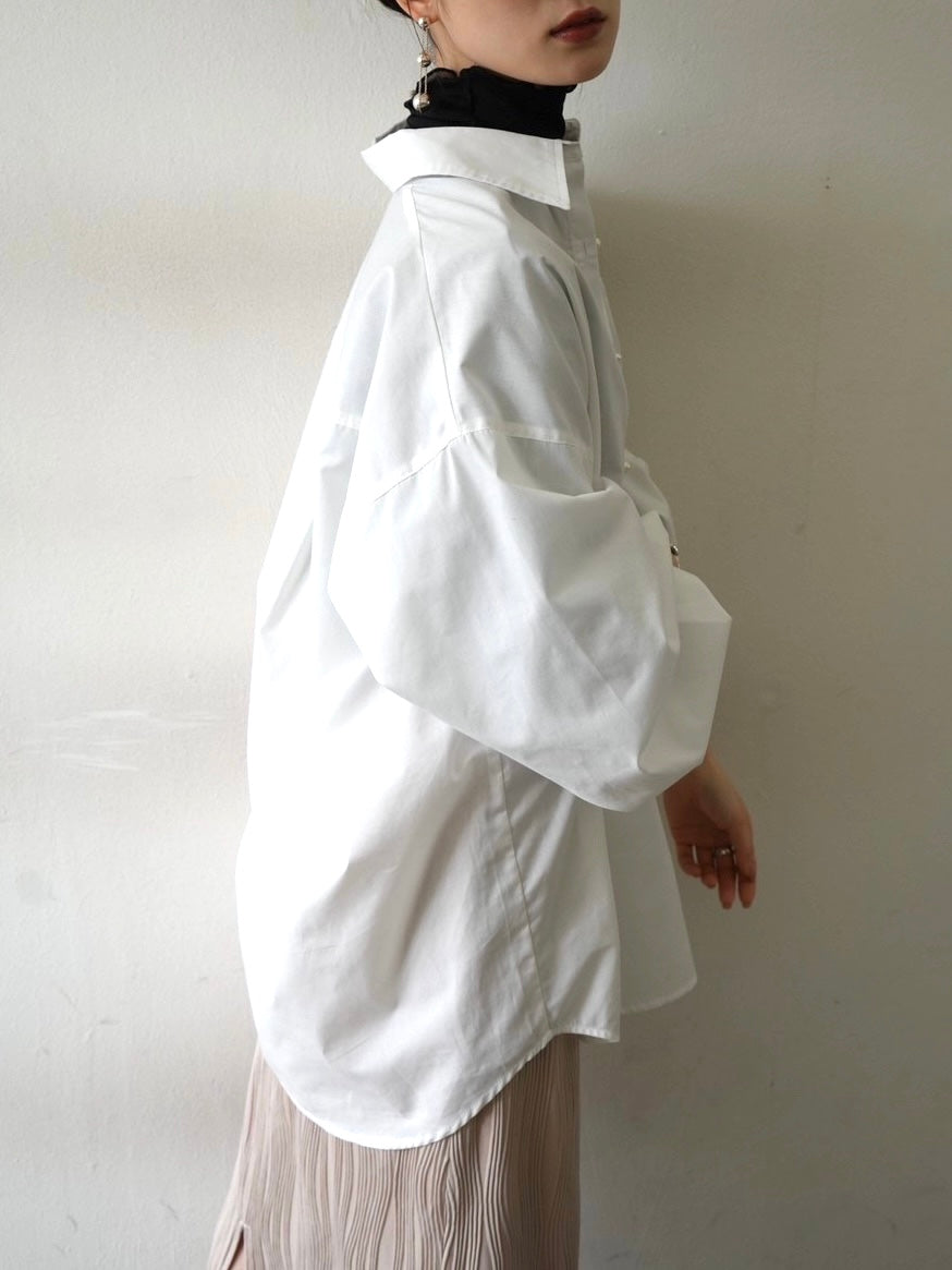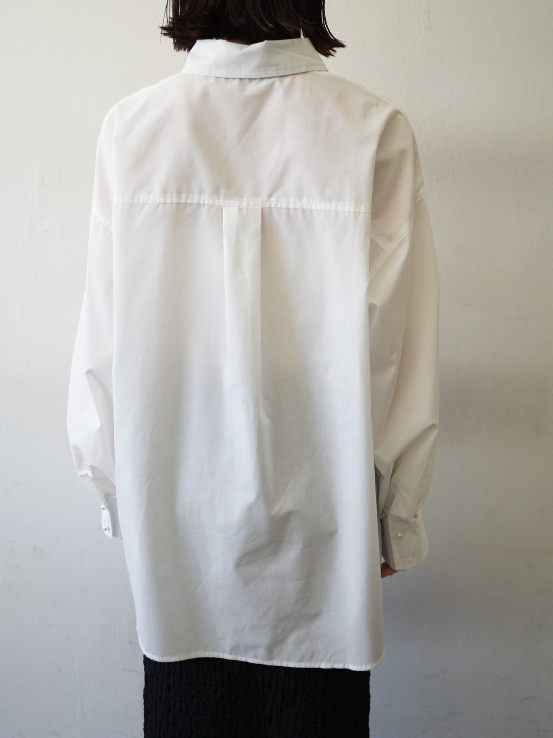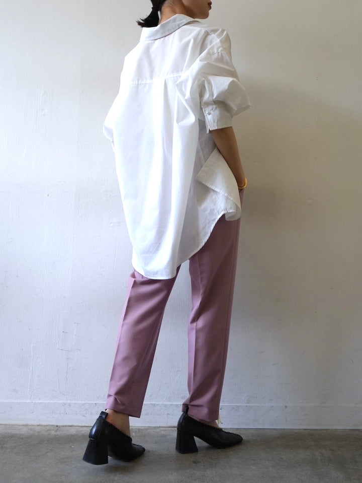 シンプルなオーバーサイズシャツもパールボタンなら、簡単にフェミニンなムードを取り込めます。袖にはタックが施されているので、たくし上げるとボリュームスリーブに早変わり。後ろはセンターボックス入りでメリハリのあるデザインに仕上がっていて、同時にフォーマルな雰囲気がプラスされています。ボタンアレンジしたり、羽織にしたりと、一枚でいろいろな着方をお楽しみいただけます。