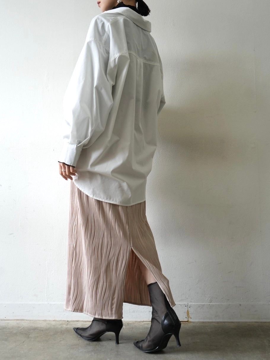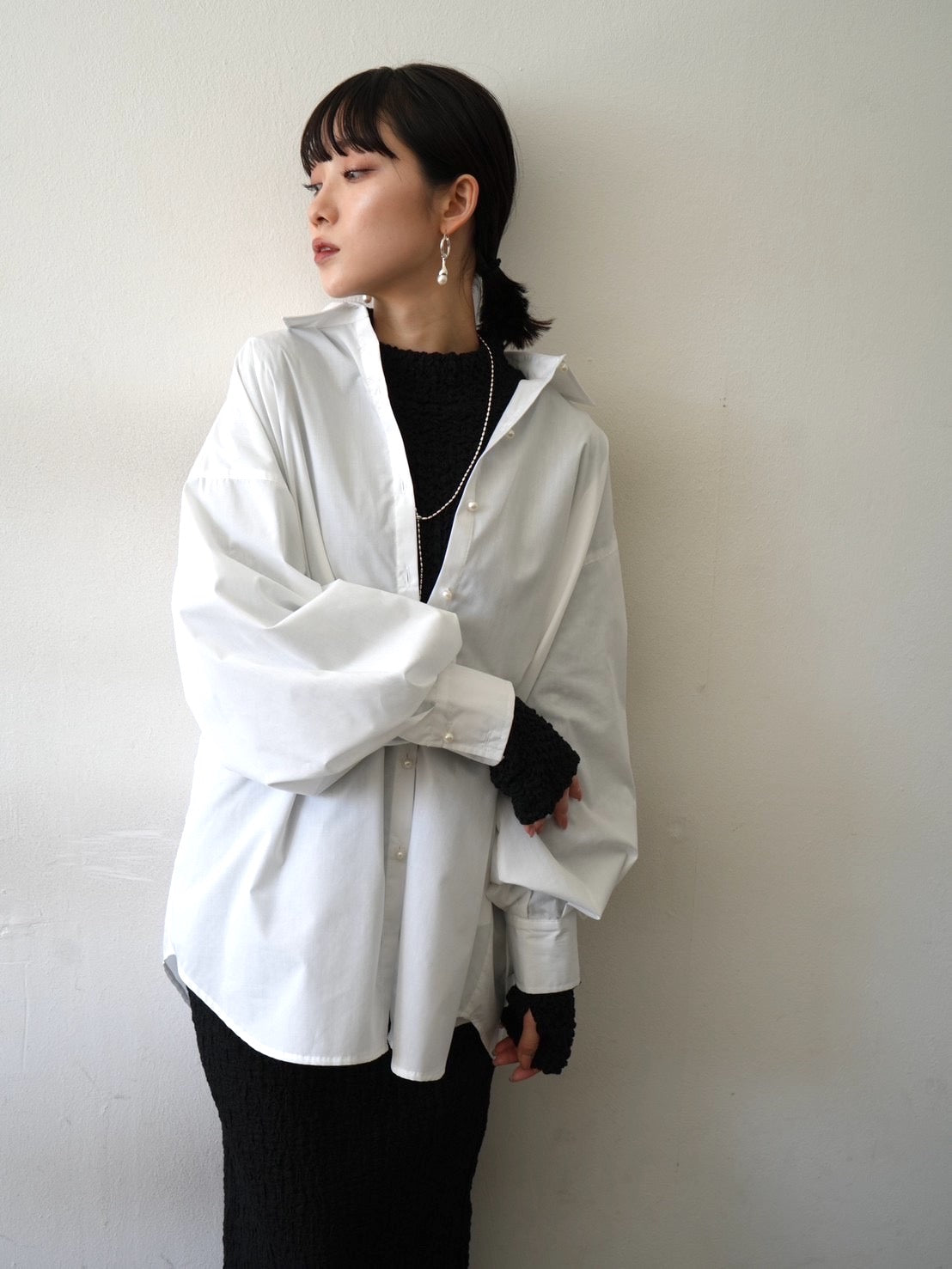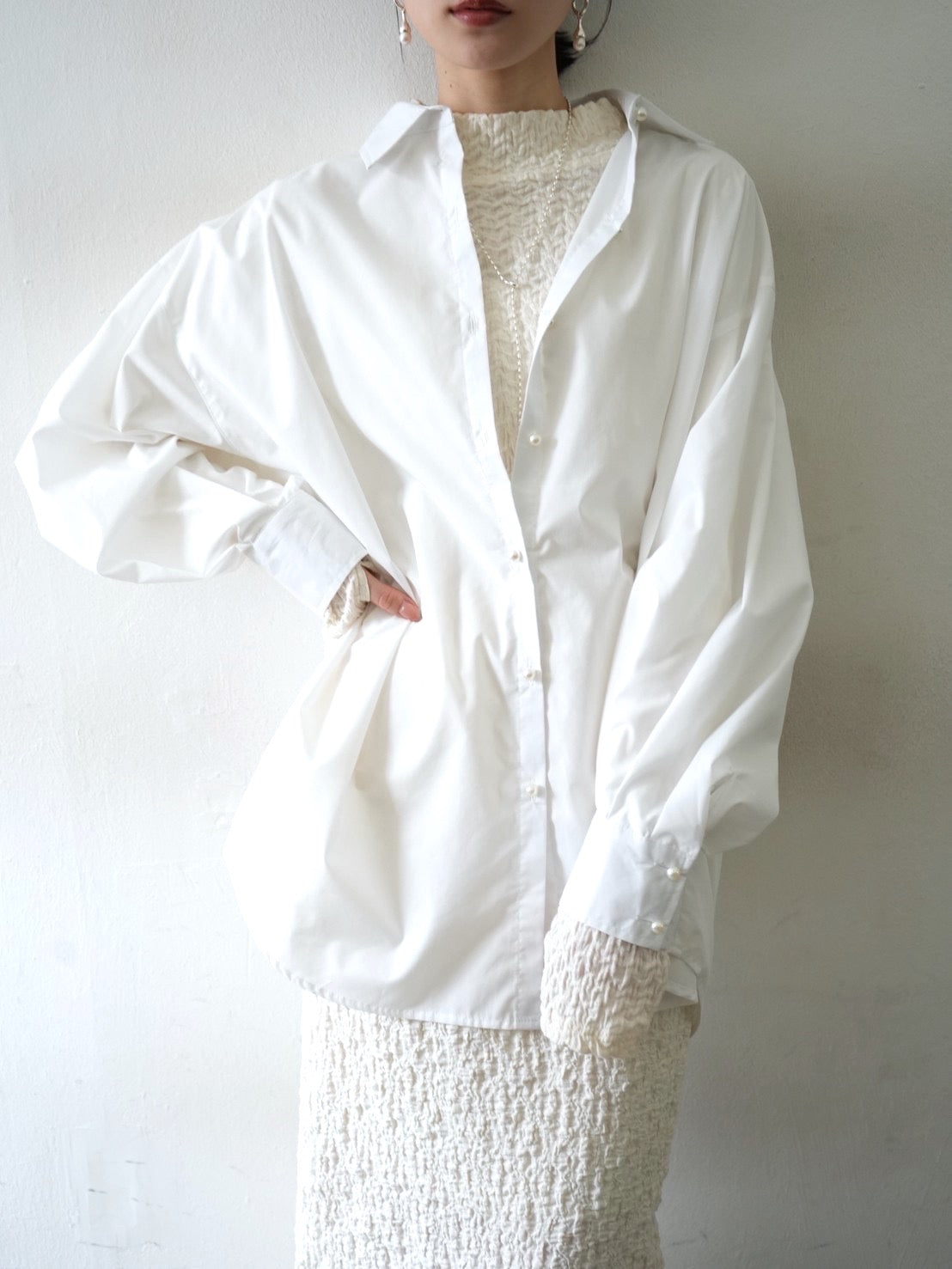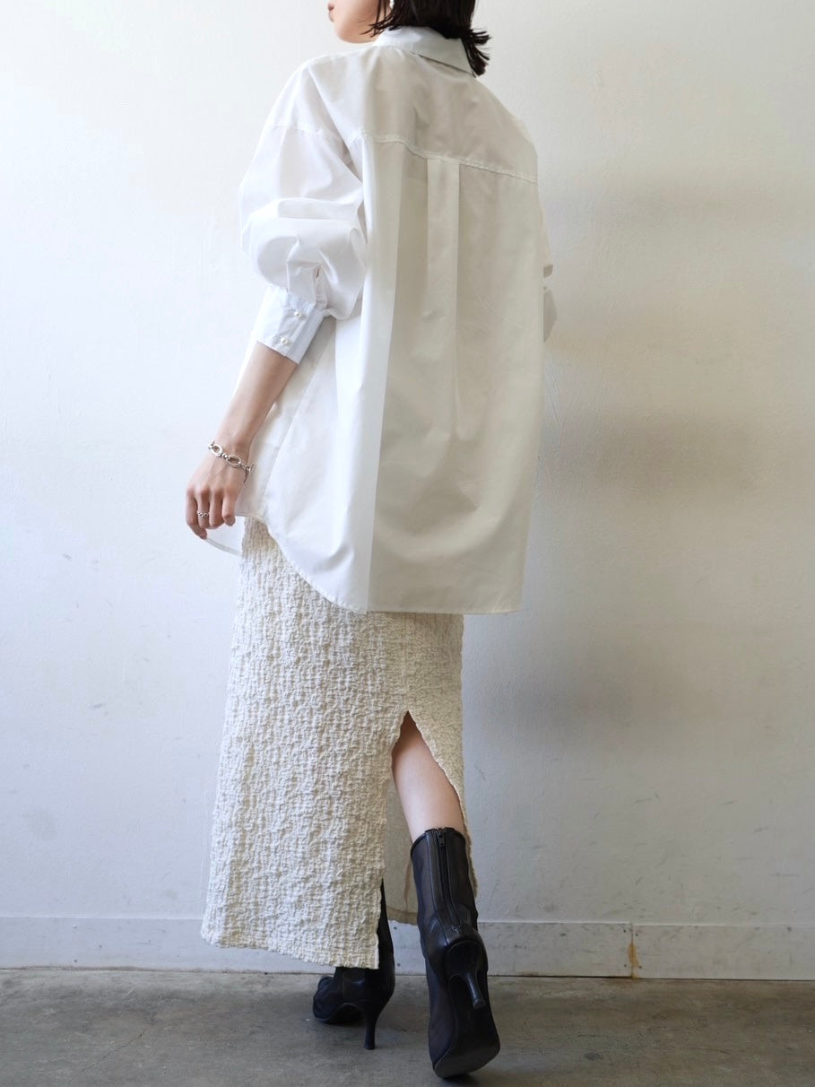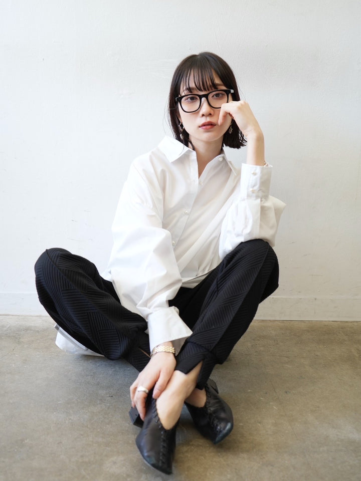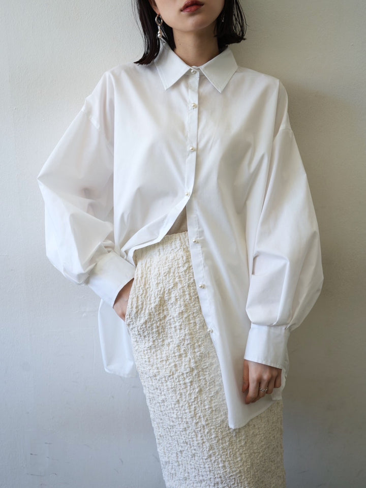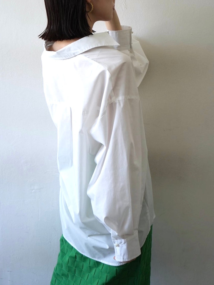 シンプルなオーバーサイズシャツもパールボタンなら、簡単にフェミニンなムードを取り込めます。袖にはタックが施されているので、たくし上げるとボリュームスリーブに早変わり。後ろはセンターボックス入りでメリハリのあるデザインに仕上がっていて、同時にフォーマルな雰囲気がプラスされています。ボタンアレンジしたり、羽織にしたりと、一枚でいろいろな着方をお楽しみいただけます。