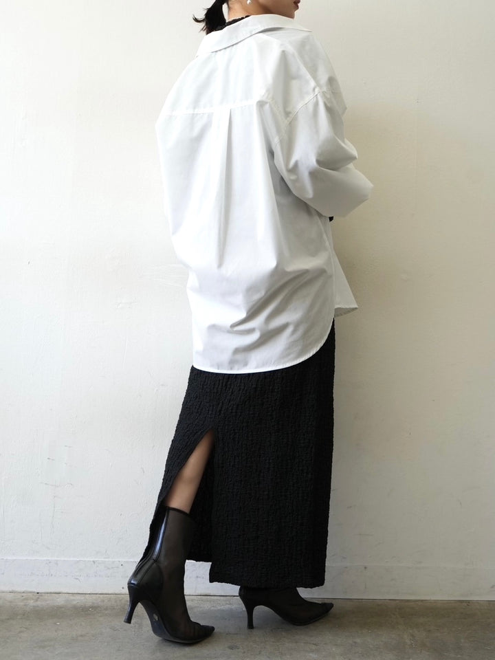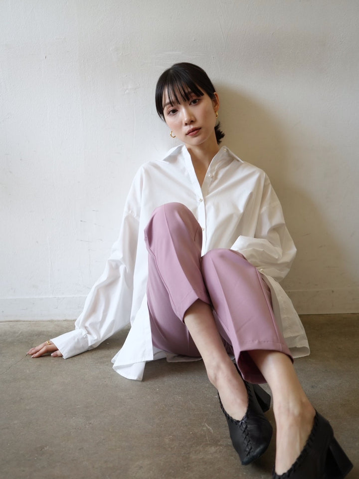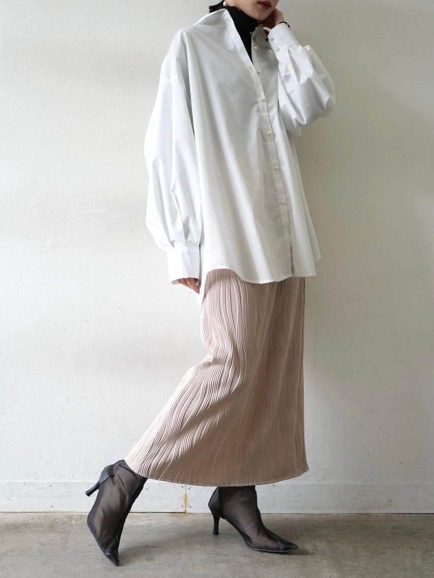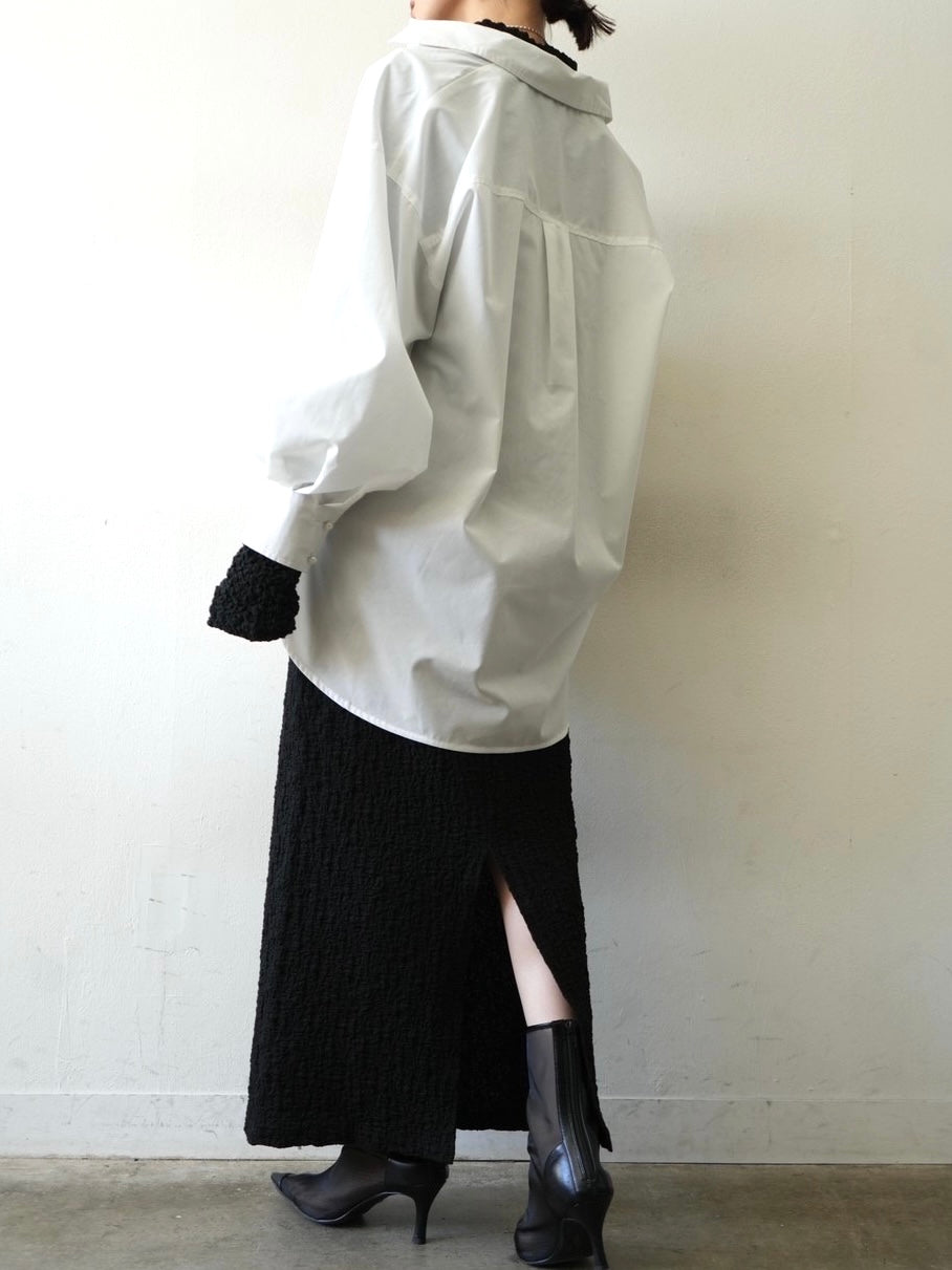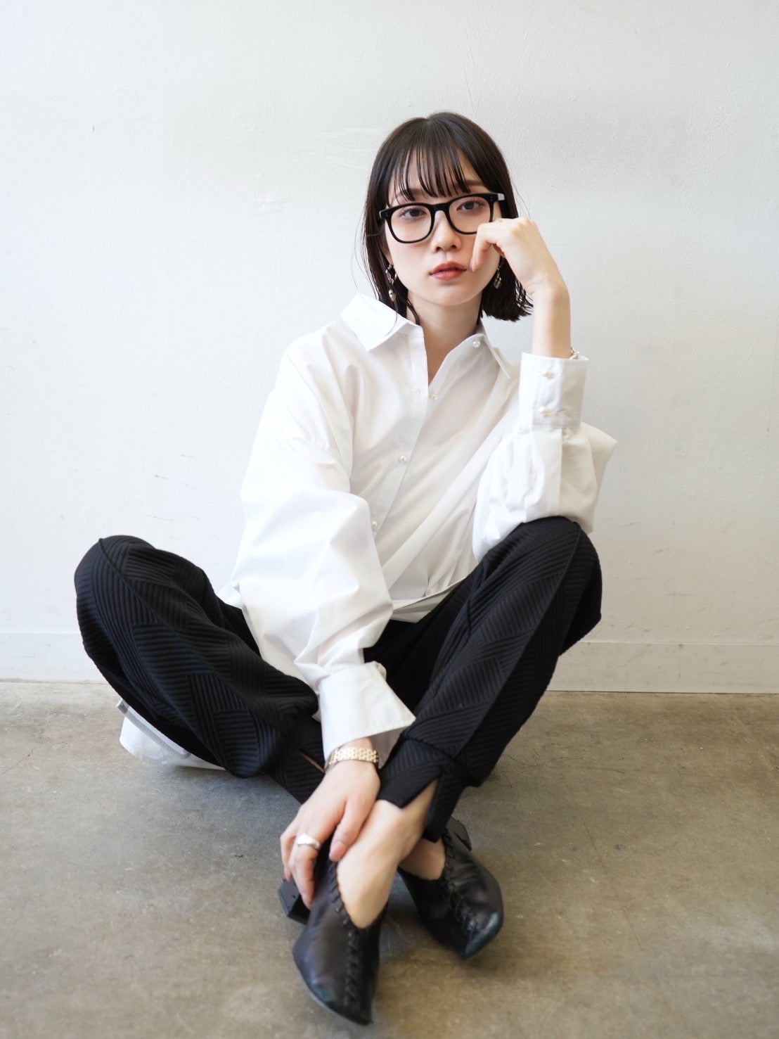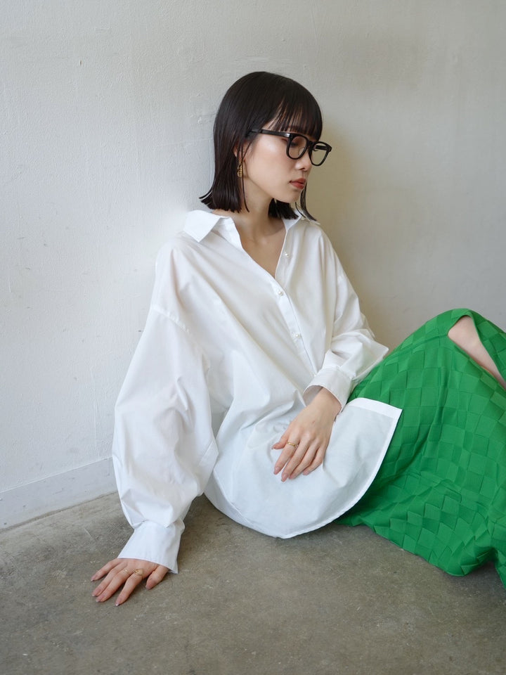 シンプルなオーバーサイズシャツもパールボタンなら、簡単にフェミニンなムードを取り込めます。袖にはタックが施されているので、たくし上げるとボリュームスリーブに早変わり。後ろはセンターボックス入りでメリハリのあるデザインに仕上がっていて、同時にフォーマルな雰囲気がプラスされています。ボタンアレンジしたり、羽織にしたりと、一枚でいろいろな着方をお楽しみいただけます。