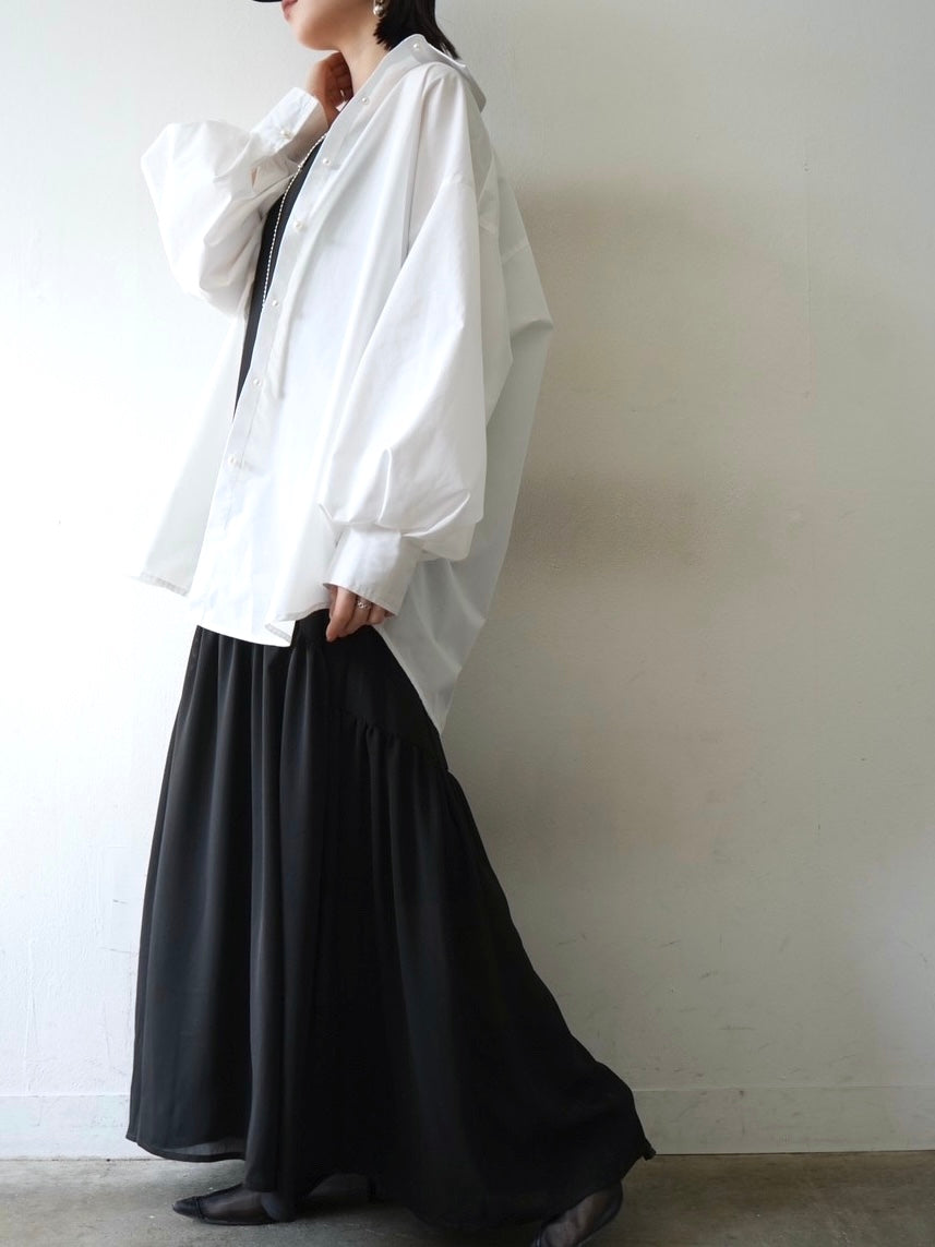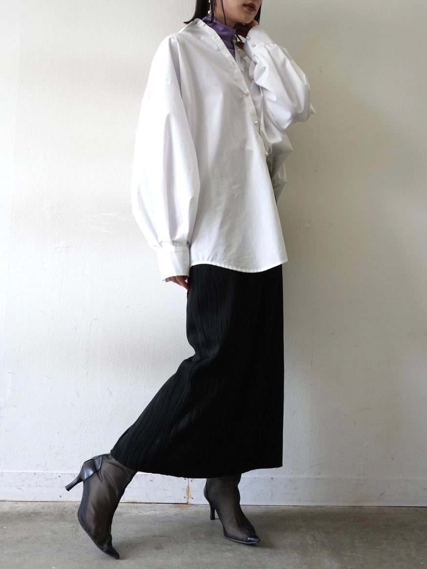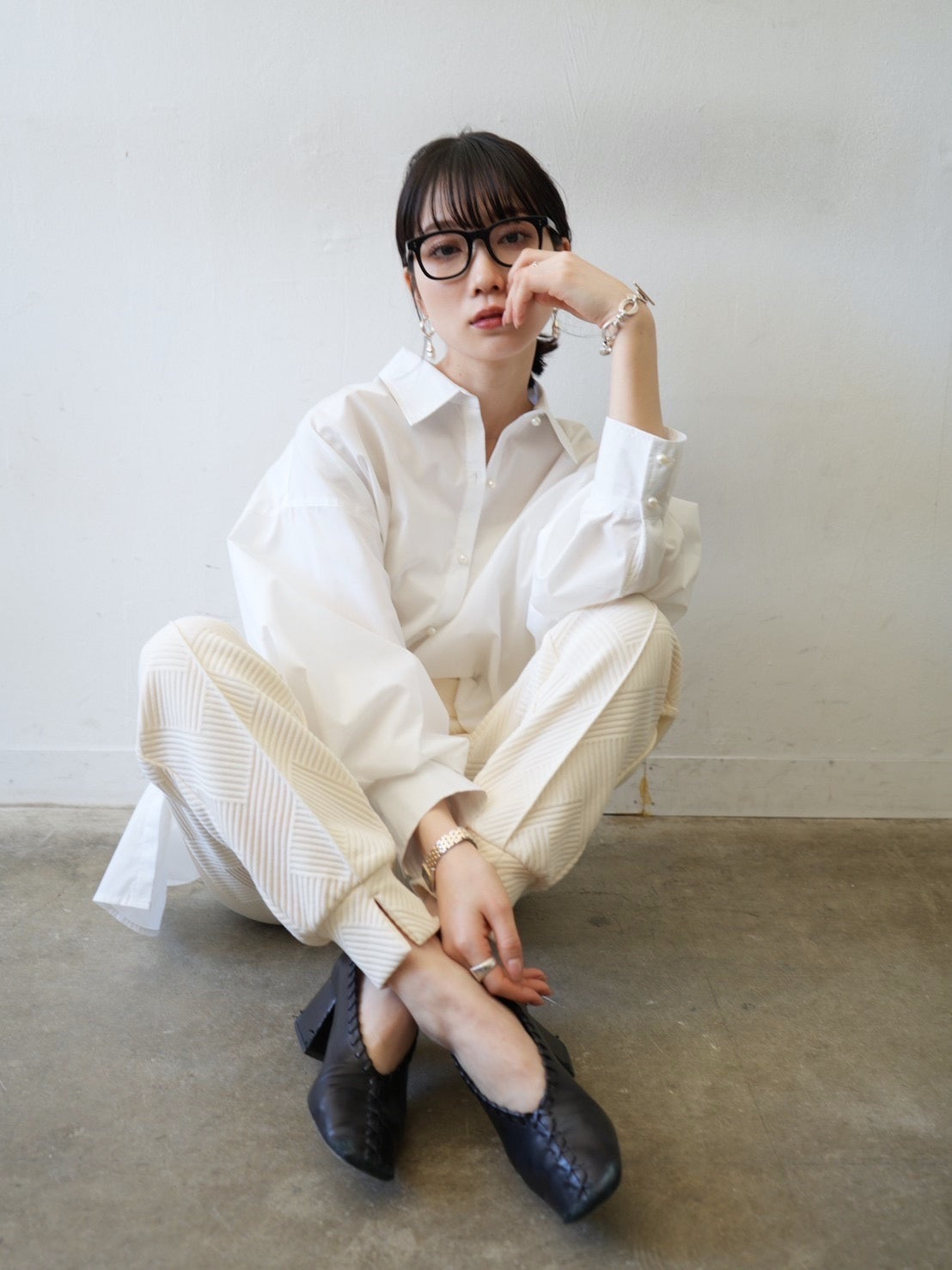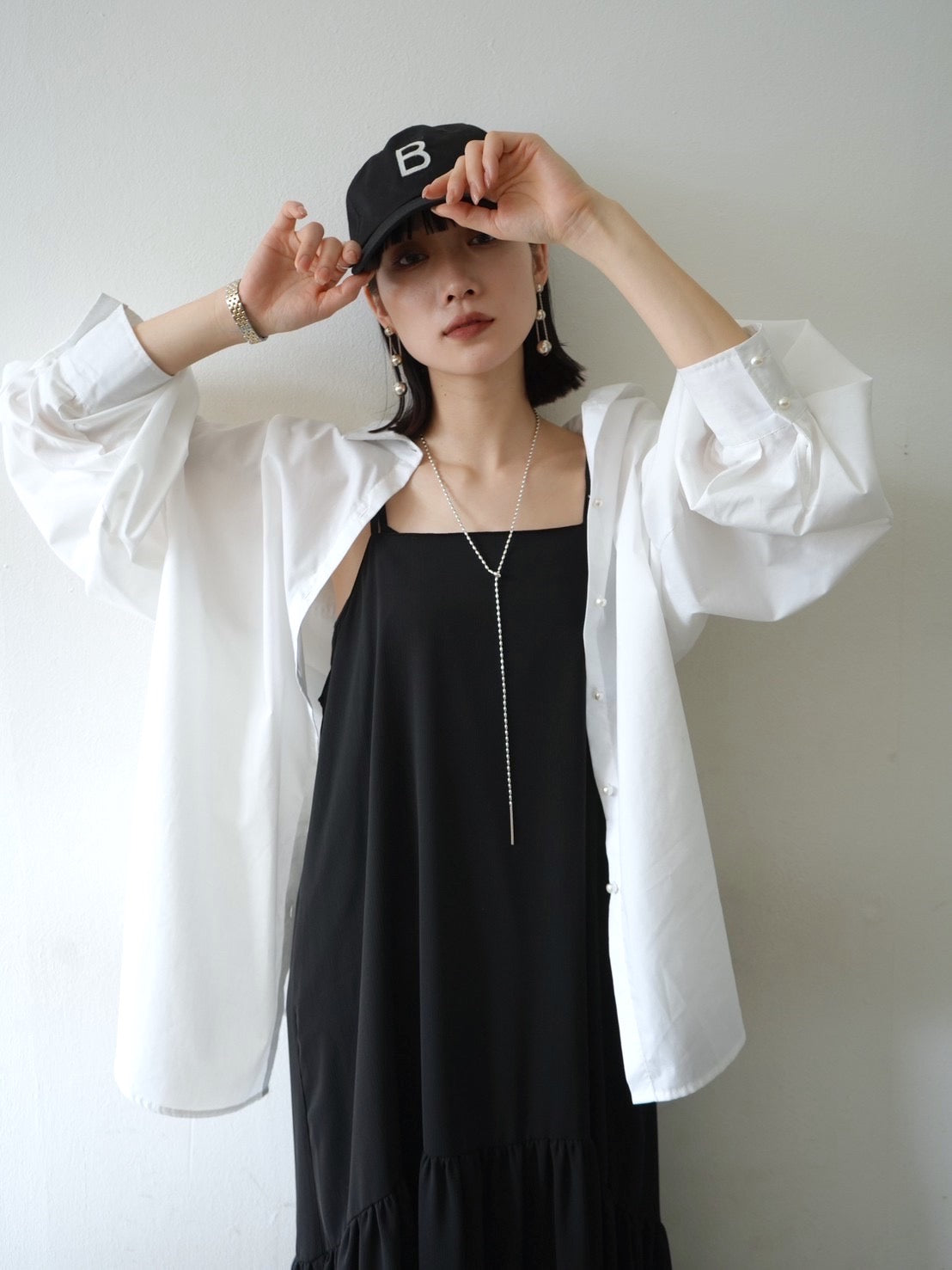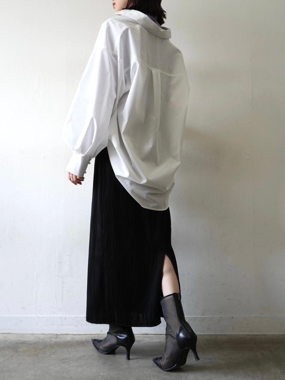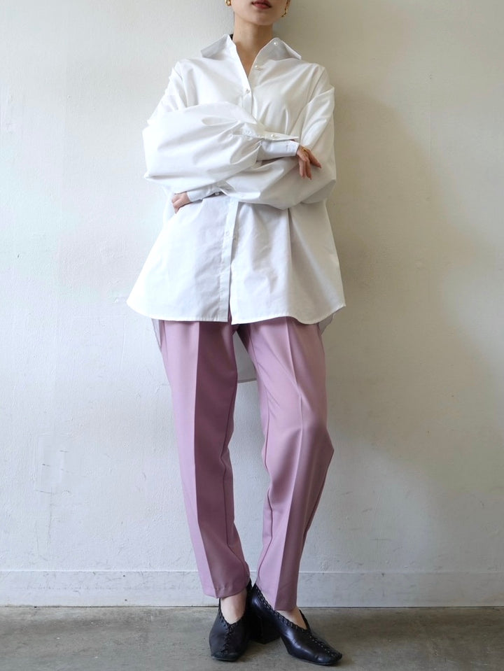 シンプルなオーバーサイズシャツもパールボタンなら、簡単にフェミニンなムードを取り込めます。袖にはタックが施されているので、たくし上げるとボリュームスリーブに早変わり。後ろはセンターボックス入りでメリハリのあるデザインに仕上がっていて、同時にフォーマルな雰囲気がプラスされています。ボタンアレンジしたり、羽織にしたりと、一枚でいろいろな着方をお楽しみいただけます。