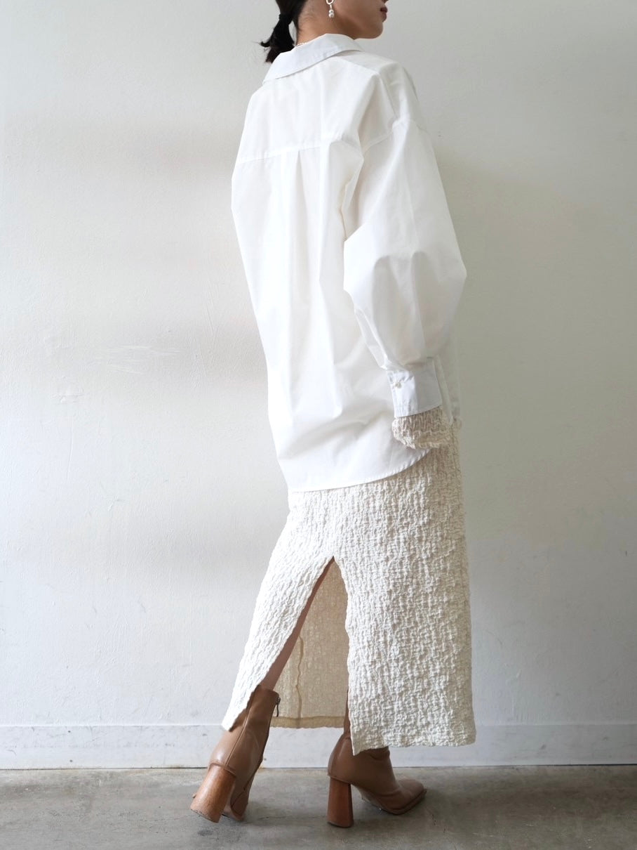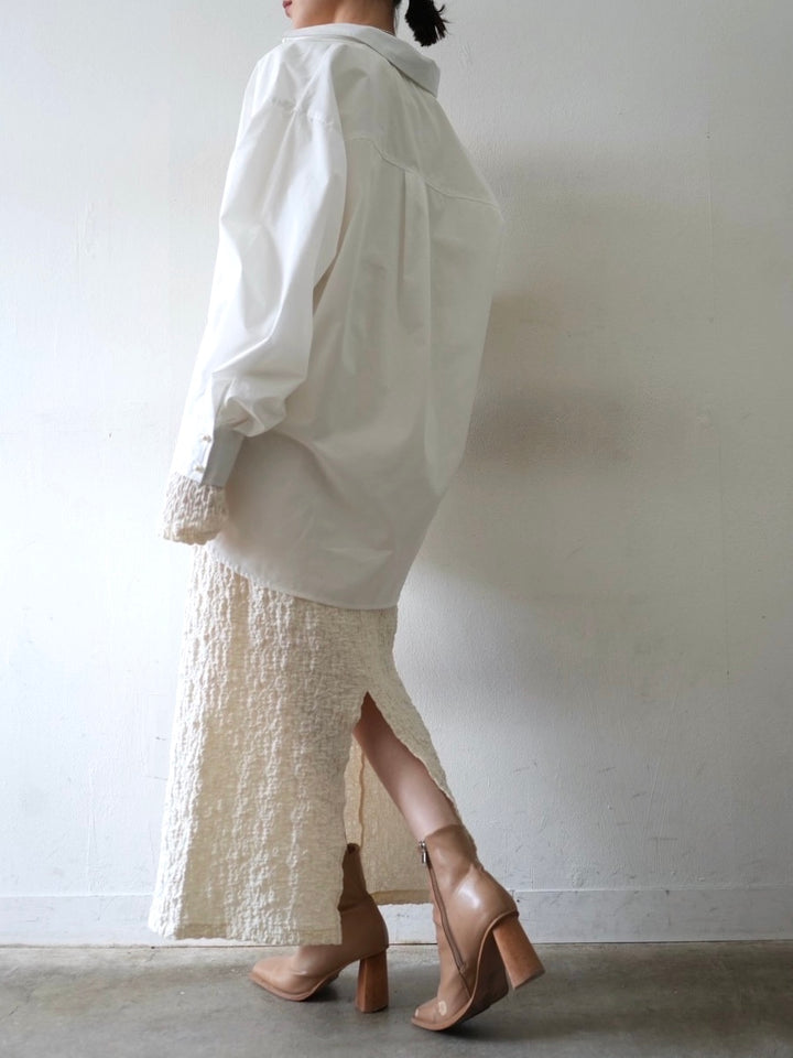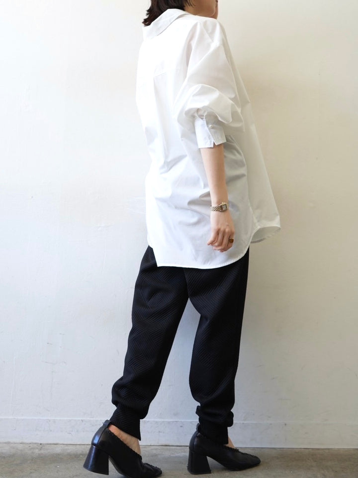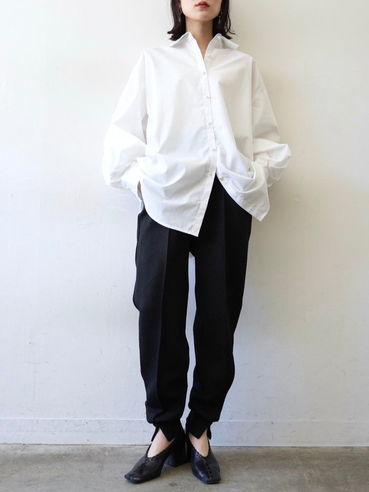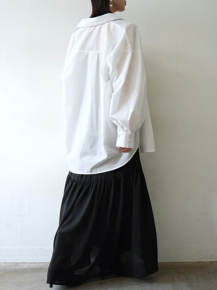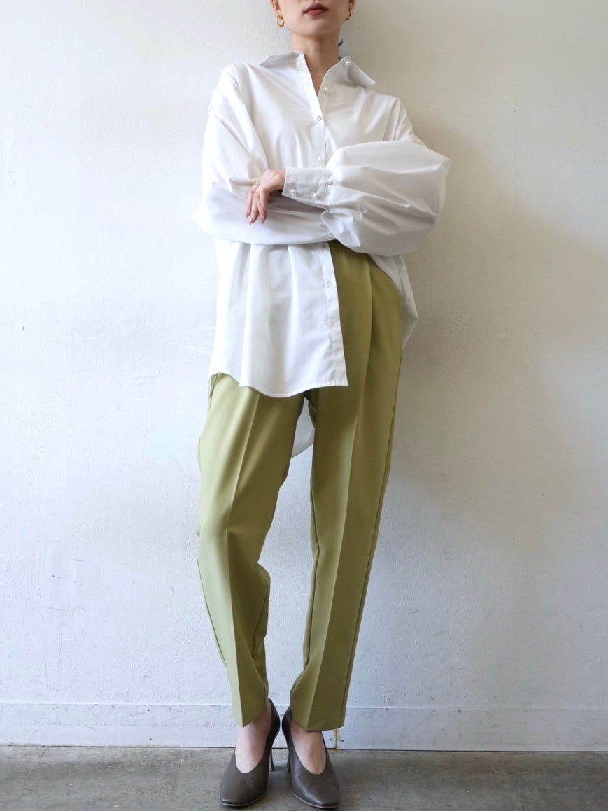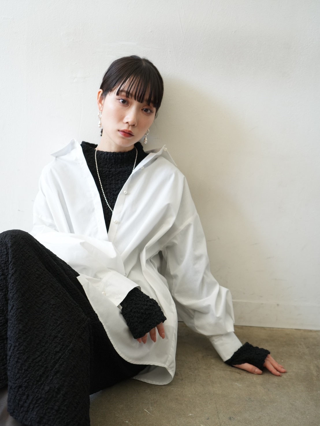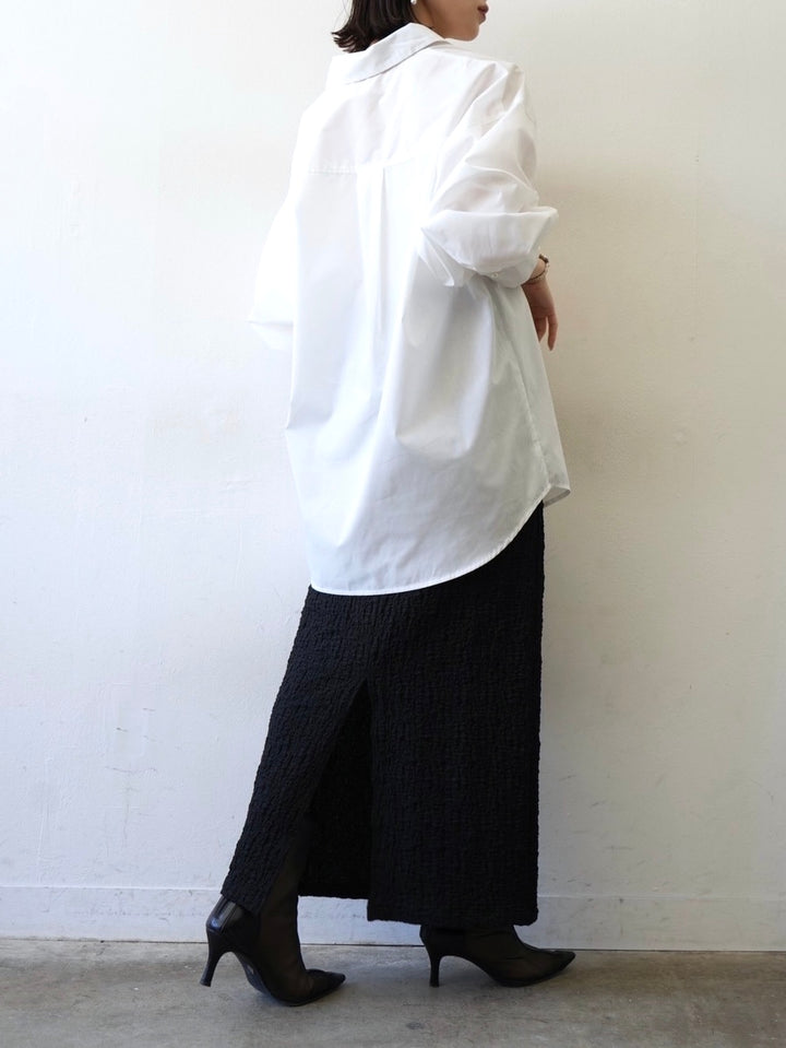 シンプルなオーバーサイズシャツもパールボタンなら、簡単にフェミニンなムードを取り込めます。袖にはタックが施されているので、たくし上げるとボリュームスリーブに早変わり。後ろはセンターボックス入りでメリハリのあるデザインに仕上がっていて、同時にフォーマルな雰囲気がプラスされています。ボタンアレンジしたり、羽織にしたりと、一枚でいろいろな着方をお楽しみいただけます。