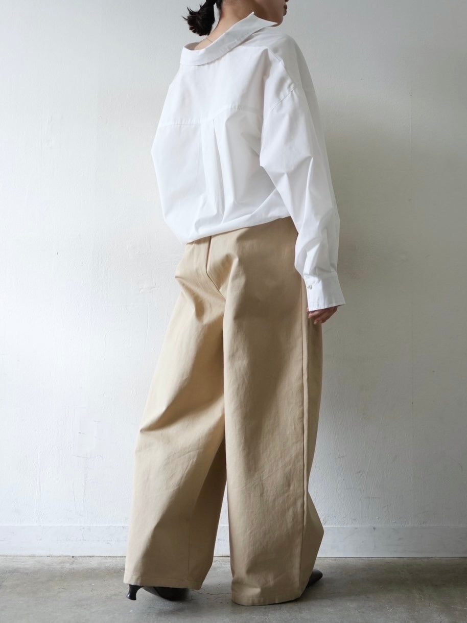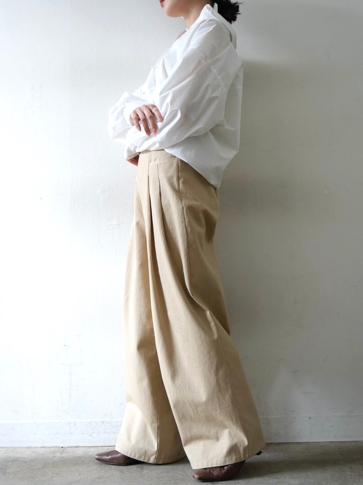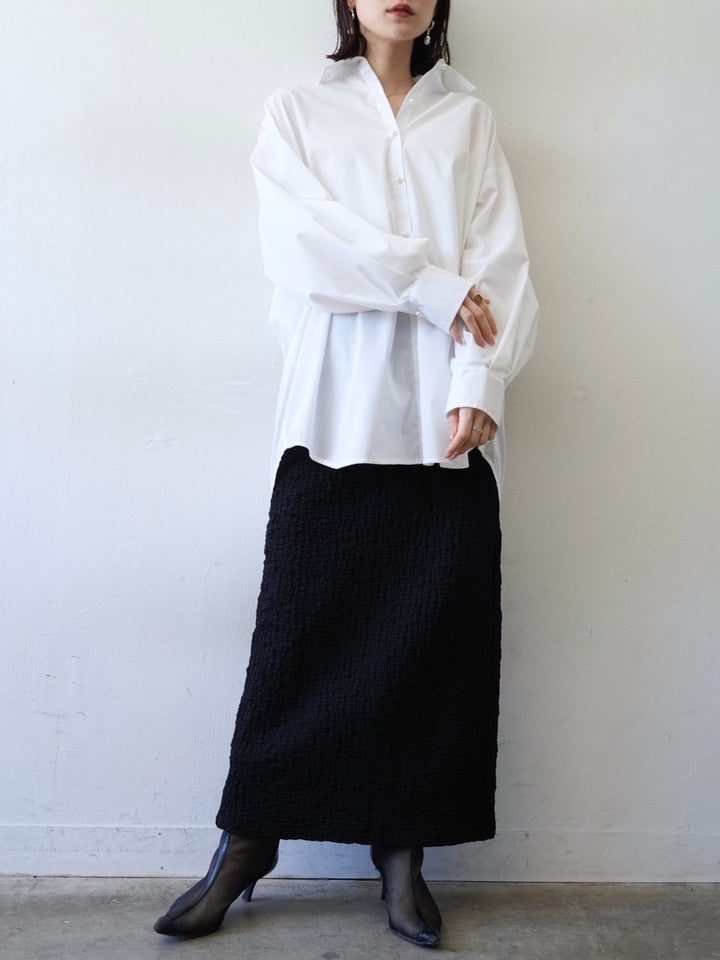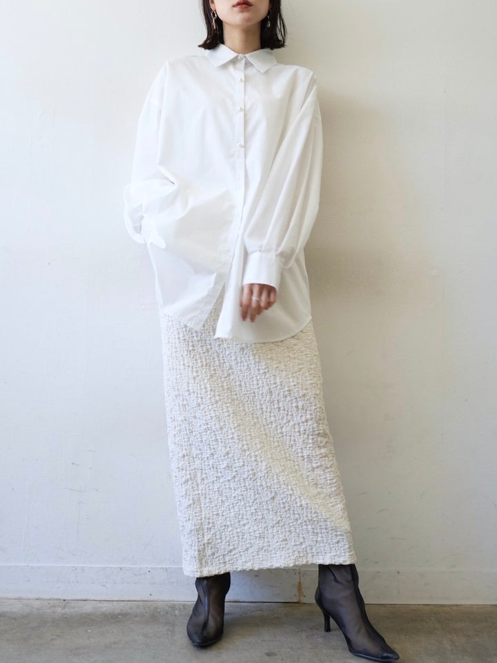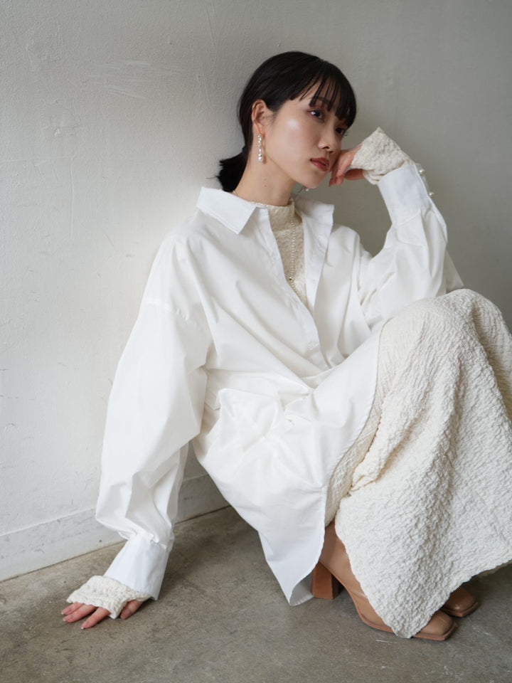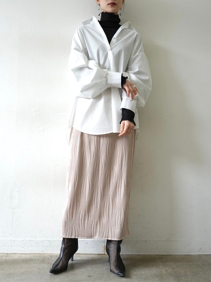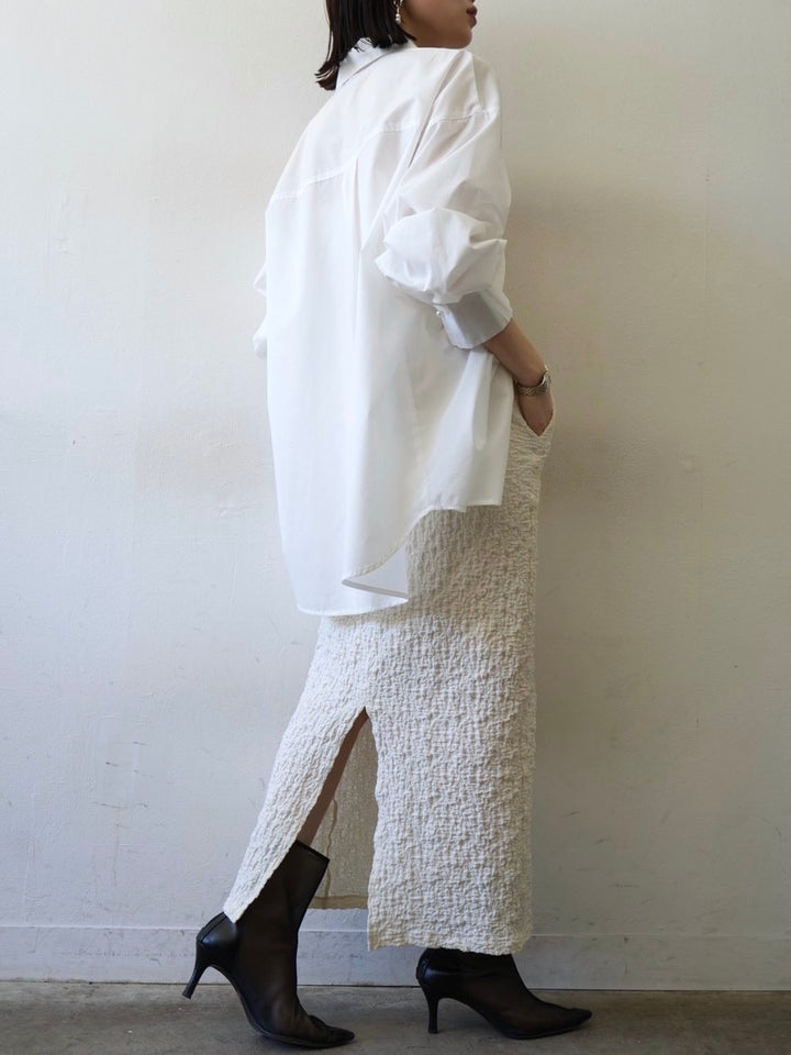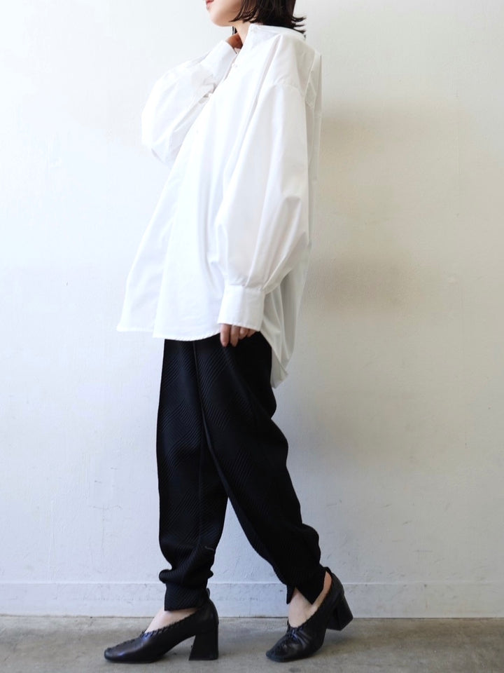 シンプルなオーバーサイズシャツもパールボタンなら、簡単にフェミニンなムードを取り込めます。袖にはタックが施されているので、たくし上げるとボリュームスリーブに早変わり。後ろはセンターボックス入りでメリハリのあるデザインに仕上がっていて、同時にフォーマルな雰囲気がプラスされています。ボタンアレンジしたり、羽織にしたりと、一枚でいろいろな着方をお楽しみいただけます。