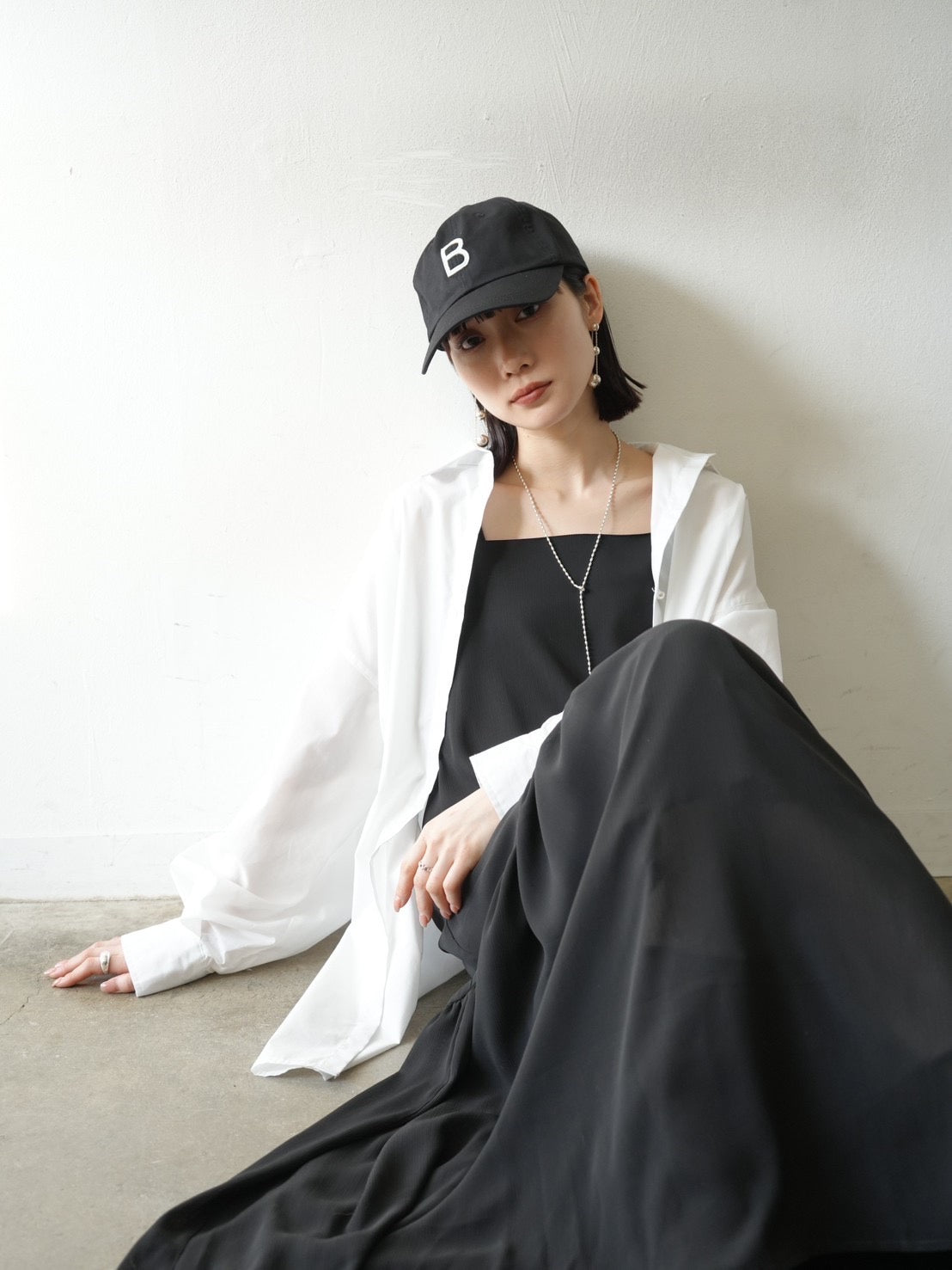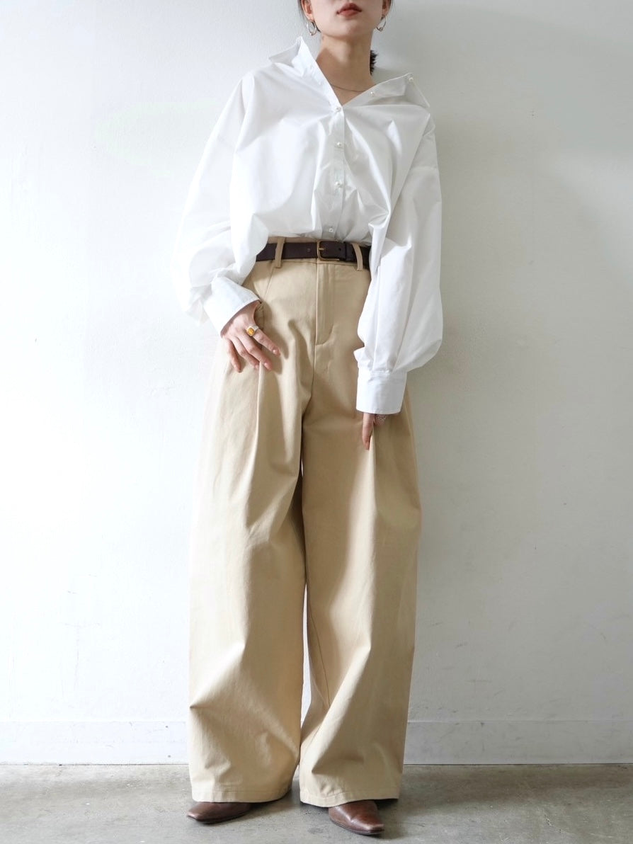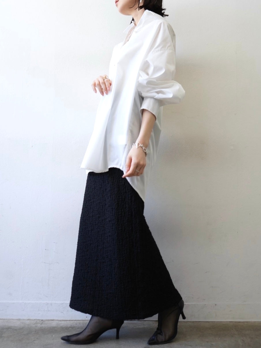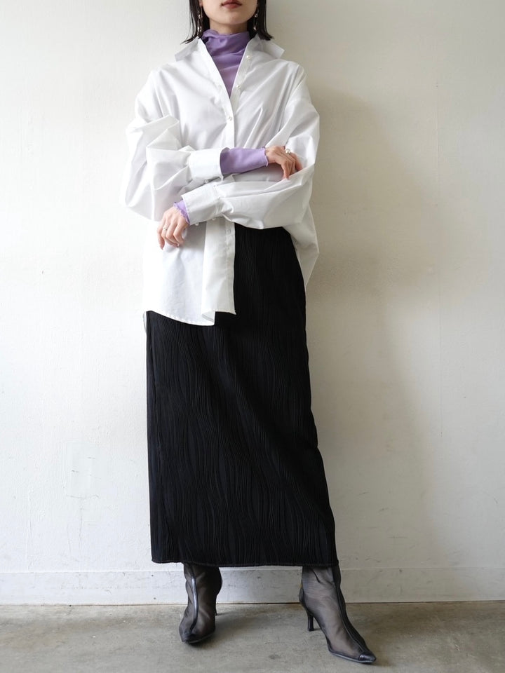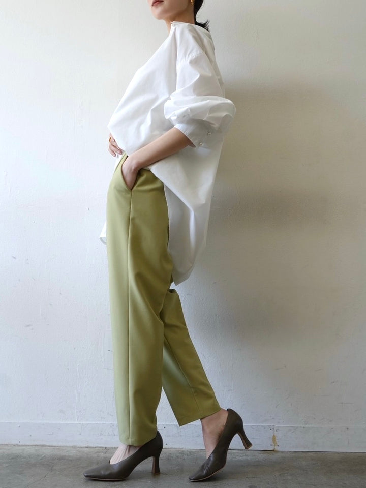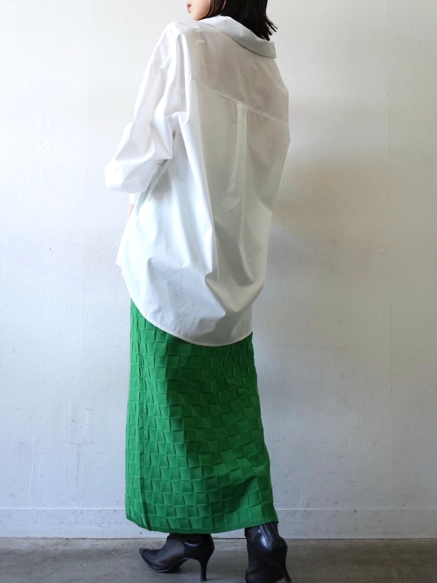 シンプルなオーバーサイズシャツもパールボタンなら、簡単にフェミニンなムードを取り込めます。袖にはタックが施されているので、たくし上げるとボリュームスリーブに早変わり。後ろはセンターボックス入りでメリハリのあるデザインに仕上がっていて、同時にフォーマルな雰囲気がプラスされています。ボタンアレンジしたり、羽織にしたりと、一枚でいろいろな着方をお楽しみいただけます。