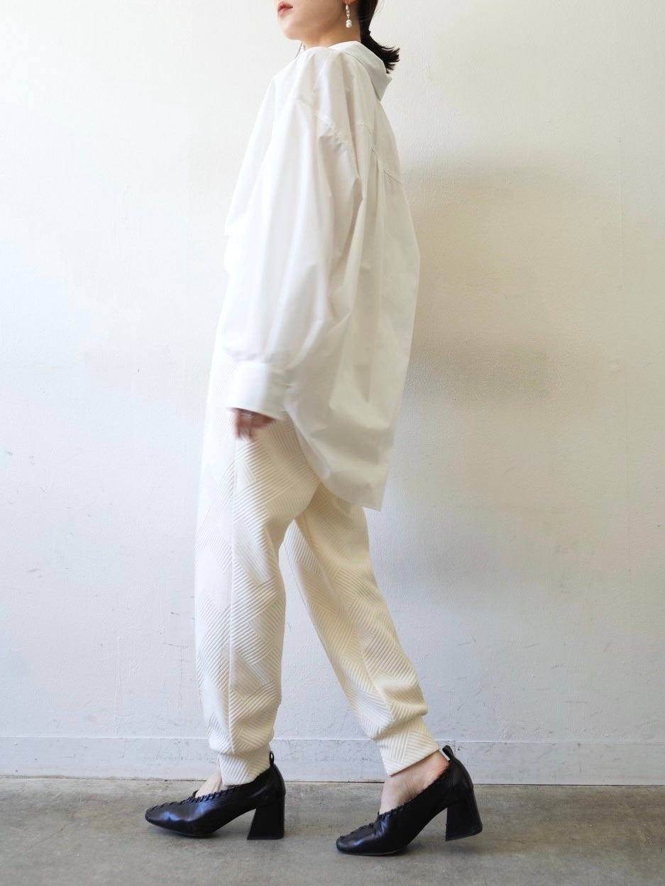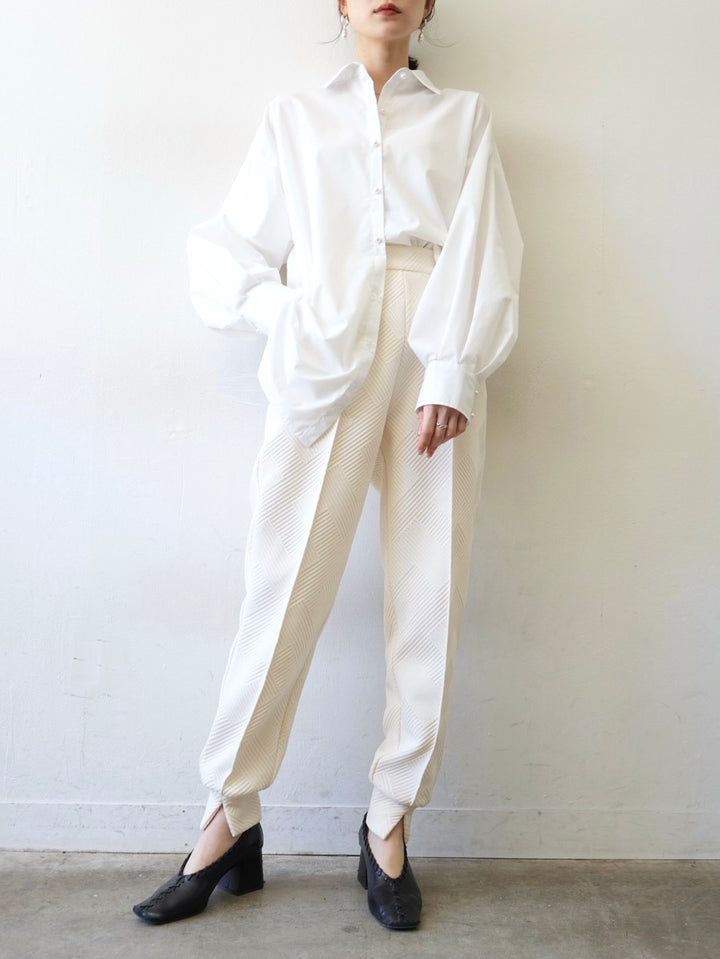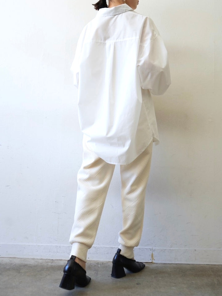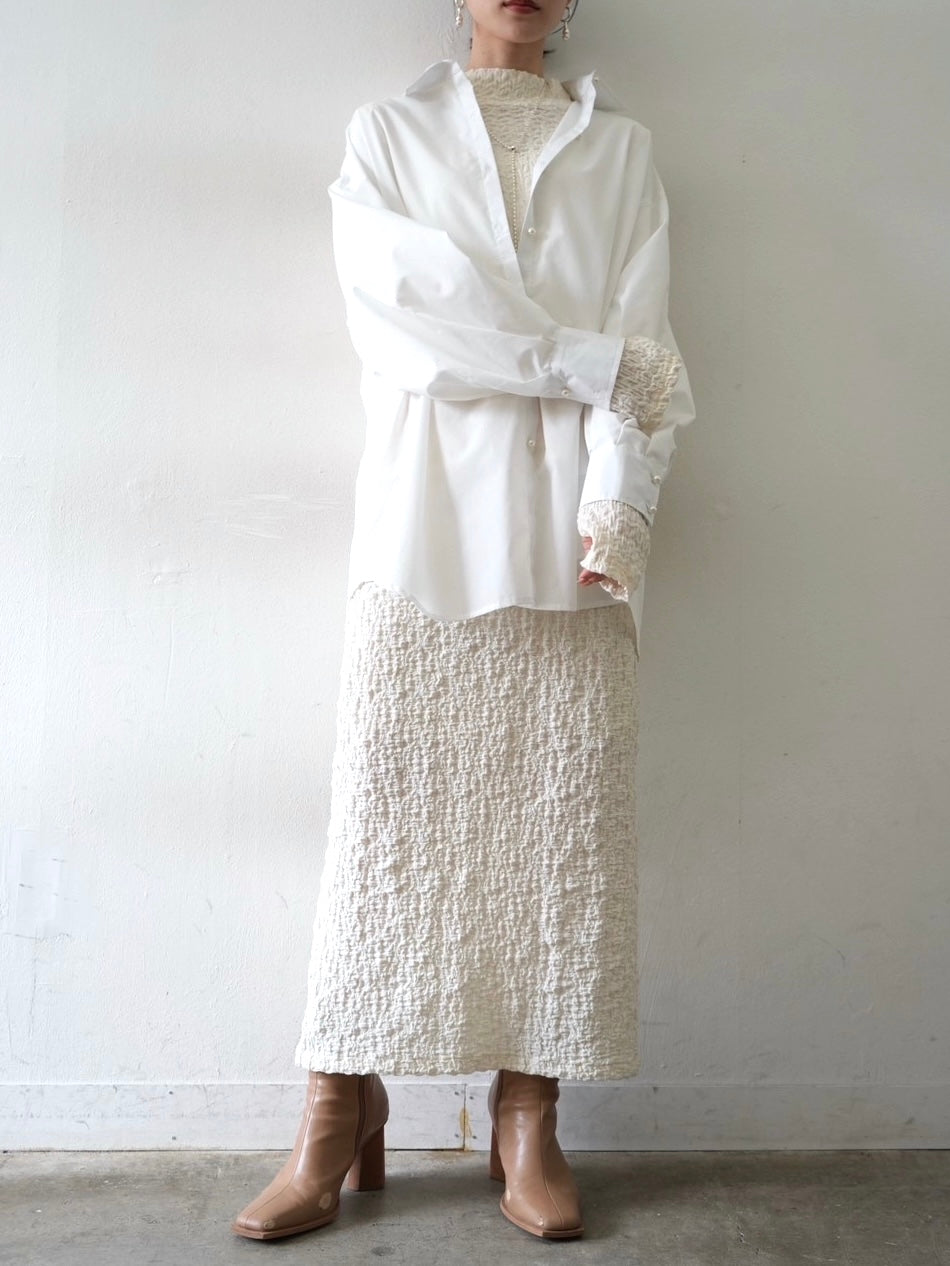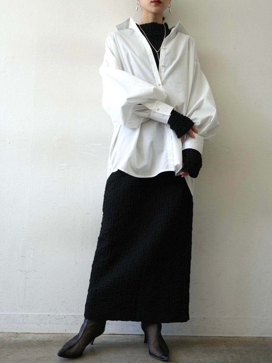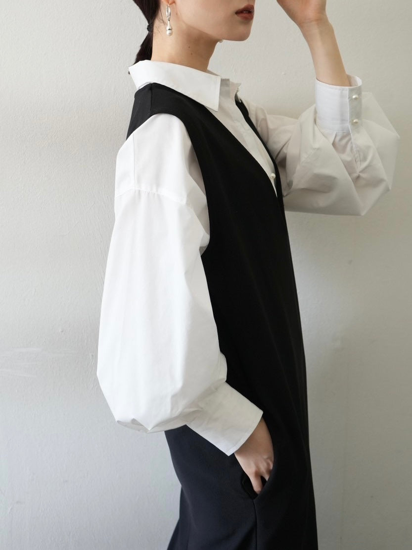 シンプルなオーバーサイズシャツもパールボタンなら、簡単にフェミニンなムードを取り込めます。袖にはタックが施されているので、たくし上げるとボリュームスリーブに早変わり。後ろはセンターボックス入りでメリハリのあるデザインに仕上がっていて、同時にフォーマルな雰囲気がプラスされています。ボタンアレンジしたり、羽織にしたりと、一枚でいろいろな着方をお楽しみいただけます。