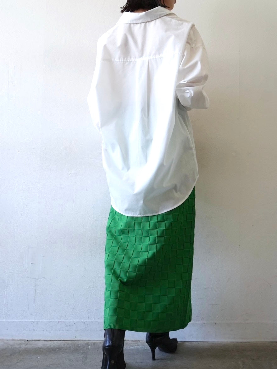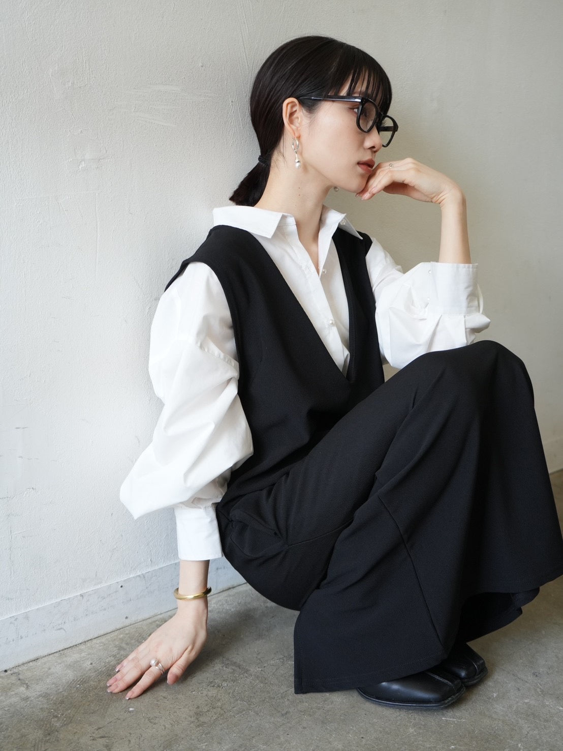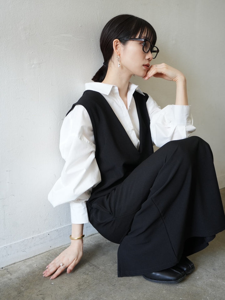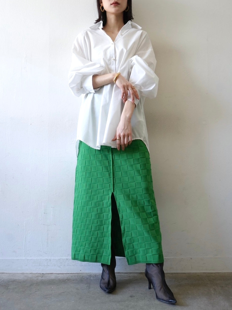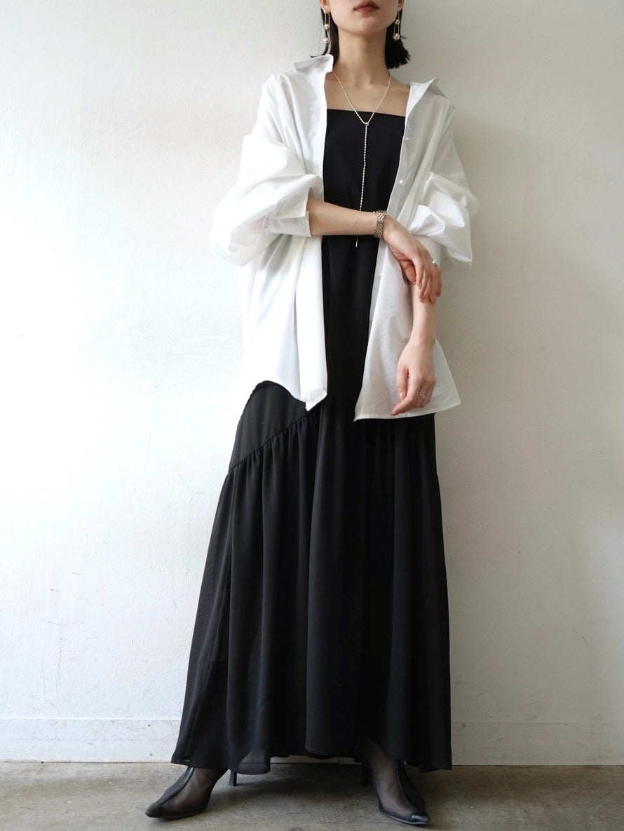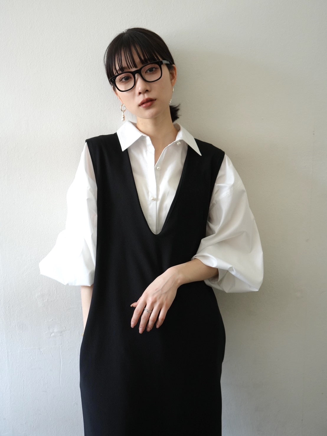 シンプルなオーバーサイズシャツもパールボタンなら、簡単にフェミニンなムードを取り込めます。袖にはタックが施されているので、たくし上げるとボリュームスリーブに早変わり。後ろはセンターボックス入りでメリハリのあるデザインに仕上がっていて、同時にフォーマルな雰囲気がプラスされています。ボタンアレンジしたり、羽織にしたりと、一枚でいろいろな着方をお楽しみいただけます。