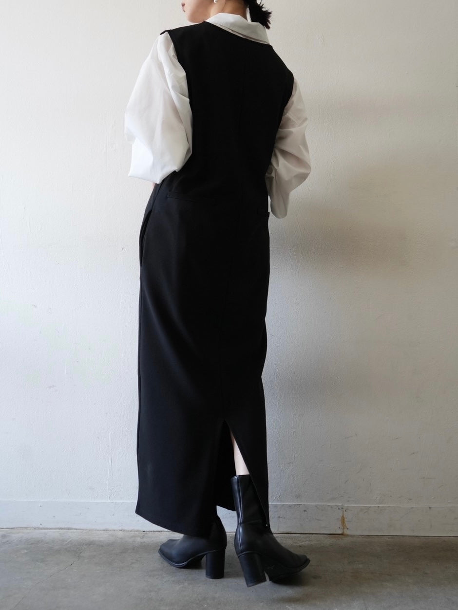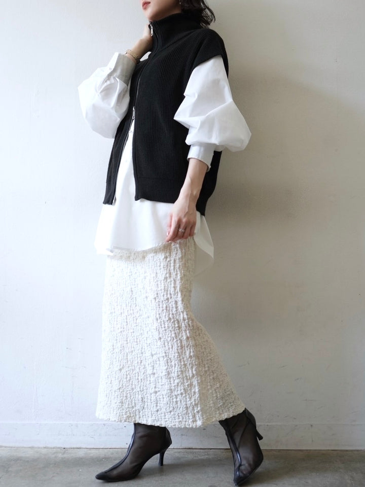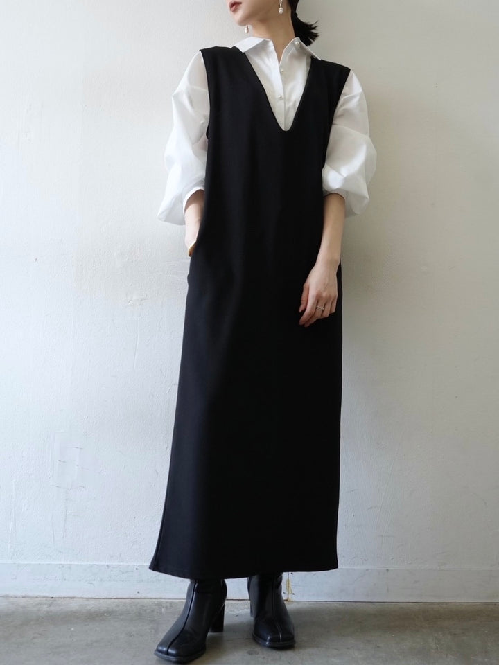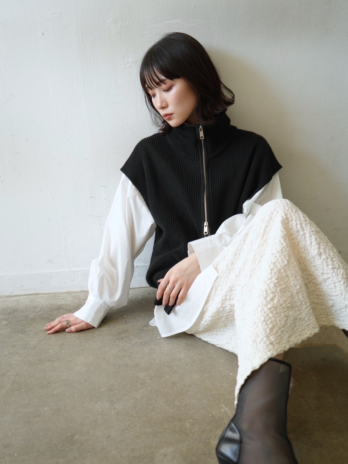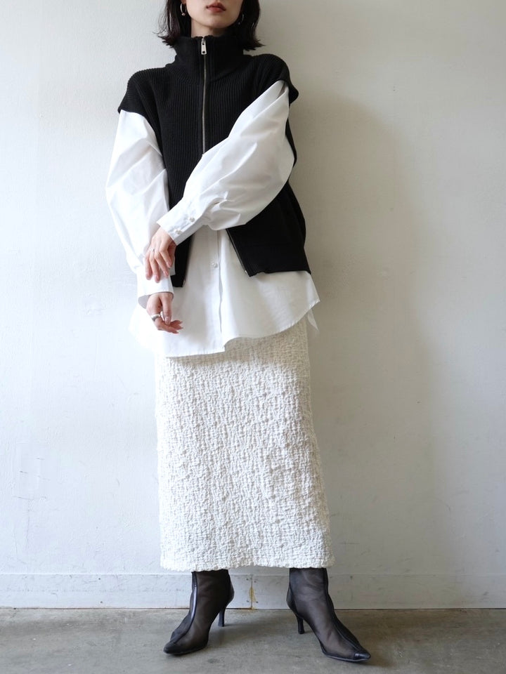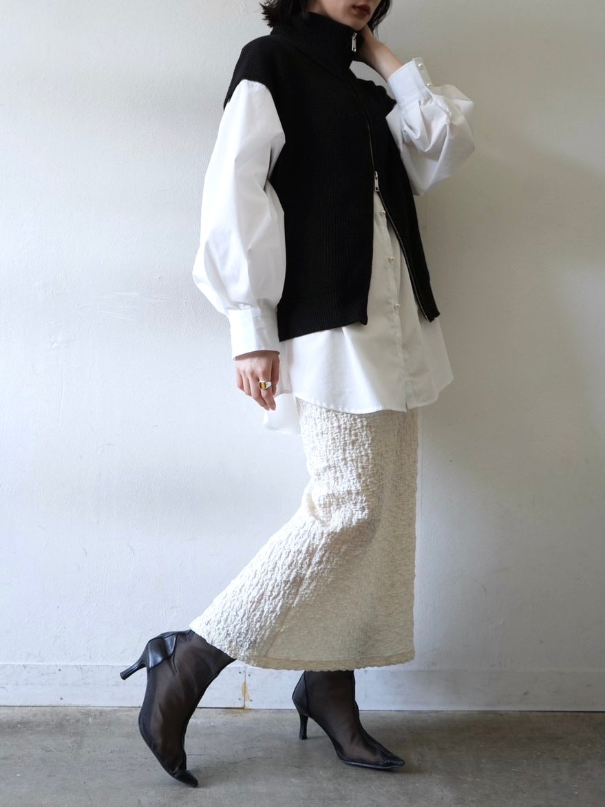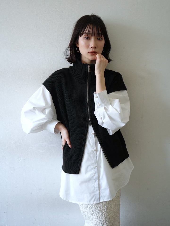 シンプルなオーバーサイズシャツもパールボタンなら、簡単にフェミニンなムードを取り込めます。袖にはタックが施されているので、たくし上げるとボリュームスリーブに早変わり。後ろはセンターボックス入りでメリハリのあるデザインに仕上がっていて、同時にフォーマルな雰囲気がプラスされています。ボタンアレンジしたり、羽織にしたりと、一枚でいろいろな着方をお楽しみいただけます。