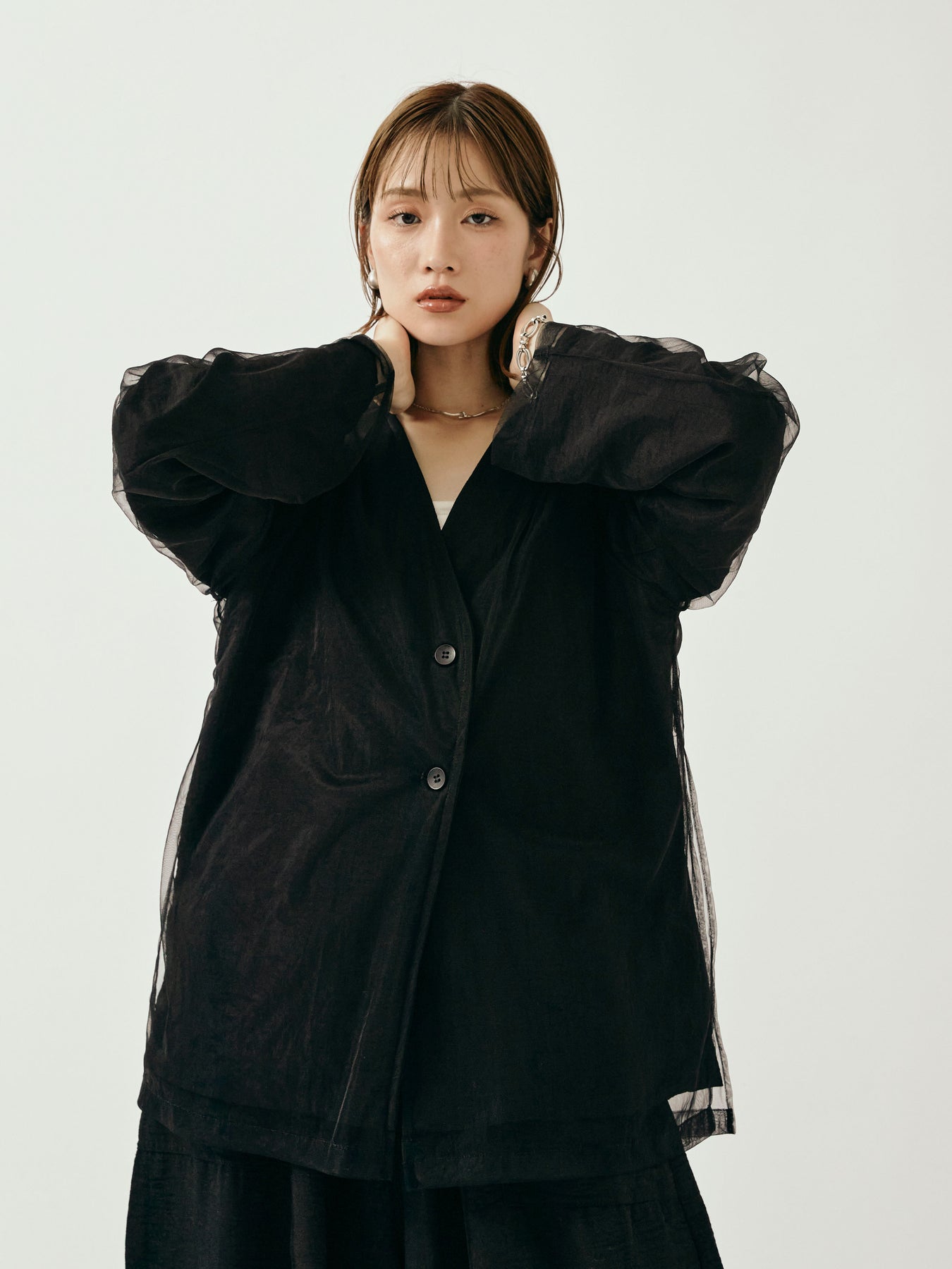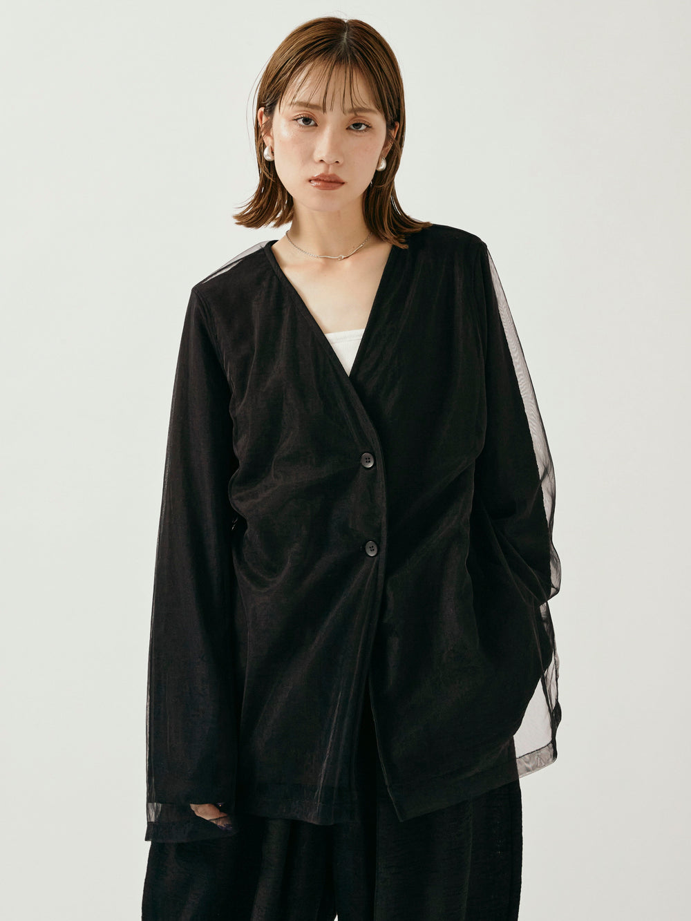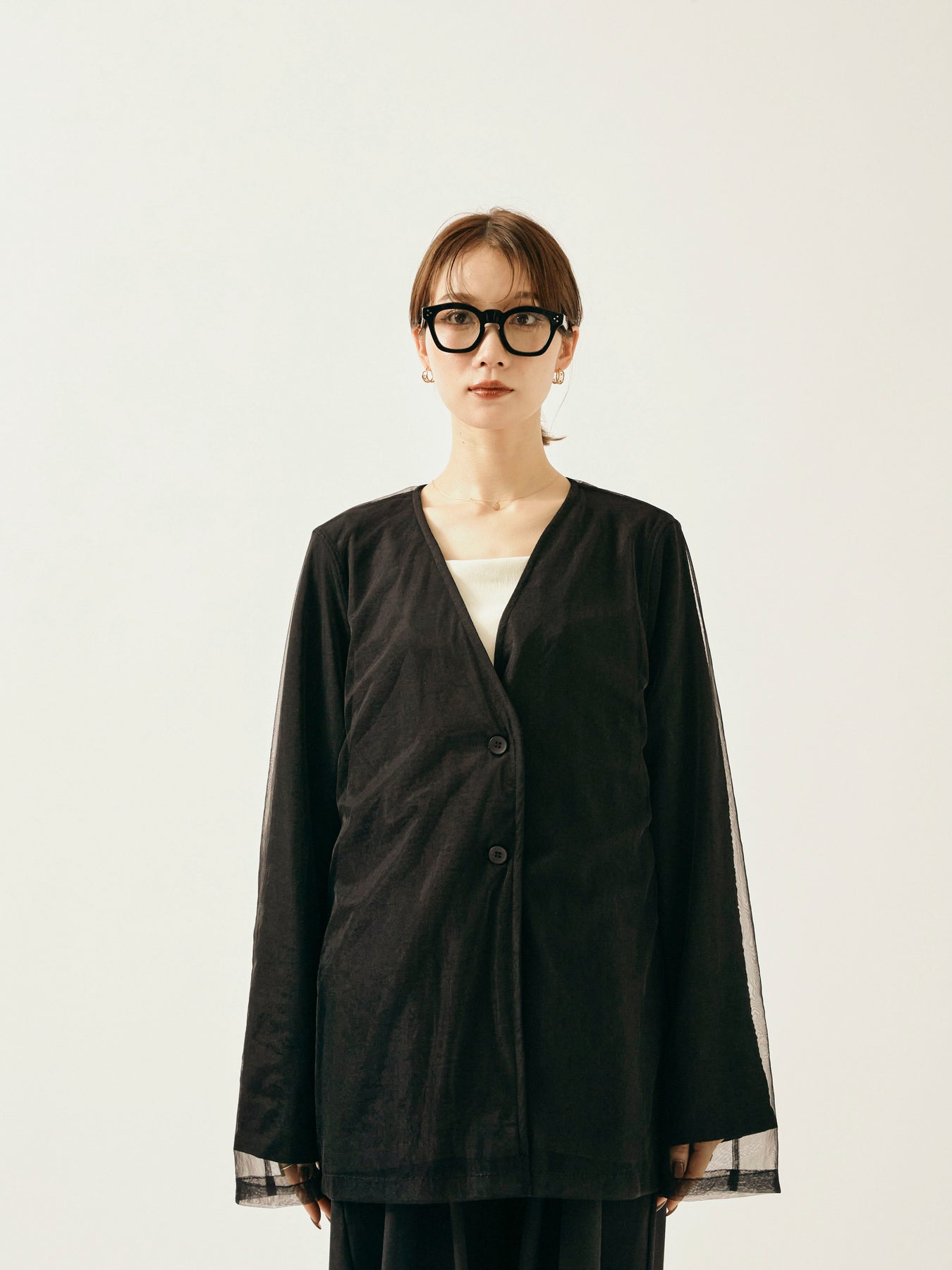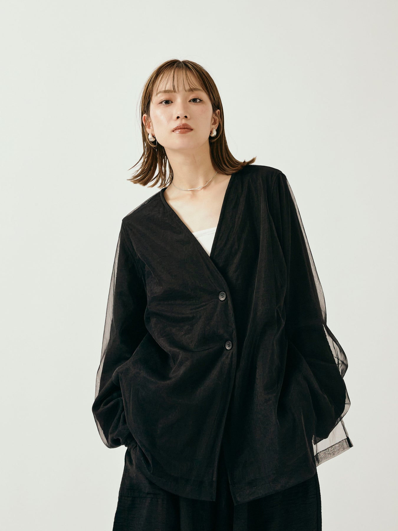 ふんわりと重ねたチュールが目を引く、軽やかなVネックジャケット。 程よくシアーな素材感が、春夏の羽織りとして抜け感のあるスタイリングを叶えます。 シンプルながらも、異素材のレイヤードデザインで奥行きのある印象に。 Vネック仕様で顔まわりもすっきりと見せつつ、着回しやすい万能な一着。 デニムやワンピースにさらっと羽織るだけで、スタイリングが格上げされるアイテムです。 ※ボトムス、キャミソール(インナー)以外の商品は一律でインナーは付属していません。