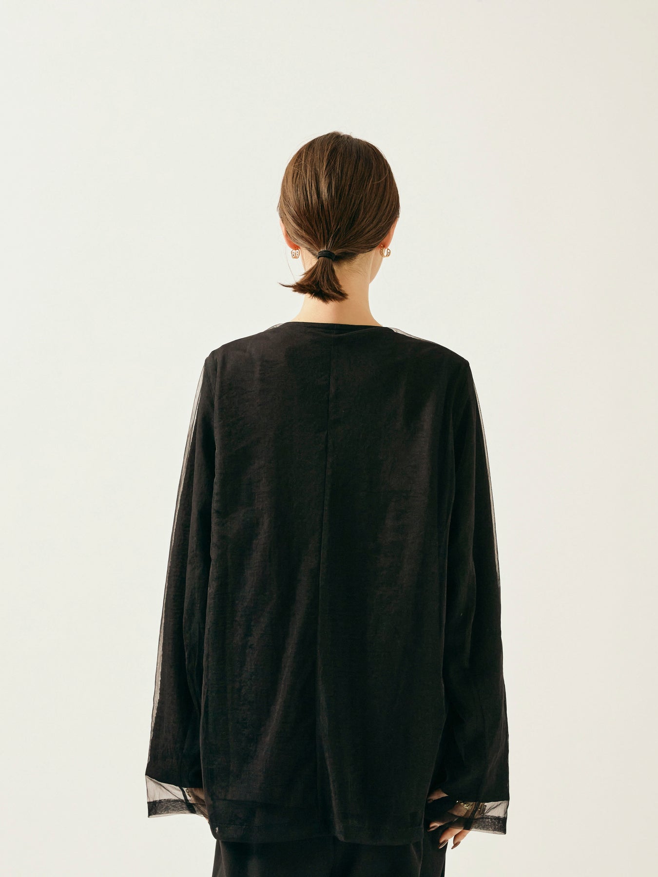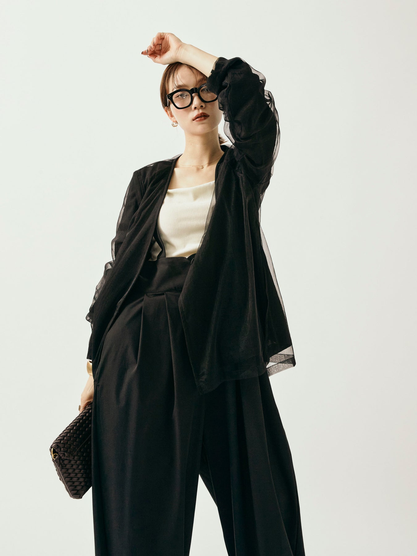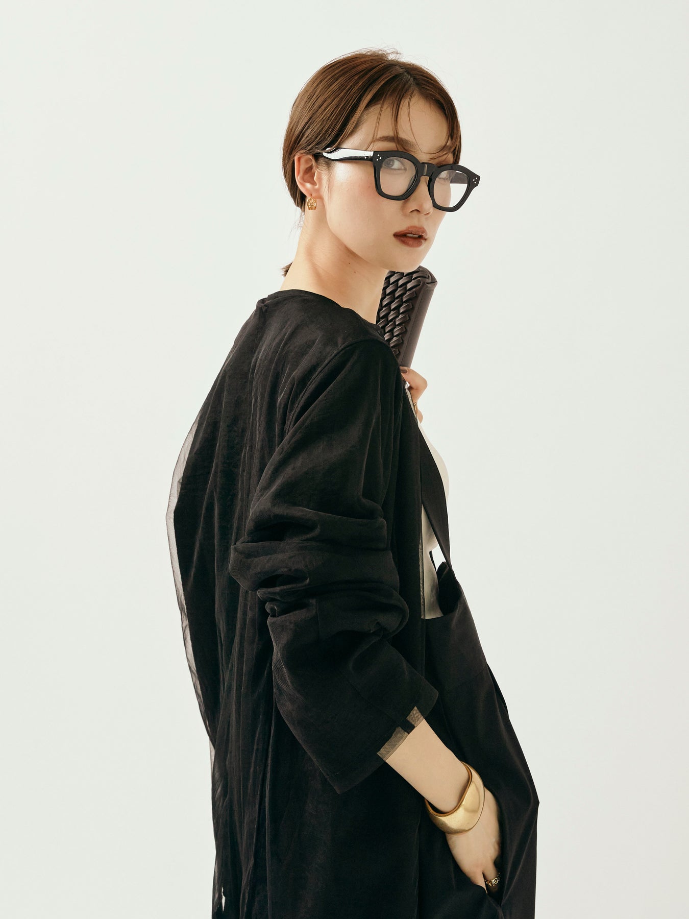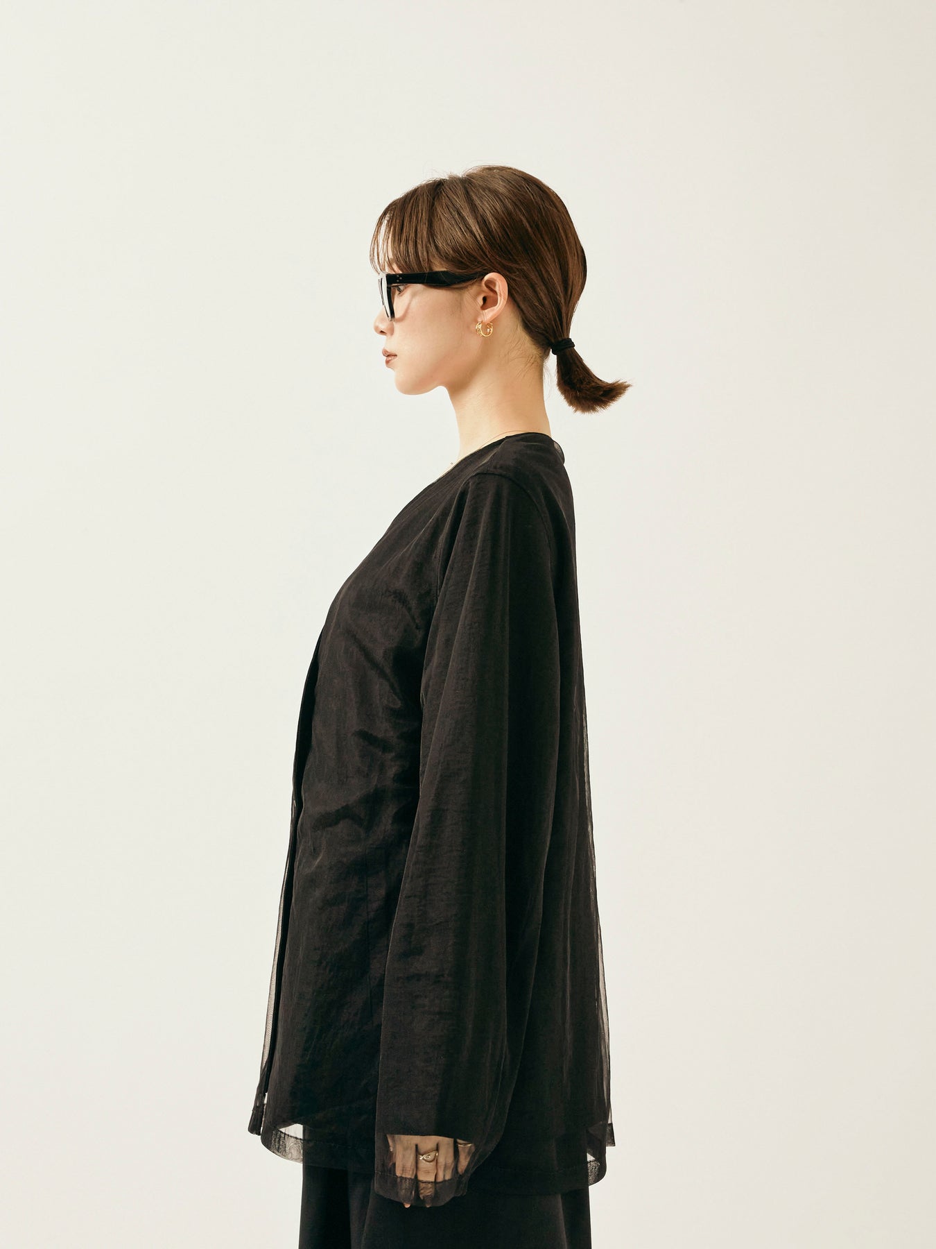 ふんわりと重ねたチュールが目を引く、軽やかなVネックジャケット。 程よくシアーな素材感が、春夏の羽織りとして抜け感のあるスタイリングを叶えます。 シンプルながらも、異素材のレイヤードデザインで奥行きのある印象に。 Vネック仕様で顔まわりもすっきりと見せつつ、着回しやすい万能な一着。 デニムやワンピースにさらっと羽織るだけで、スタイリングが格上げされるアイテムです。 ※ボトムス、キャミソール(インナー)以外の商品は一律でインナーは付属していません。