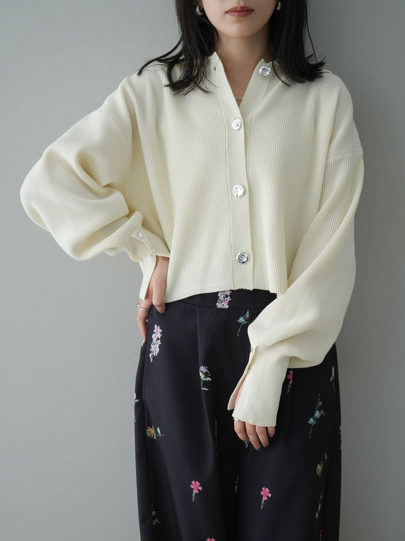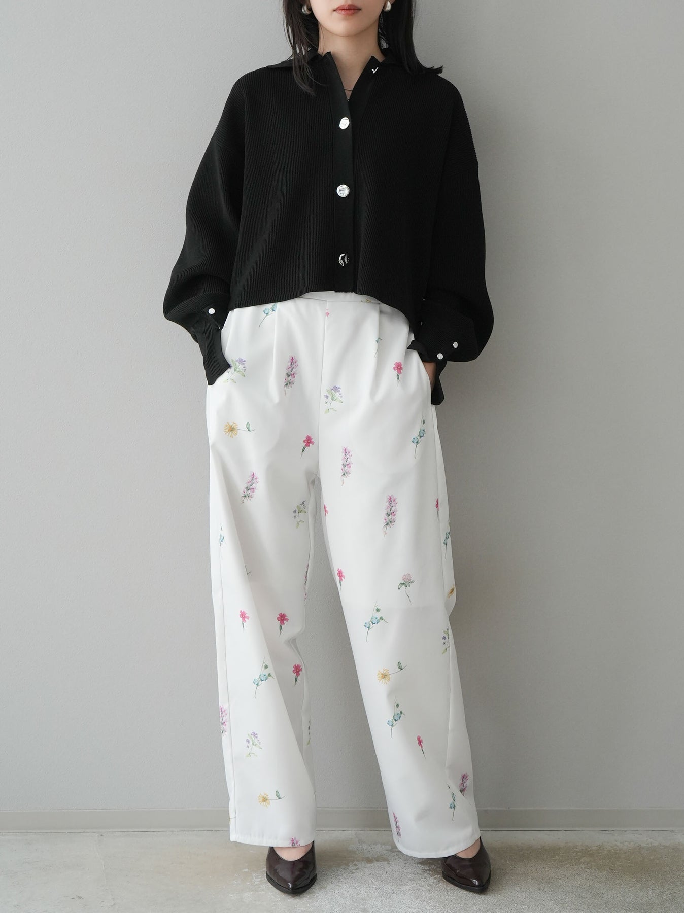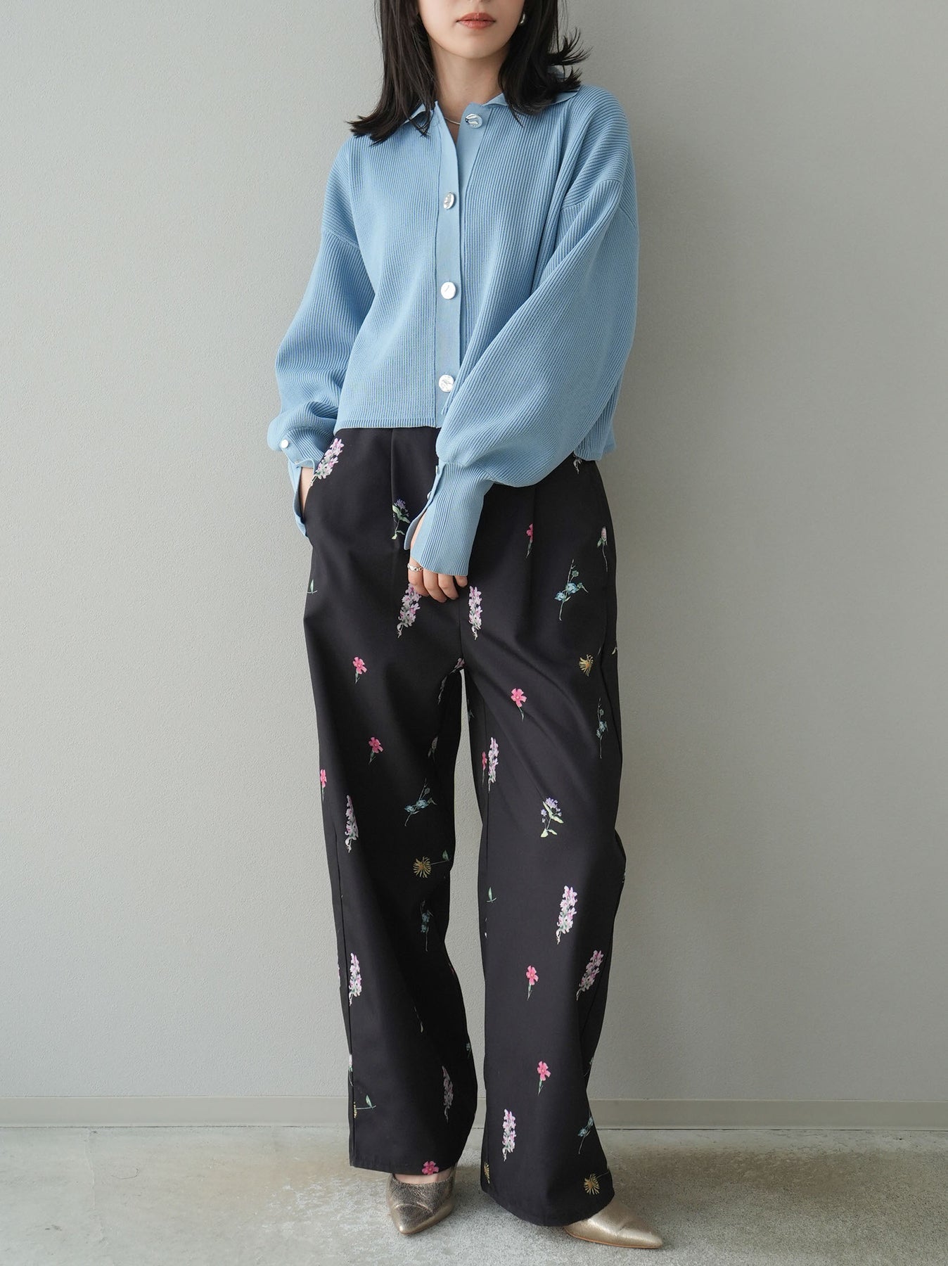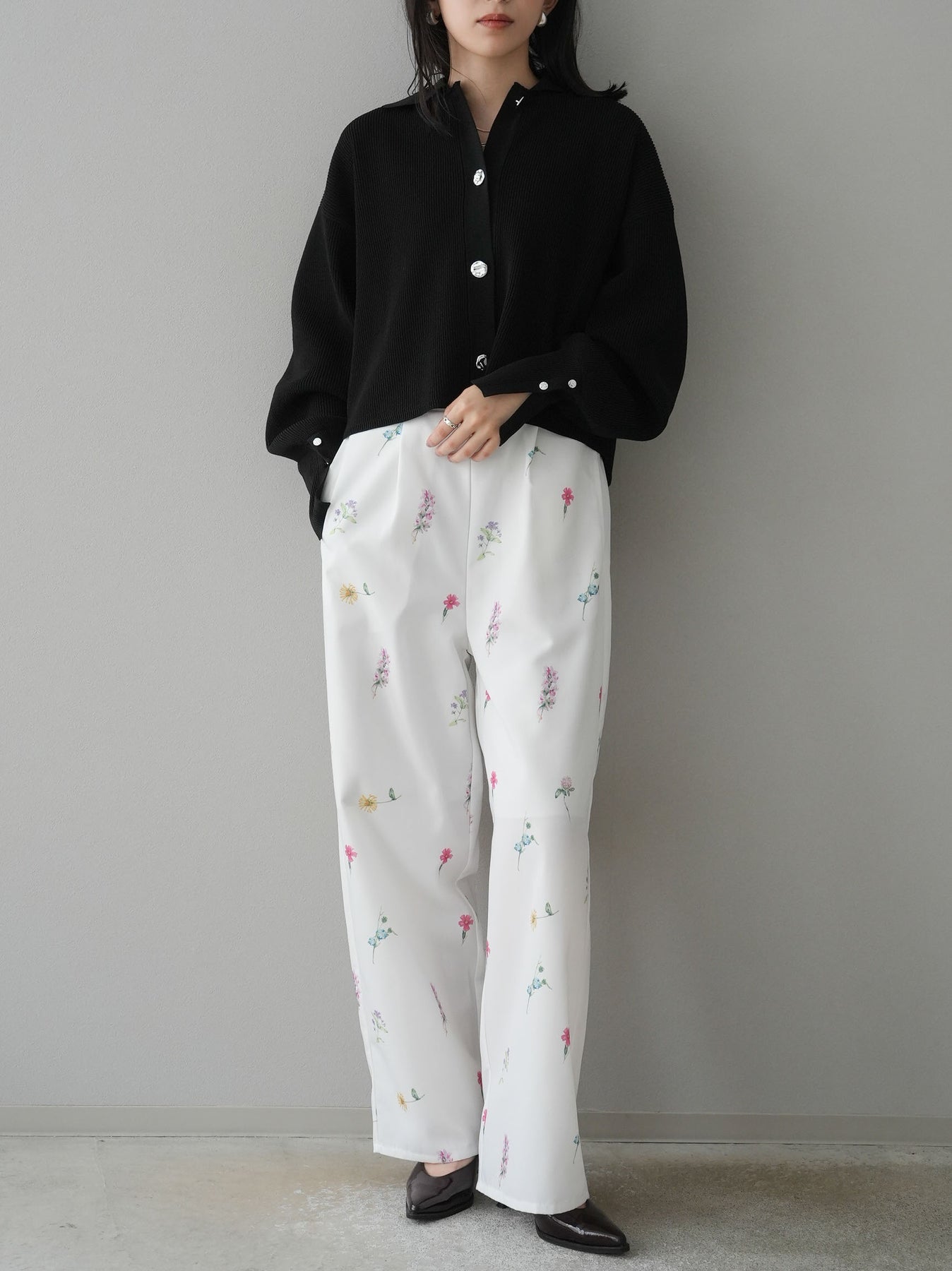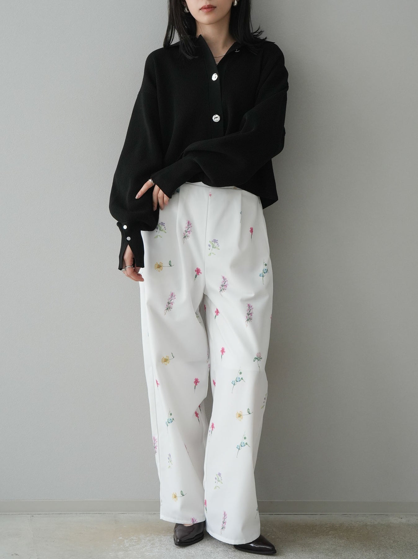 [SET]ボリュームスリーブポロニットカーディガン+フラワーアートプリントタックパンツ(2set)