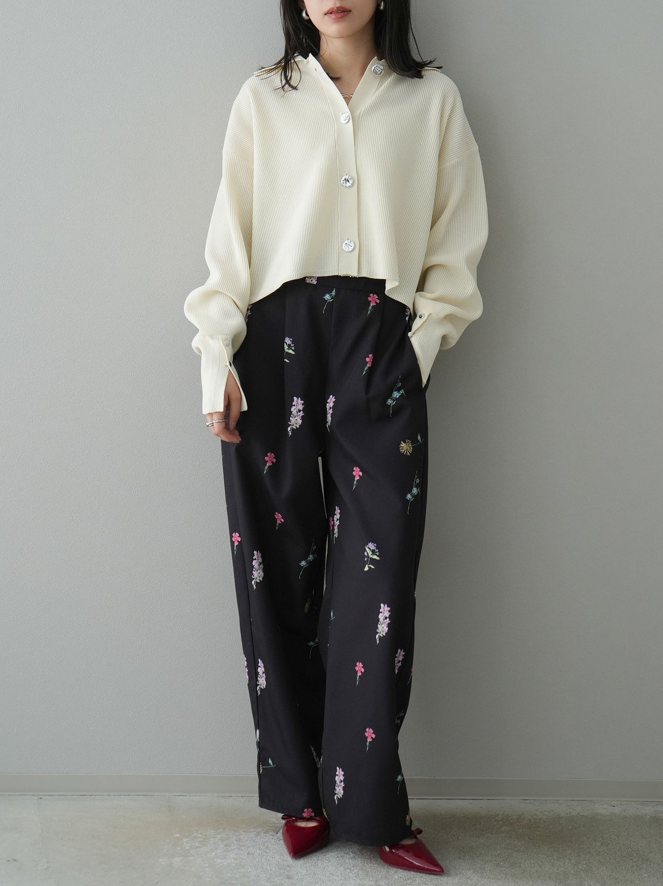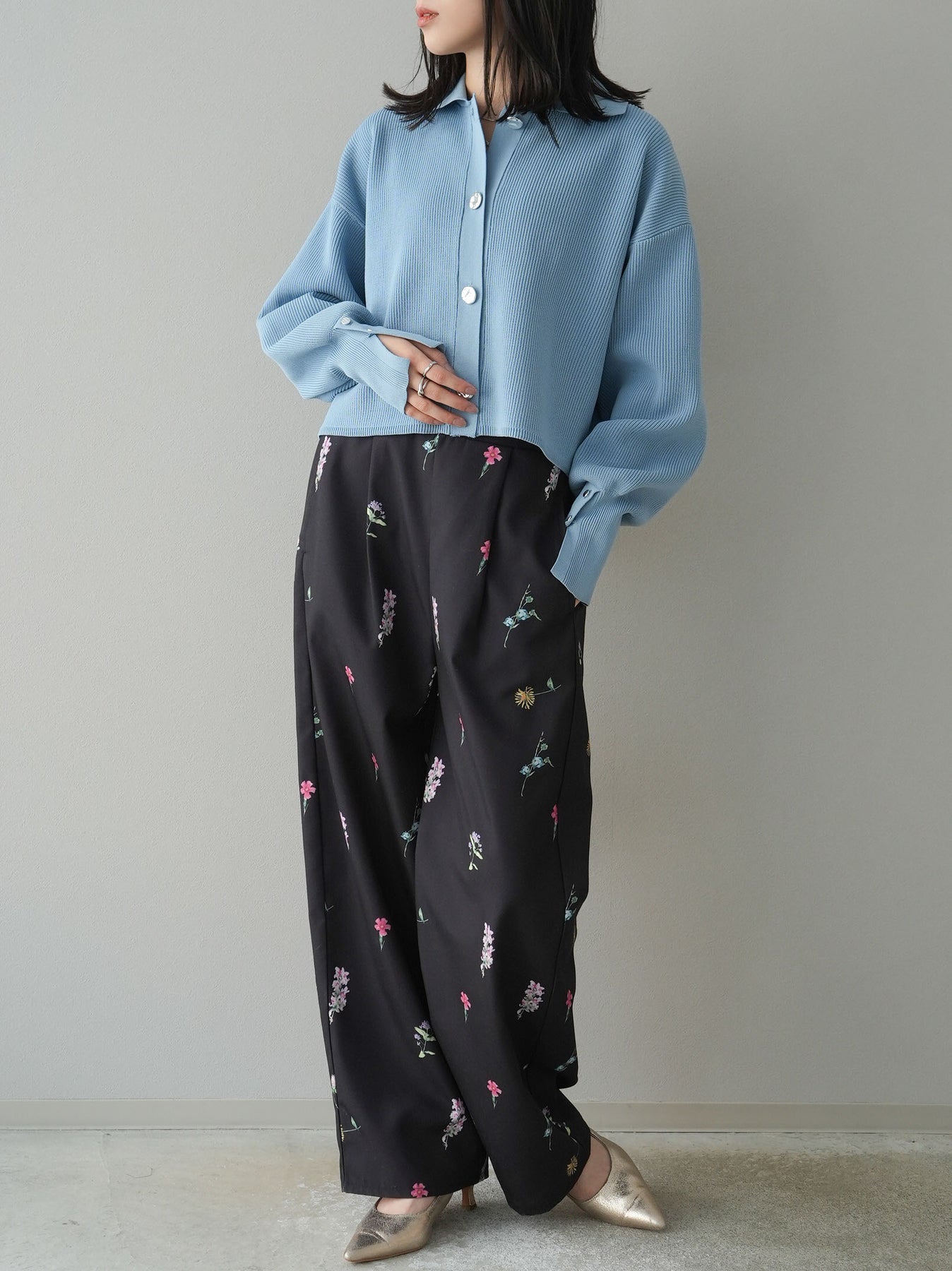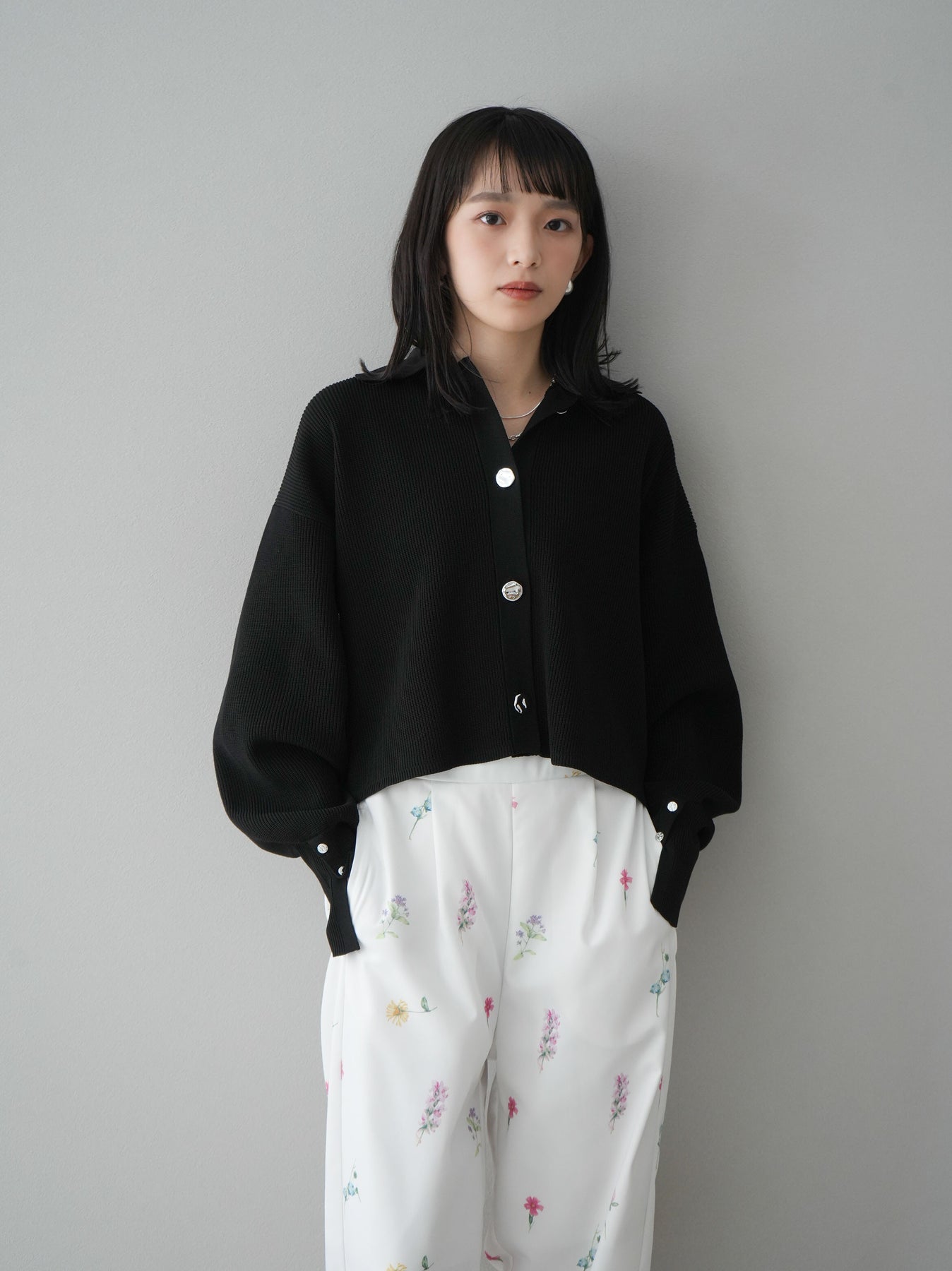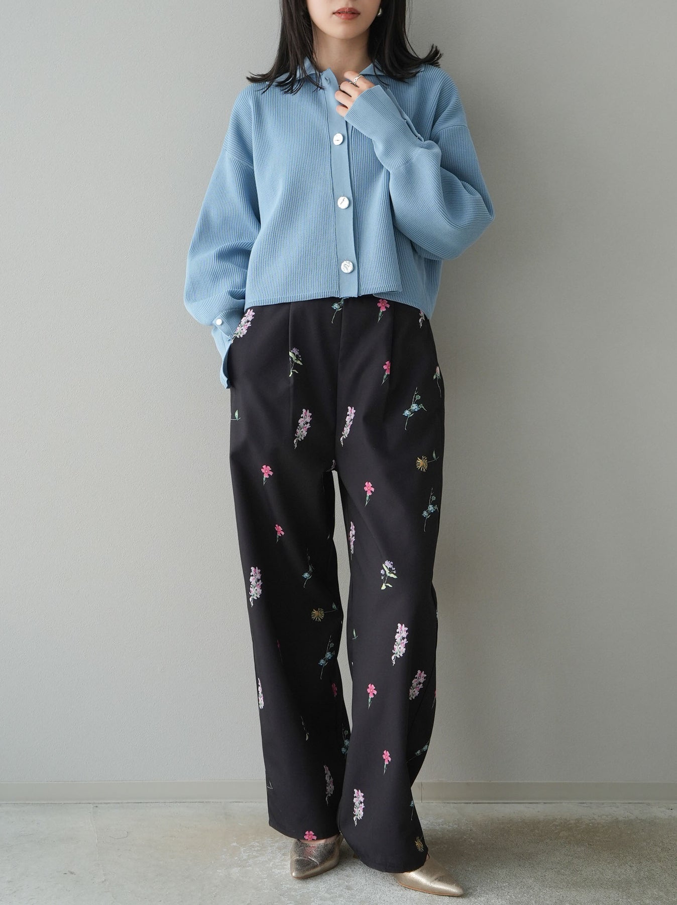 [SET]ボリュームスリーブポロニットカーディガン+フラワーアートプリントタックパンツ(2set)