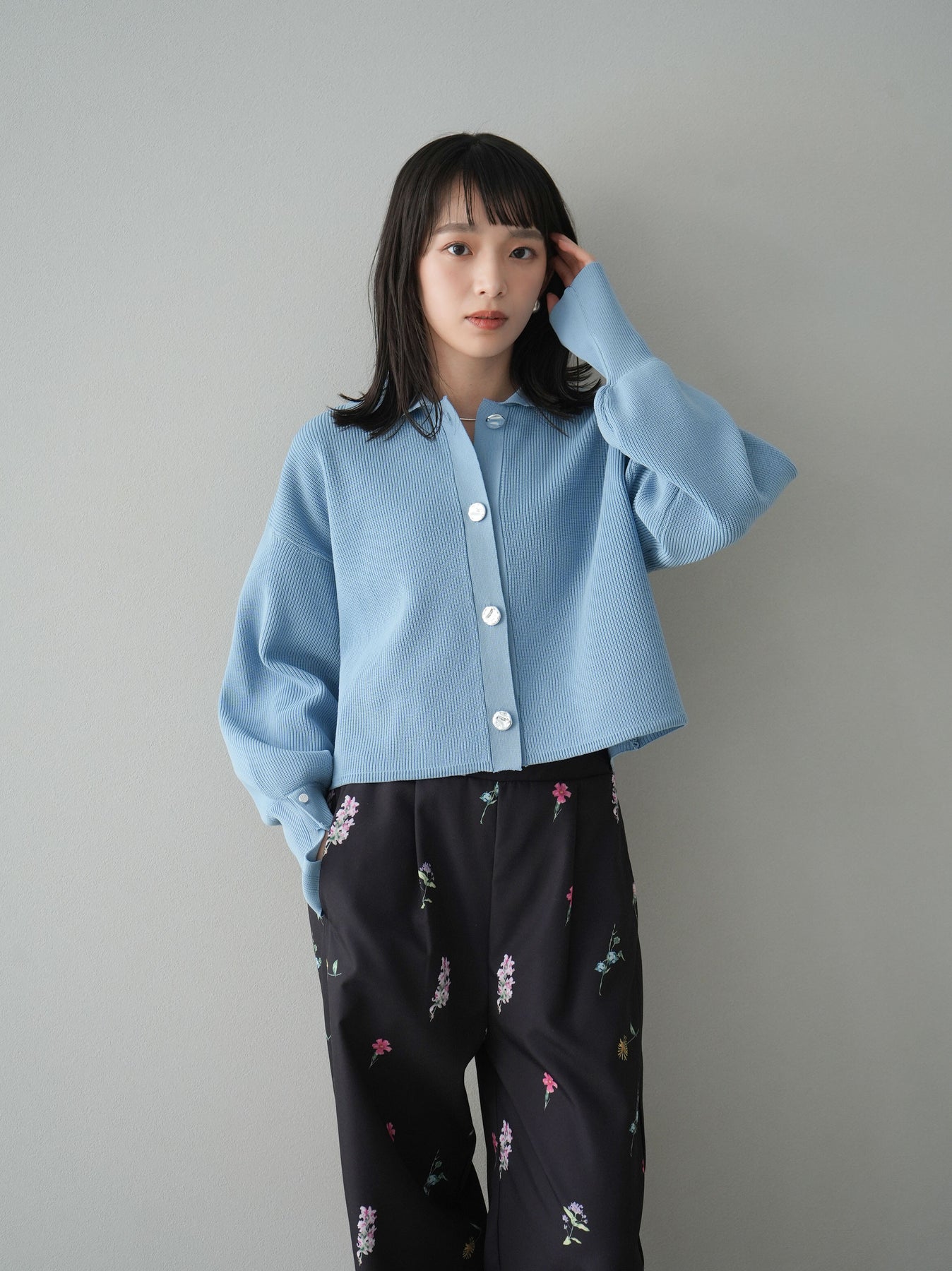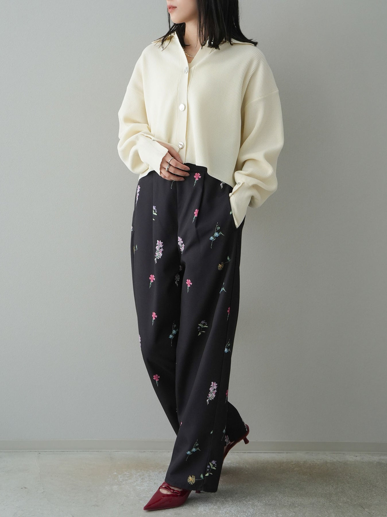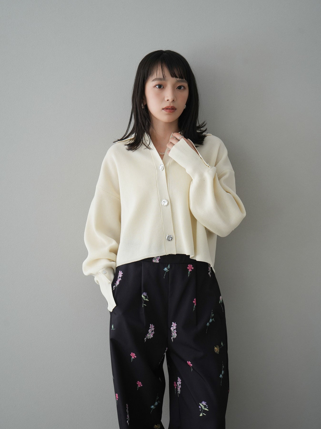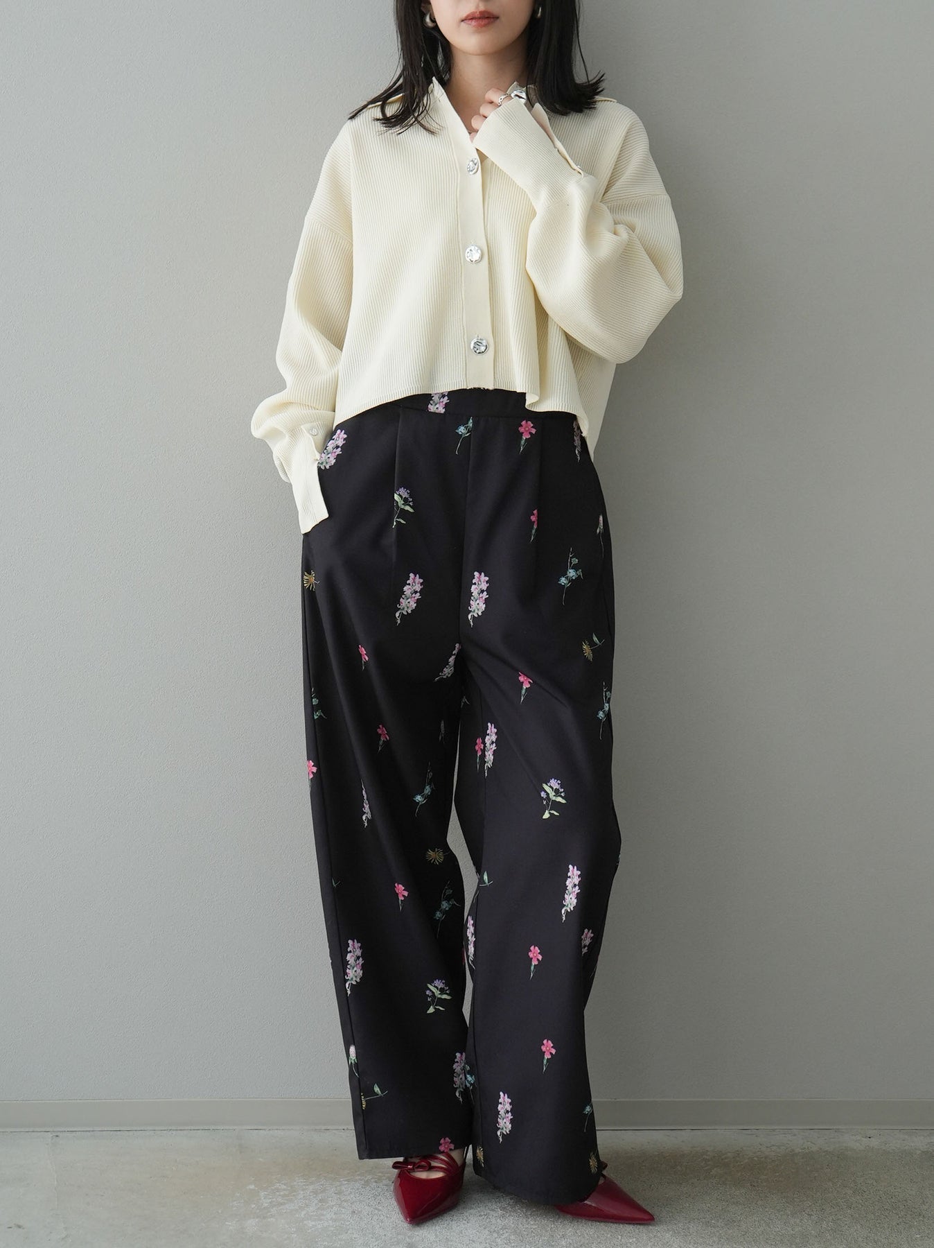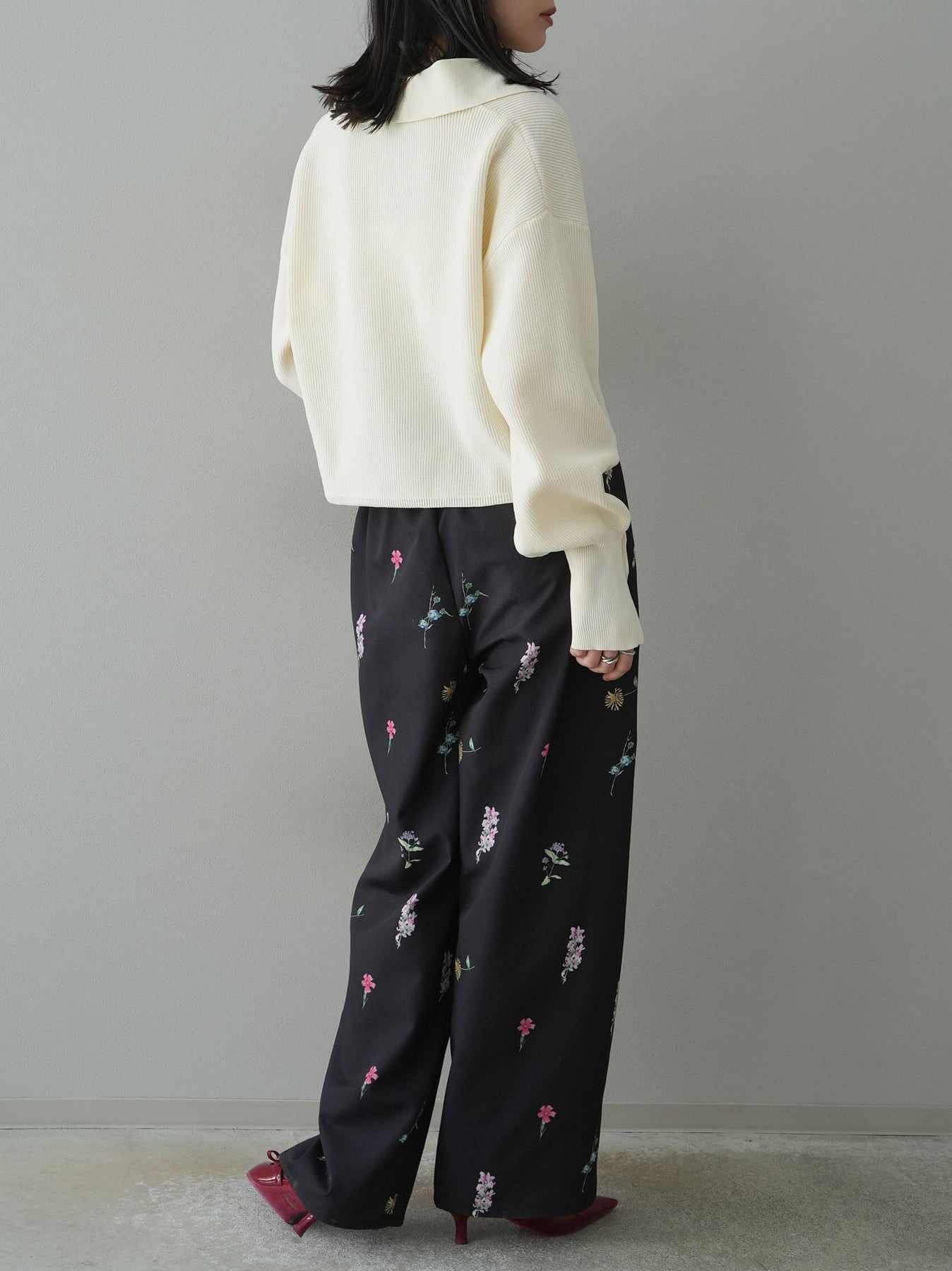 [SET]ボリュームスリーブポロニットカーディガン+フラワーアートプリントタックパンツ(2set)