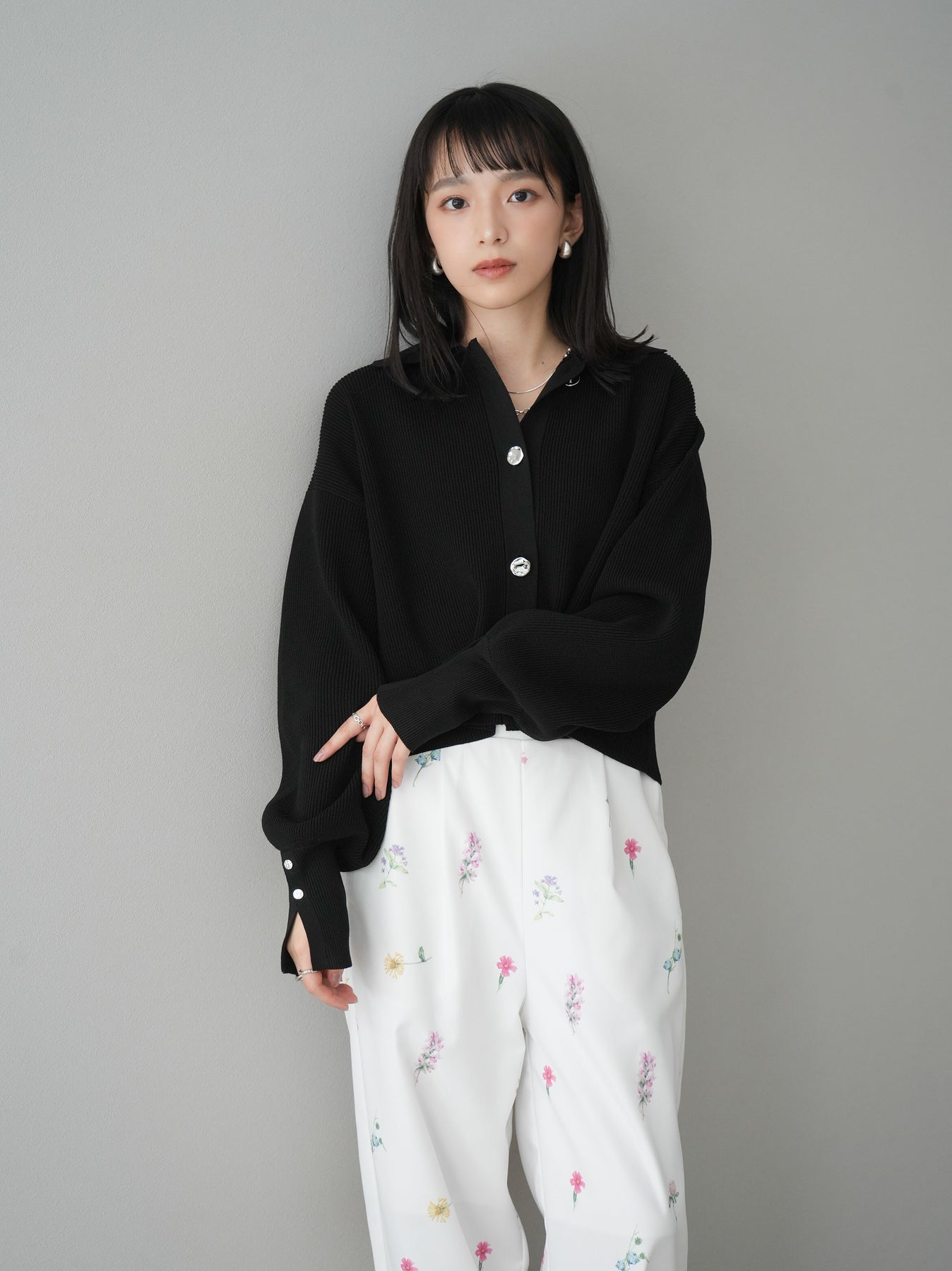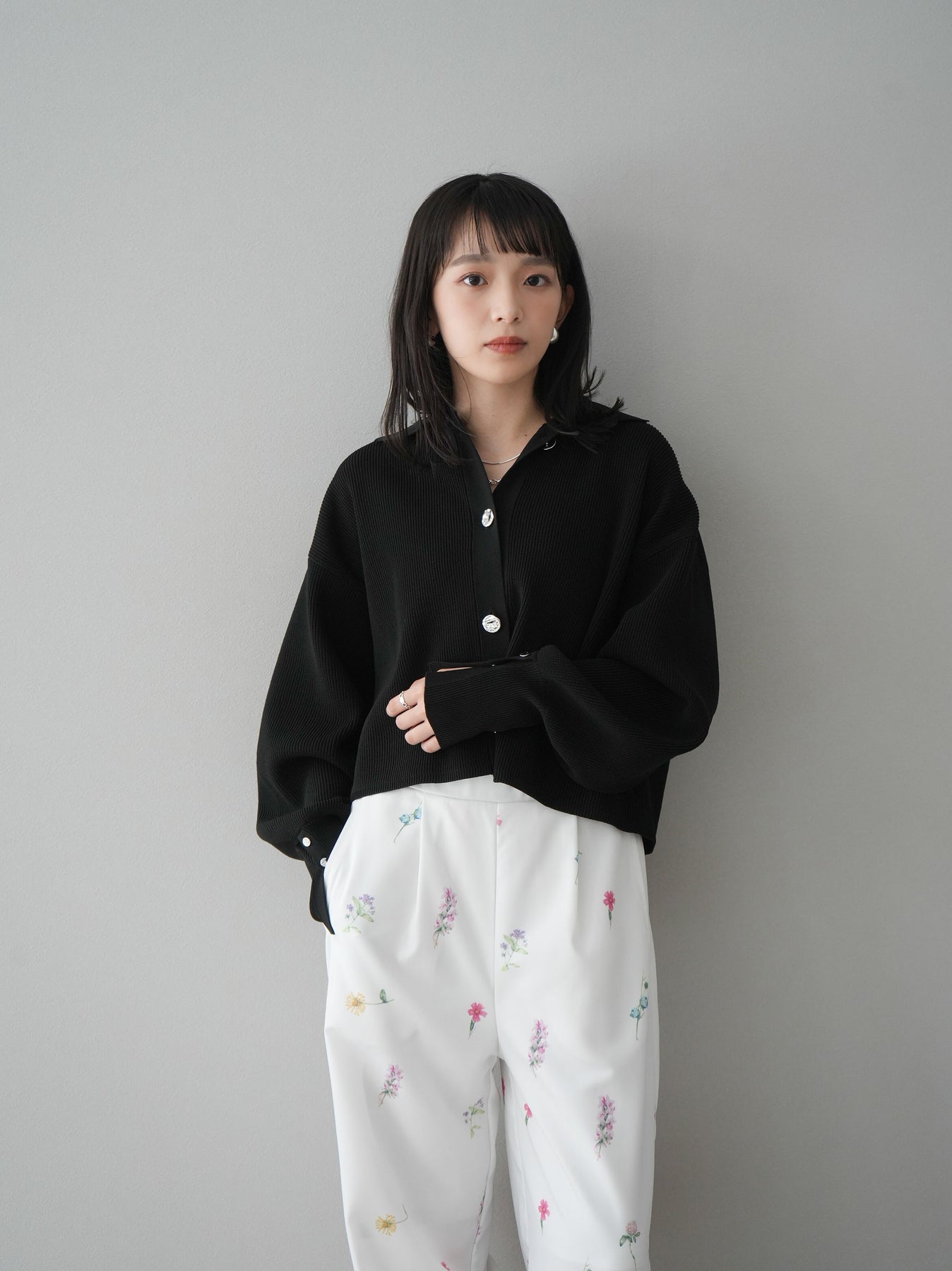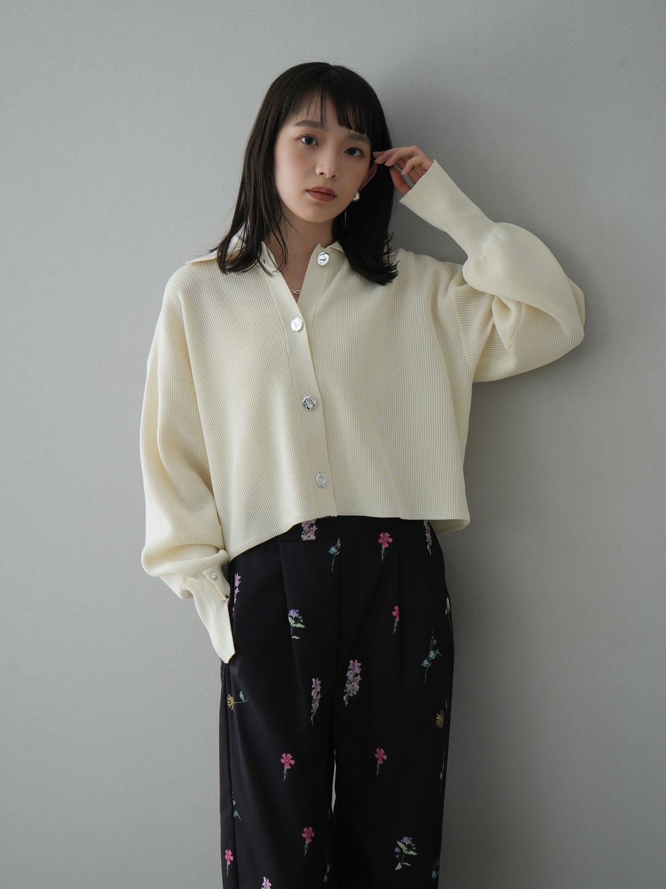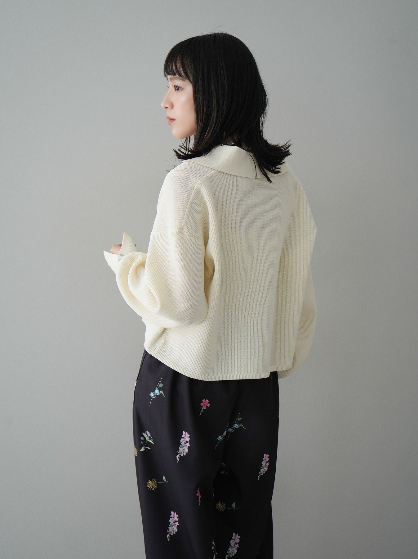 [SET]ボリュームスリーブポロニットカーディガン+フラワーアートプリントタックパンツ(2set)