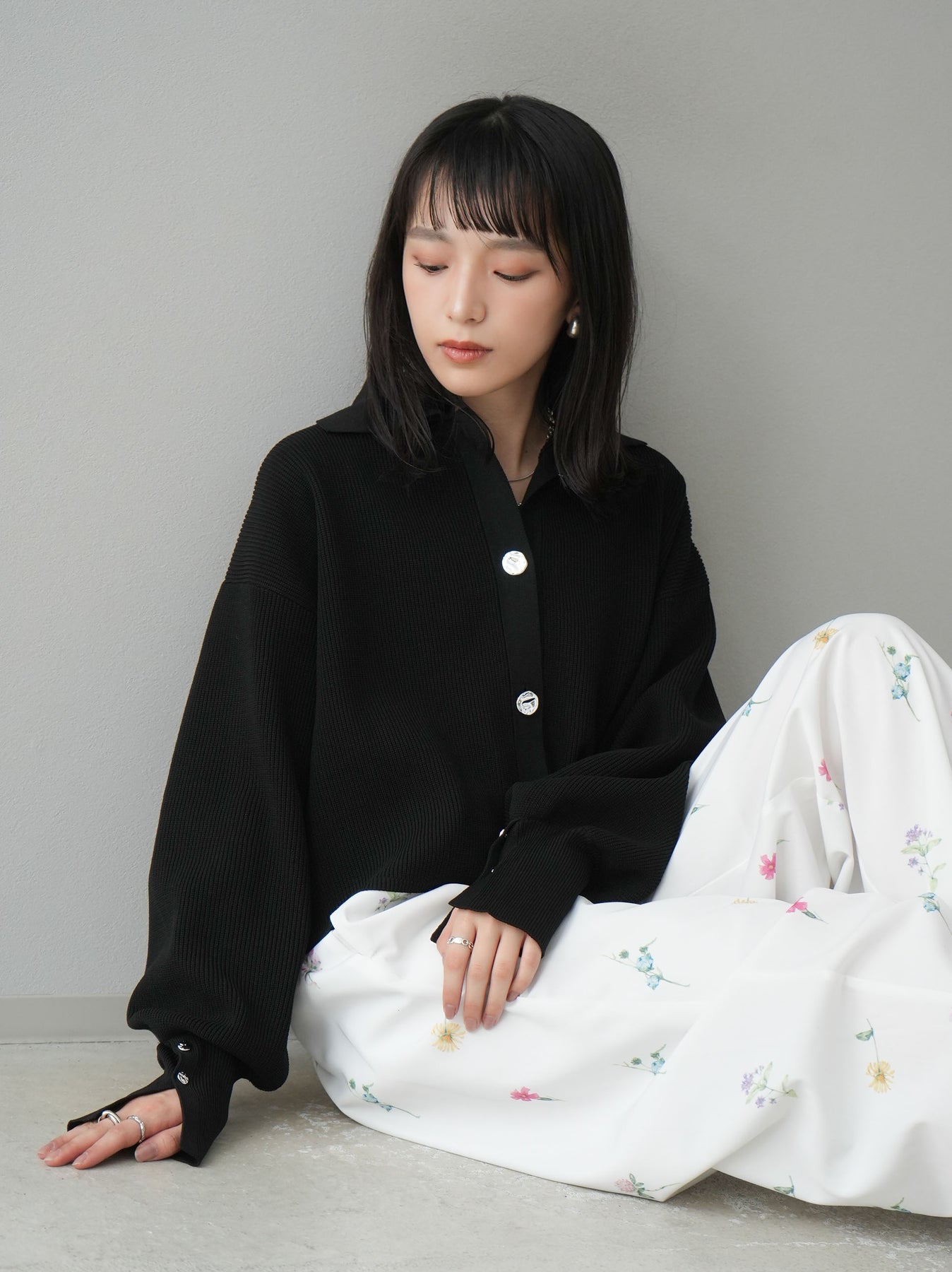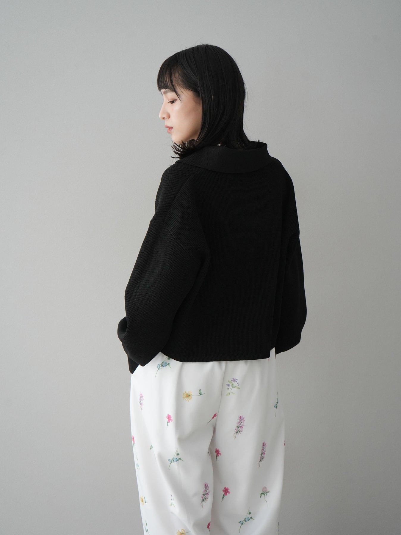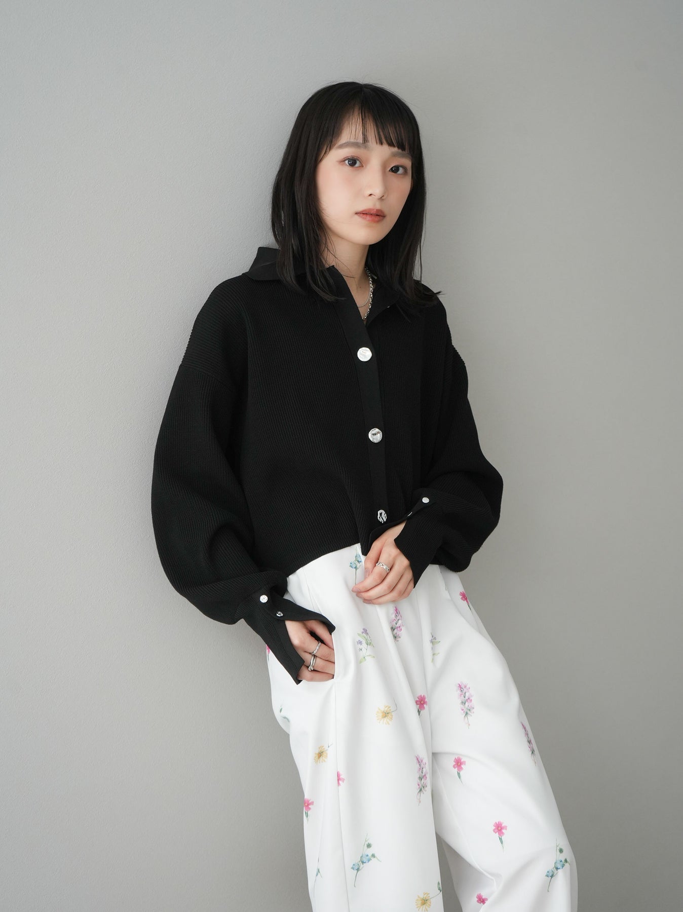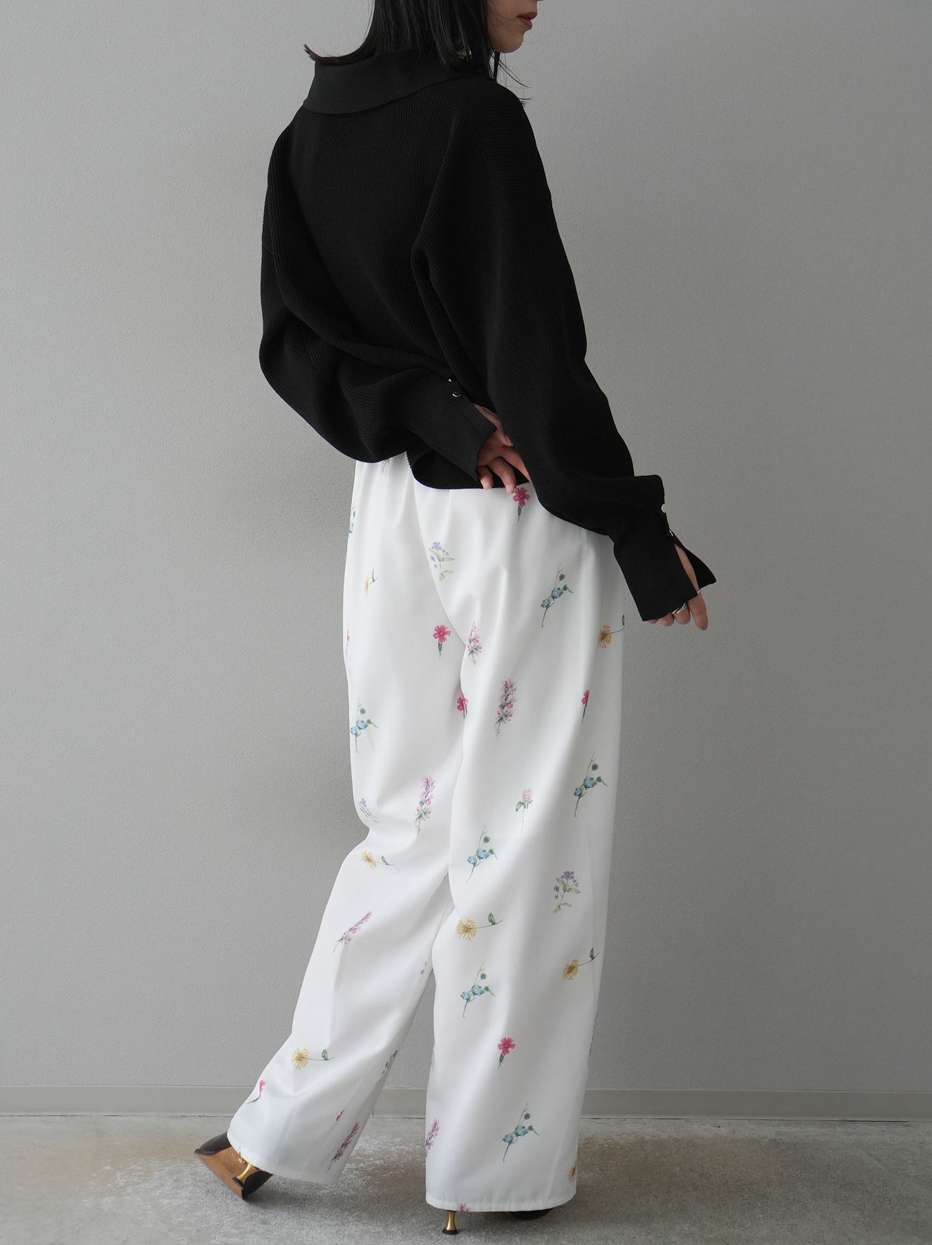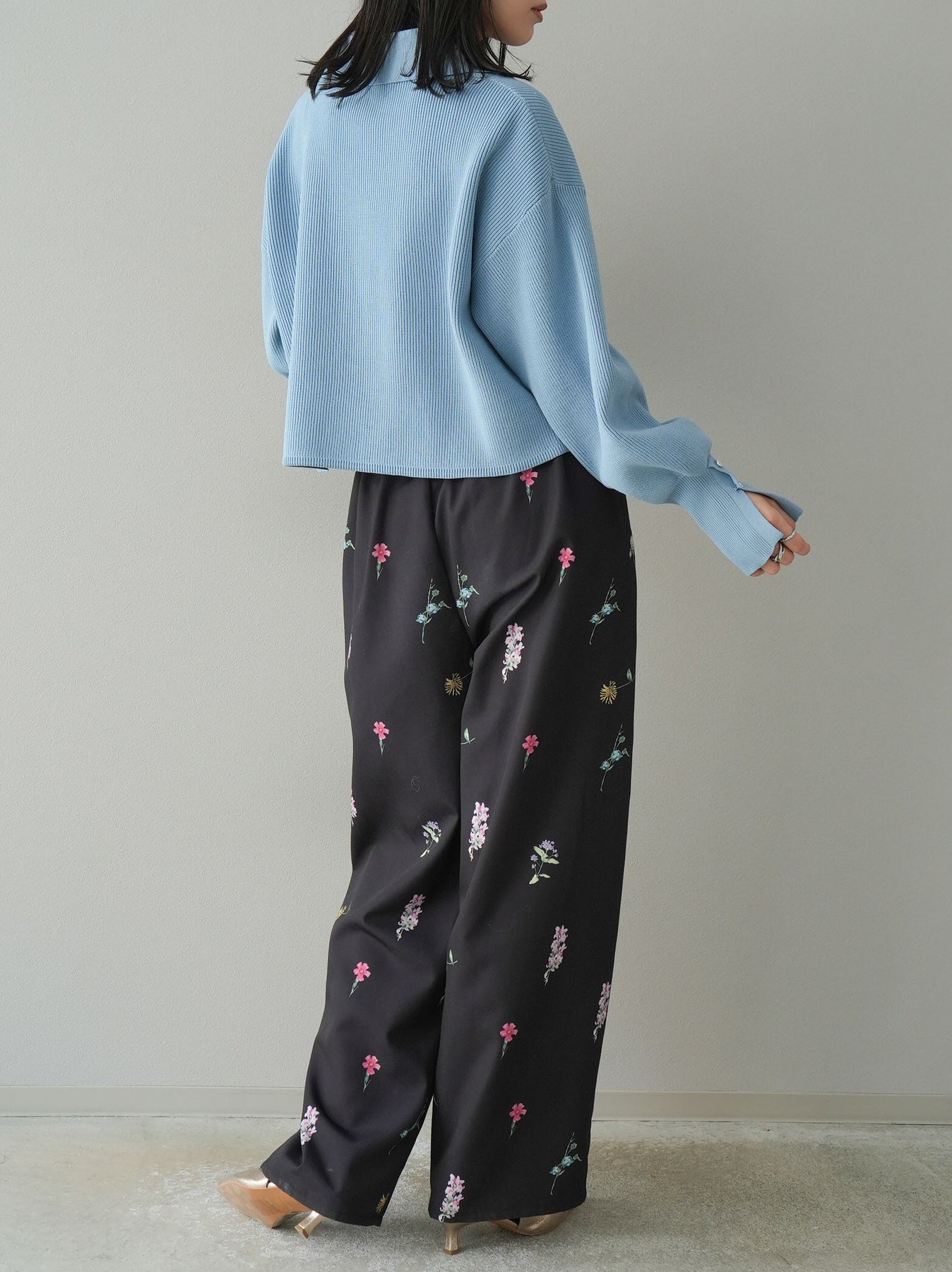[SET]ボリュームスリーブポロニットカーディガン+フラワーアートプリントタックパンツ(2set)